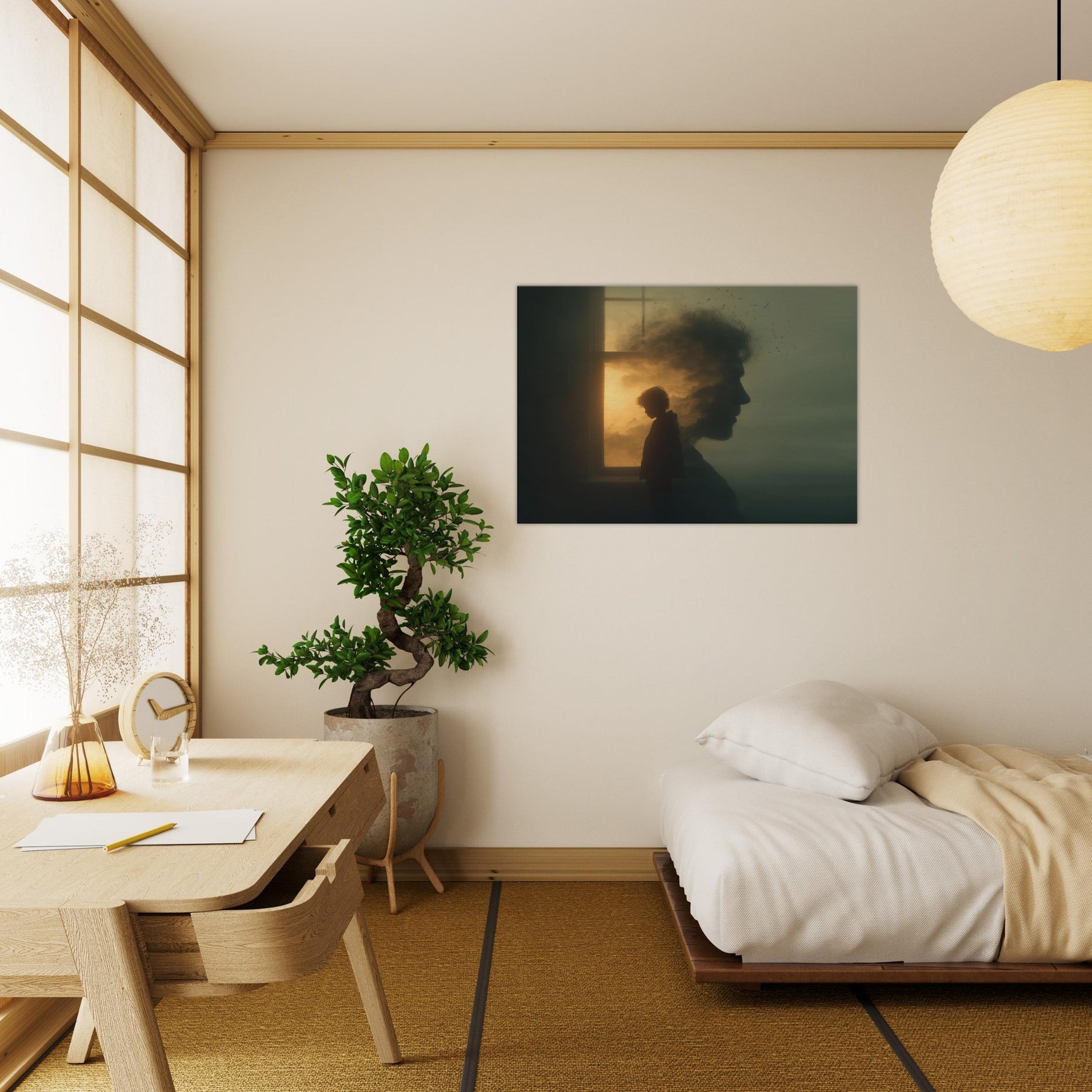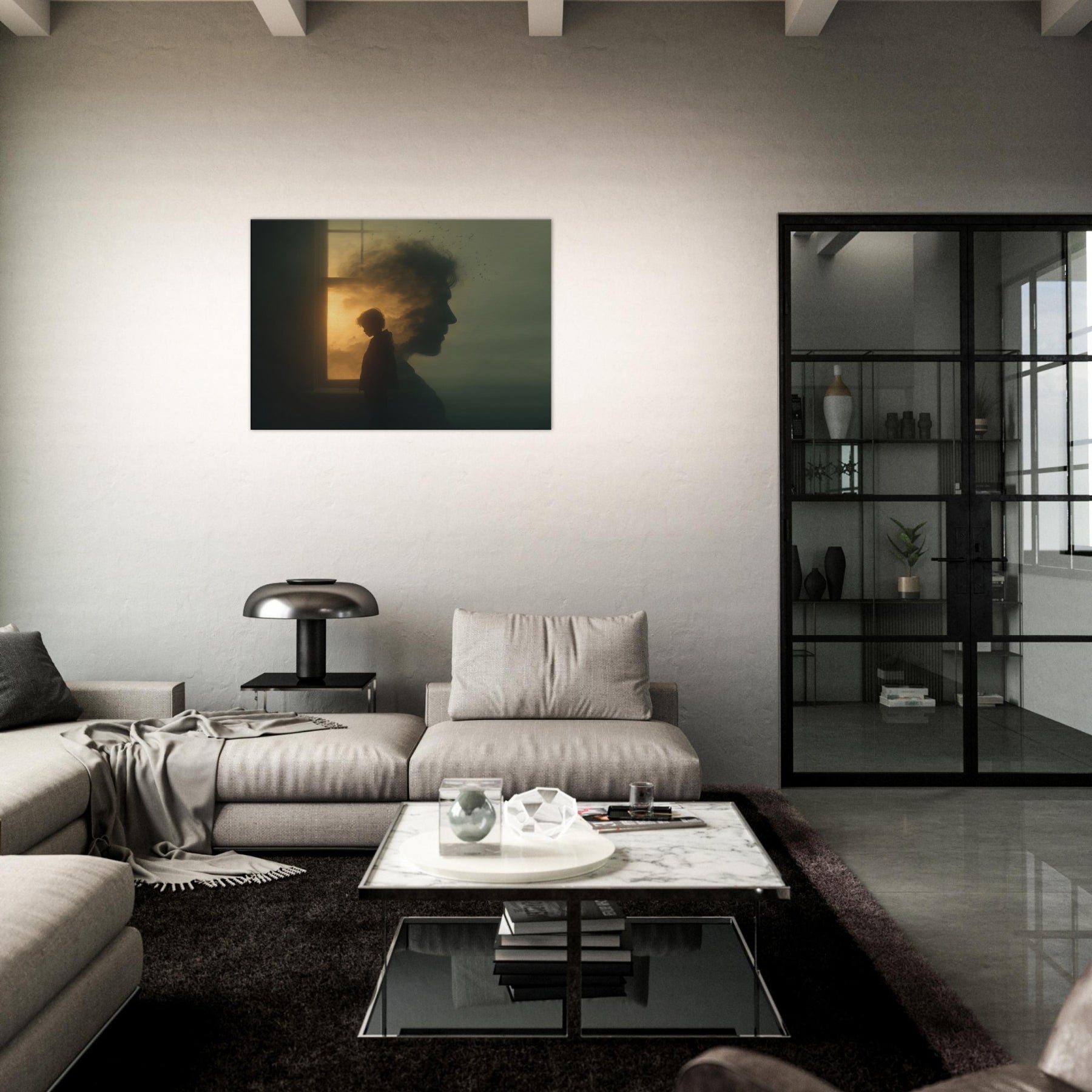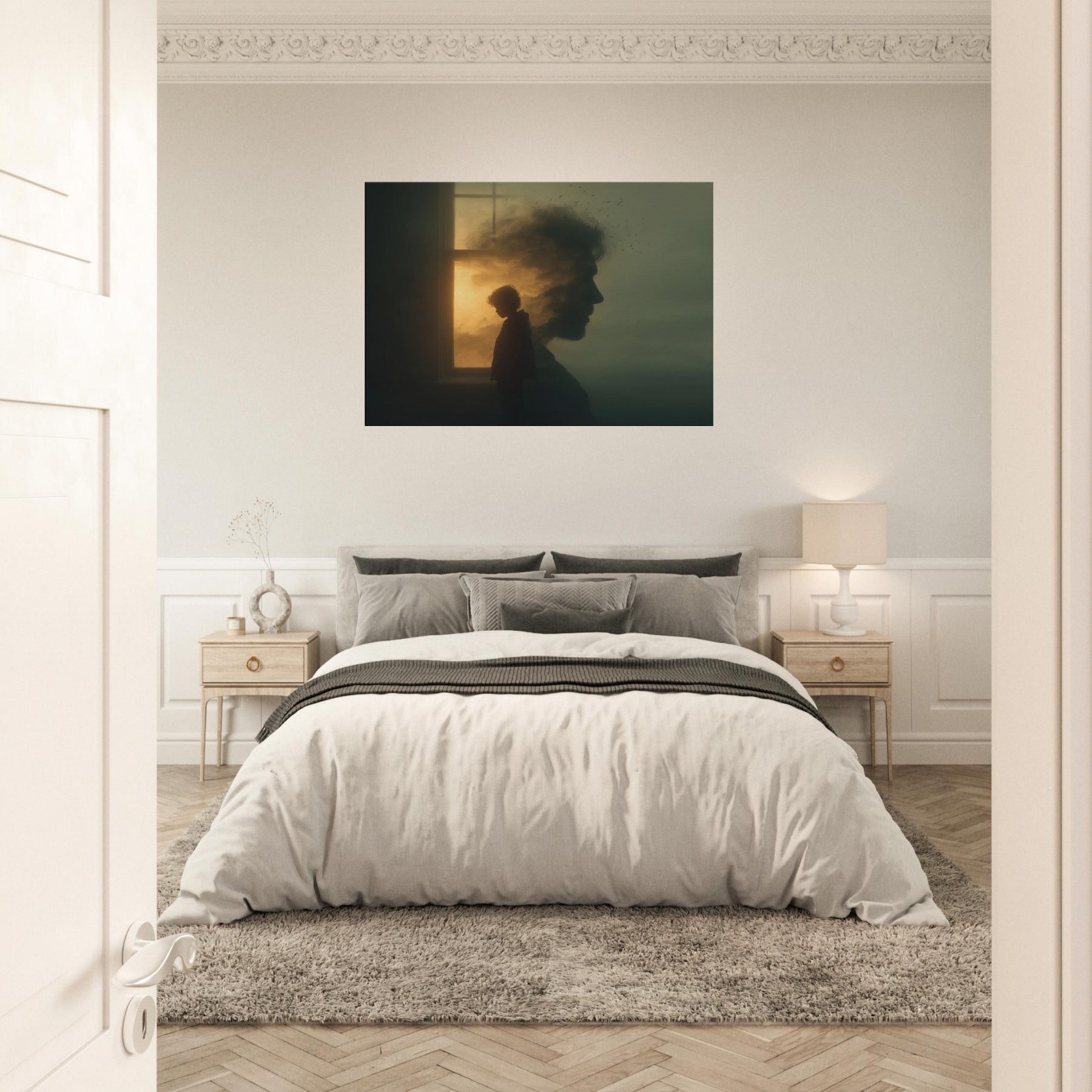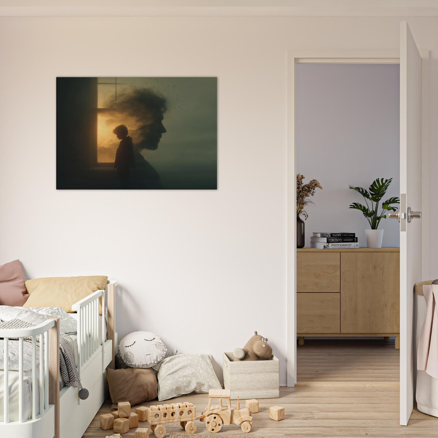In this surreal duet, a quiet Parent and Child silhouette meets a sky of memory, where a window frames a dawn lit that doubles as a whispered profile. The scene folds warmth and distance into one breath, inviting tenderness to saturate your room. The soft, amber glow and shadow play create a tranquil focal point that soothes living spaces, making walls feel intimate and expansive at once an invitation to pause, dream, and connect.