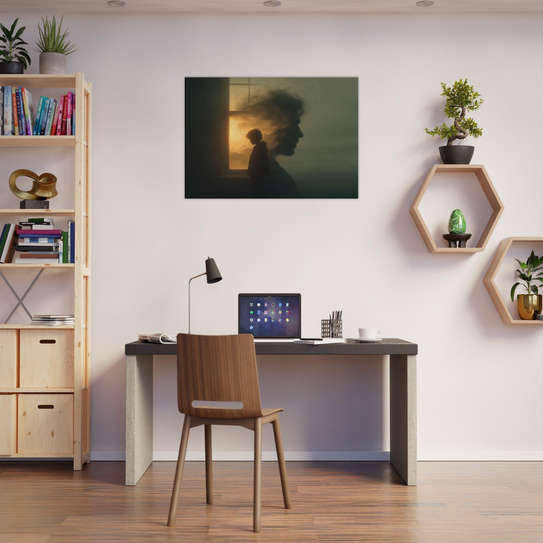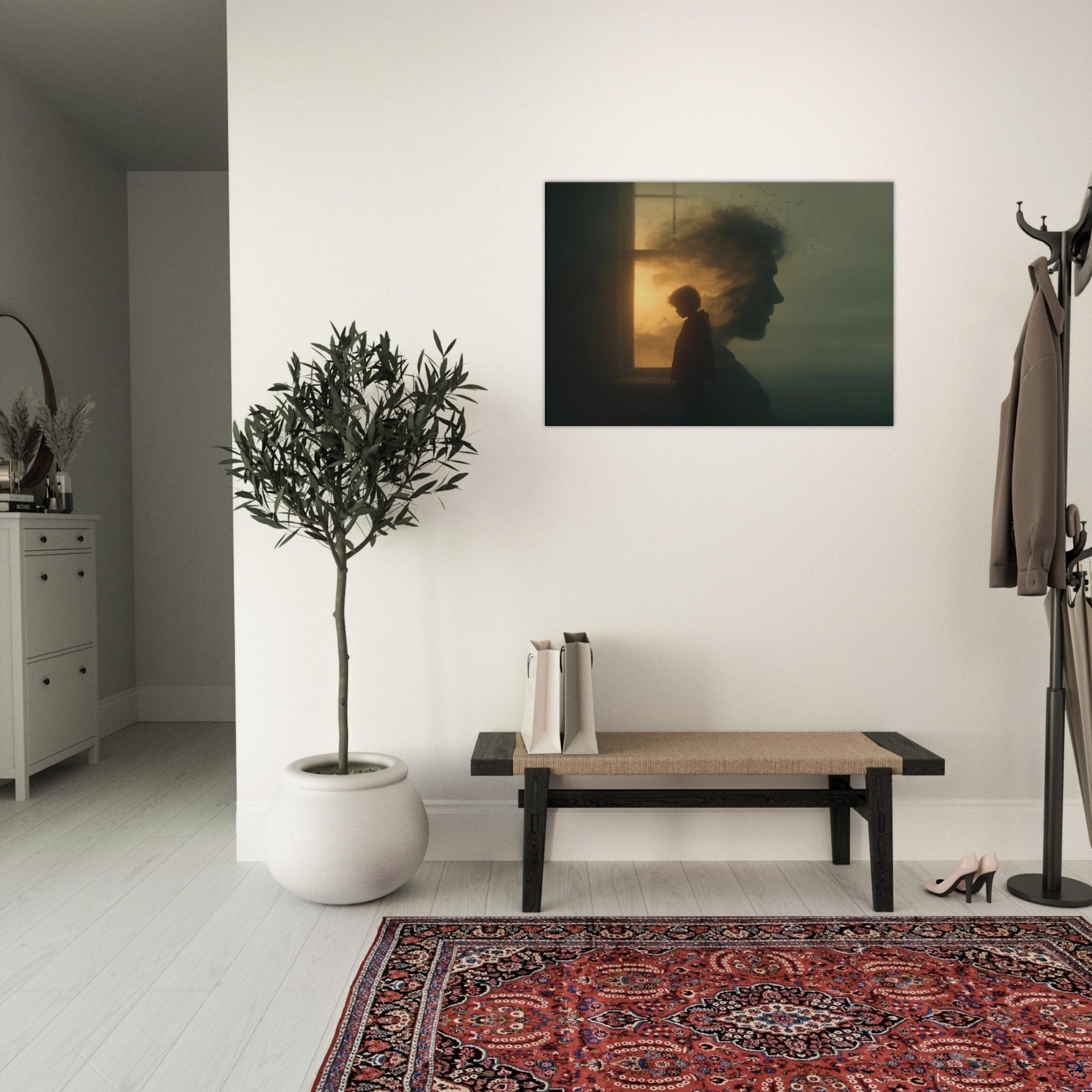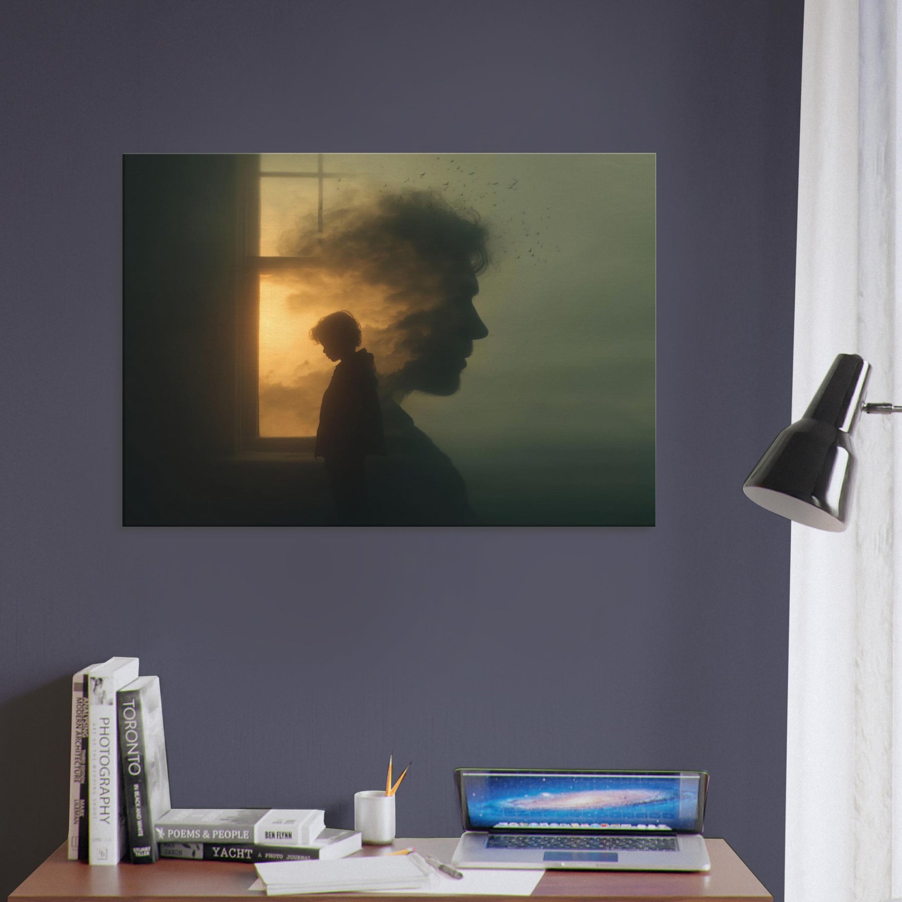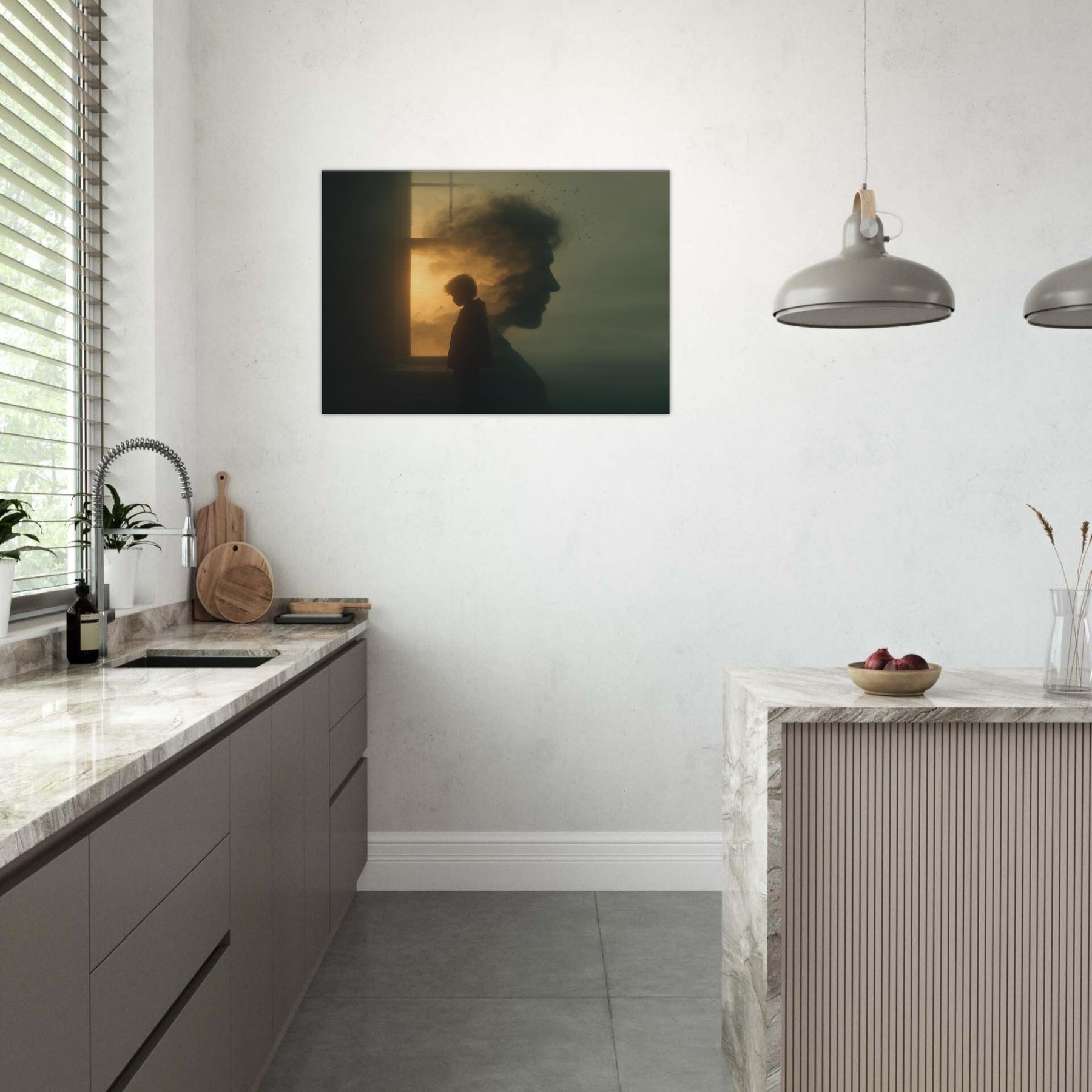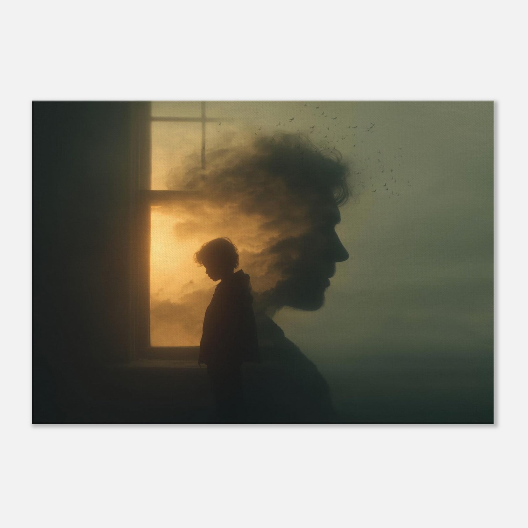 In this surreal duet, a quiet Parent and Child silhouette meets a sky of memory, where a window frames a dawn lit that doubles as a whispered profile. The scene folds warmth and distance into one breath, inviting tenderness to saturate your room. The soft, amber glow and shadow play create a tranquil focal point that soothes living spaces, making walls feel intimate and expansive at once an invitation to pause, dream, and connect.