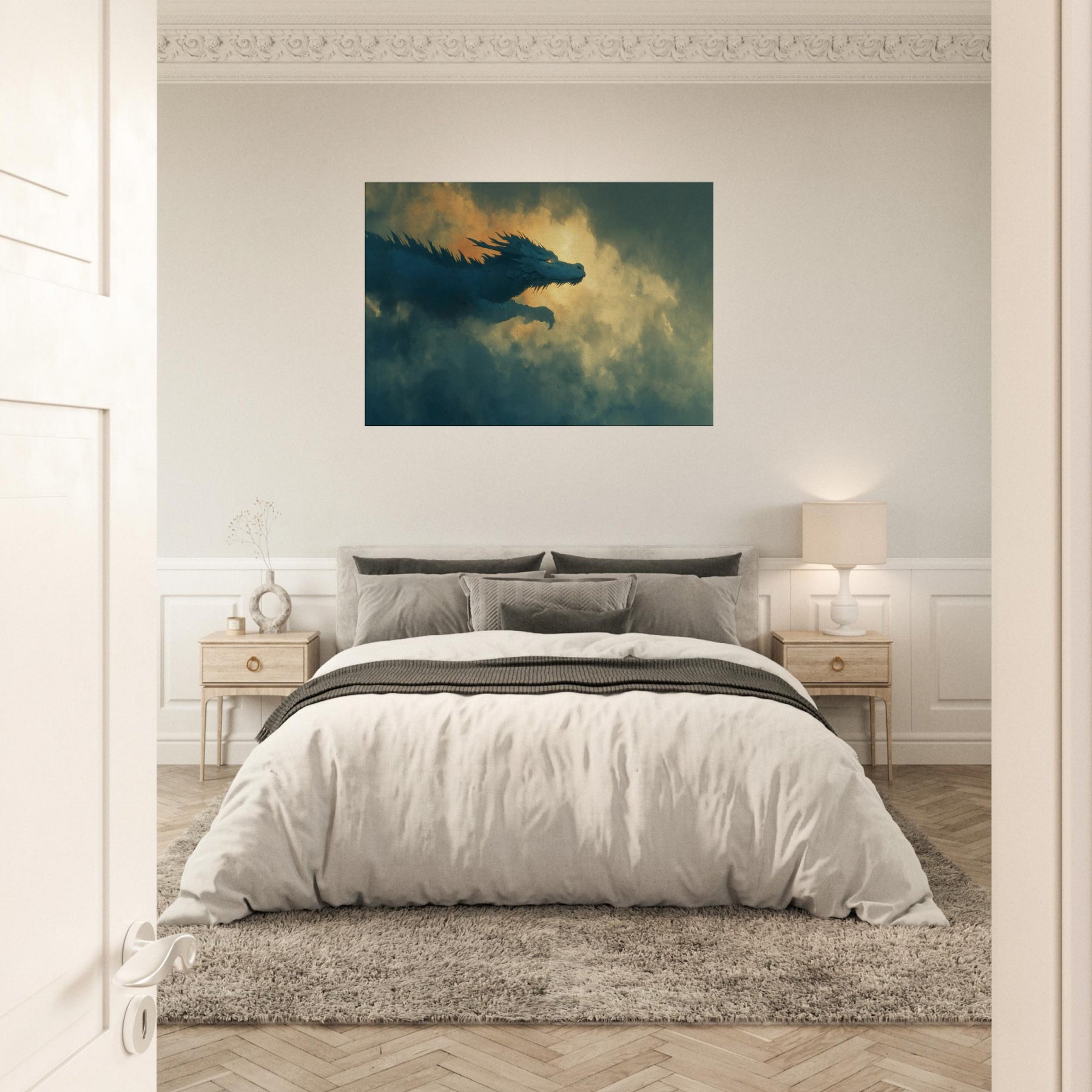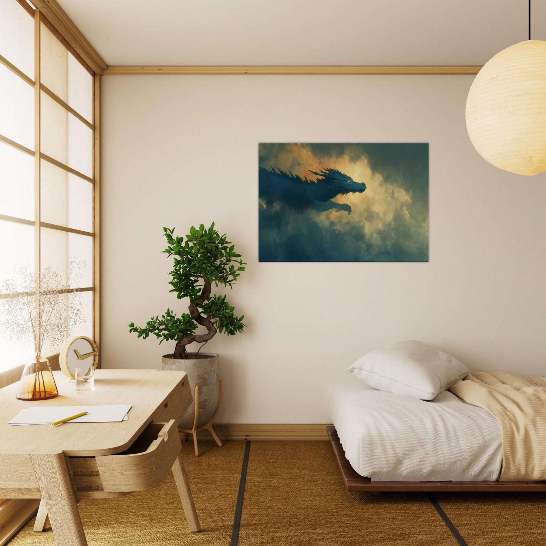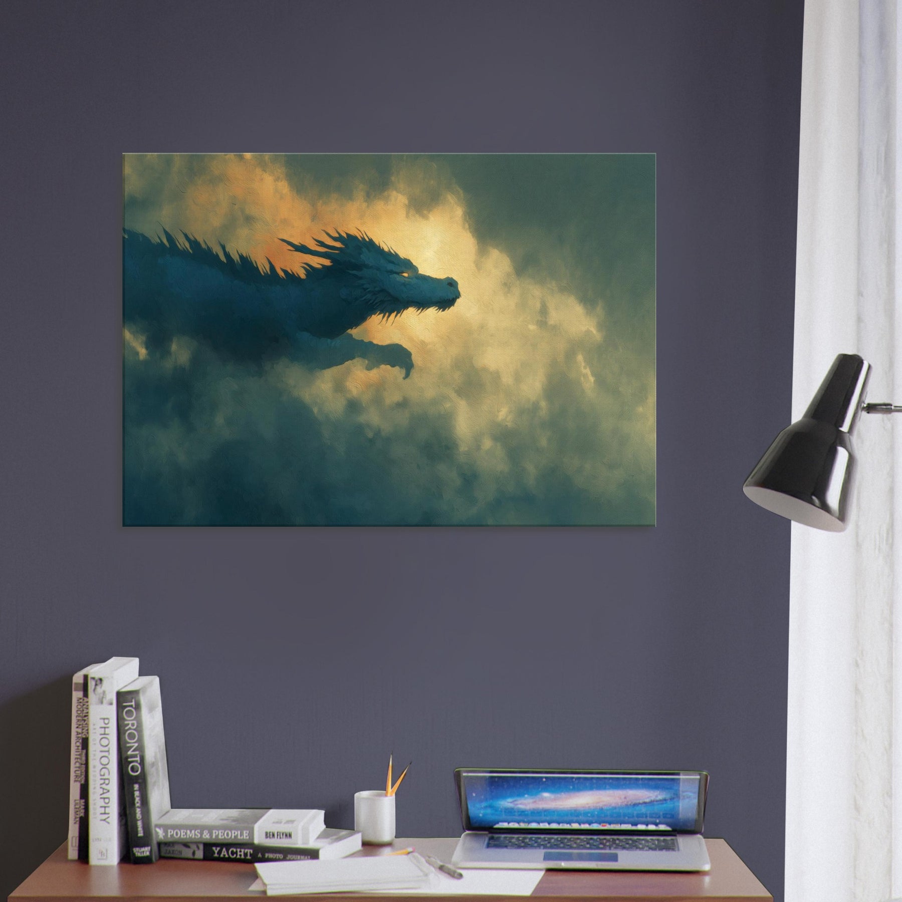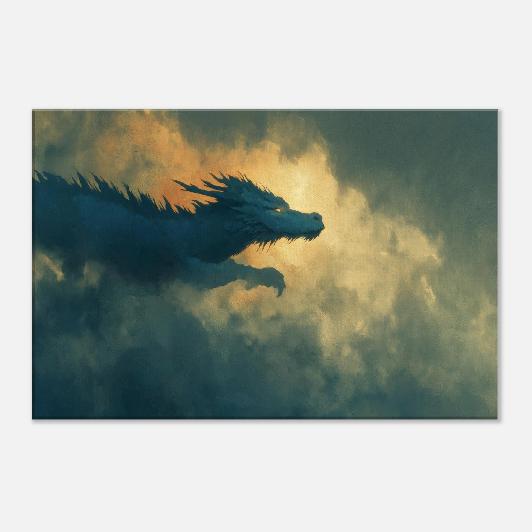 Let the Azure Dragon of the East Flying Through Thunderous Skies sweep into your living space, a surreal guardian aloft on currents of wind and light. The piece bathes your wall in dusk kissed blues and molten gold, where foglike clouds pulse with memory and mystery. It invites quiet awe, turning a room into a sanctuary of myth and momentum perfect above a sofa, mantel, or reading nook, where imagination becomes a living, breathing companion.