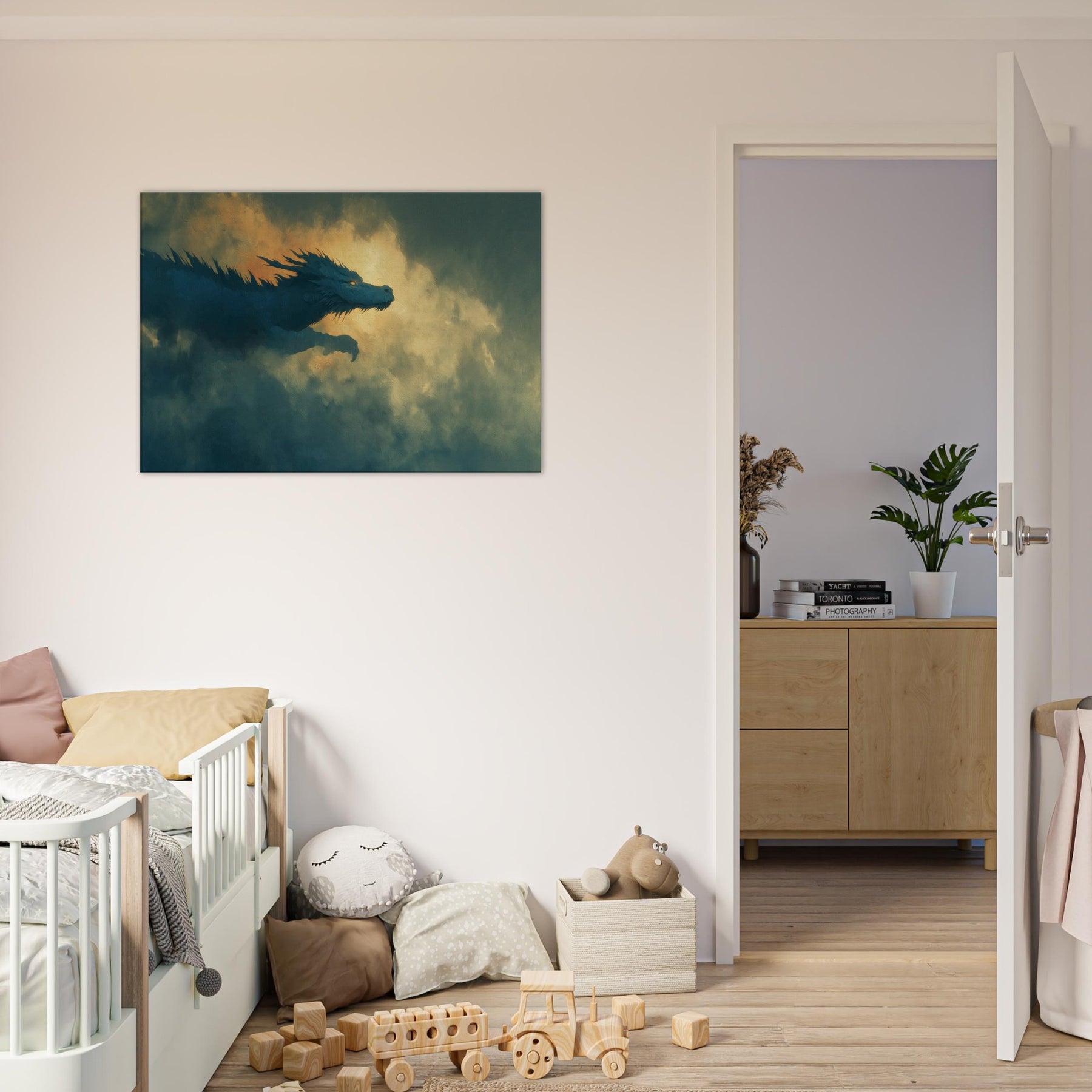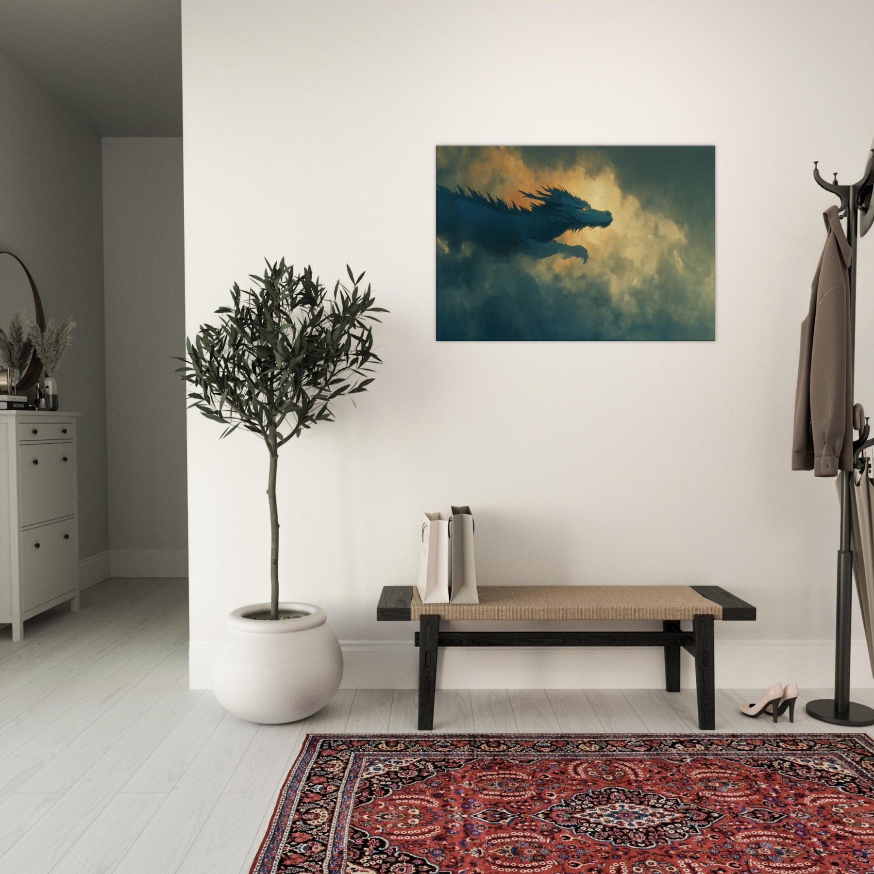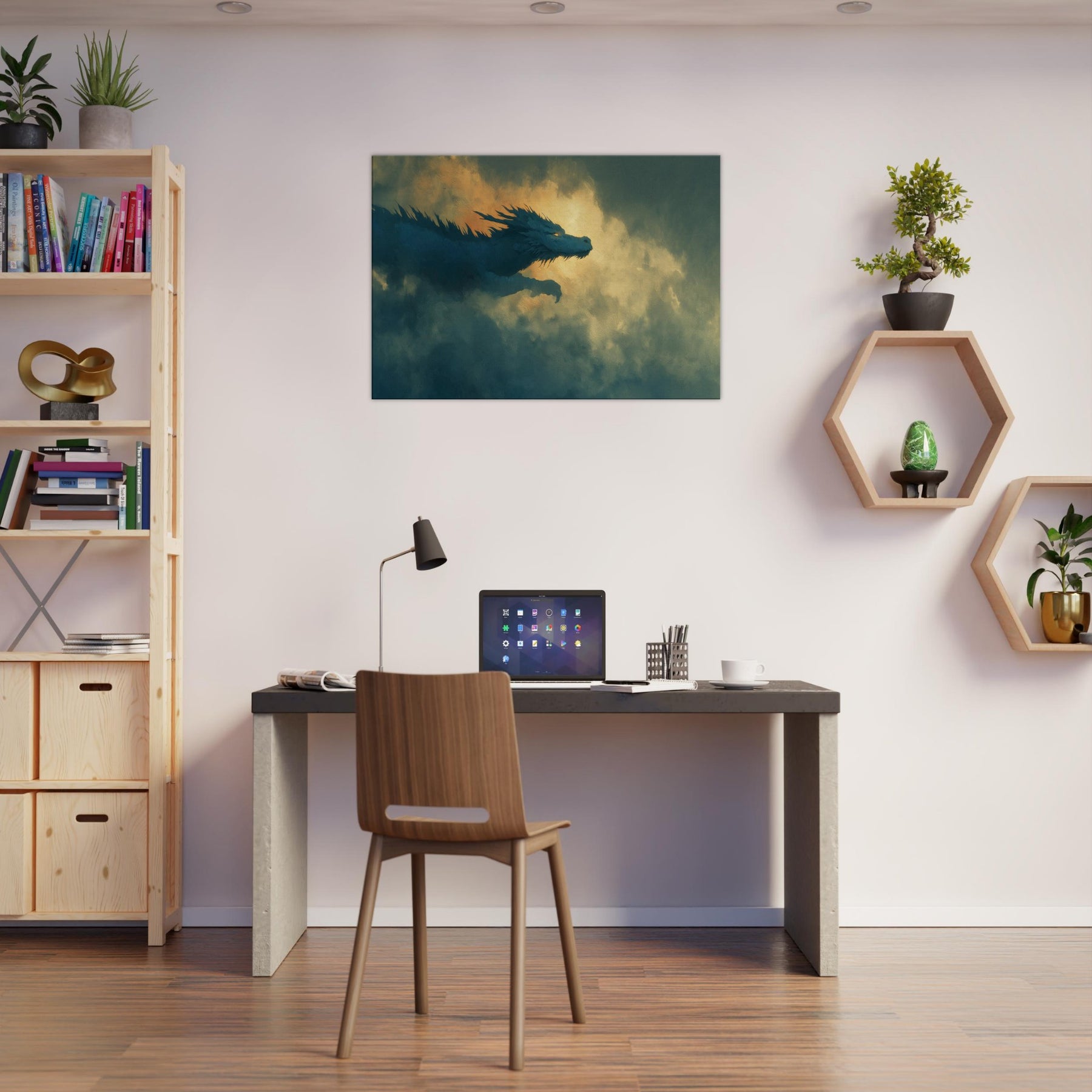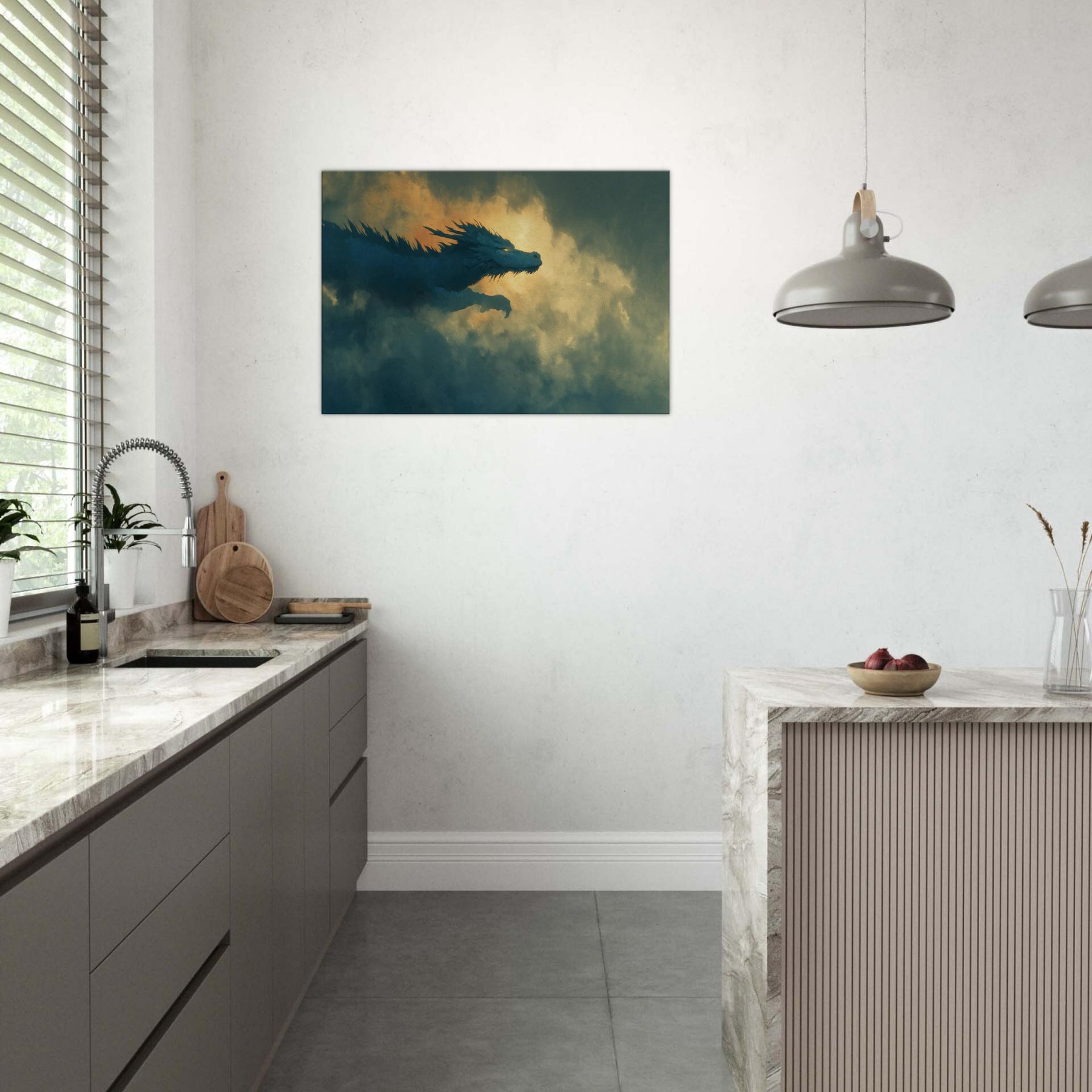 Let the Azure Dragon of the East Flying Through Thunderous Skies sweep into your living space, a surreal guardian aloft on currents of wind and light. The piece bathes your wall in dusk kissed blues and molten gold, where foglike clouds pulse with memory and mystery. It invites quiet awe, turning a room into a sanctuary of myth and momentum perfect above a sofa, mantel, or reading nook, where imagination becomes a living, breathing companion.