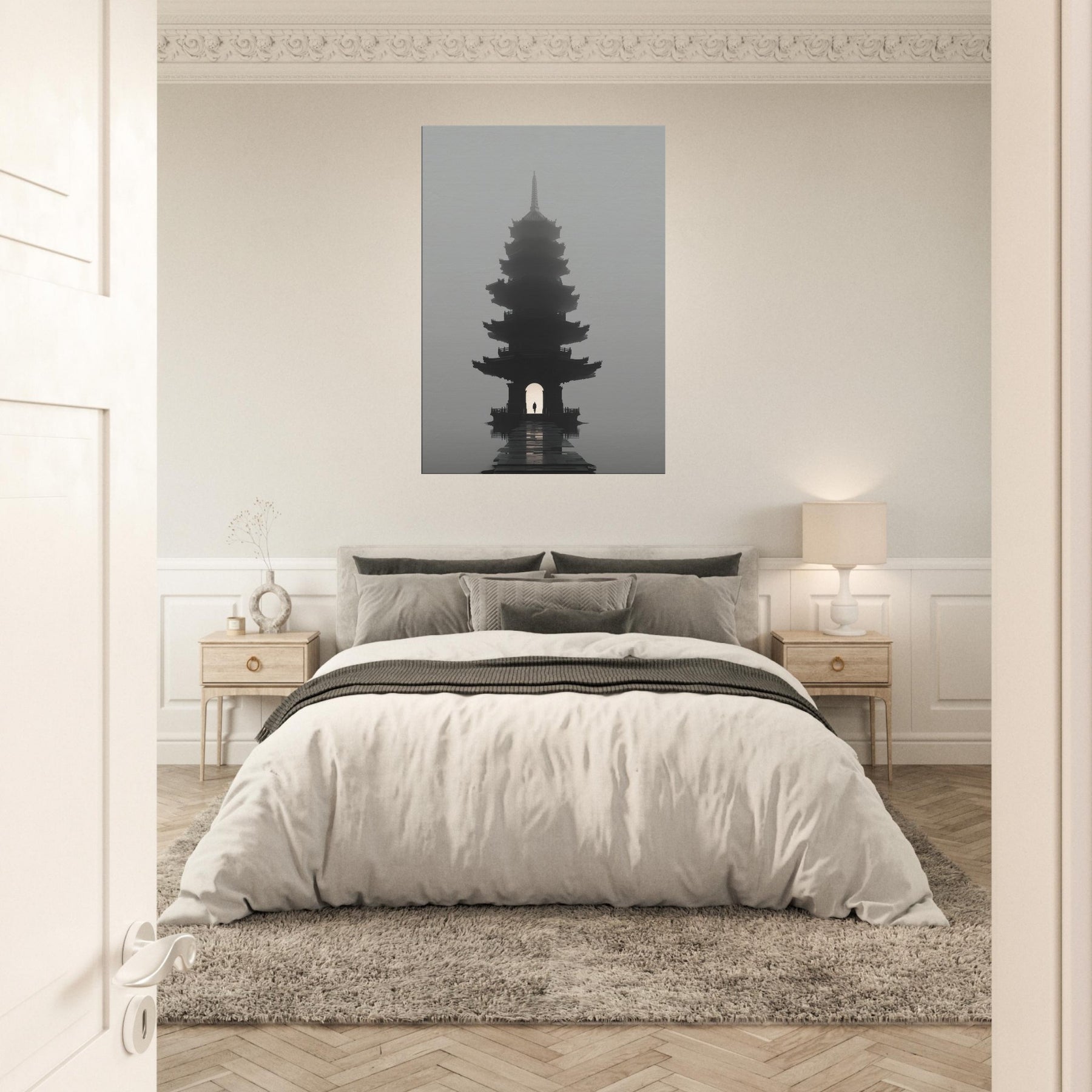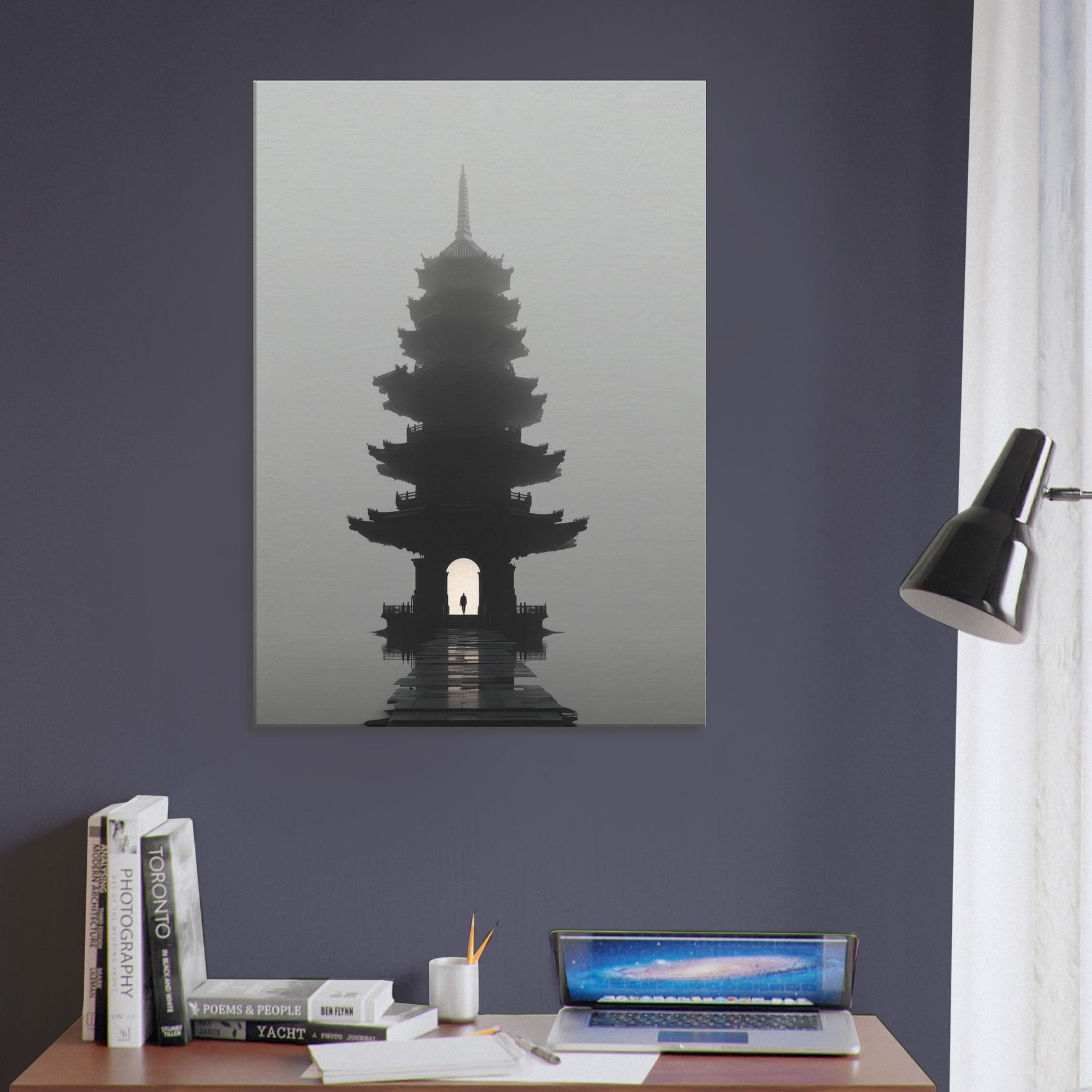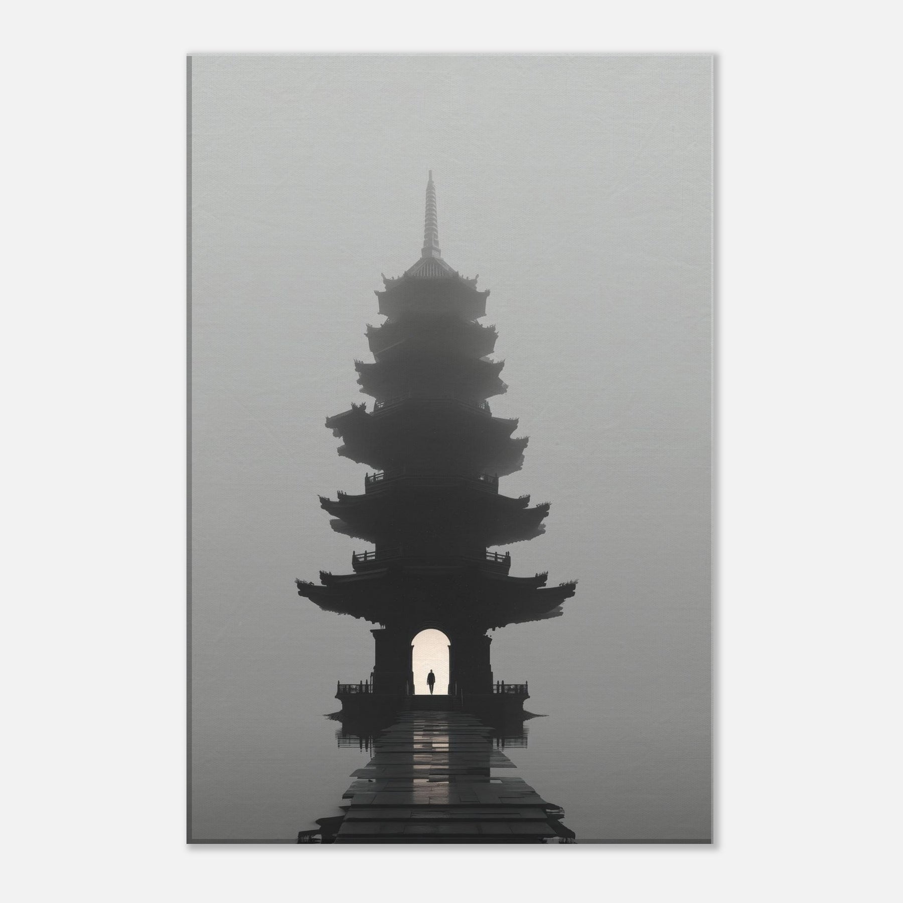 Pagoda Roofline rises in a dreamlike mist, a surreal beacon that folds city architecture into poetry. This painting bathes your space in quiet twilight, where multiple eaves ripple like quiet echoes and a lone figure passes beneath the lantern lit arch. The soft gradient of fog, the lacquer dark silhouette, and the distant glow invite reflection, conversation, and calm. Perfect for a living room or study, it adds a mysterious, elegant focal point that slows time and lends scale to everyday moments an invitation to pause and imagine.