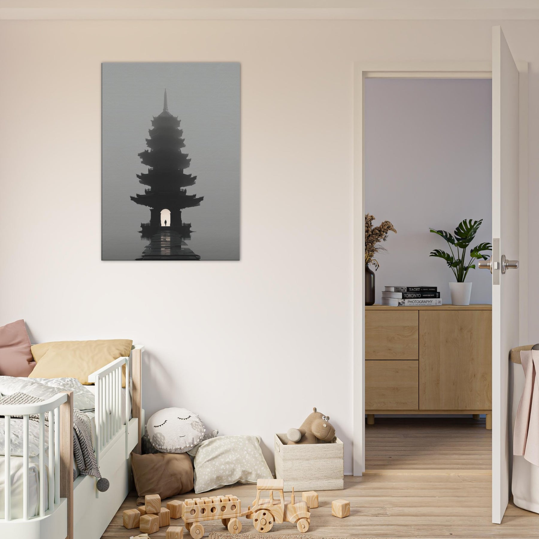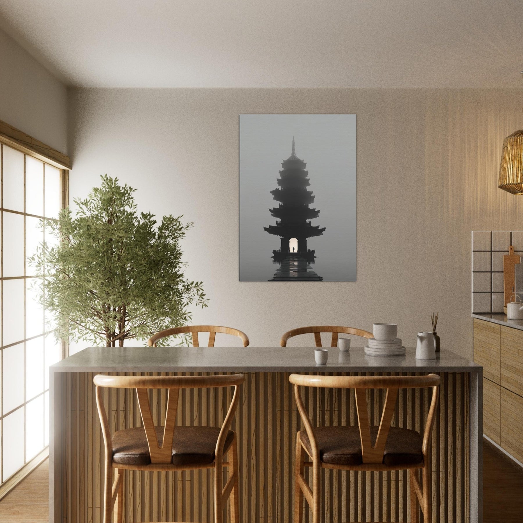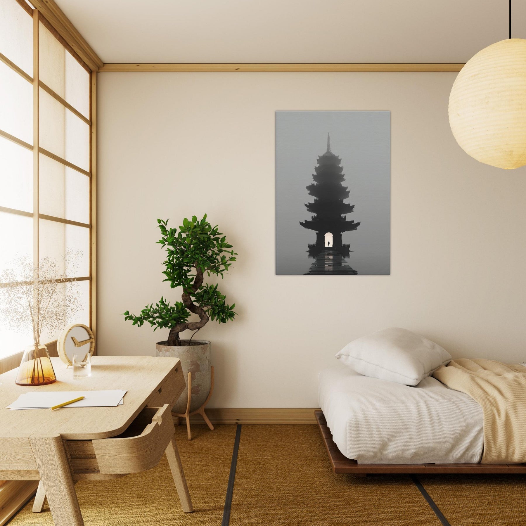 Pagoda Roofline rises in a dreamlike mist, a surreal beacon that folds city architecture into poetry. This painting bathes your space in quiet twilight, where multiple eaves ripple like quiet echoes and a lone figure passes beneath the lantern lit arch. The soft gradient of fog, the lacquer dark silhouette, and the distant glow invite reflection, conversation, and calm. Perfect for a living room or study, it adds a mysterious, elegant focal point that slows time and lends scale to everyday moments an invitation to pause and imagine.