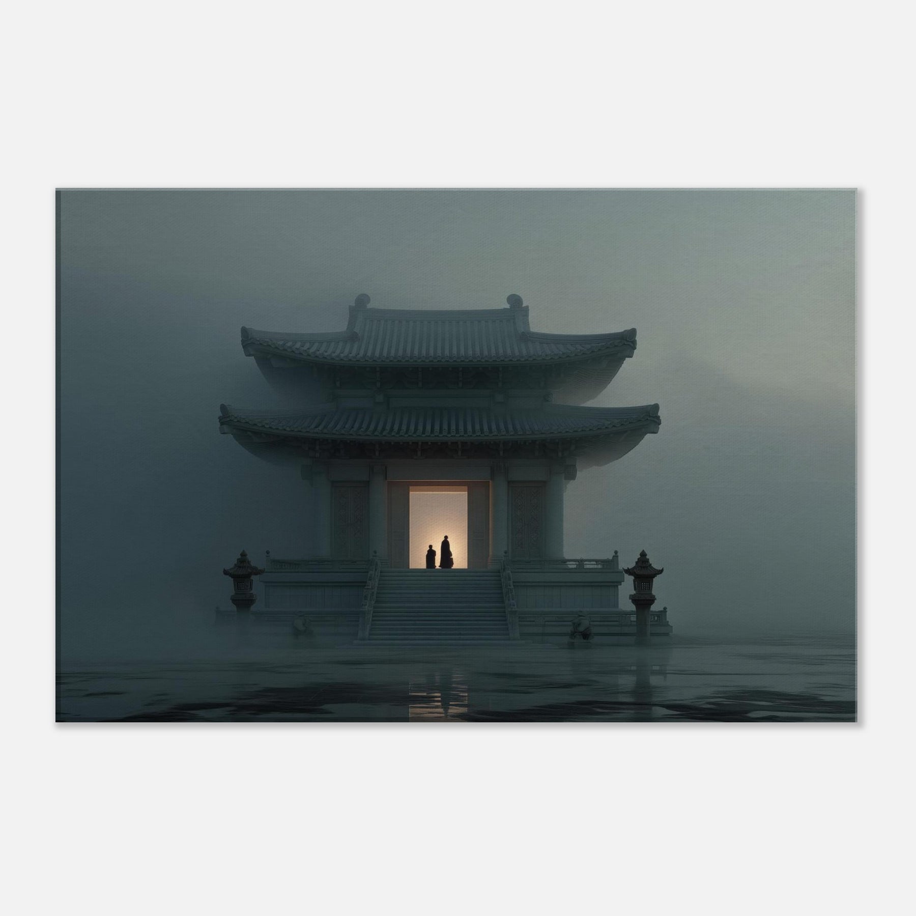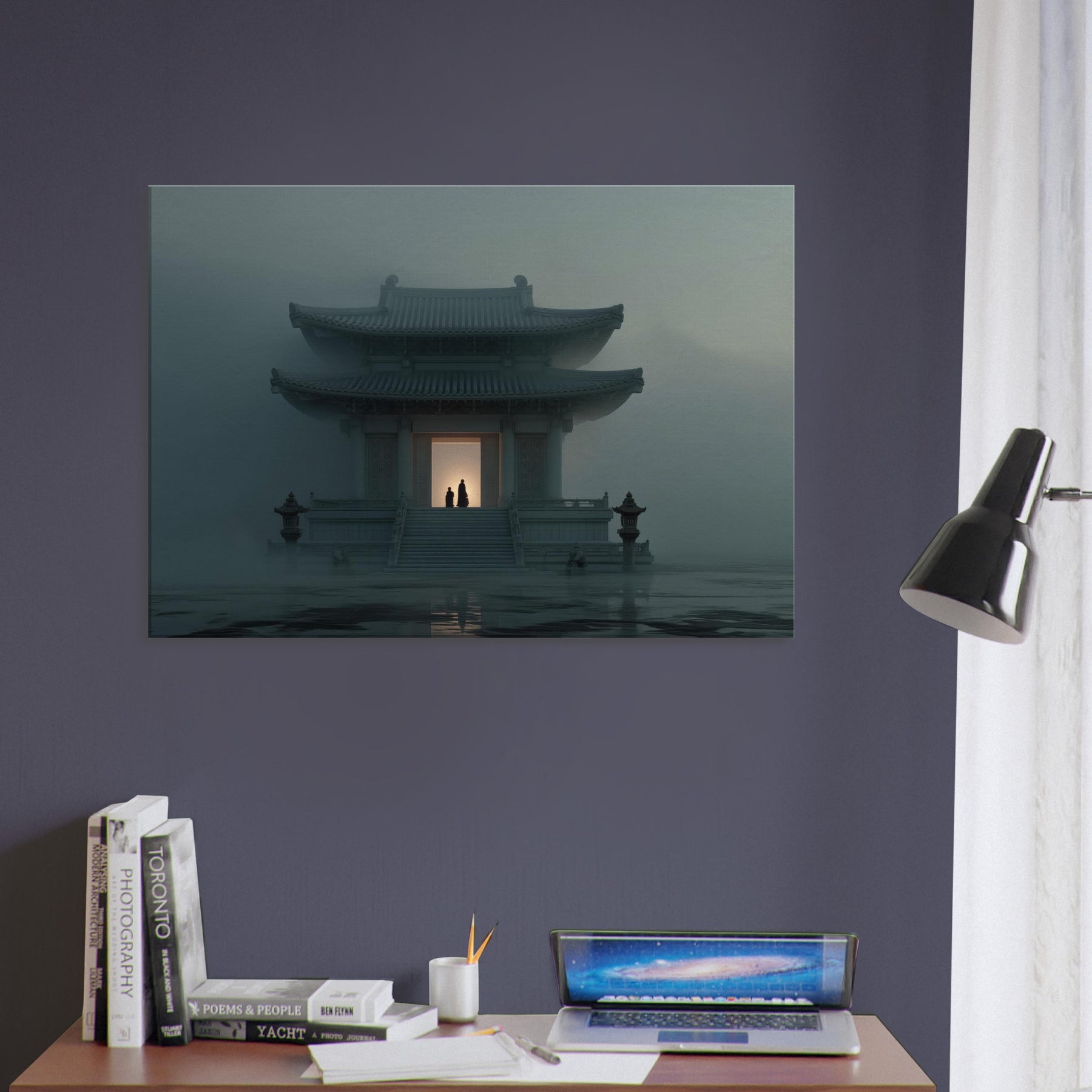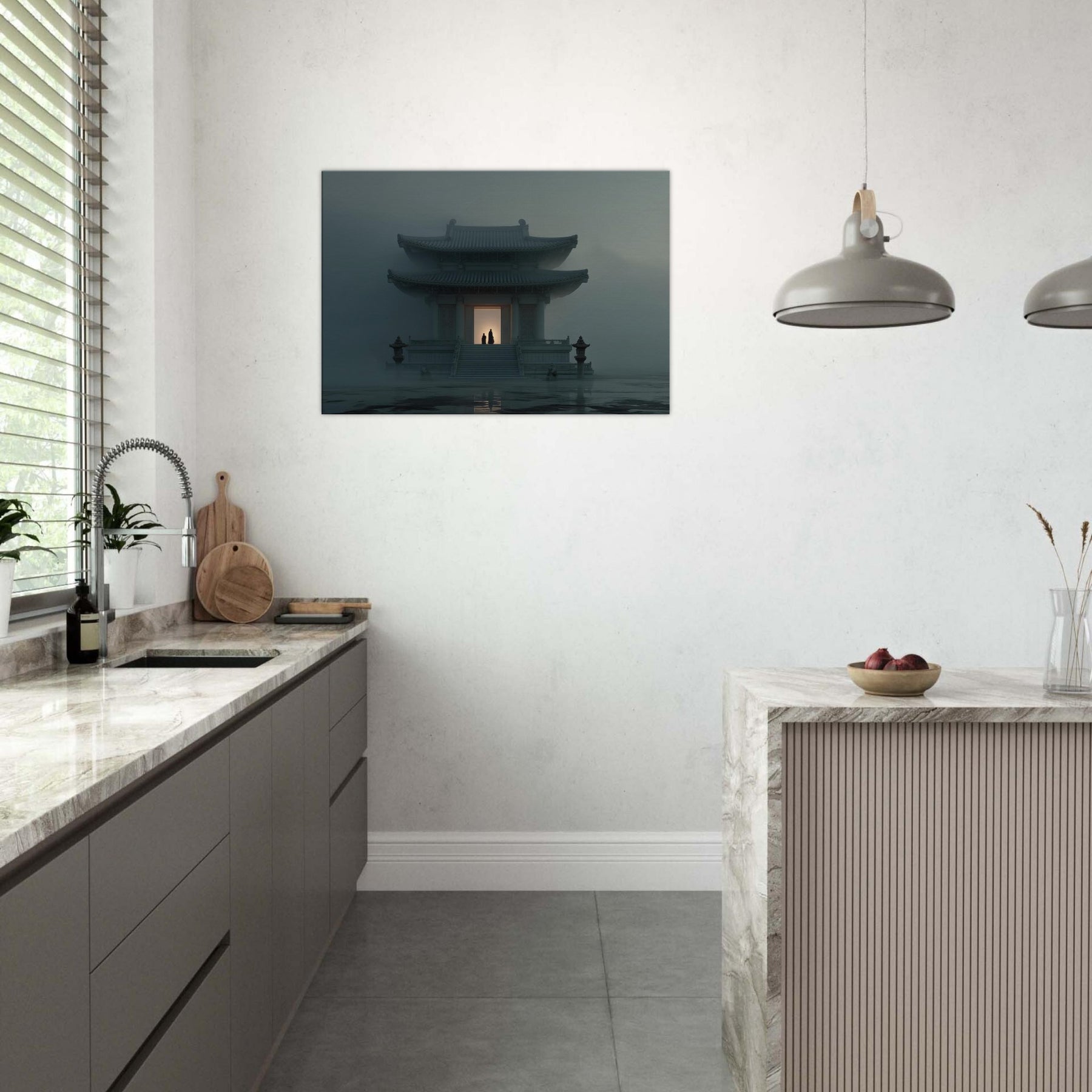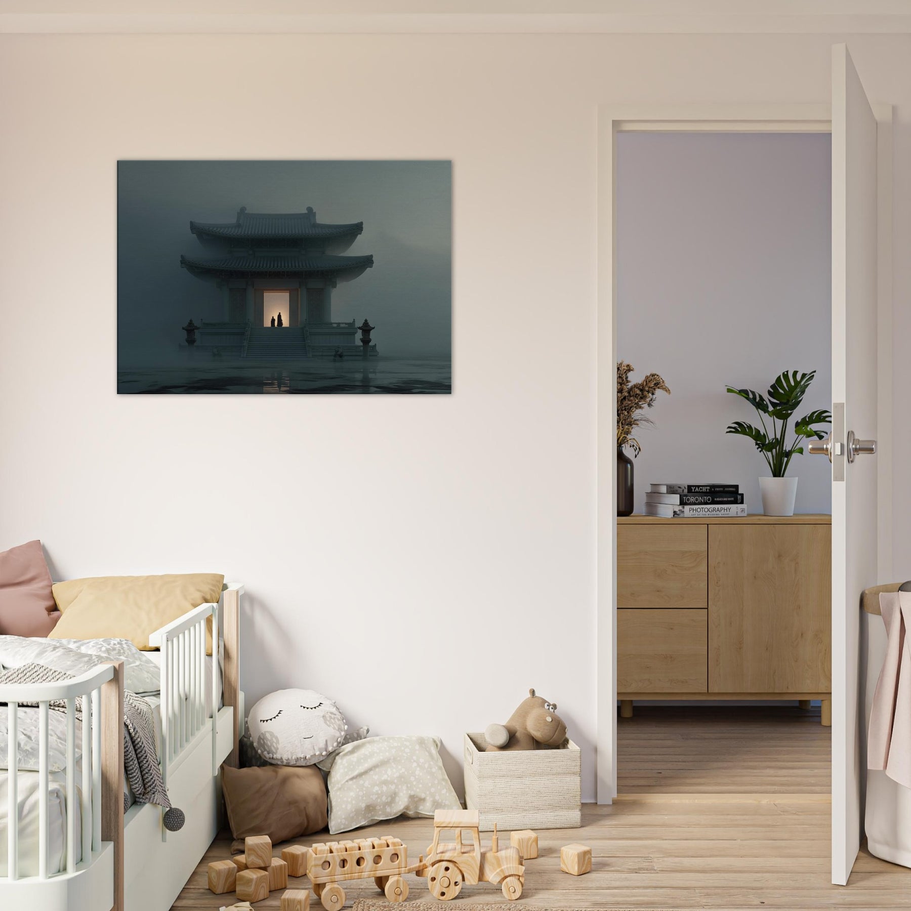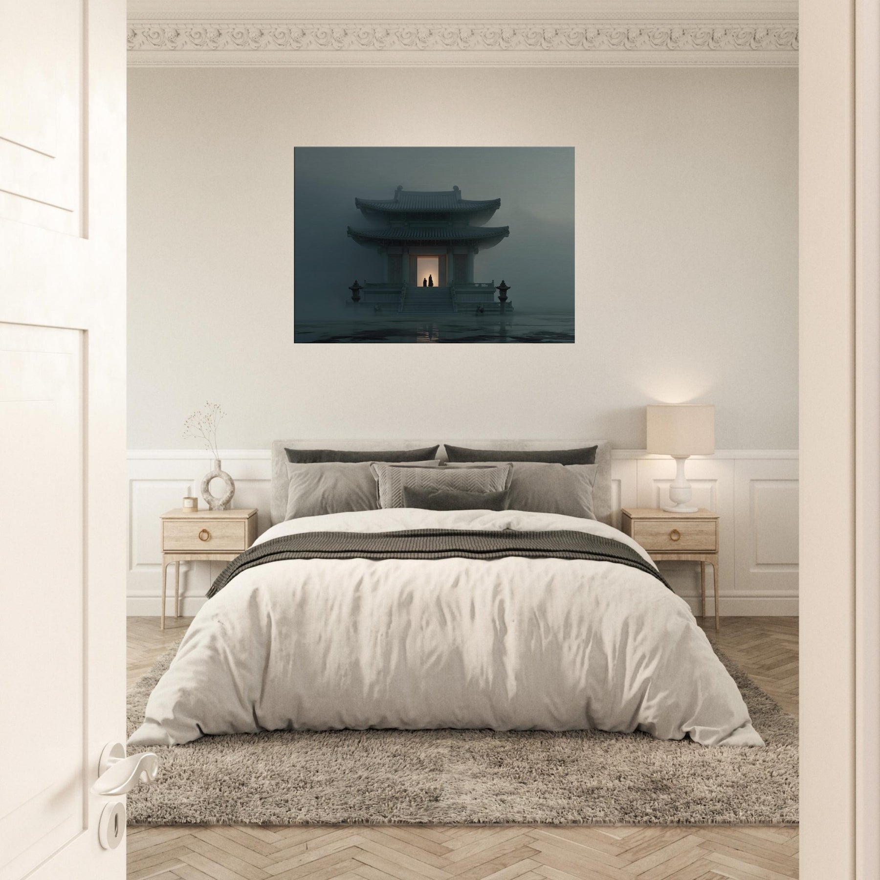 Bathed in moonlit fog, a solitary Pagoda rises from still water, its tiers catching a warm interior glow. This surreal composition folds cityscape into temple, inviting quiet contemplation within a living space. Subtle echoes of architecture drift across walls, while stairs dissolve into mist, turning the room into a dreamlike harbor. A poised balance of geometry and tenderness, it transforms everyday moments into a serene ritual where ambition, memory, and calm converge in one elegant, unforgettable focal point.