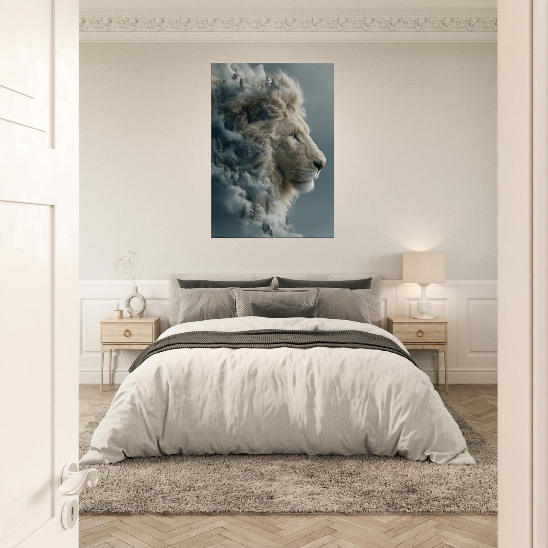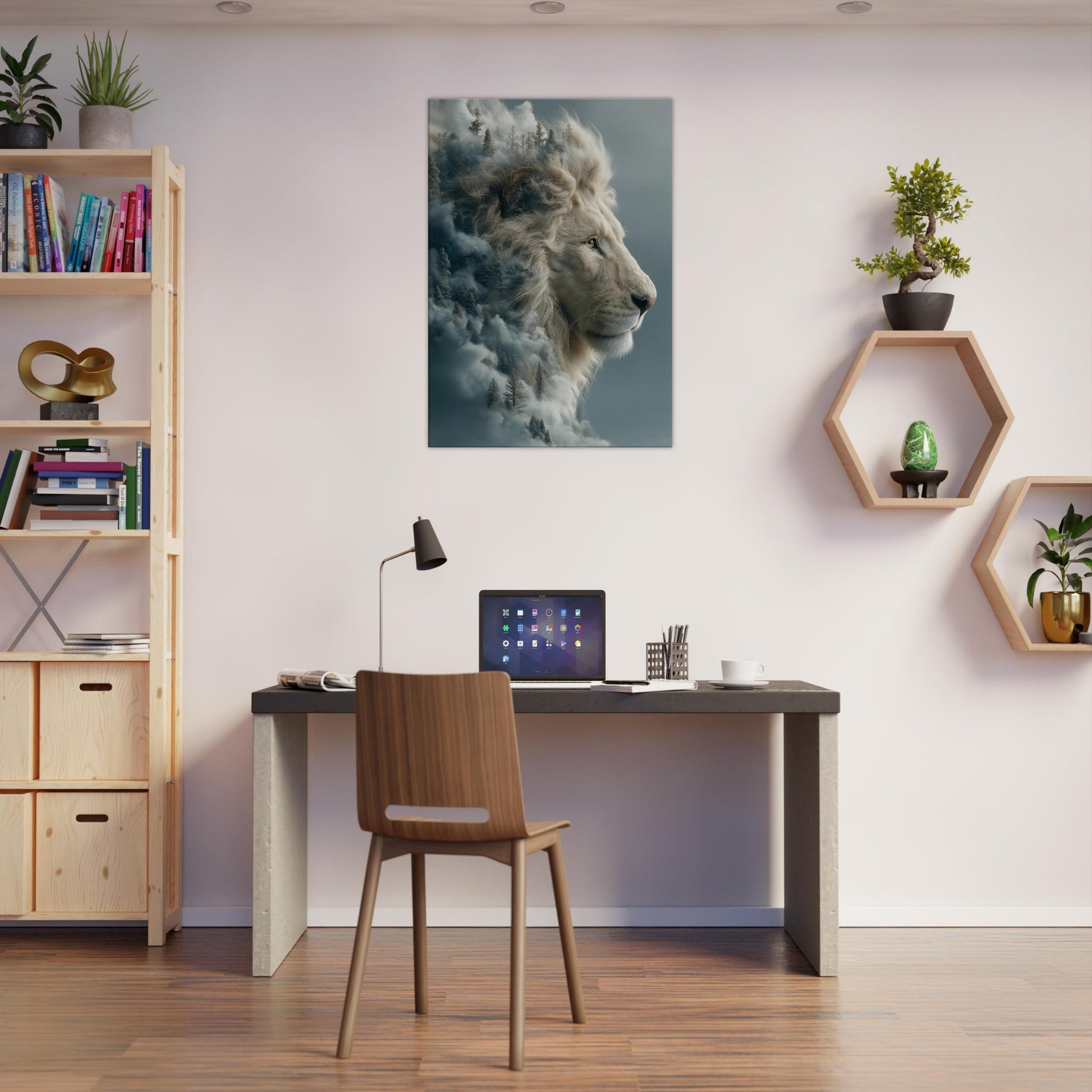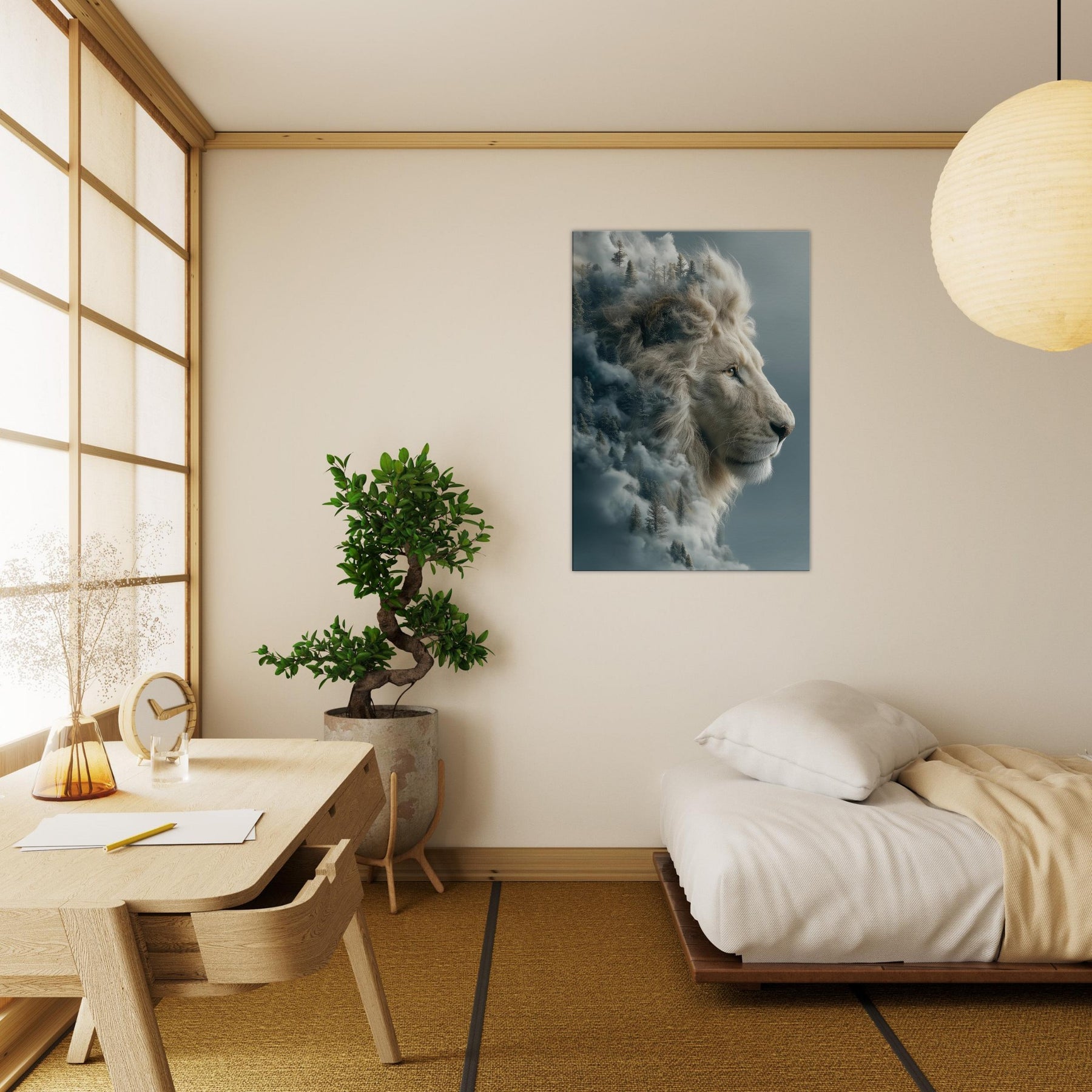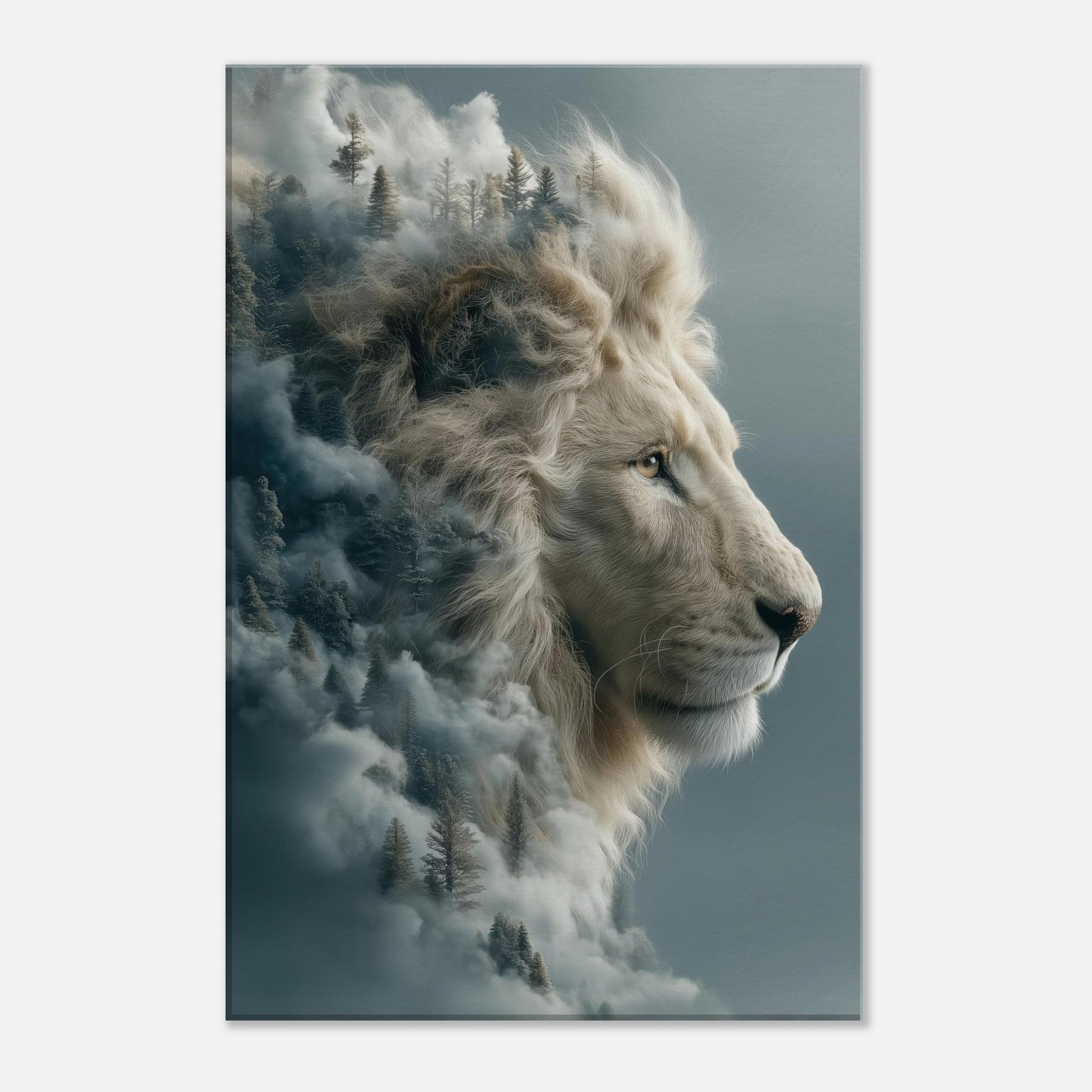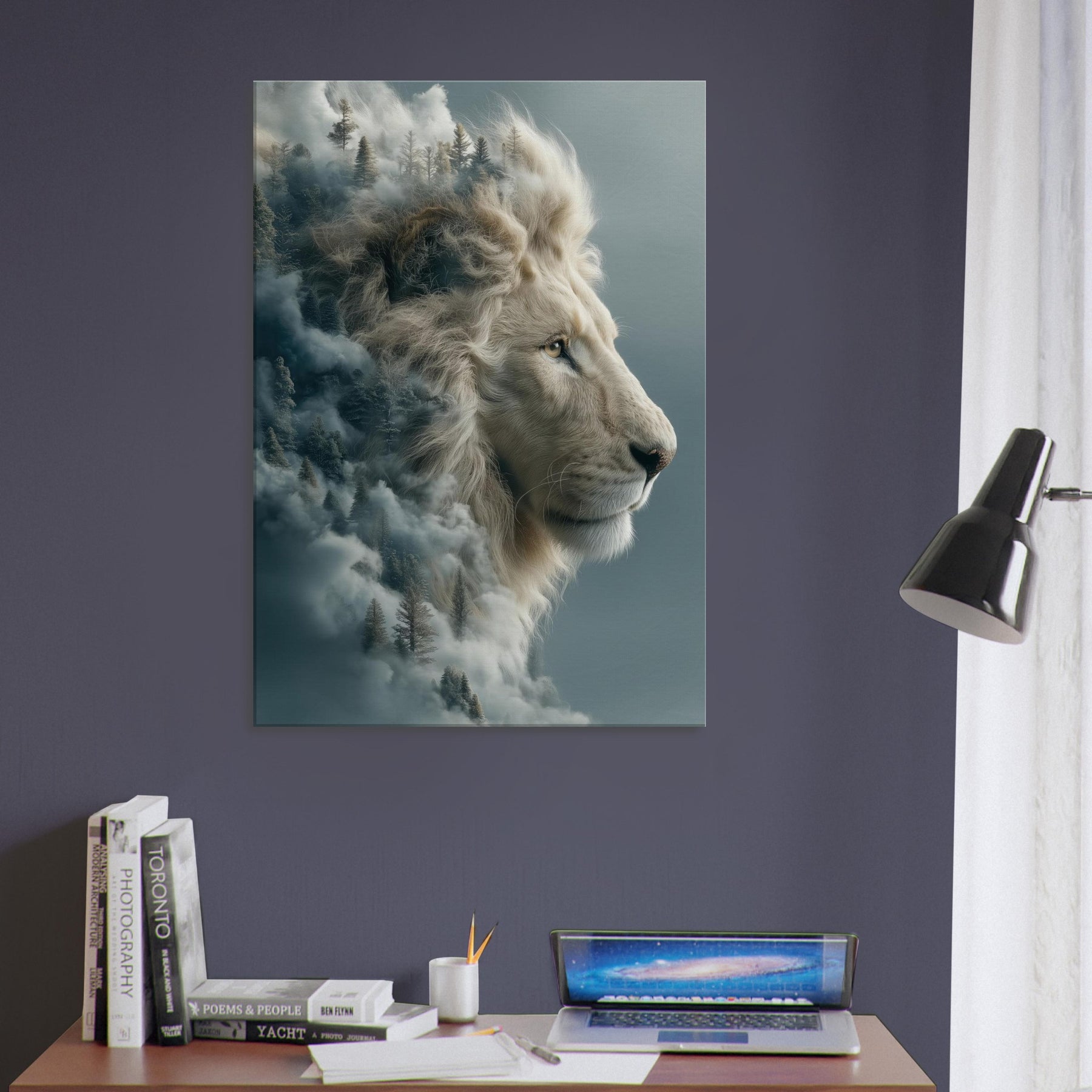 An arresting fusion of dream and nature, this piece drifts between forest fog and a regal Lion’s profile. Moonlit fur glows, while conifers drift through the atmosphere like memory, collapsing boundaries between wild and room. Surreal textures swirl across the canvas, creating a quiet drama that invites pause, reflection, and dreamlike focus. Hang it in a living room or study to deepen color, warmth, and conversation; the Lion becomes a poised sentinel, guiding evenings with subtle power and grace.