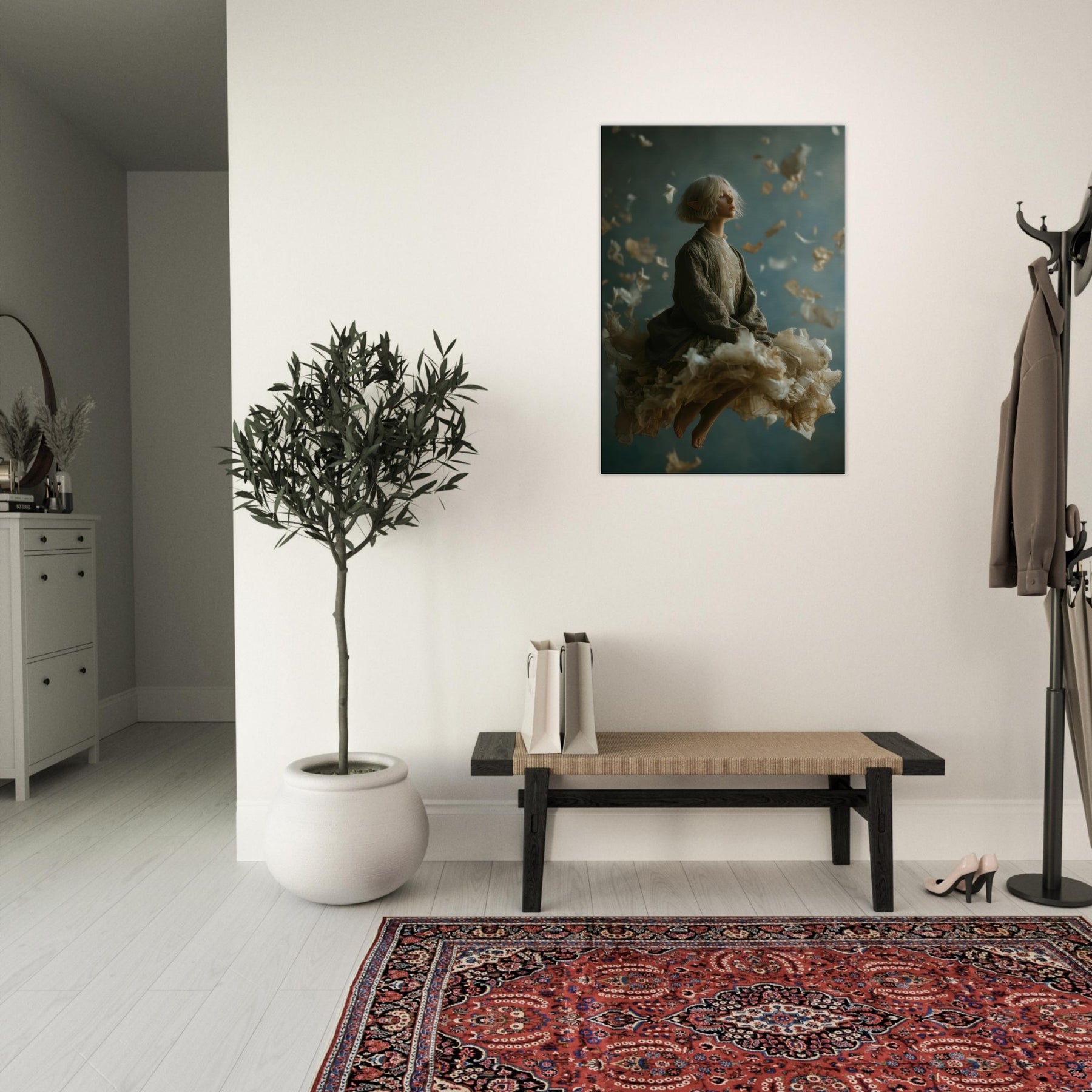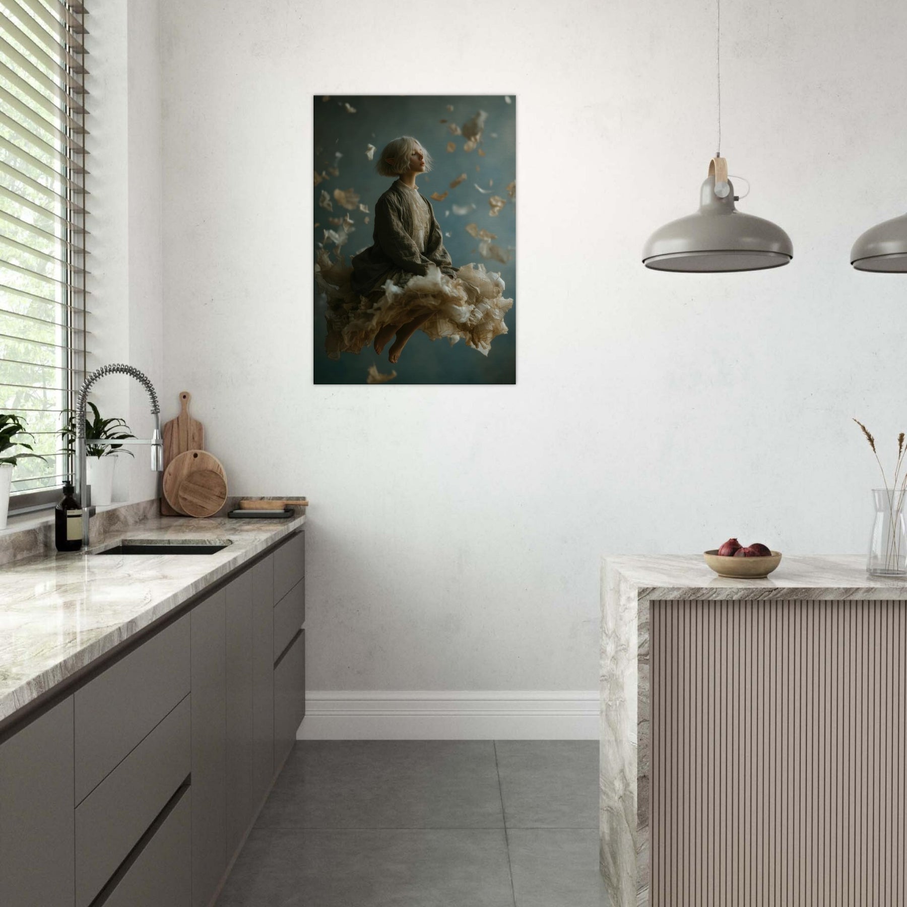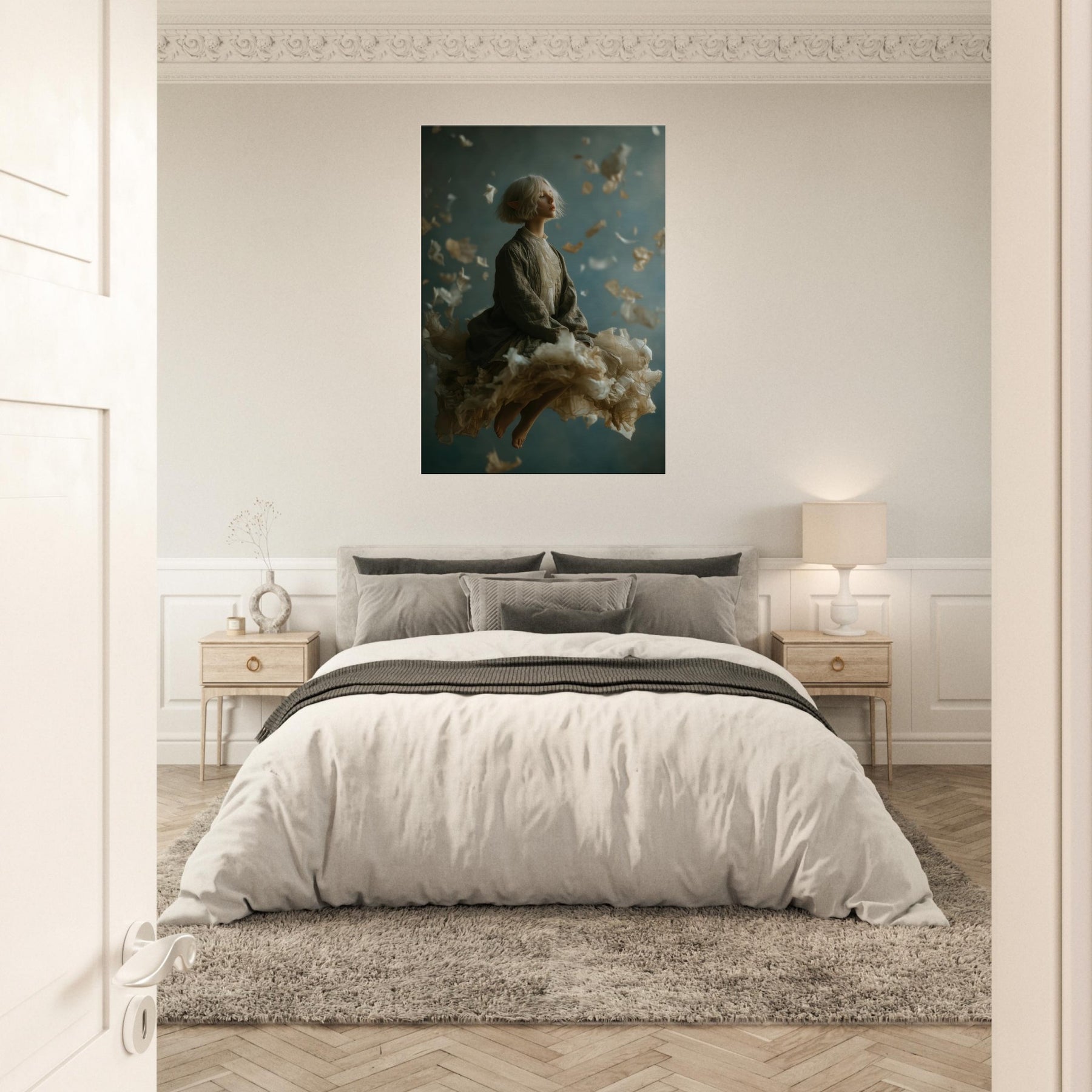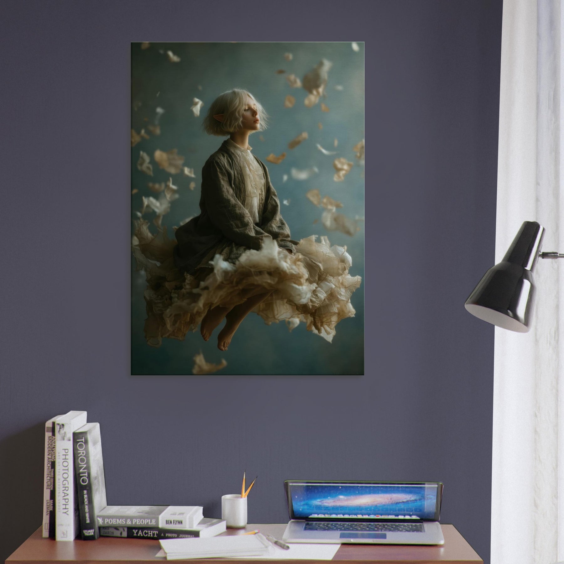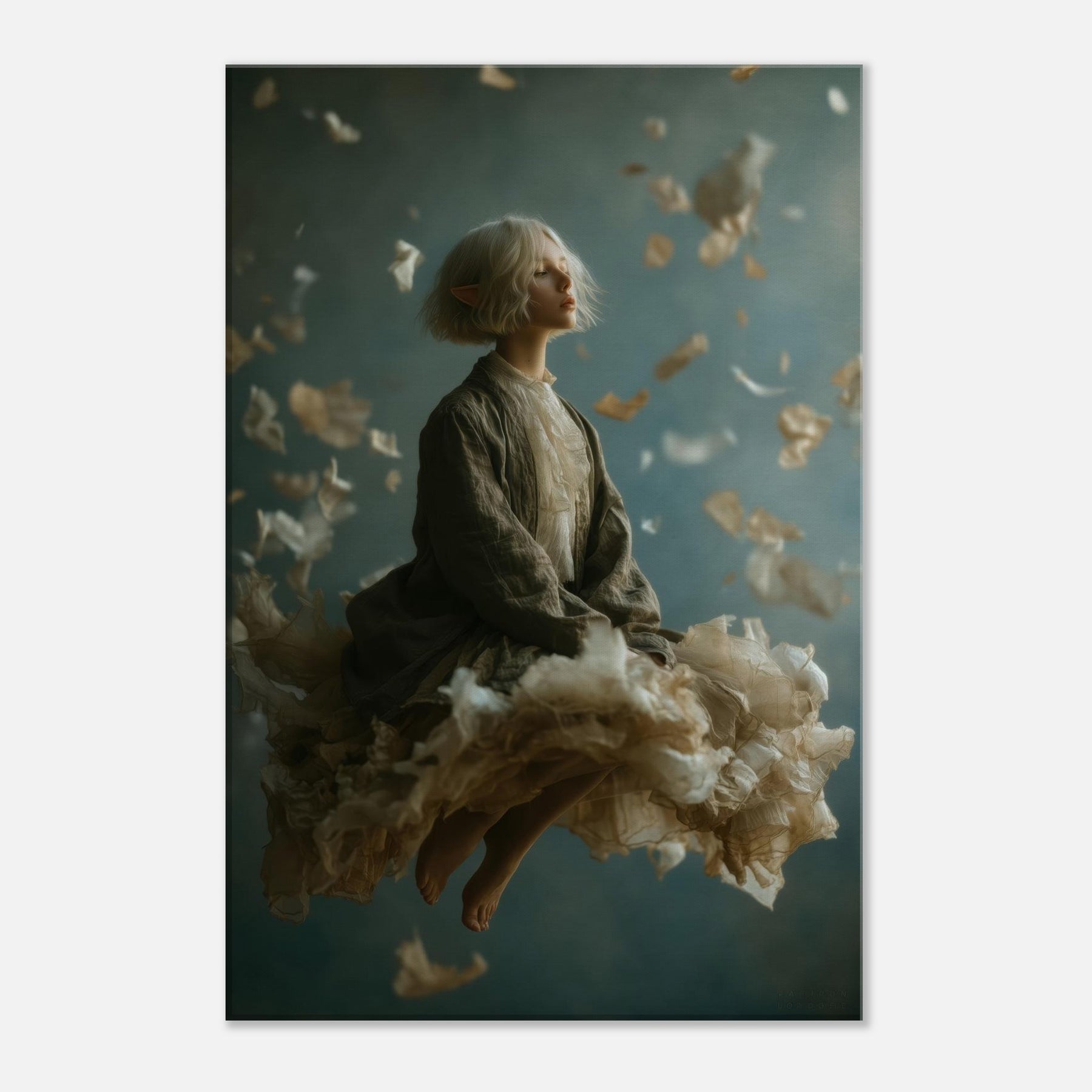 Bathed in iridescent light, this surreal work centers a Mystical Elf as leaves drift like whispers around her. Her velvet cloak and pale, otherworldly features glow with quiet luminosity. The dreamlike scene blends memory and fantasy, inviting slow, meditative gazes. With a muted palette and airy composition, it brings calm, imagination, and gentle wonder to any room transforming a wall into a doorway for nightly reverie and conversations that linger.