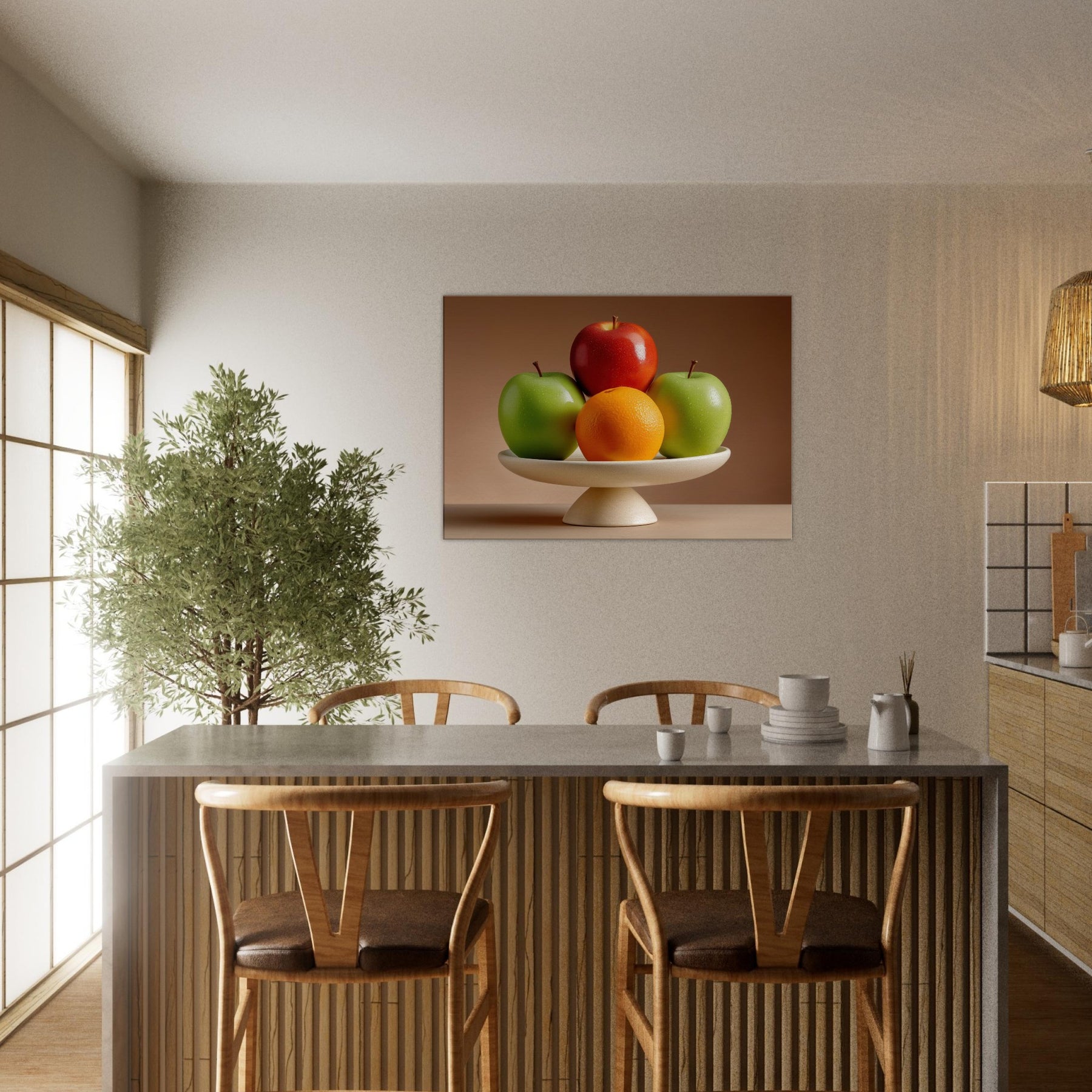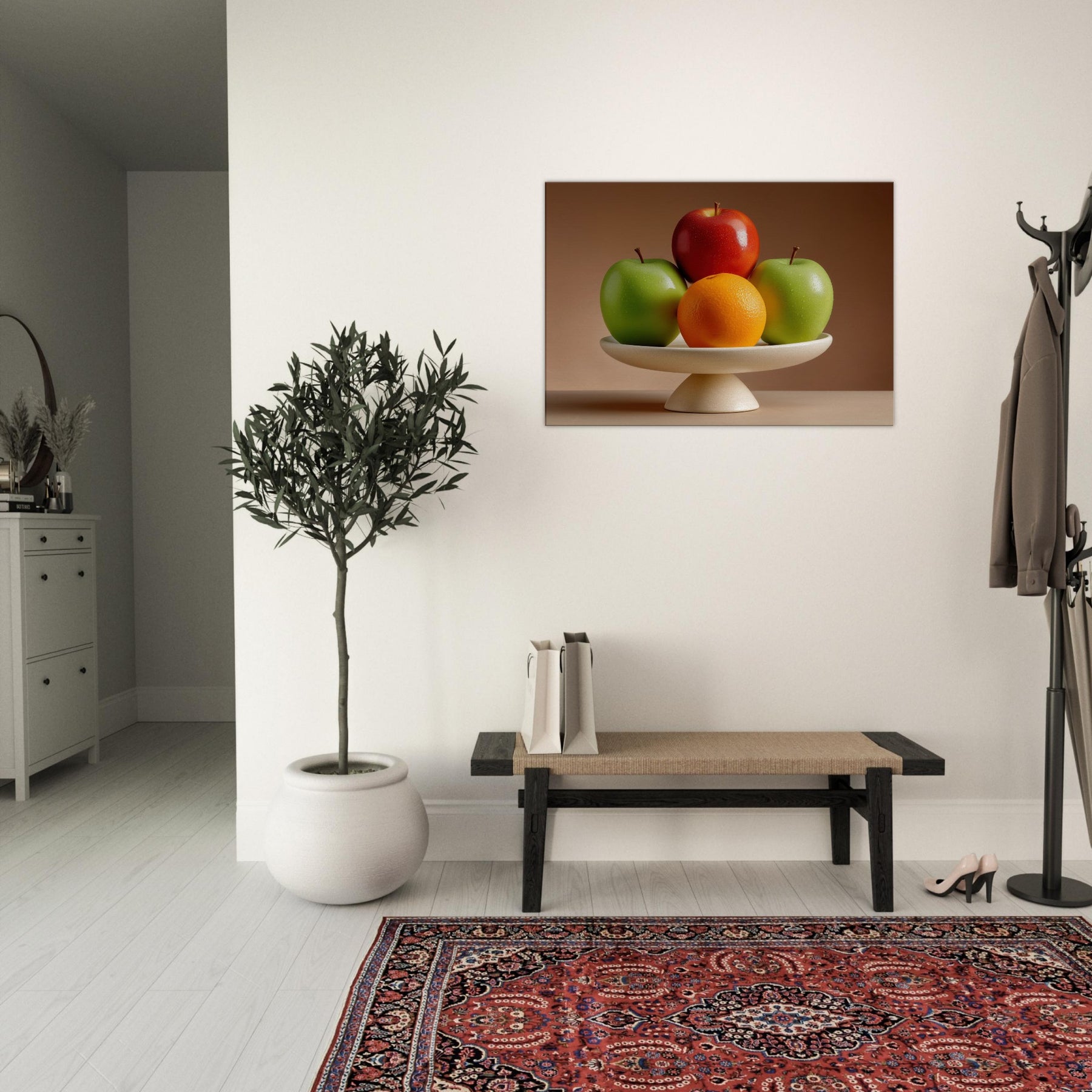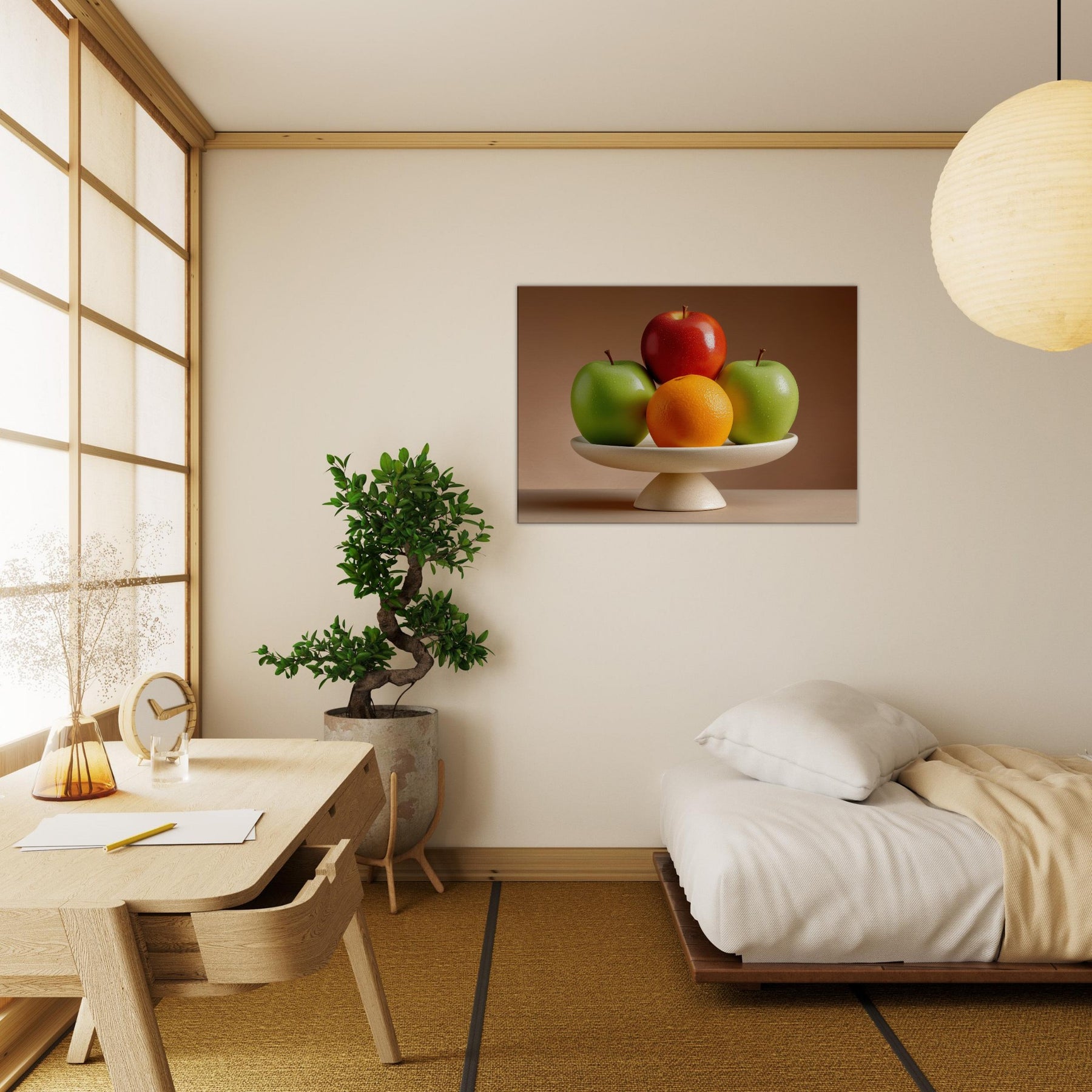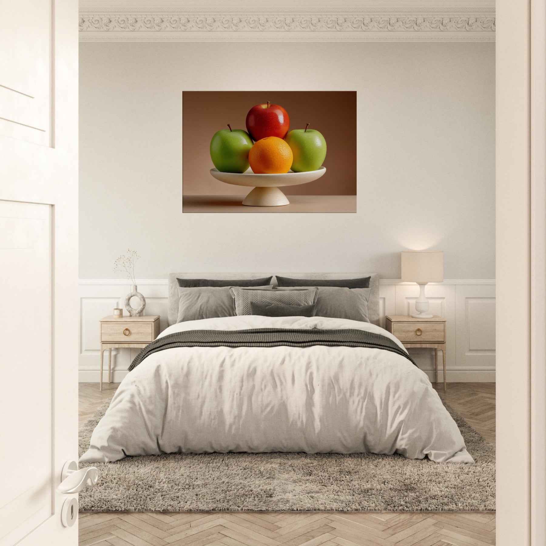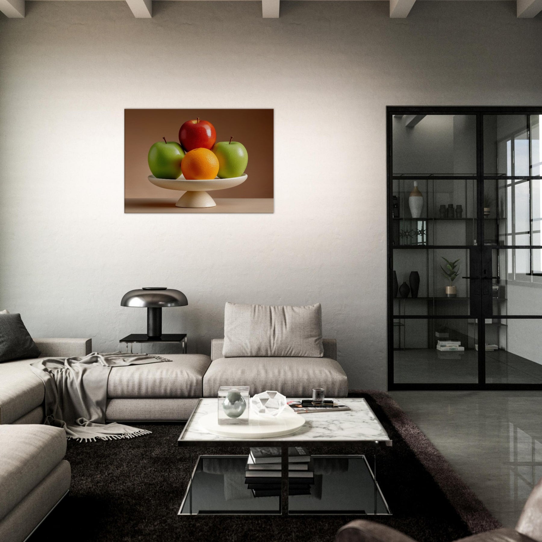 Like a dream you can hang on the wall, this Fruit Bowl gathers familiar colors into an impossible still life. Apples in jade and ruby cradle an orange within a pale pedestal, set against a warm, sun kissed backdrop that seems to breathe. The surreal arrangement invites quiet reflection and a touch of whimsy, transforming a simple everyday scene into mood and meaning. Perfect for a living room or study, it adds color, texture, and a calm, cinematic atmosphere.