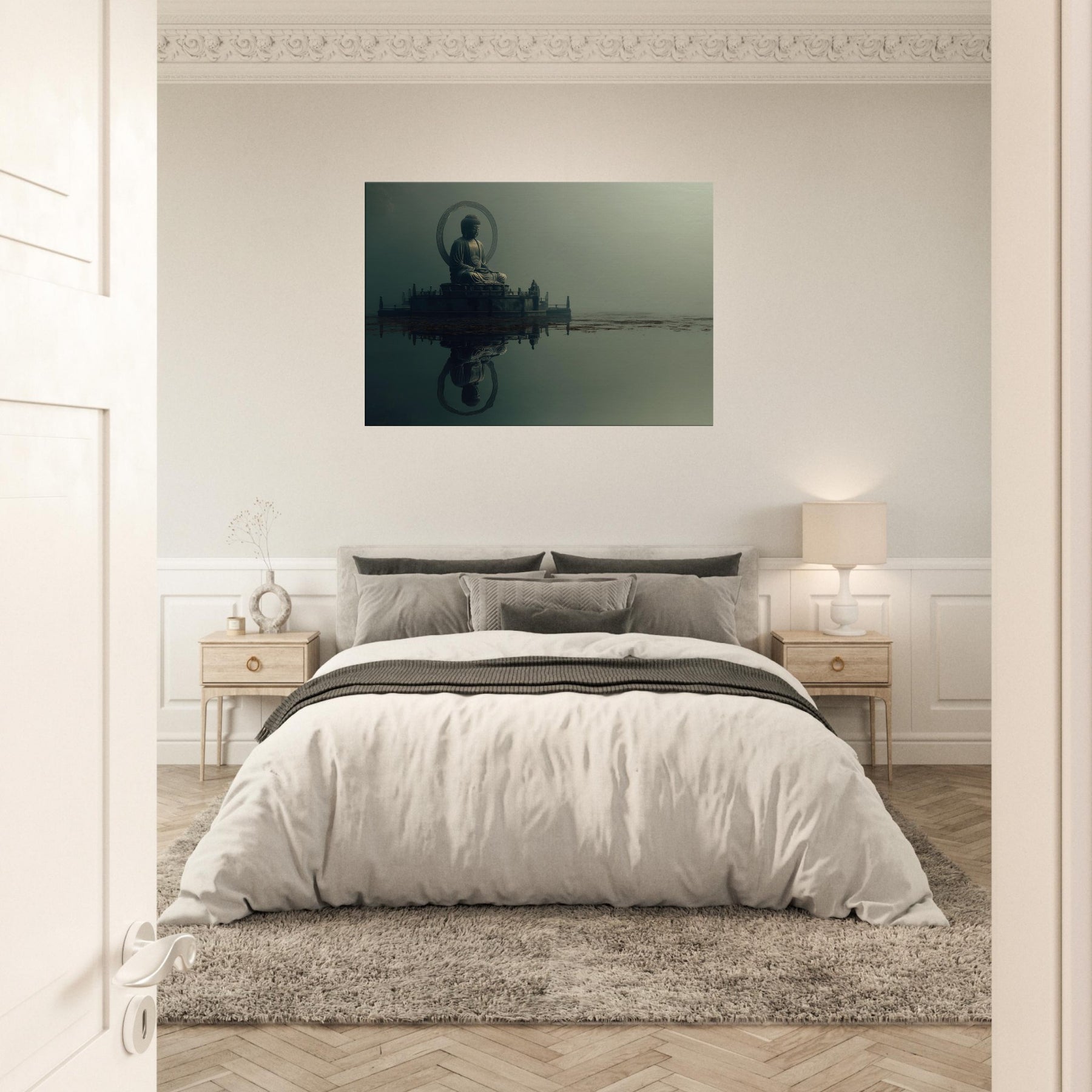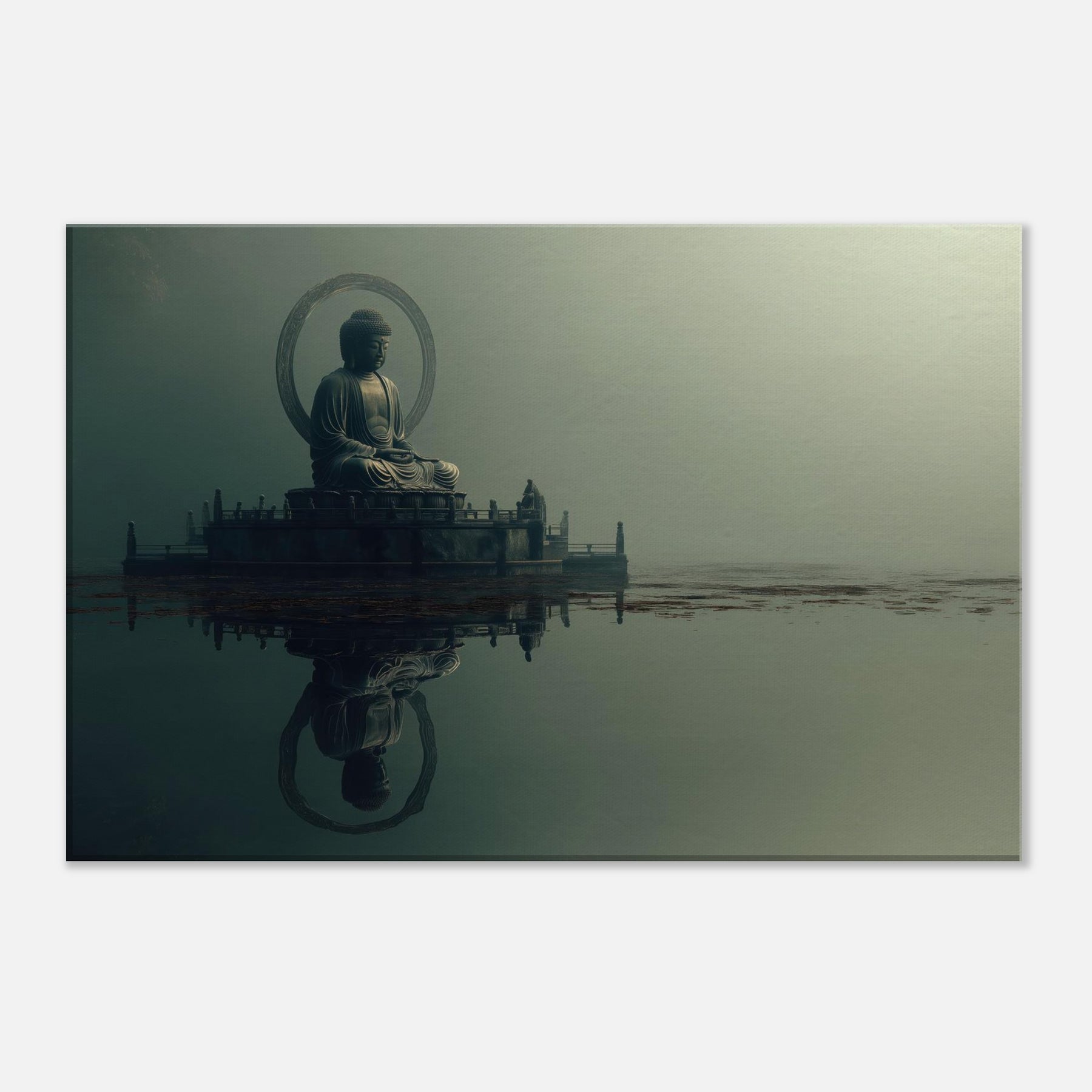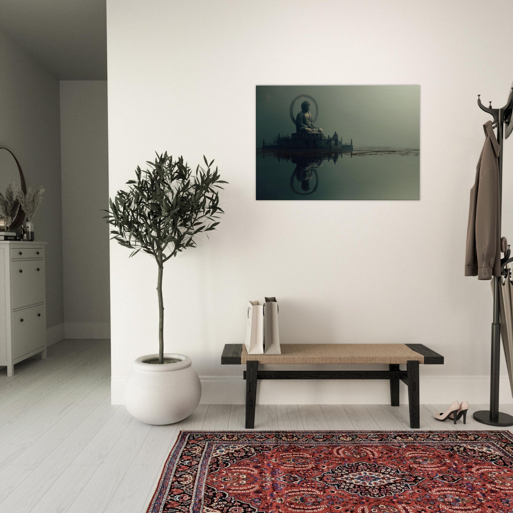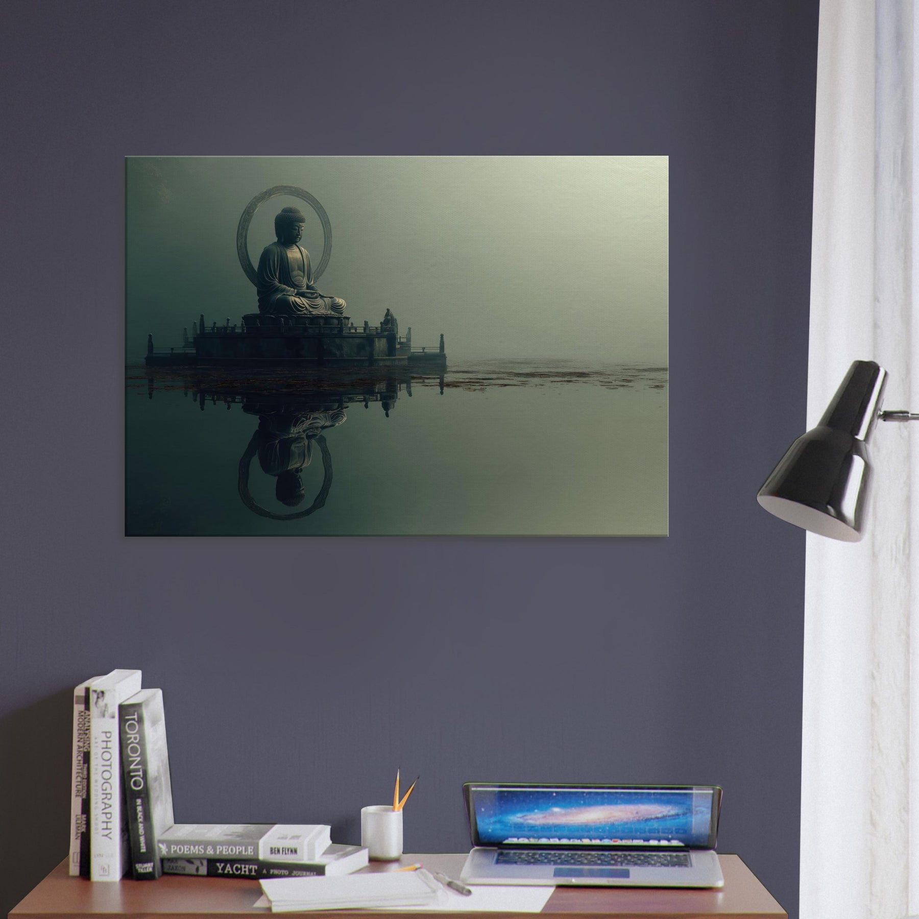 Buddha rests on a submerged platform, haloed by a circular ring as mist swirls around a tranquil sea. This surreal, mystical composition fuses quiet majesty with dreamlike geometry, inviting a room to breathe with each glance. The muted palette and reflective surface transform walls into a contemplative sanctuary, enhancing living spaces with calm, focus, and wonder. Perfect as a centerpiece in a serene corner or entry, it turns daily moments into meditative, almost ritual stillness.