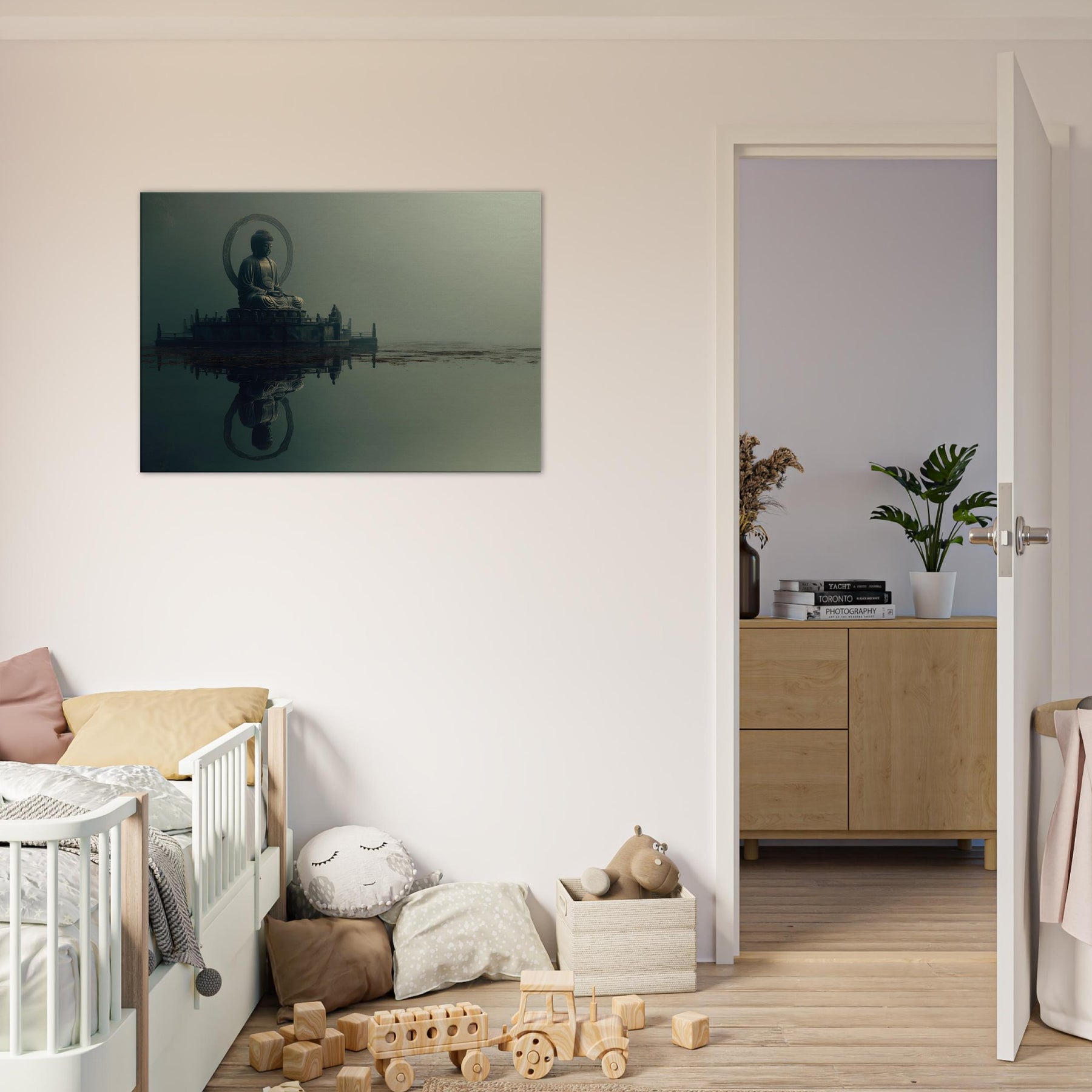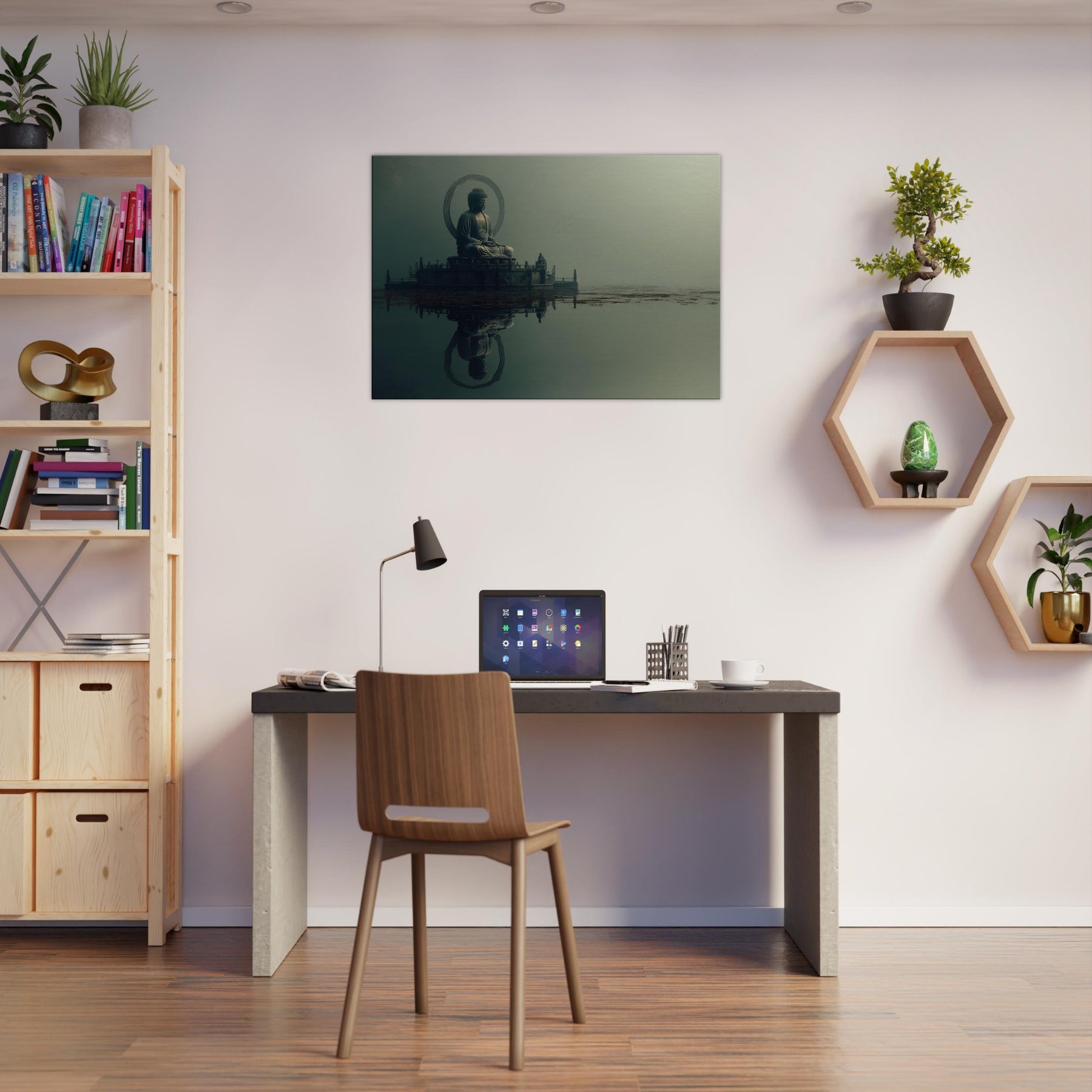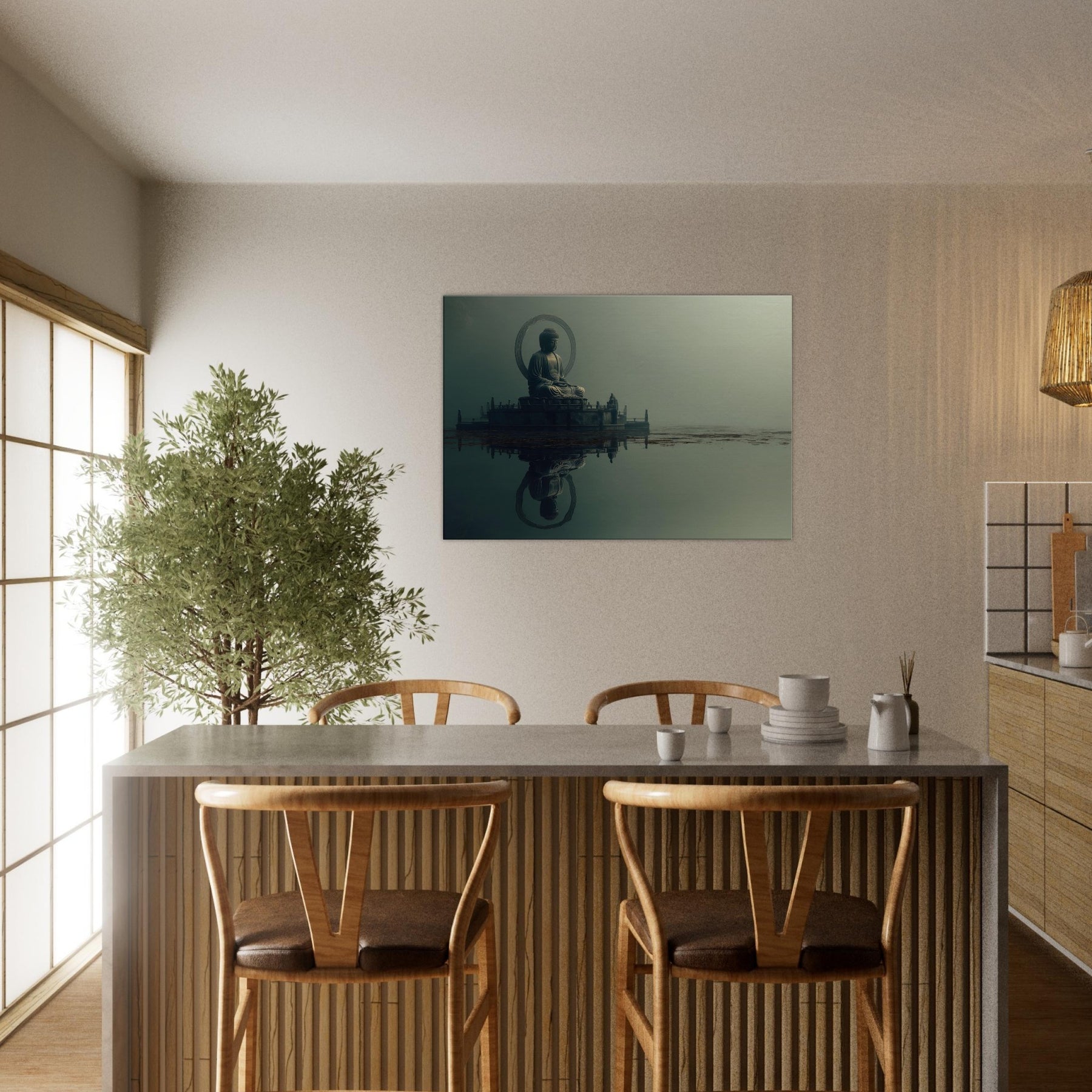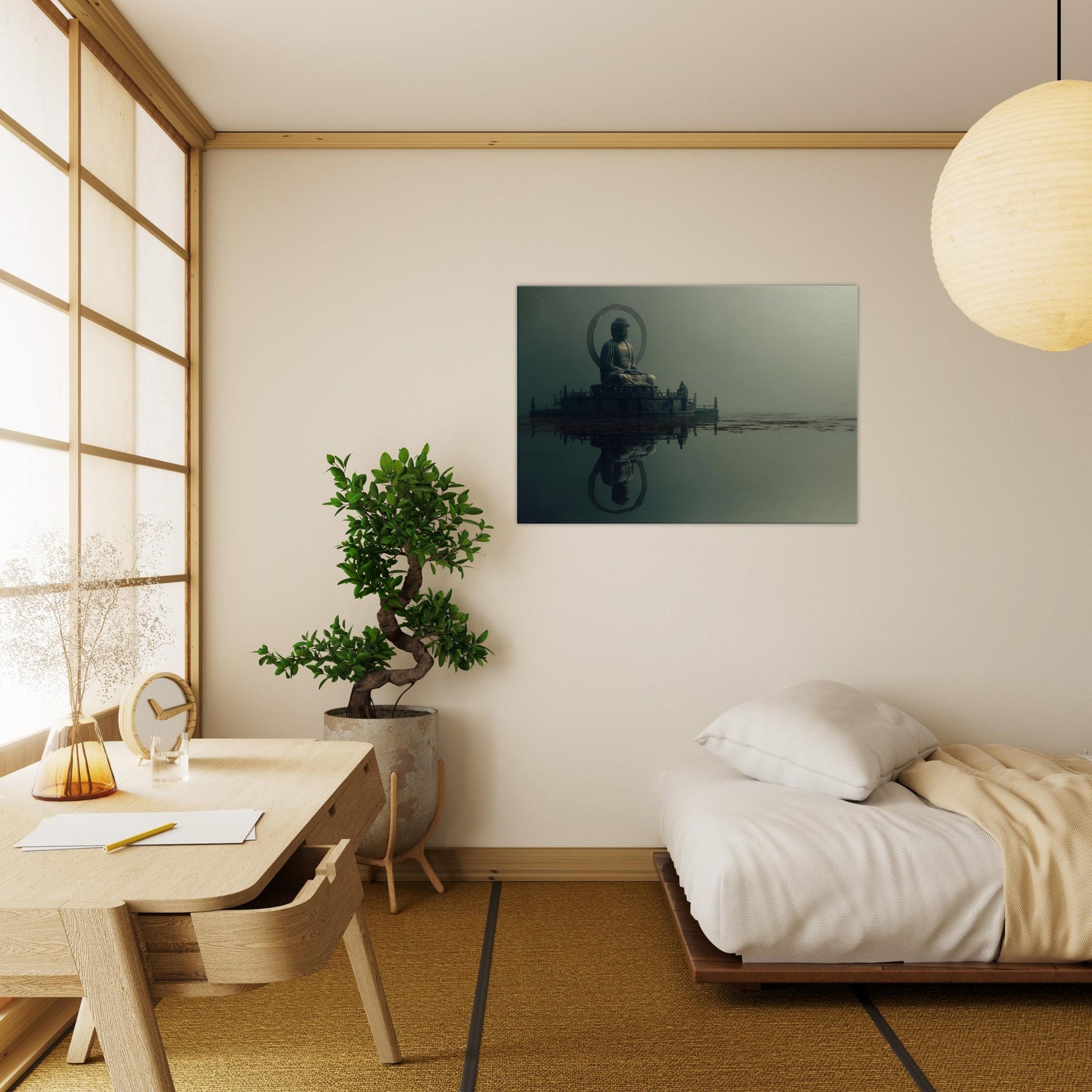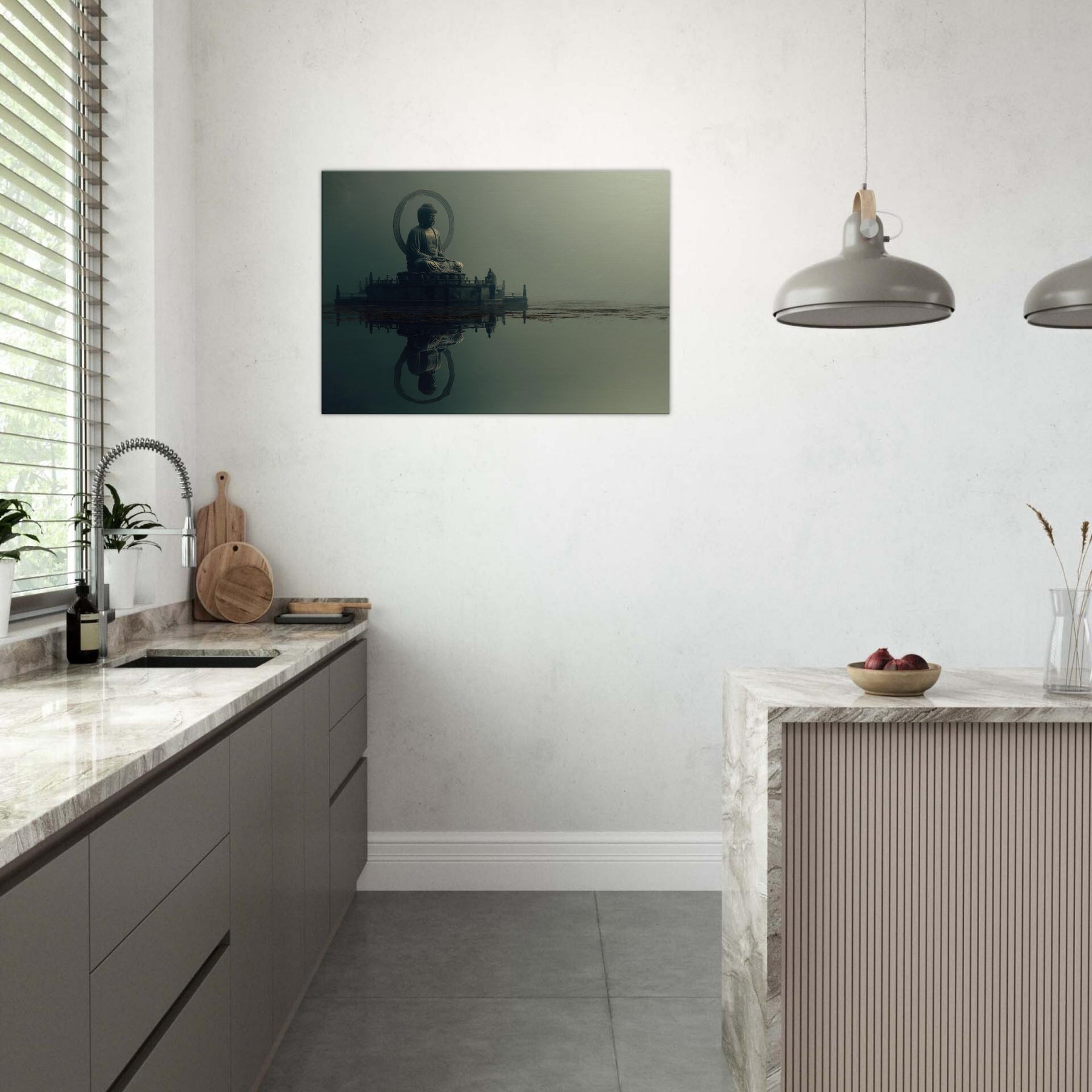 Buddha rests on a submerged platform, haloed by a circular ring as mist swirls around a tranquil sea. This surreal, mystical composition fuses quiet majesty with dreamlike geometry, inviting a room to breathe with each glance. The muted palette and reflective surface transform walls into a contemplative sanctuary, enhancing living spaces with calm, focus, and wonder. Perfect as a centerpiece in a serene corner or entry, it turns daily moments into meditative, almost ritual stillness.