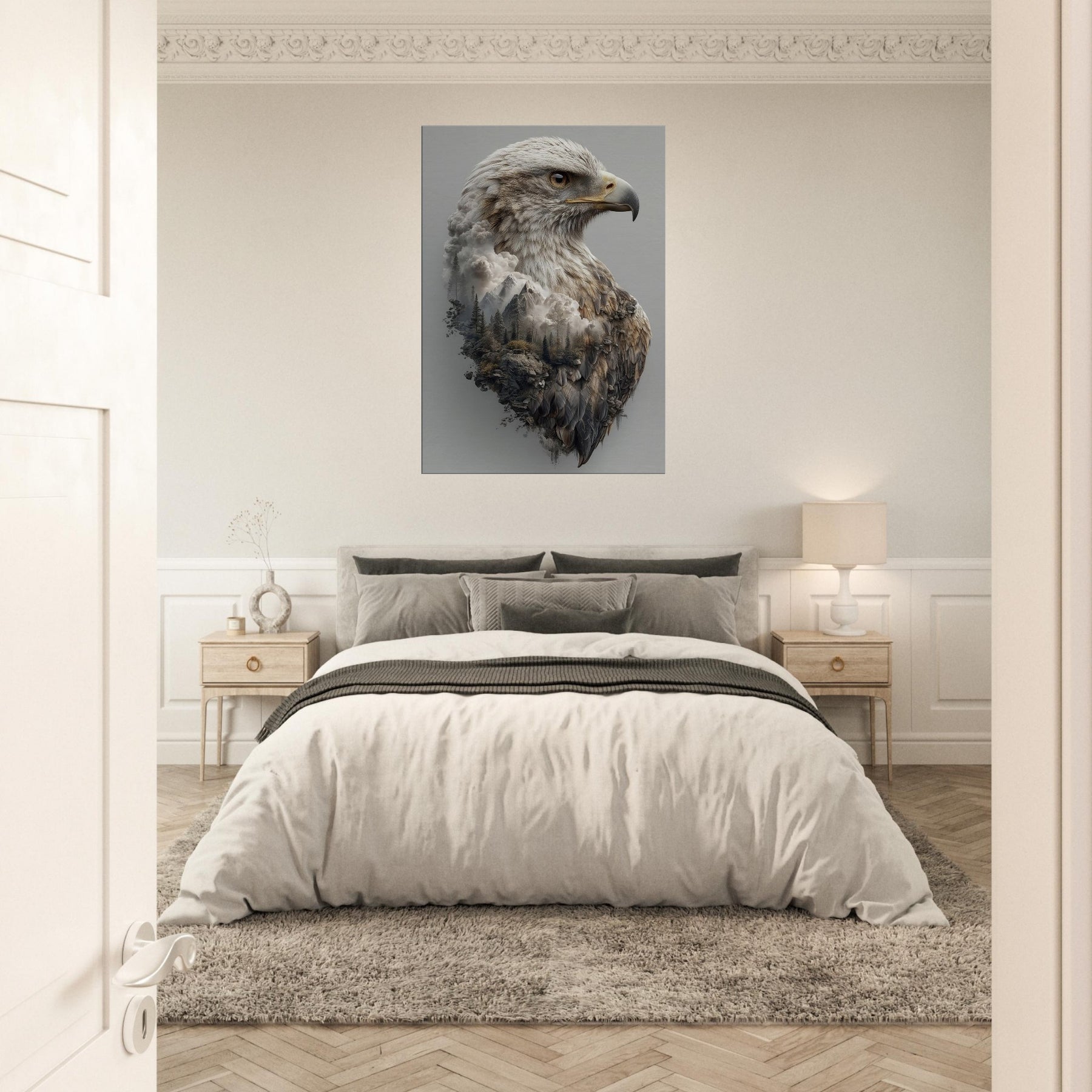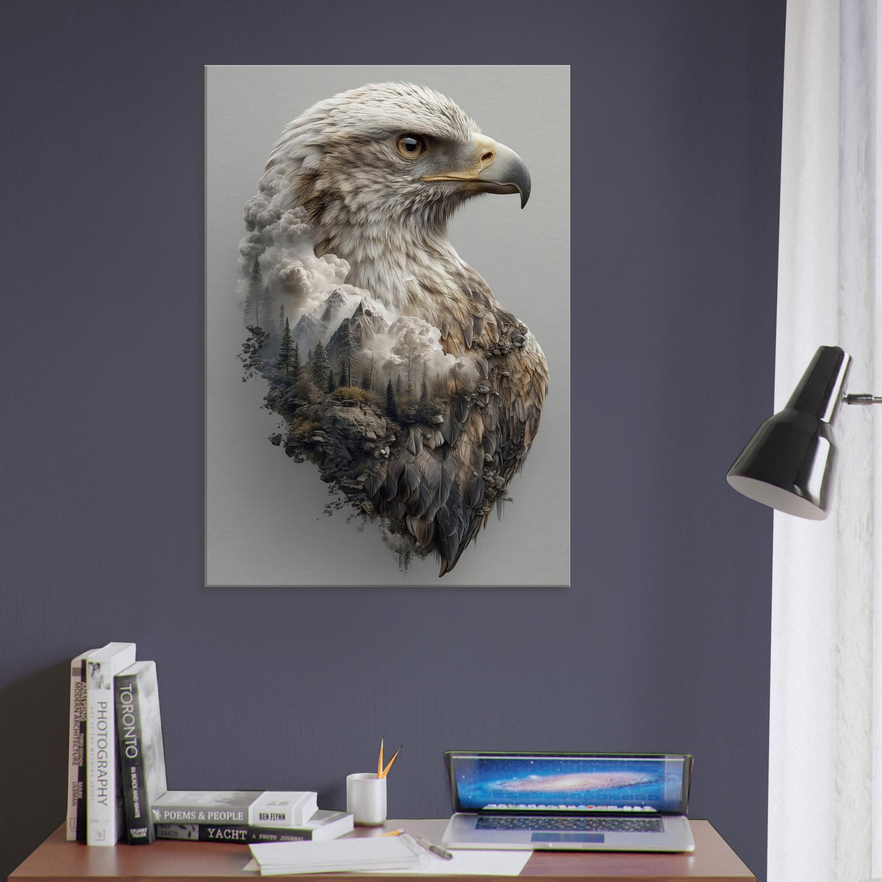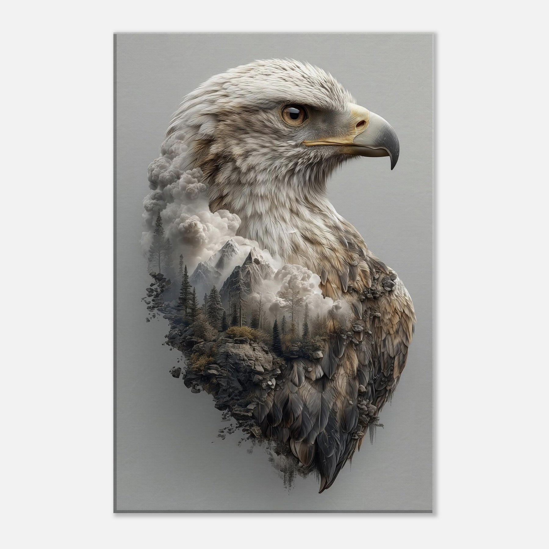 An arresting meditation on ascent, this piece centers the Eagle in a dreamlike where mountains mingle with cloud and feather. The primary subject is rendered with tactile detail, while the surrounding terrain dissolves into mist, creating a tranquil tension between ground and sky. The atmosphere is quiet, expansive, and cinematic perfect for a living room, bedroom, or office. Hang it to invite contemplation, conversation, and a sense of soaring openness.