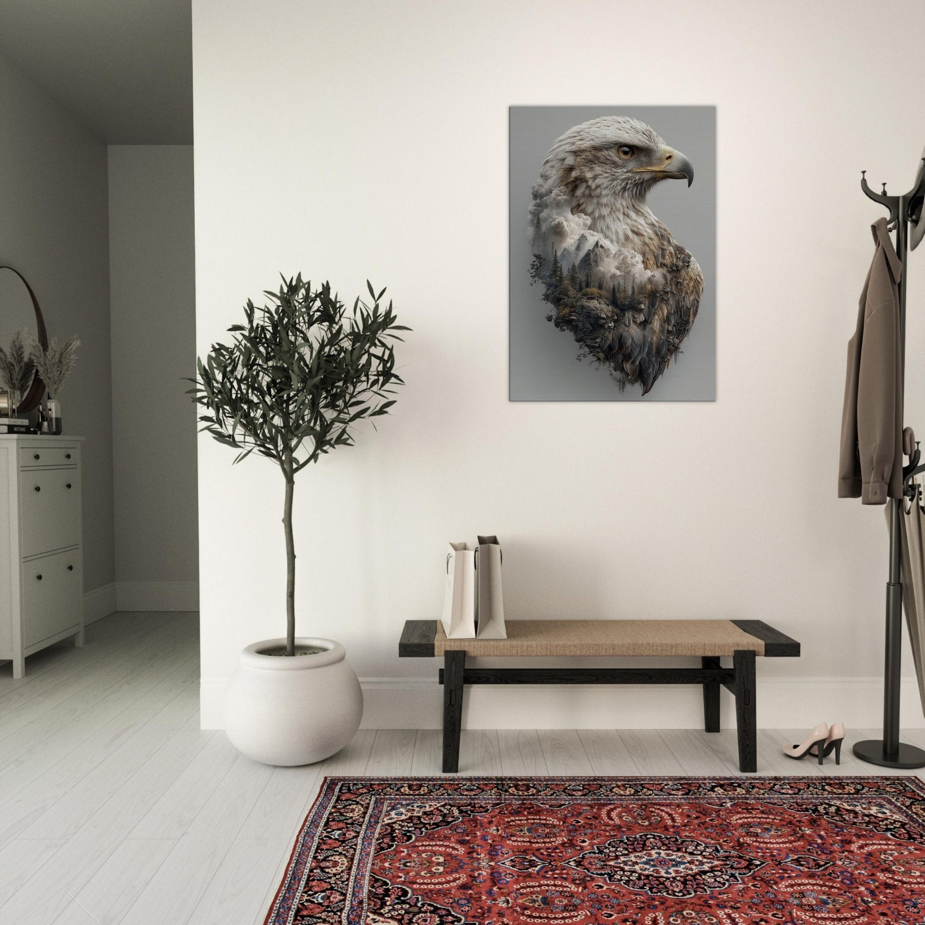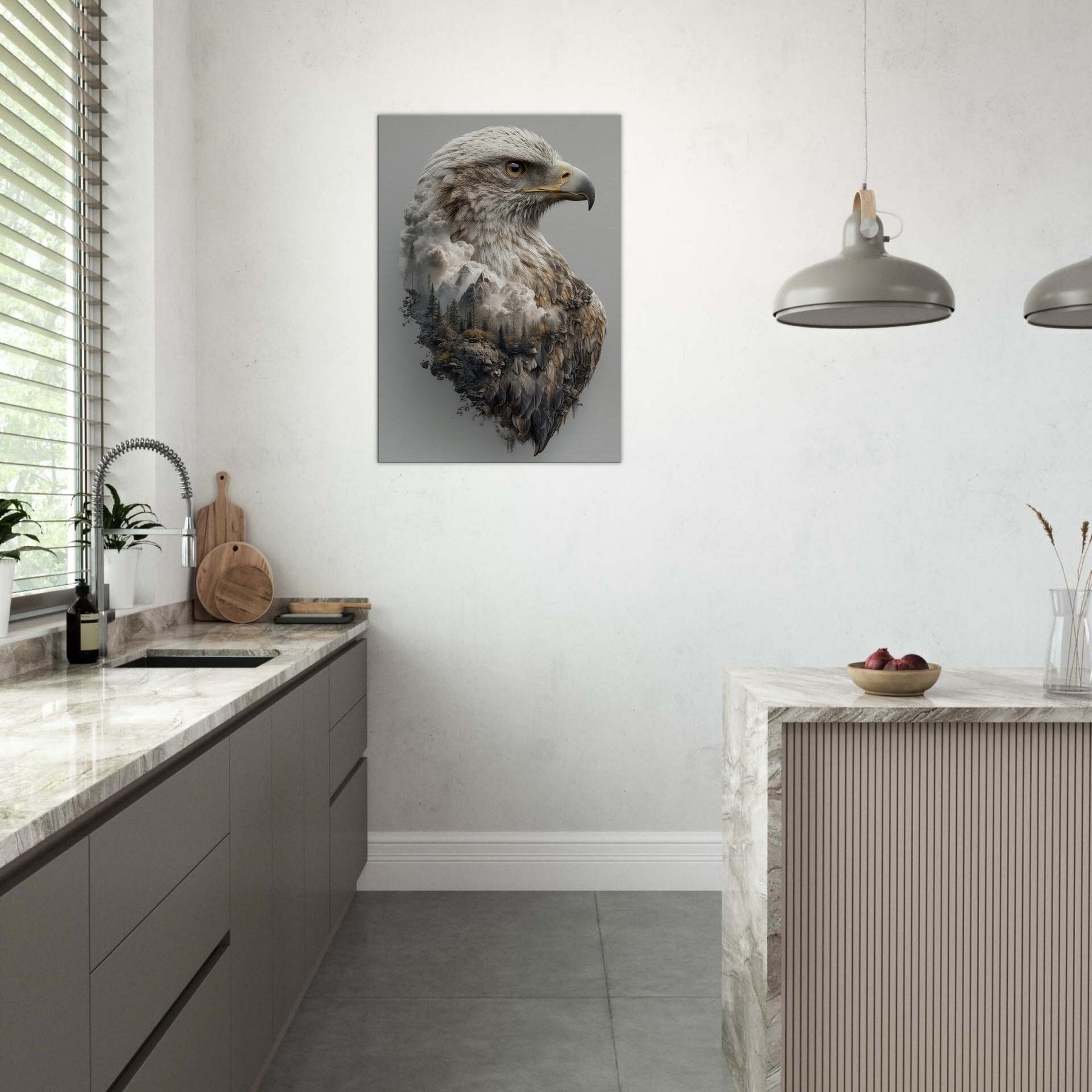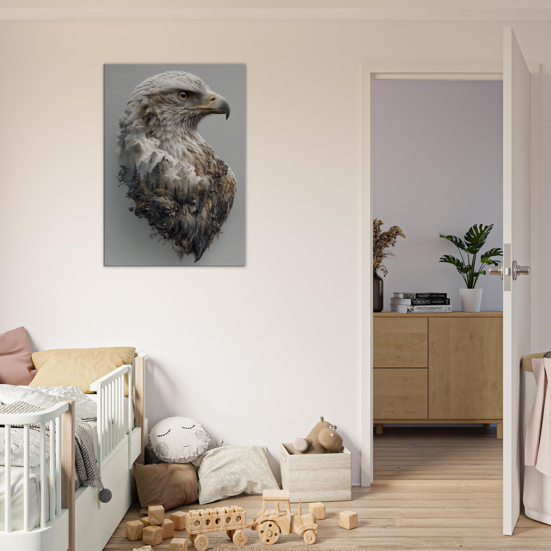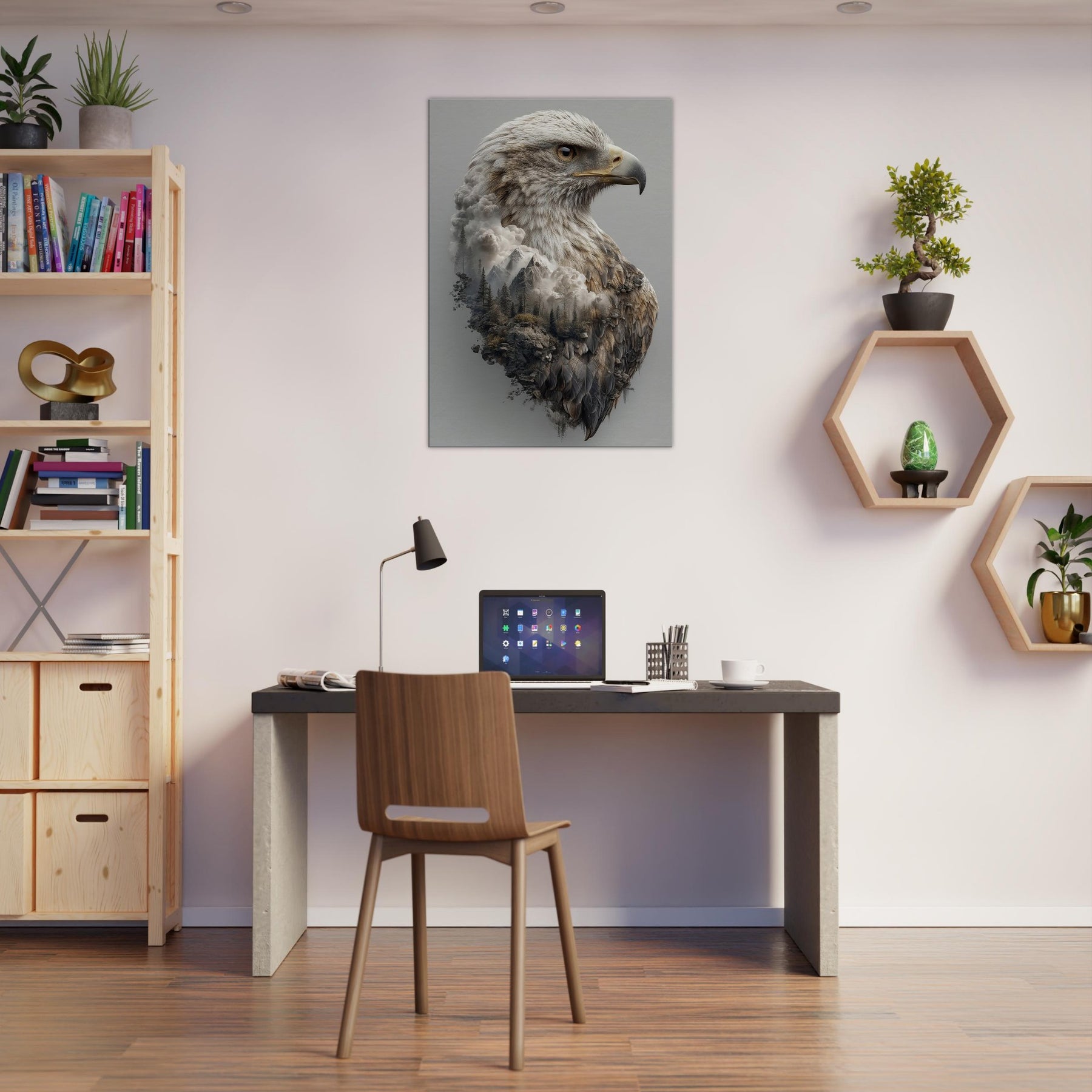 An arresting meditation on ascent, this piece centers the Eagle in a dreamlike where mountains mingle with cloud and feather. The primary subject is rendered with tactile detail, while the surrounding terrain dissolves into mist, creating a tranquil tension between ground and sky. The atmosphere is quiet, expansive, and cinematic perfect for a living room, bedroom, or office. Hang it to invite contemplation, conversation, and a sense of soaring openness.