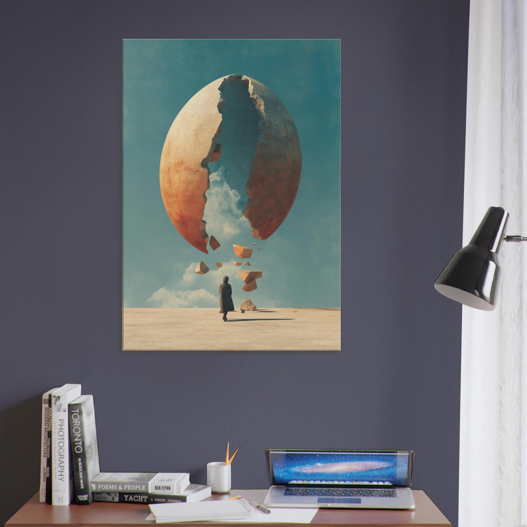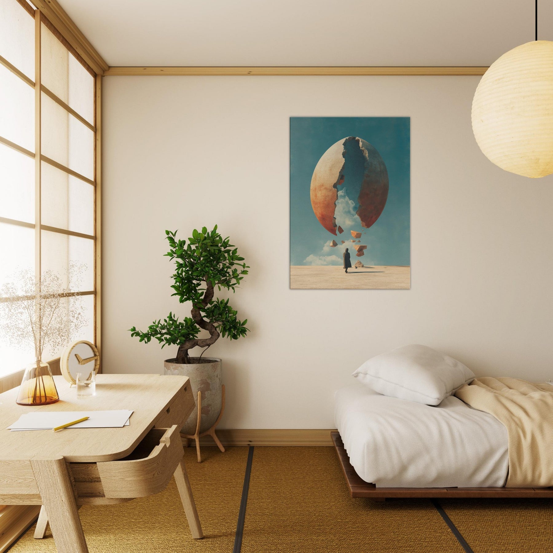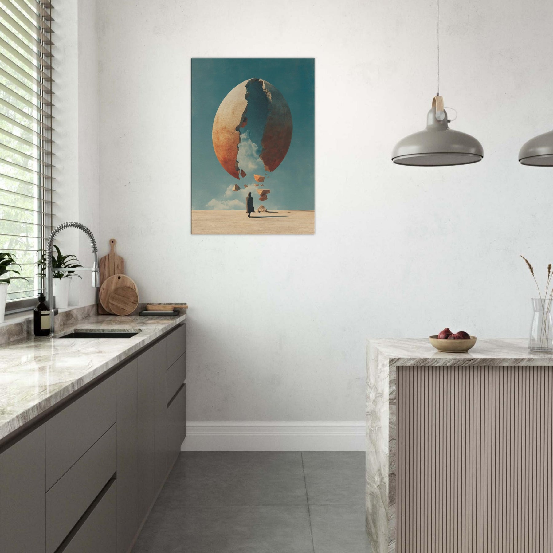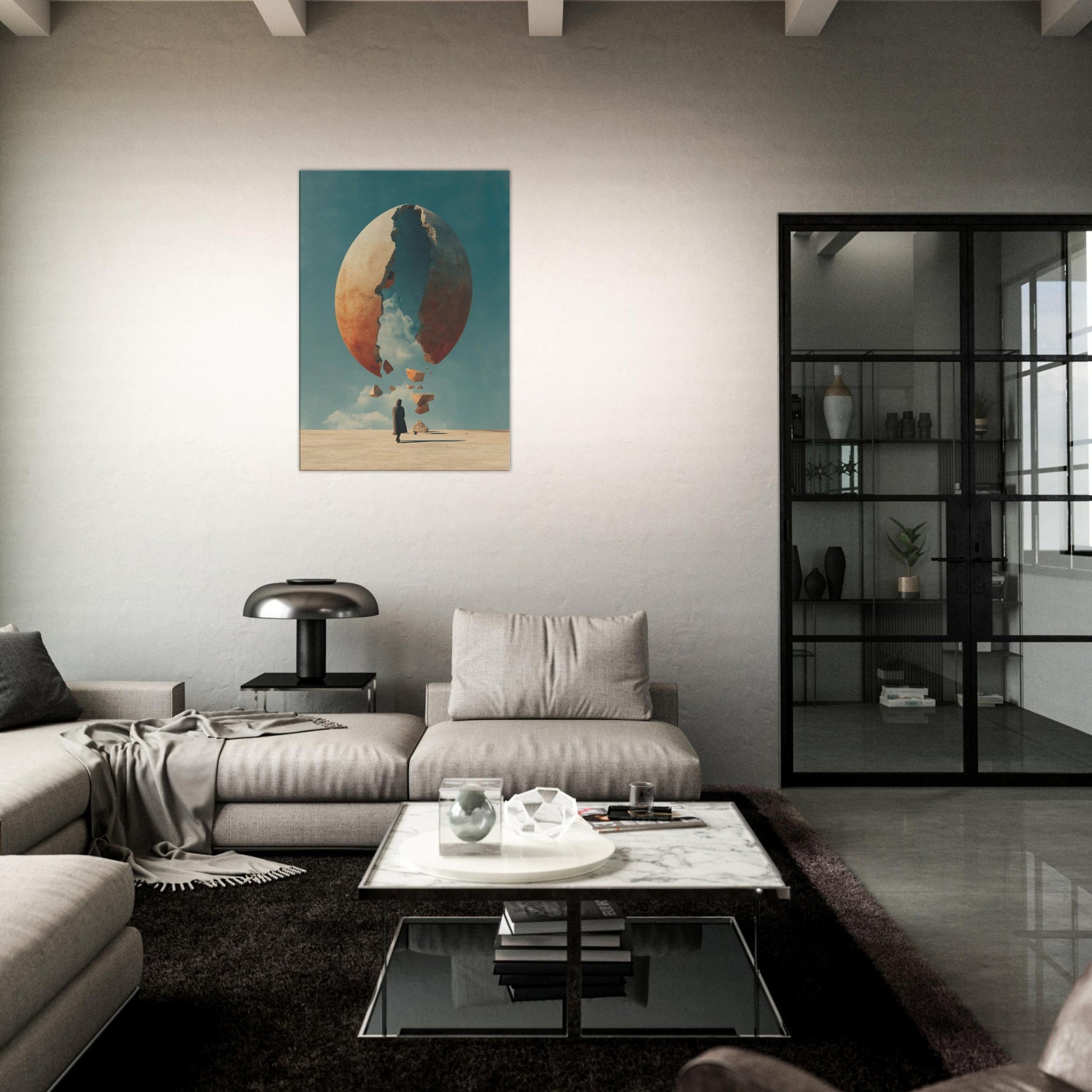 Globe Silhouette steps into a dreamscape where distance collapses and gravity loosens its grip. In this surreal composition, a colossal globe fractures, releasing a pale sky into the dust of a sunlit plain. A solitary figure in a cloak approaches the rising shards, and suspended blocks hover like questions awaiting answers. The palette teal skies, warm ochres, and soft shadows whispers of memory and possibility. Hang this piece to lend a meditative, otherworldly aura to a living space.