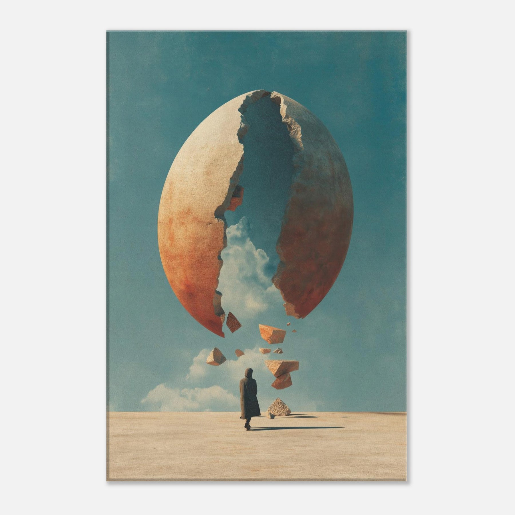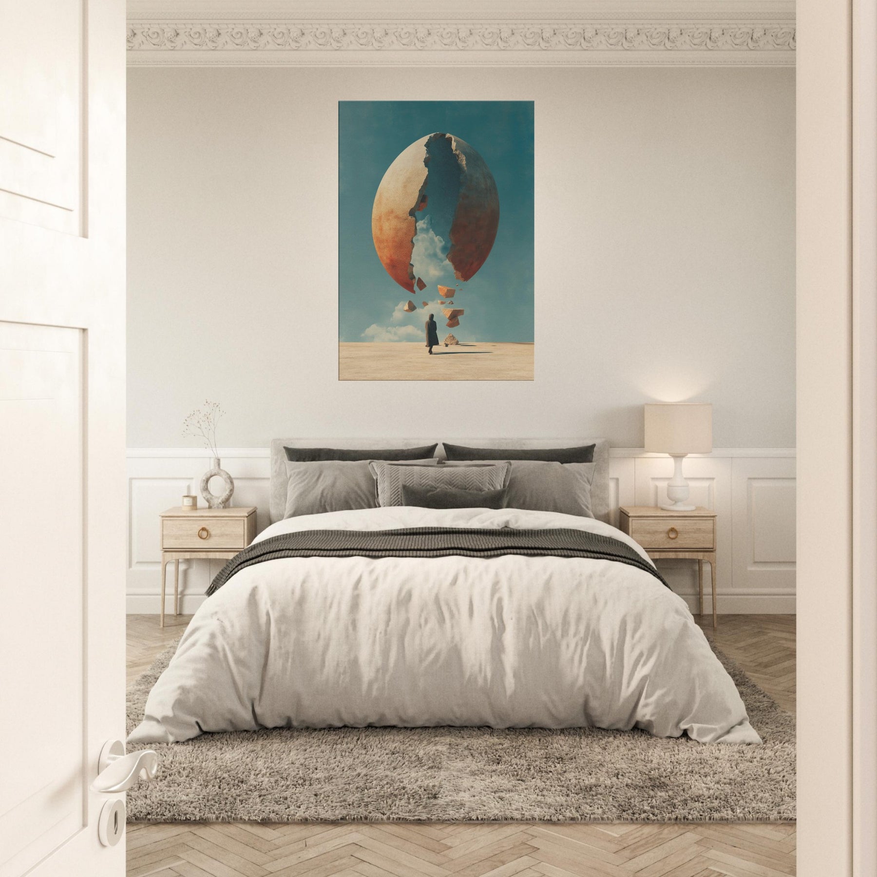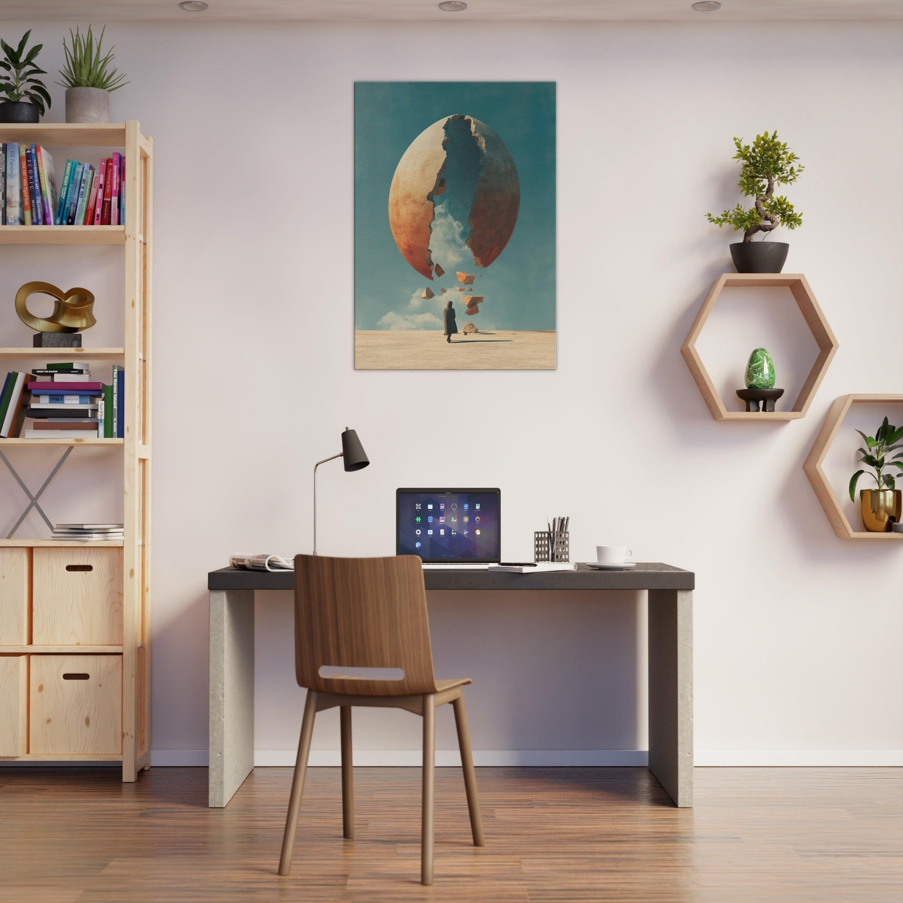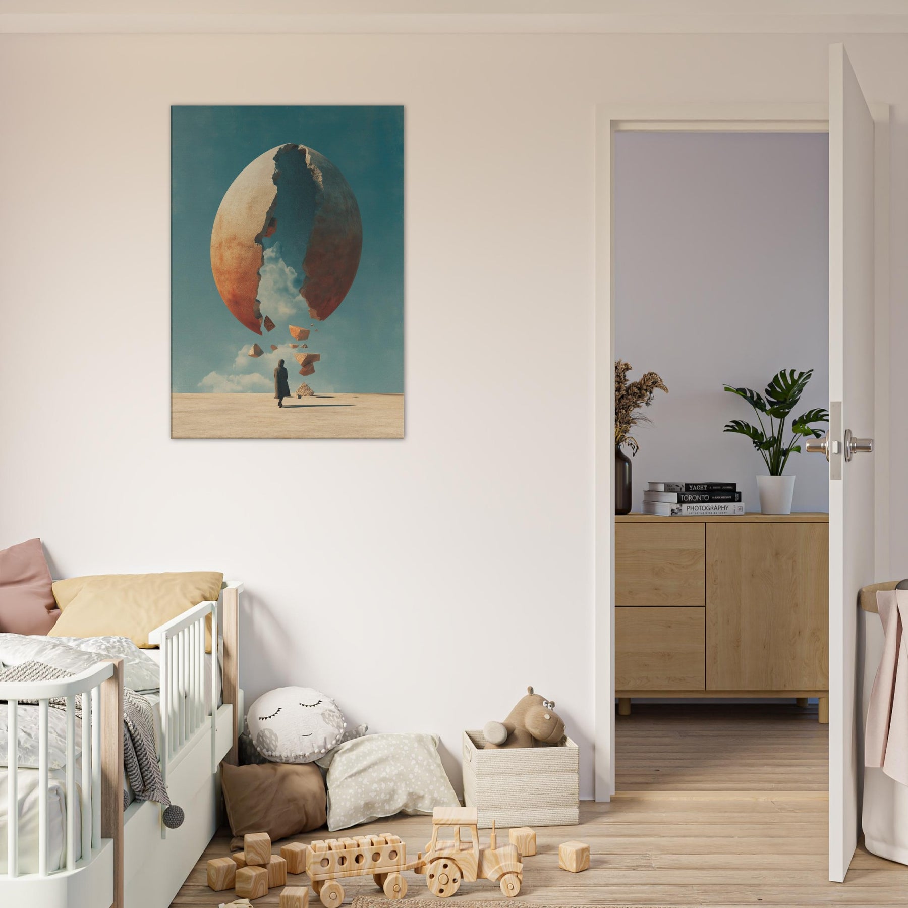Globe Silhouette steps into a dreamscape where distance collapses and gravity loosens its grip. In this surreal composition, a colossal globe fractures, releasing a pale sky into the dust of a sunlit plain. A solitary figure in a cloak approaches the rising shards, and suspended blocks hover like questions awaiting answers. The palette teal skies, warm ochres, and soft shadows whispers of memory and possibility. Hang this piece to lend a meditative, otherworldly aura to a living space.