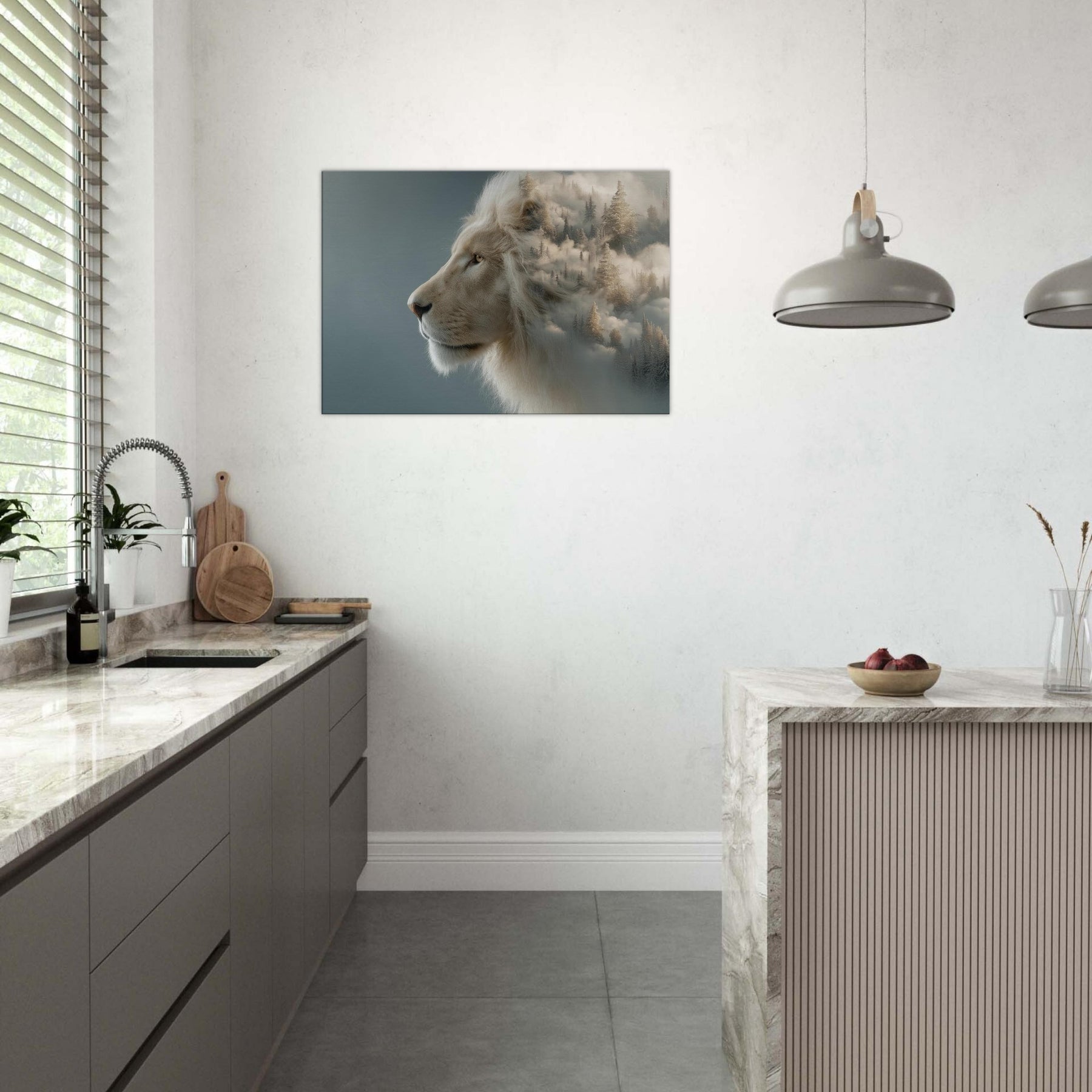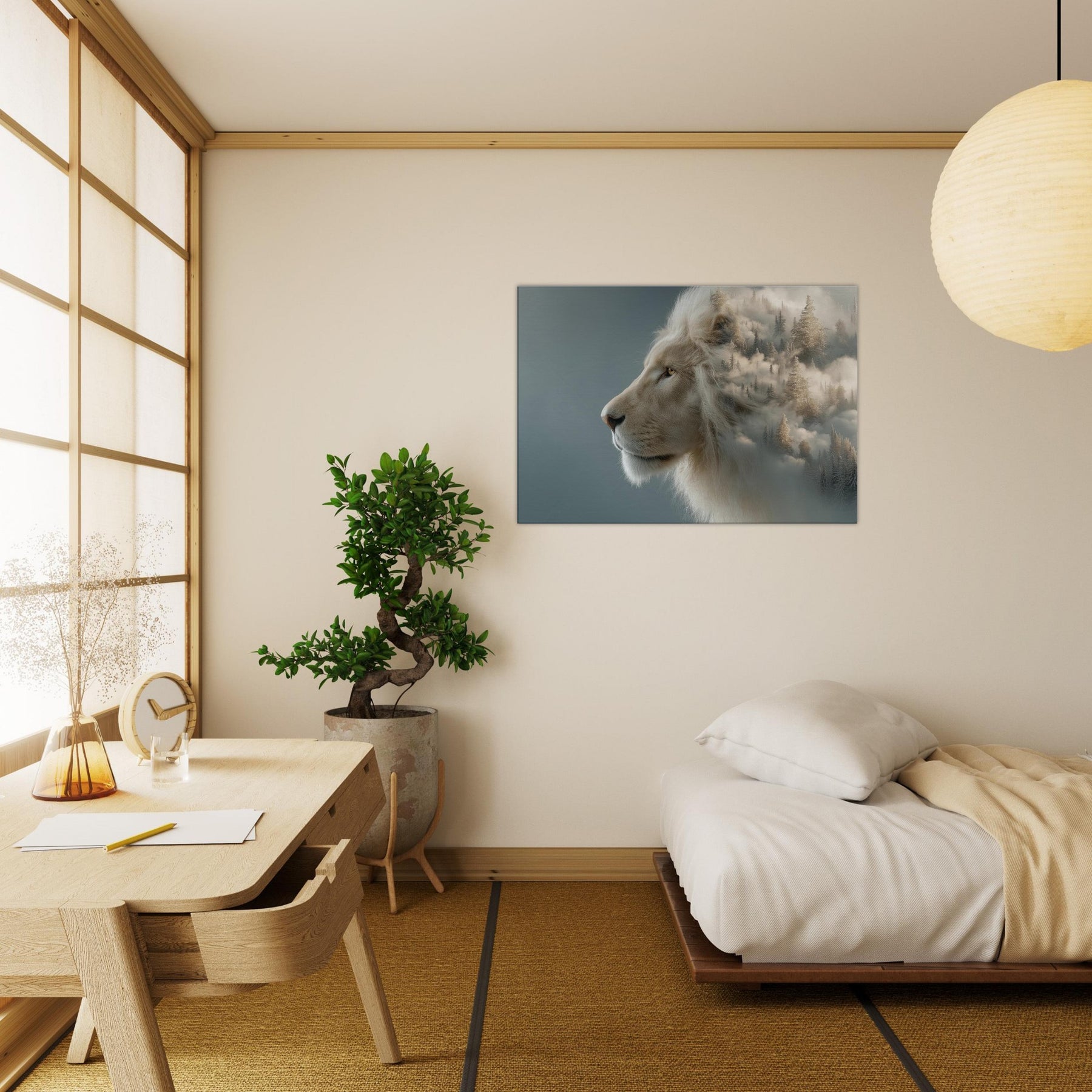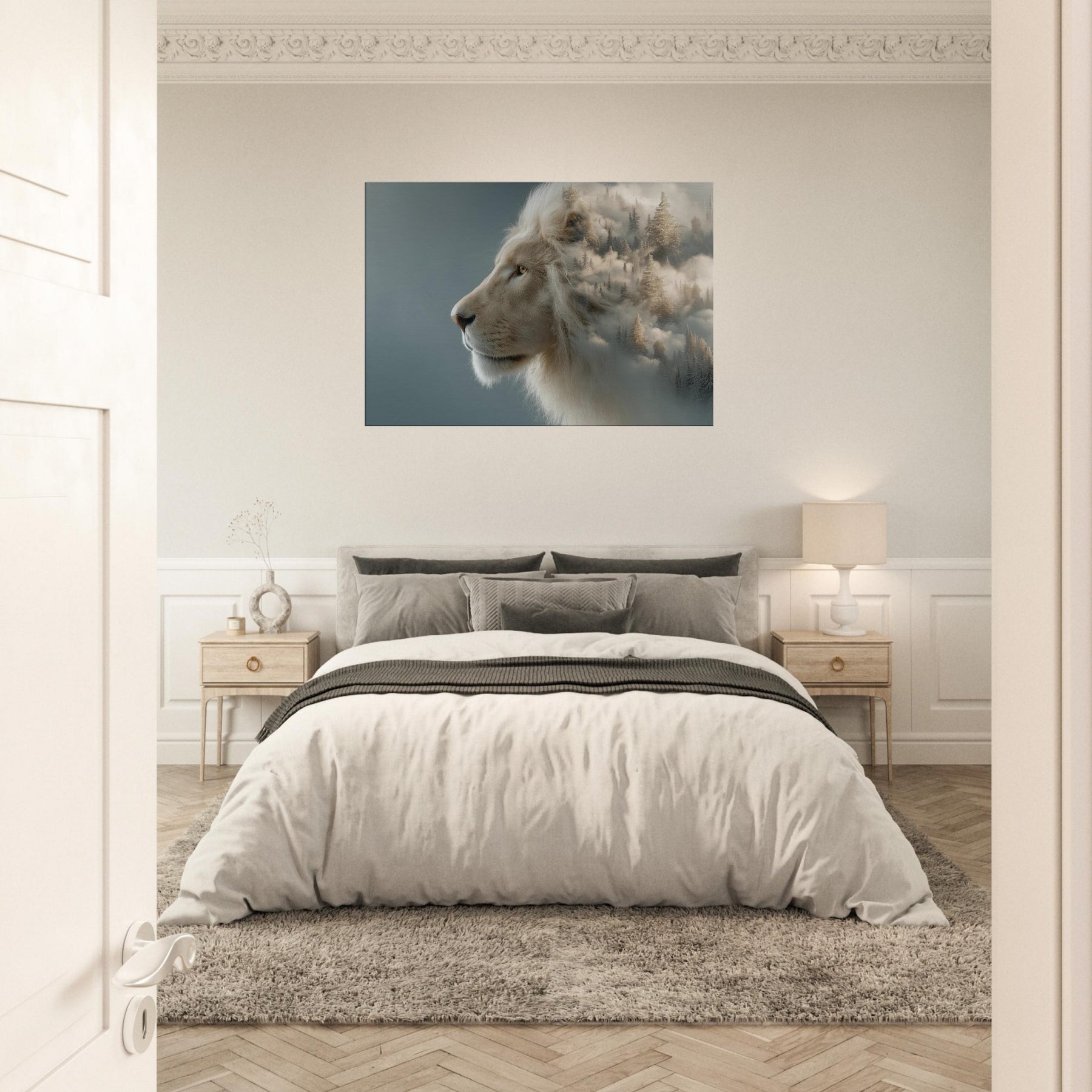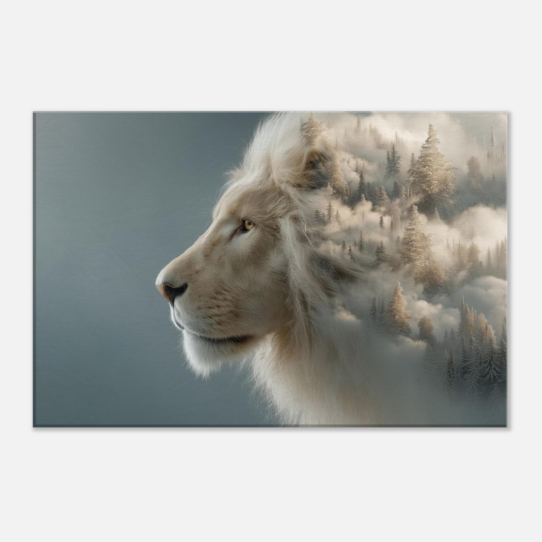 Within this surreal composition, a majestic Lion pe ers from a soft, fog kissed horizon where pine forests melt into cloud and color. The scene fuses restrained power with dreamlike movement, inviting the eye to linger and breathe. The pale mane glows against a misted , turning your wall into a doorway to calm, adventurous spaces an atmosphere that quiets the room and elevates conversations. Perfect for living rooms and bedrooms alike, this piece brings memory, myth, and fearless elegance into everyday life.