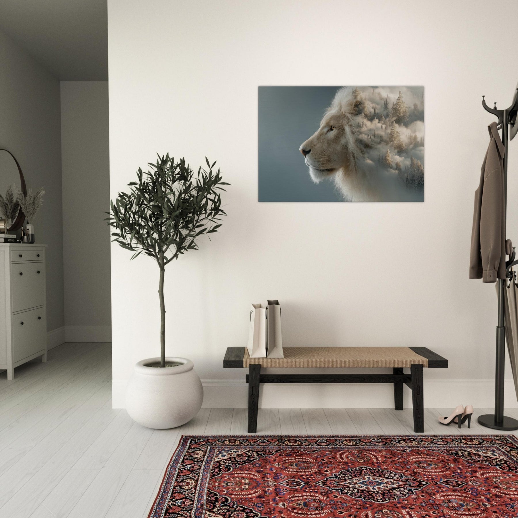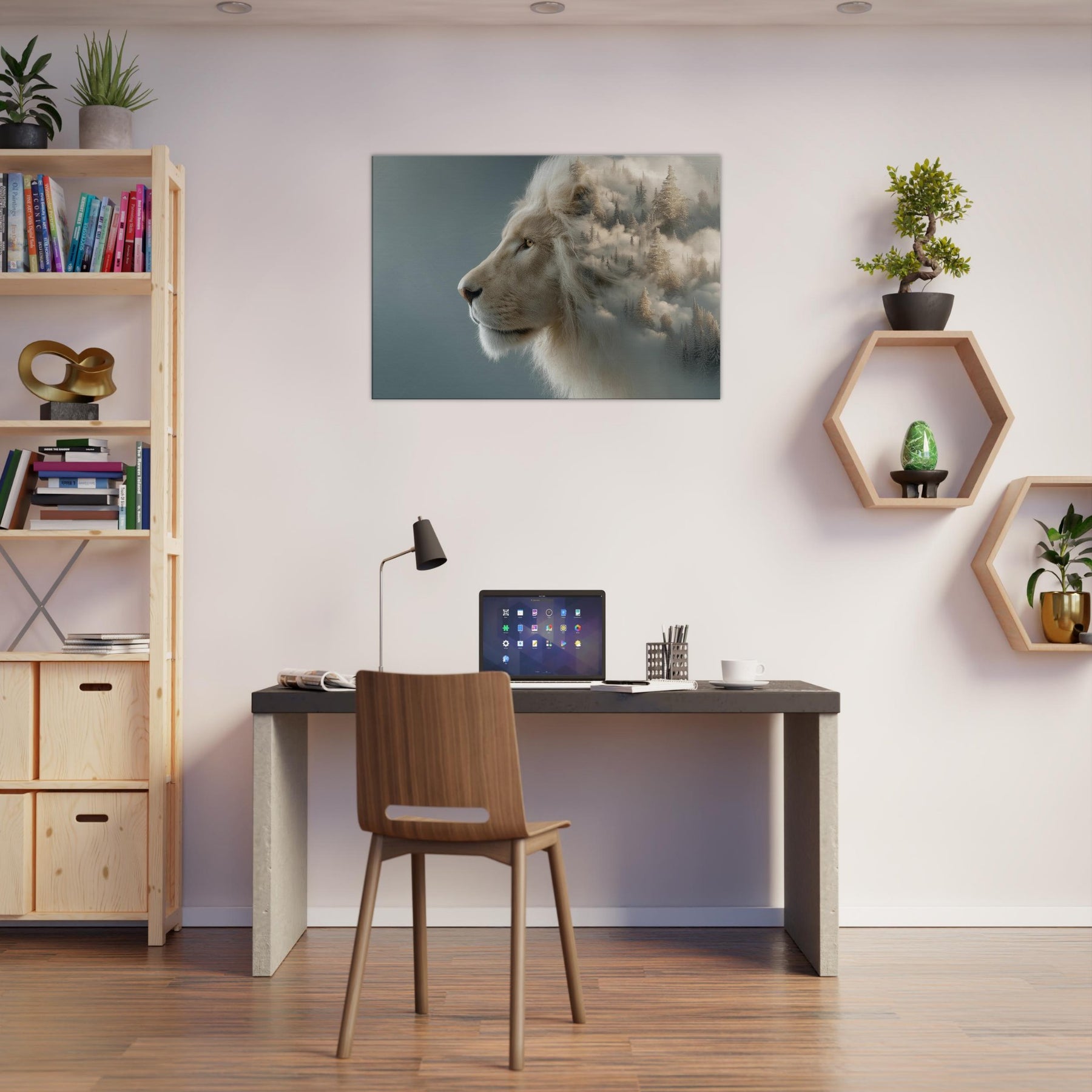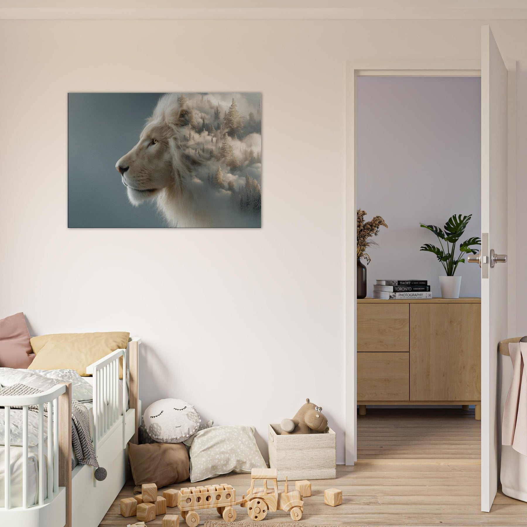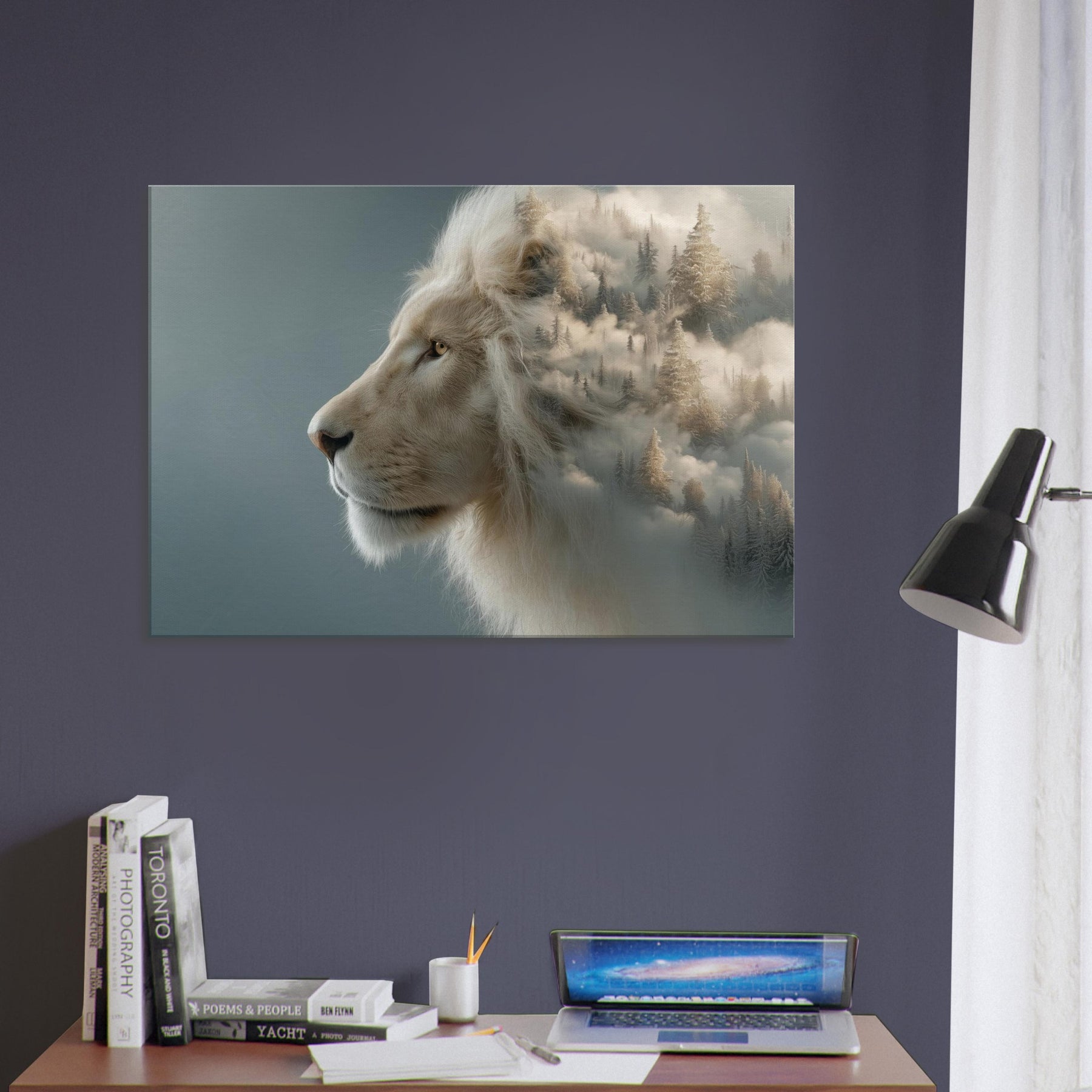 Within this surreal composition, a majestic Lion pe ers from a soft, fog kissed horizon where pine forests melt into cloud and color. The scene fuses restrained power with dreamlike movement, inviting the eye to linger and breathe. The pale mane glows against a misted , turning your wall into a doorway to calm, adventurous spaces an atmosphere that quiets the room and elevates conversations. Perfect for living rooms and bedrooms alike, this piece brings memory, myth, and fearless elegance into everyday life.