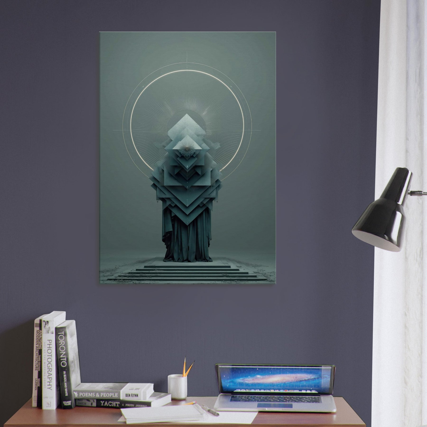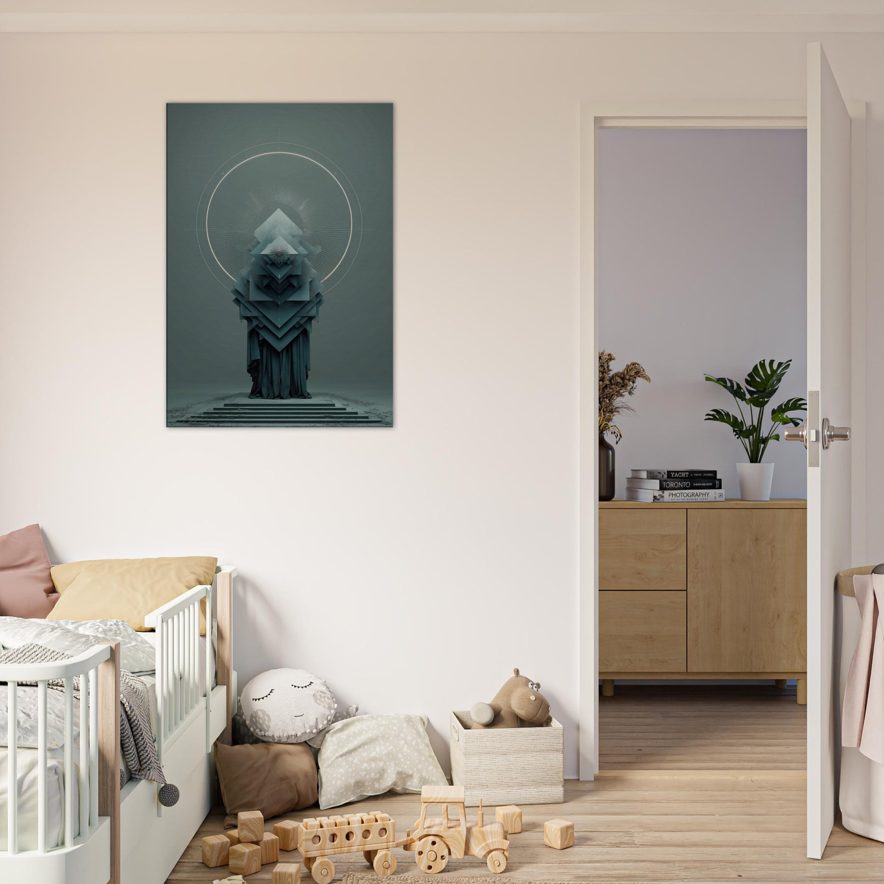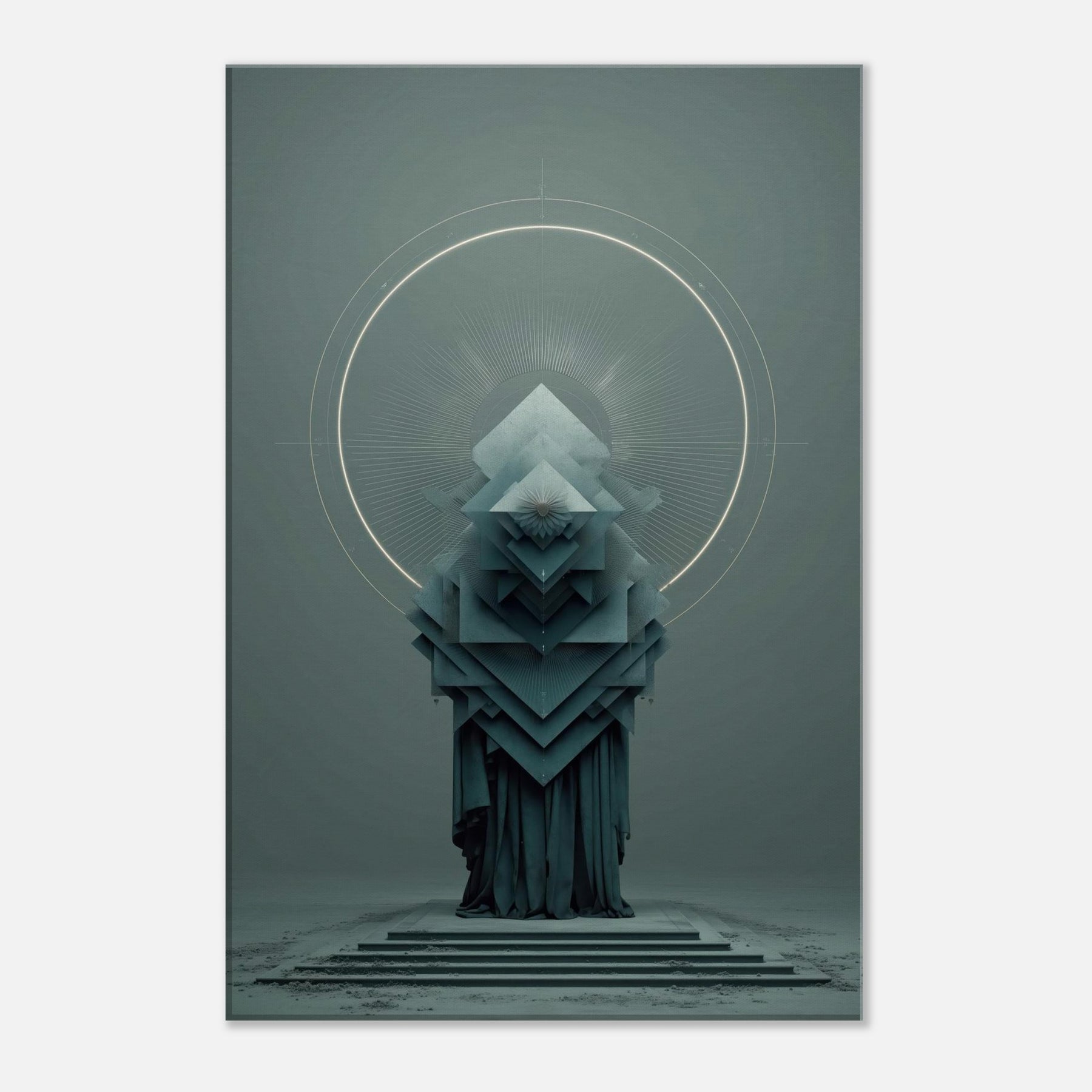 In this meditation on form, Sacred Geometry rises from a crystalline spine of stacked pyramids, haloed by a ring of light. The Surrealist composition unsettles the ordinary, inviting the eye to travel through cues of dimension and time. The cool, muted teal palette evokes midnight seas and quiet temples; you can almost hear a soft resonance as geometry breathes. Perfect for a living space seeking calm focus, mystic curiosity, and a refined, ethereal glow.