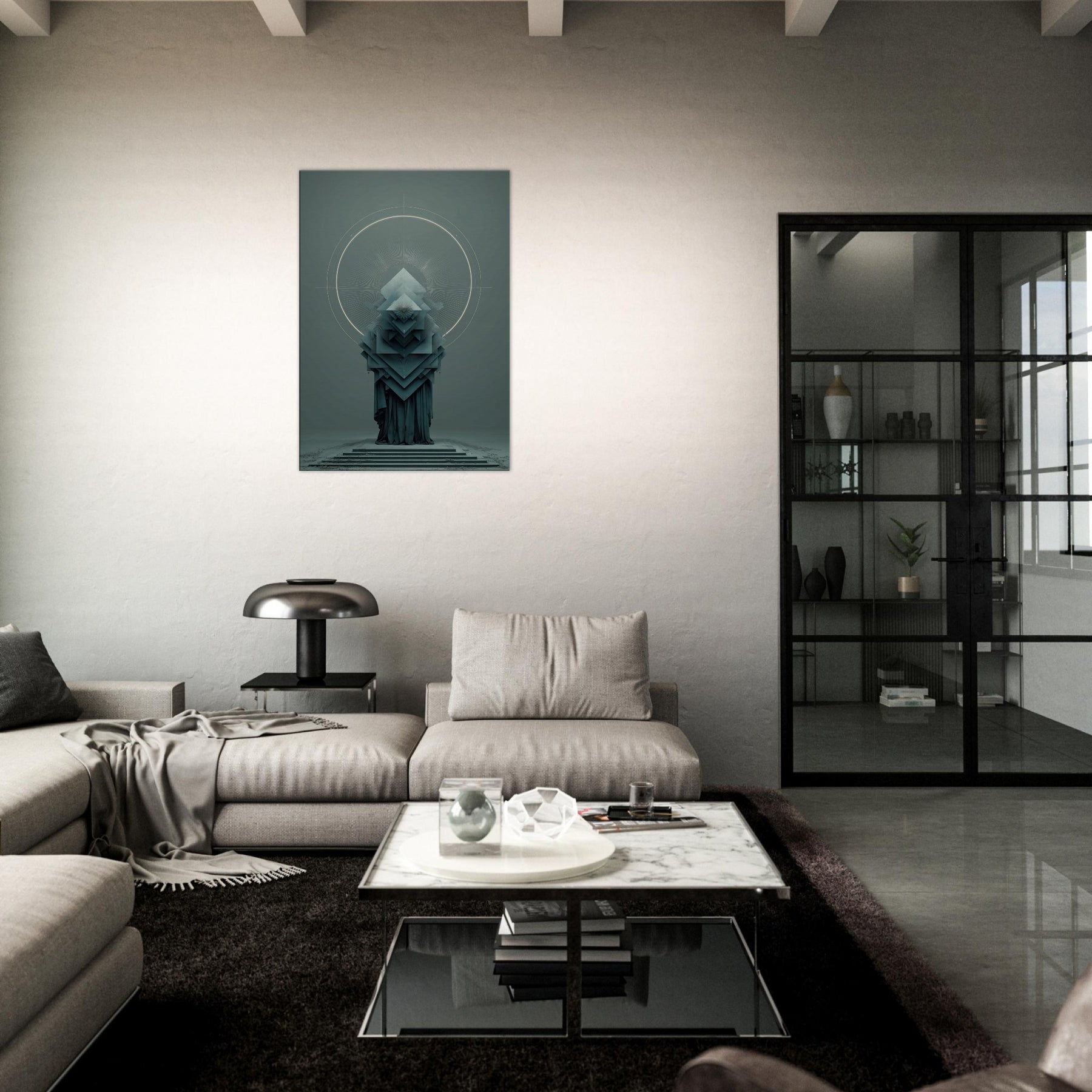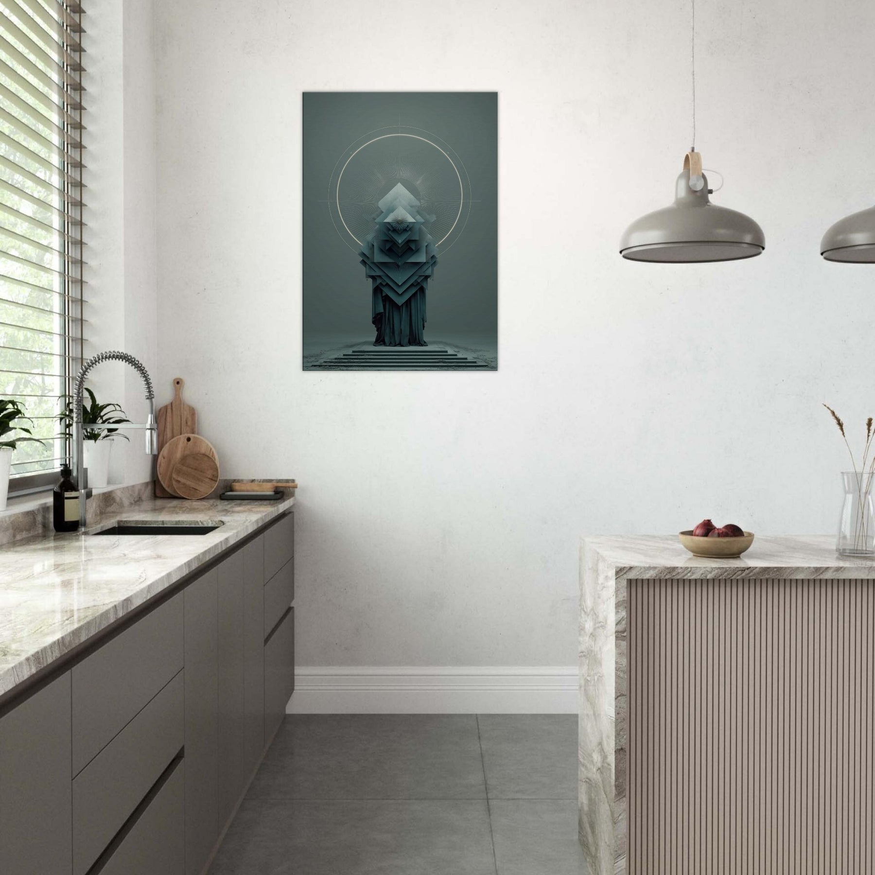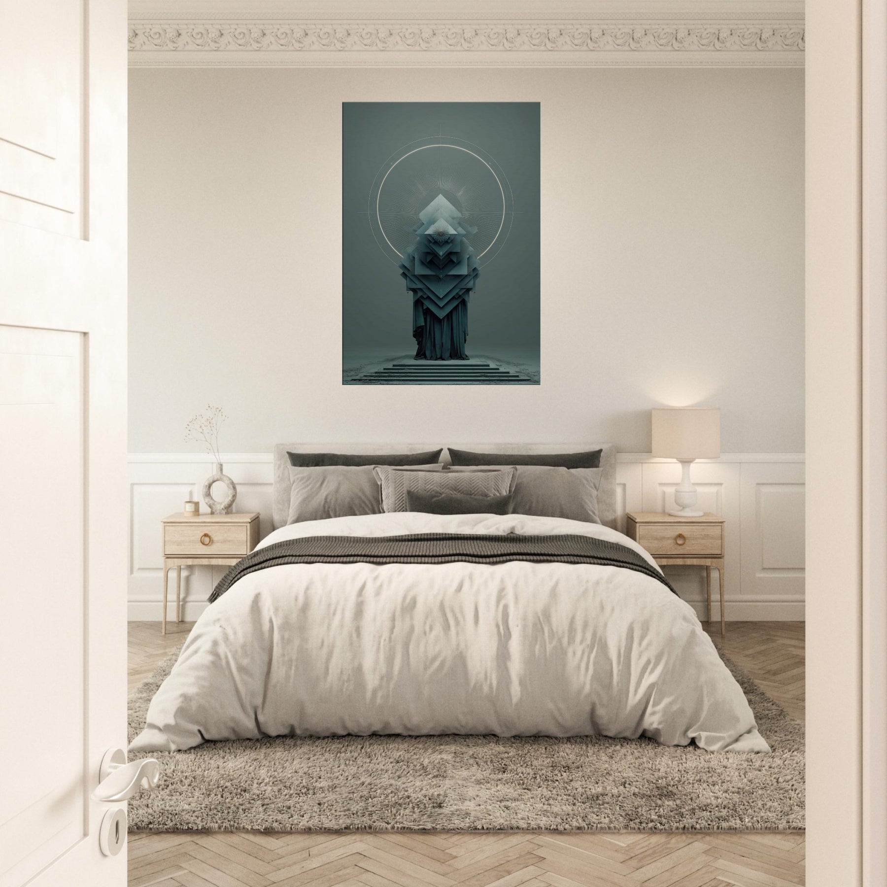 In this meditation on form, Sacred Geometry rises from a crystalline spine of stacked pyramids, haloed by a ring of light. The Surrealist composition unsettles the ordinary, inviting the eye to travel through cues of dimension and time. The cool, muted teal palette evokes midnight seas and quiet temples; you can almost hear a soft resonance as geometry breathes. Perfect for a living space seeking calm focus, mystic curiosity, and a refined, ethereal glow.
