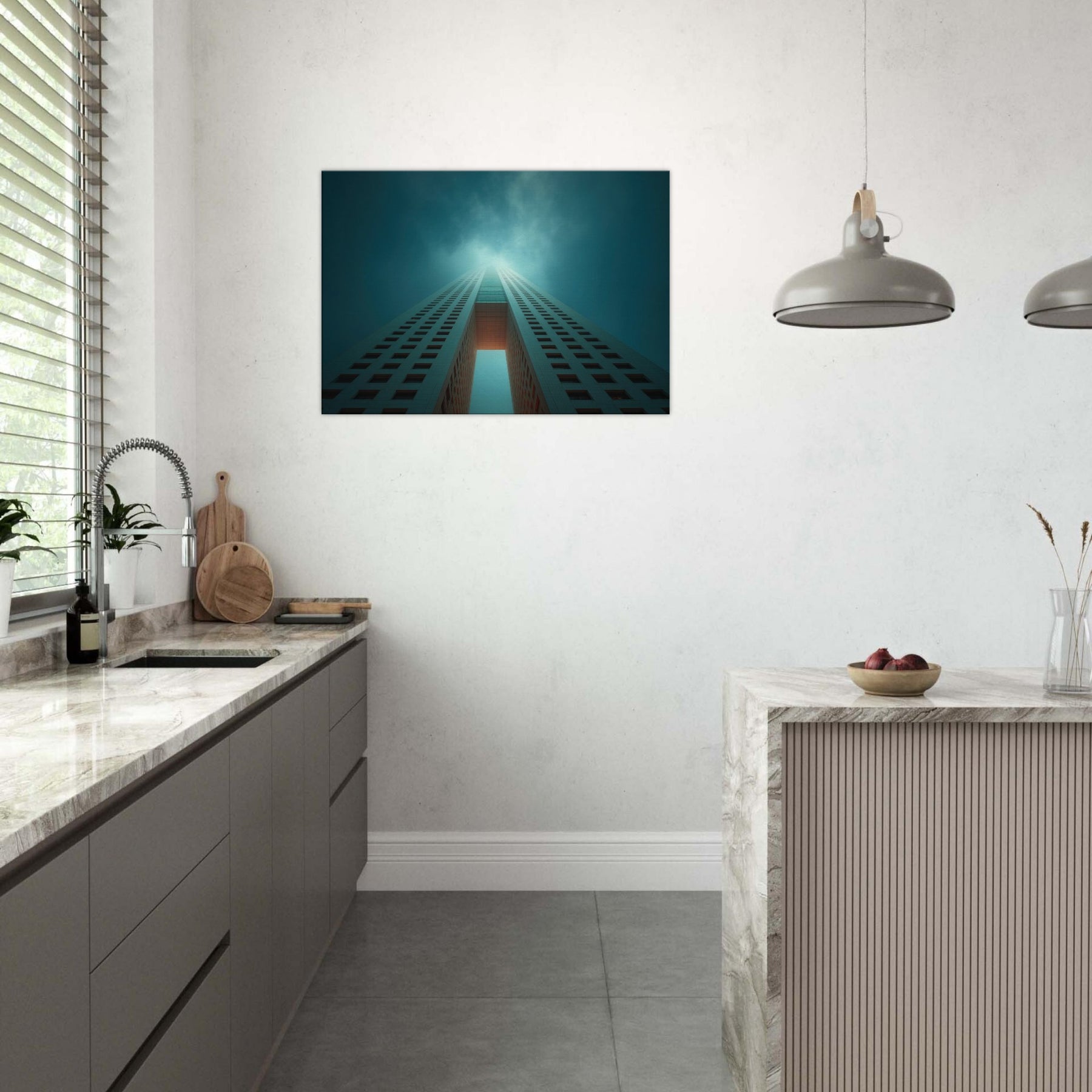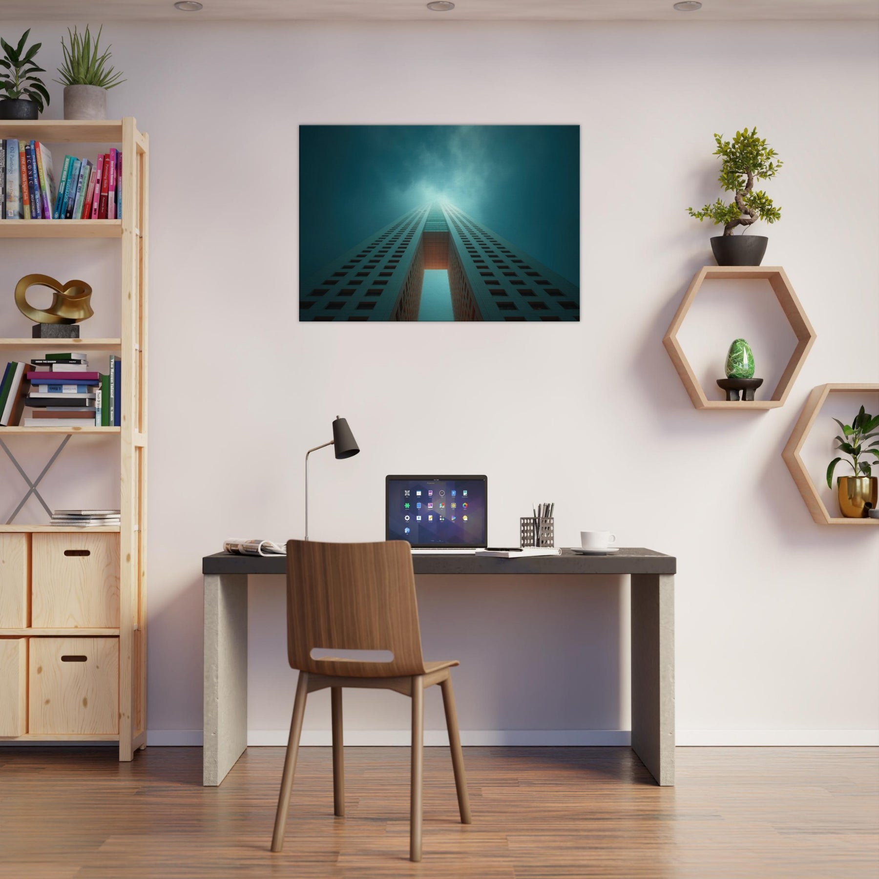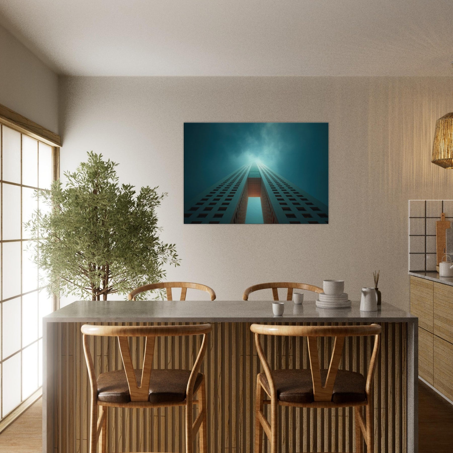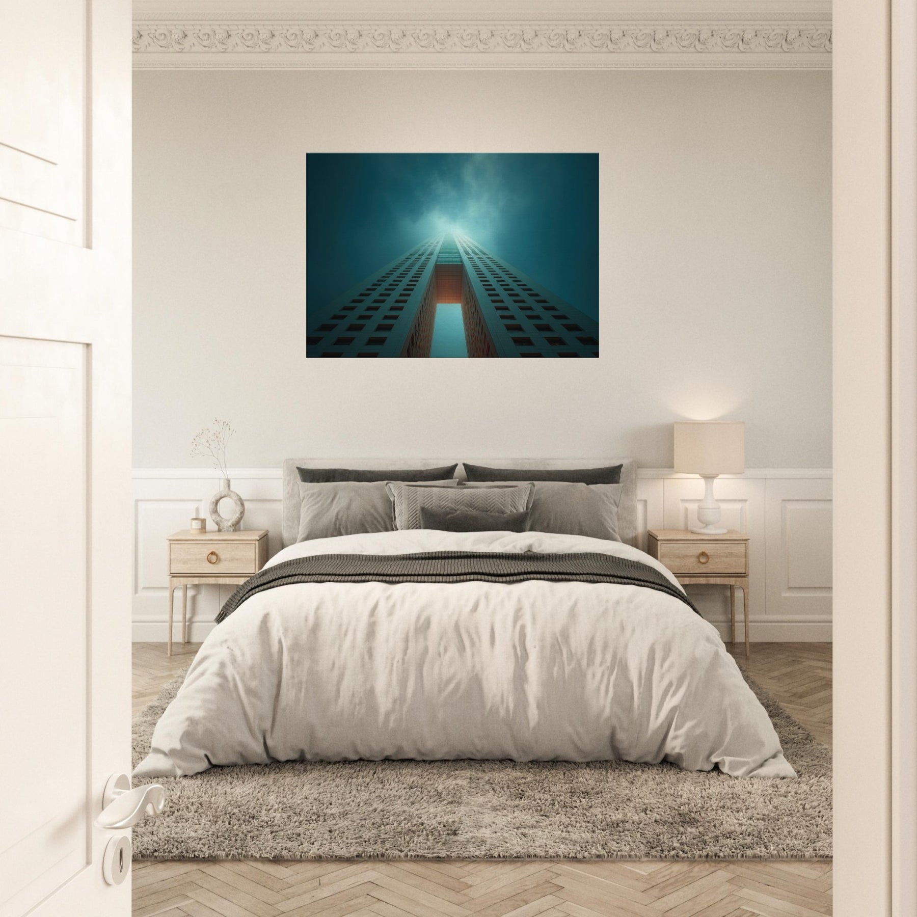 Ascending through a dreamlike corridor of steel and sky, this piece refracts Houston into a whispered reverie. The city’s towers stretch into infinity, lit by a halo of teal and pale ember that hums with quiet energy. You can almost hear the distant city pulse as you stand before it, a breath of cool air and warm light washing over the room. Hang it in a living area or entry, and the space becomes a horizon you can walk into.