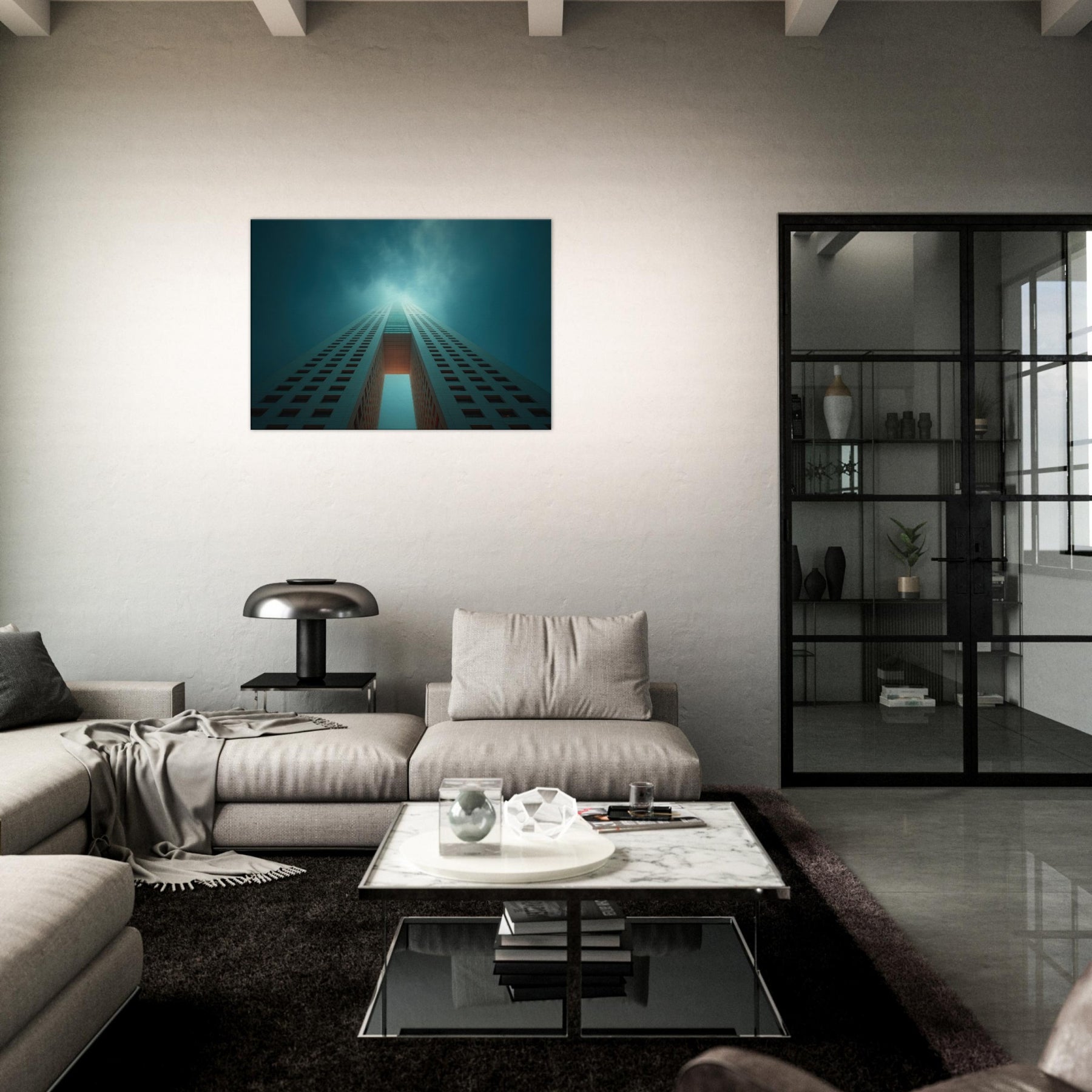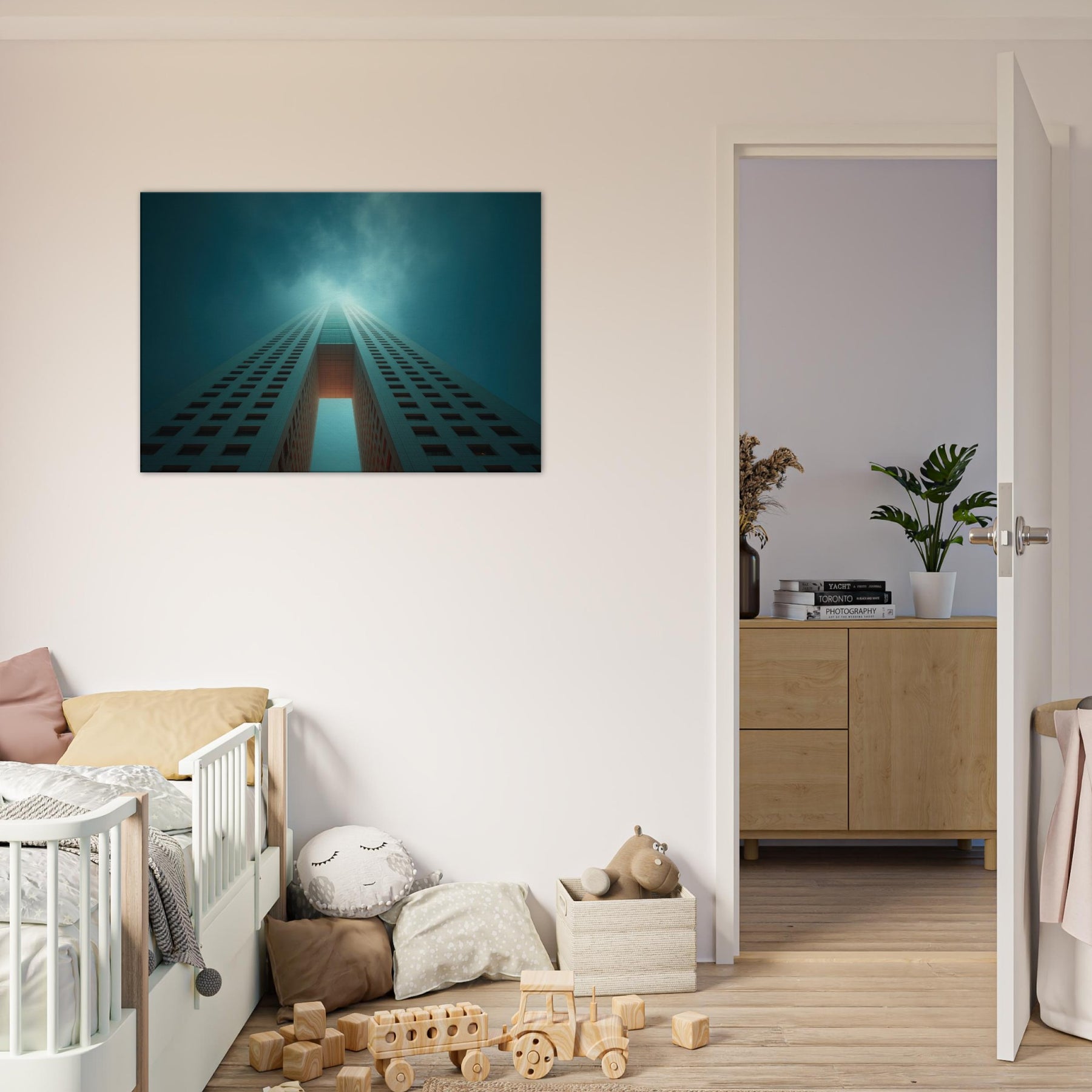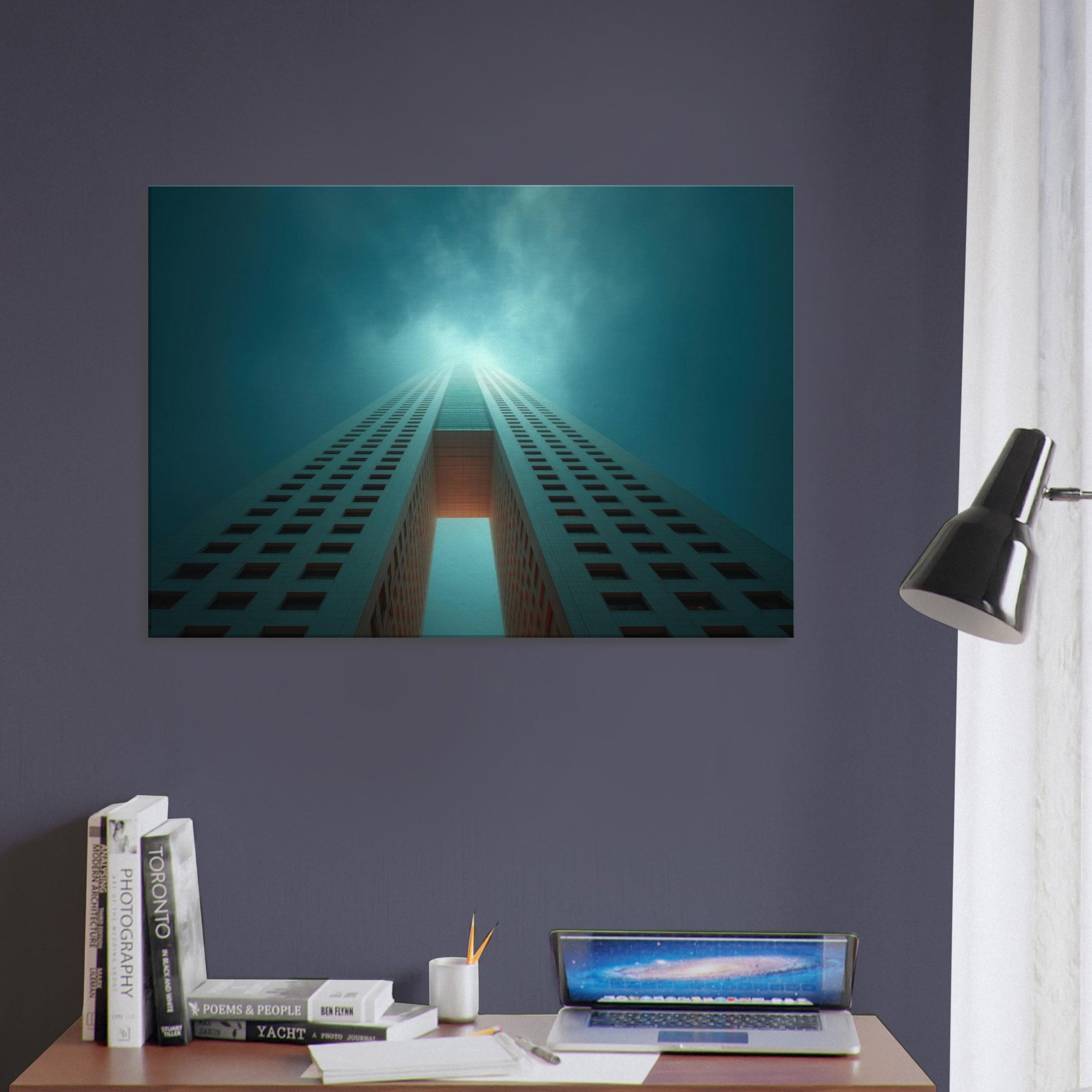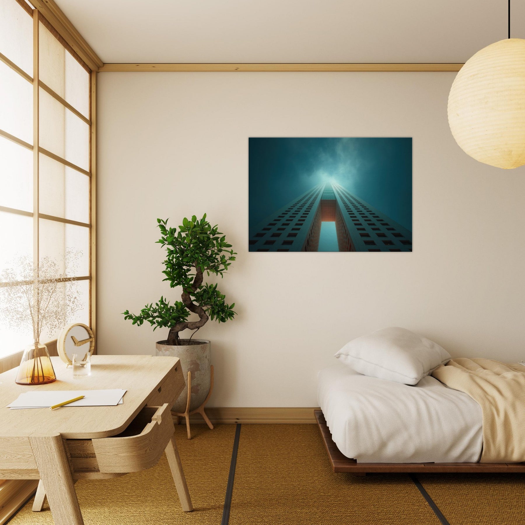 Ascending through a dreamlike corridor of steel and sky, this piece refracts Houston into a whispered reverie. The city’s towers stretch into infinity, lit by a halo of teal and pale ember that hums with quiet energy. You can almost hear the distant city pulse as you stand before it, a breath of cool air and warm light washing over the room. Hang it in a living area or entry, and the space becomes a horizon you can walk into.