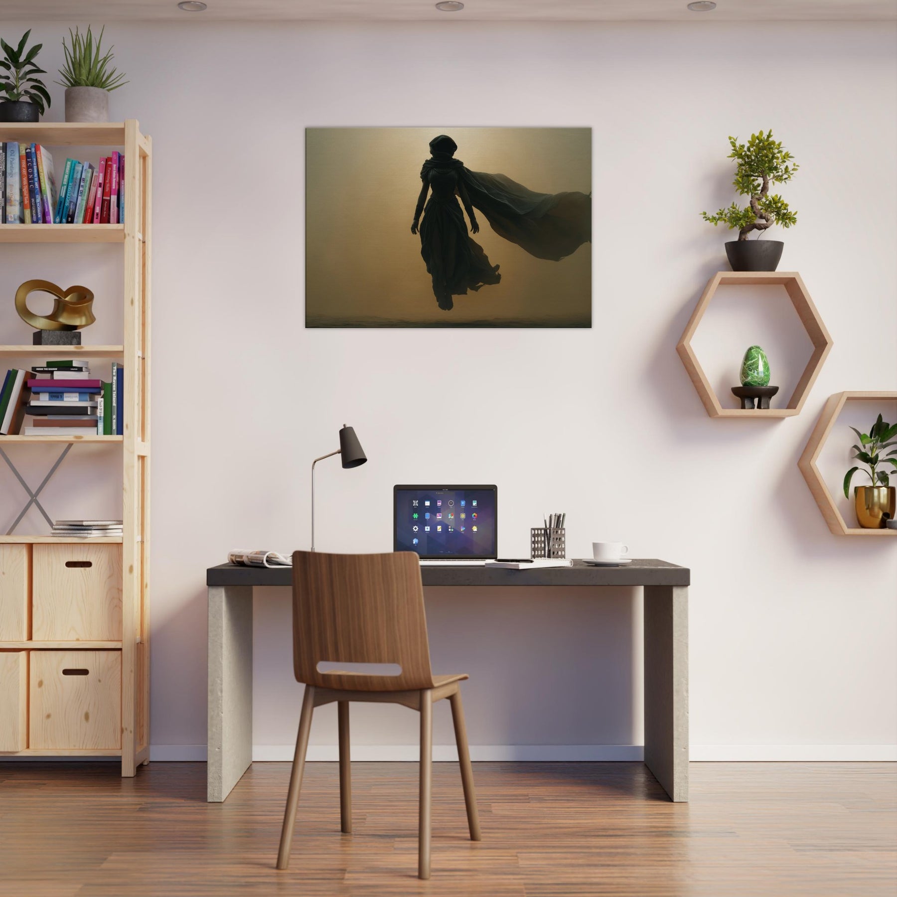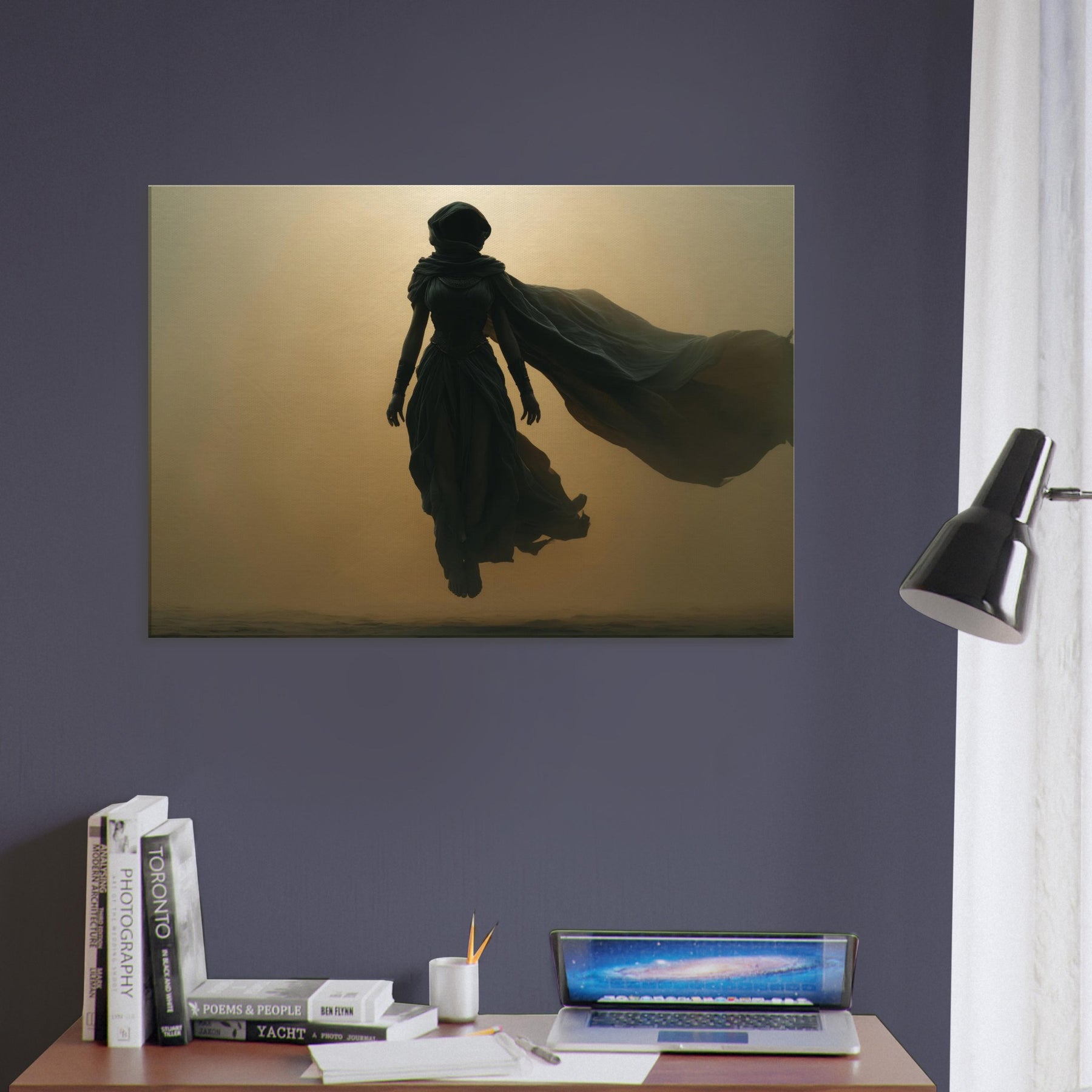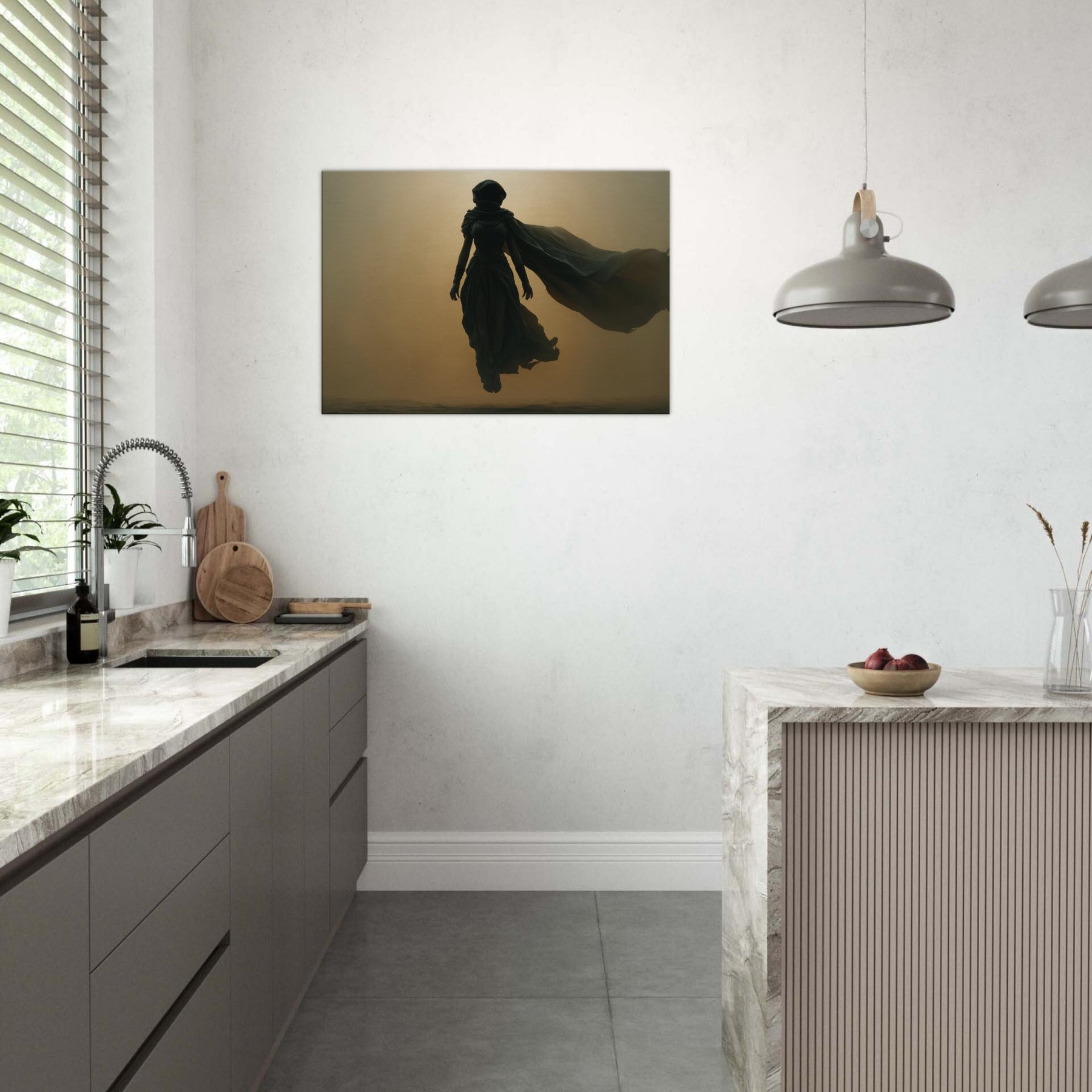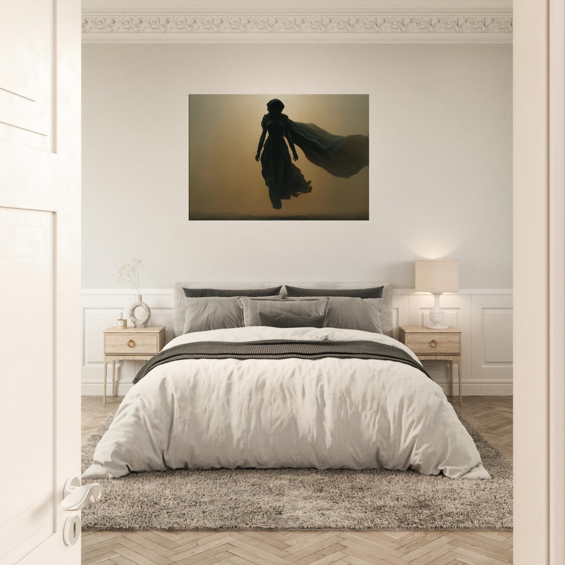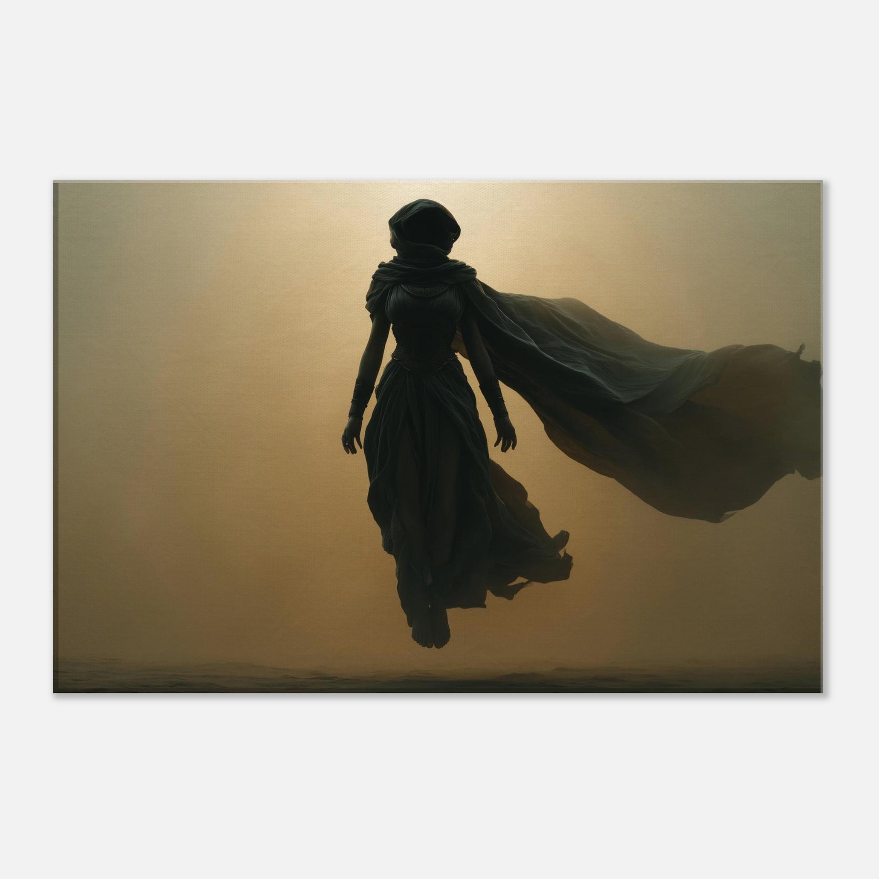 Isis, the Egyptian Goddess of Magic and Motherhood, steps from myth into your living space in a glow and shadow. This Surrealist composition halos her with a warm, amber haze, her robes billowing like a dream, uniting protection with wonder. Hang this centerpiece where morning light can play across layered textures, and let the room breathe with ancient quiet and modern poetry. A transformative image that invites reflection, conversation, and a sense of timeless guardianship.