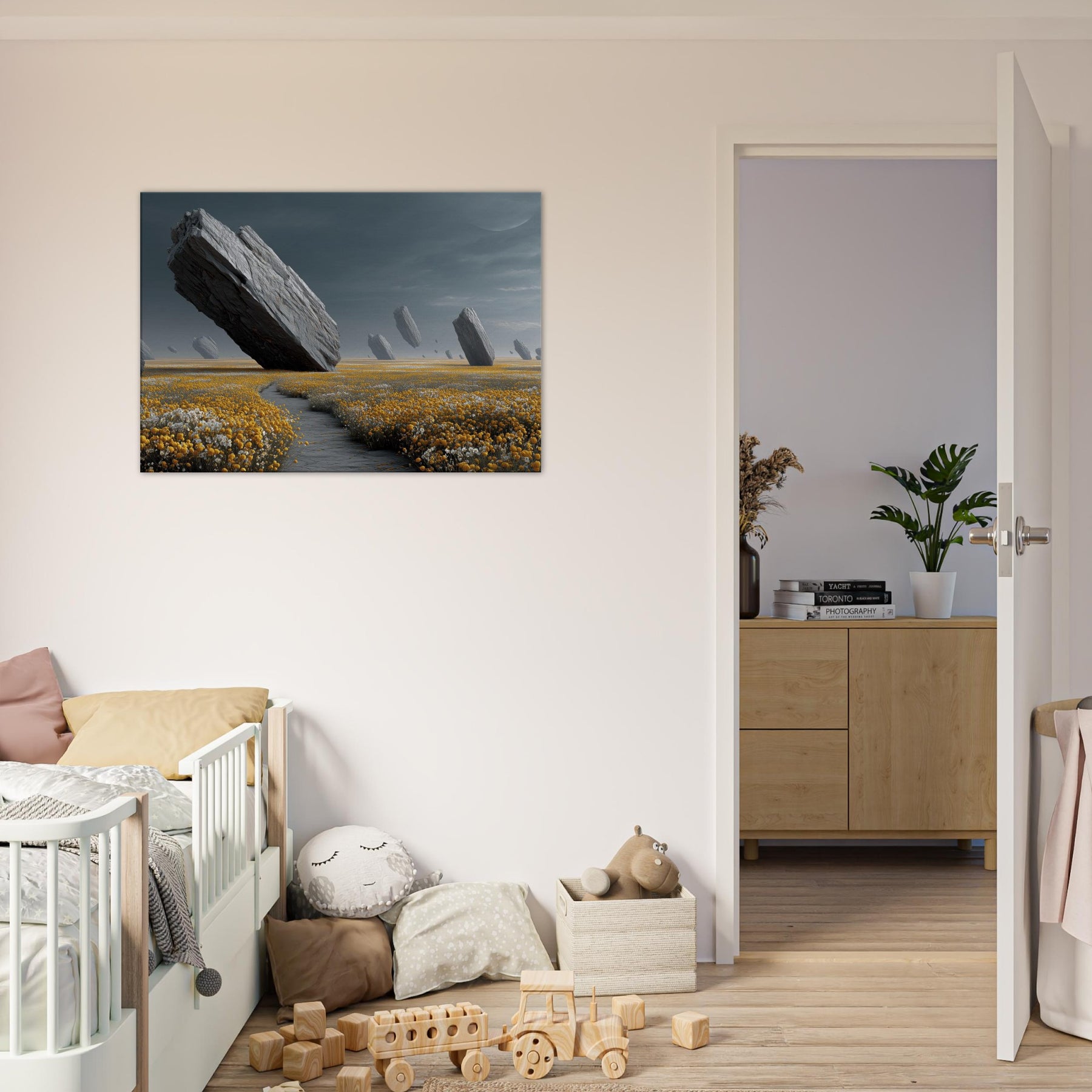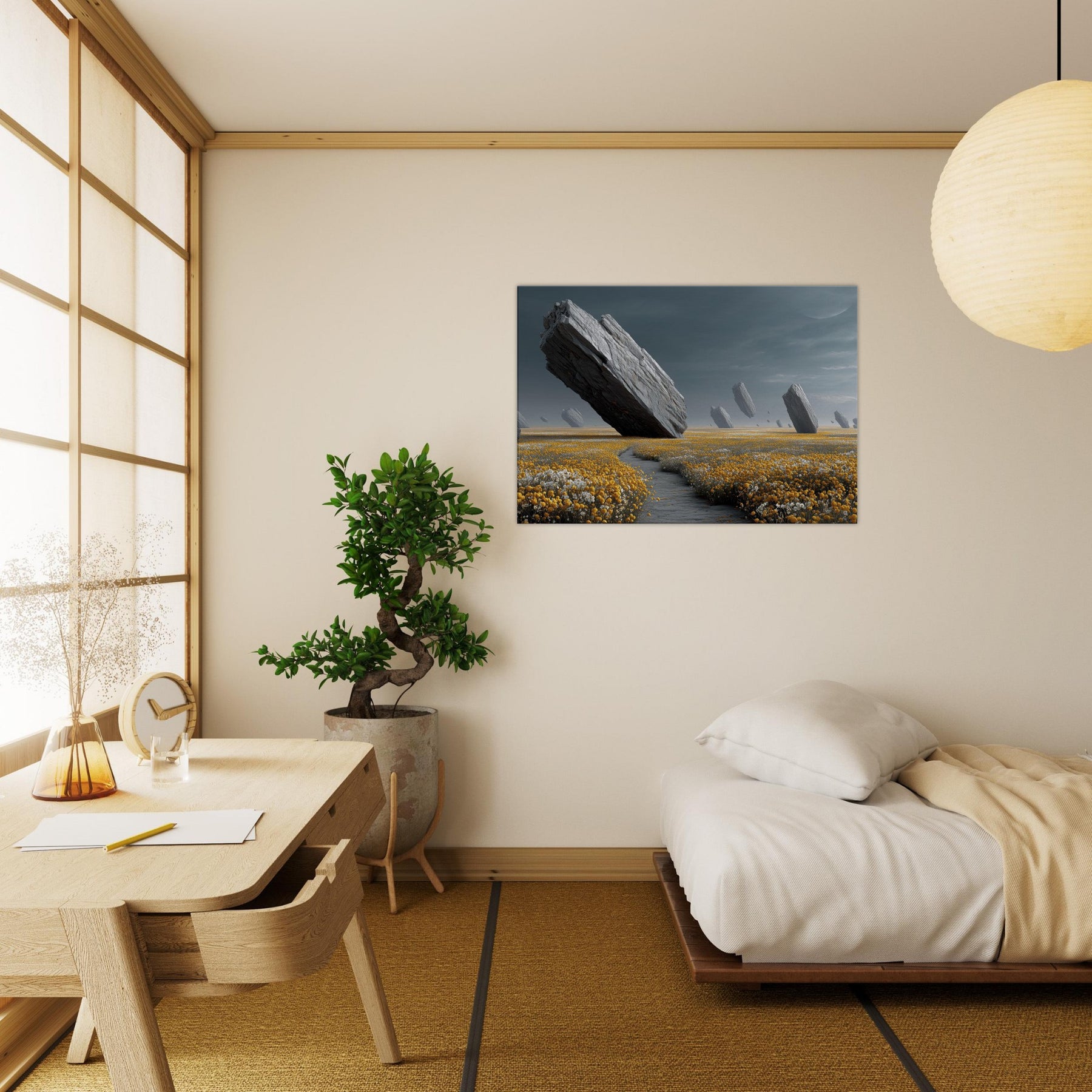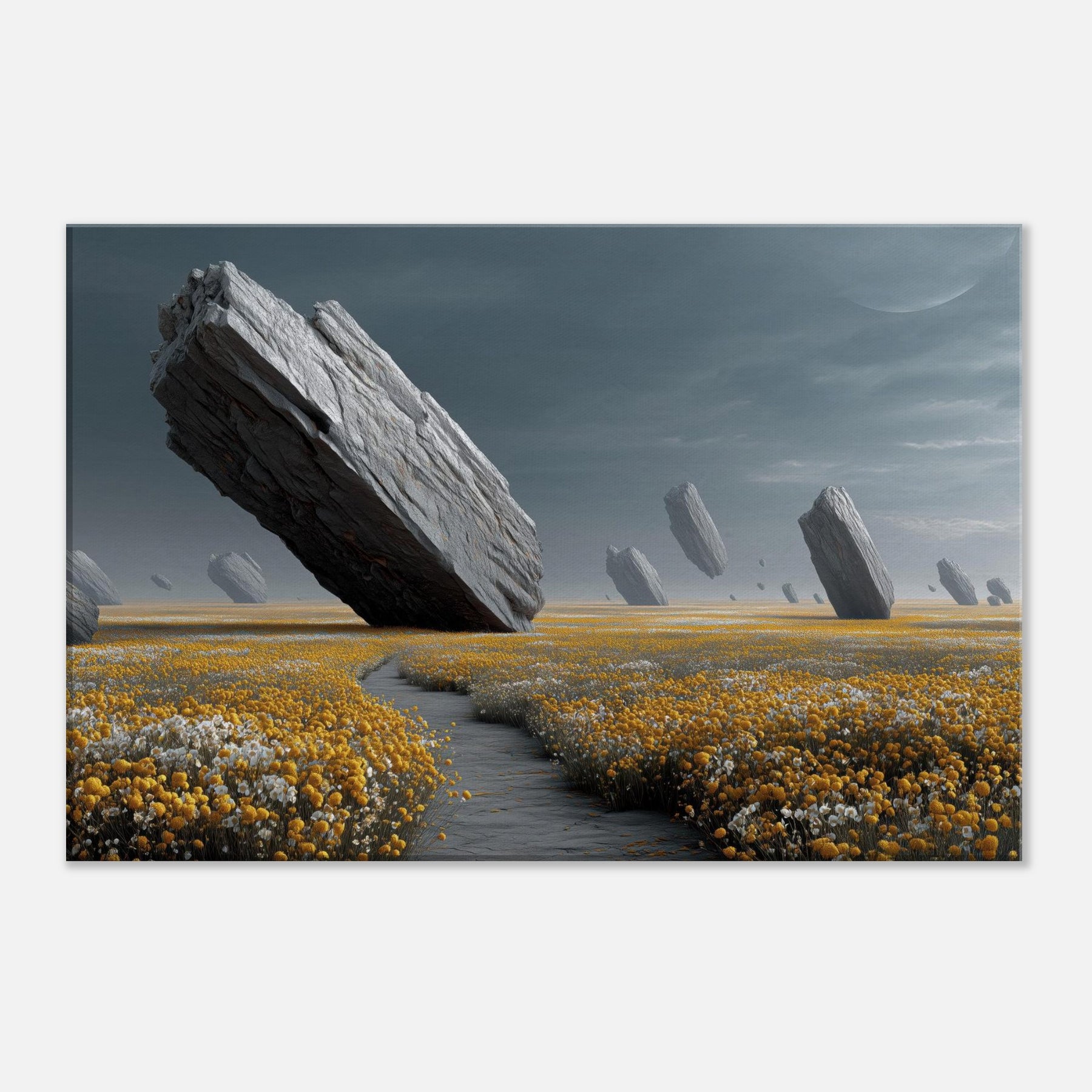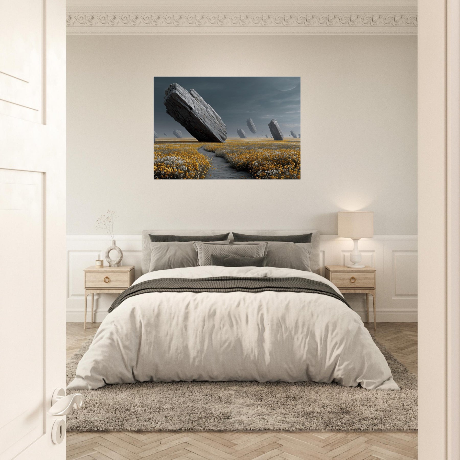 Flower Field drifts into a dream where colossal rocks tilt and hover above a carpet of gold and alabaster blooms. The subdued, pewter tinged light wraps a room in hush and wonder, inviting slow, contemplative breaths. Surreal and serene, this turns a wall into a portal to another field, rich with texture, gravity, and scent. Ideal for living rooms or bedrooms, it anchors modern interiors with natural drama and a quiet sense of possibility.