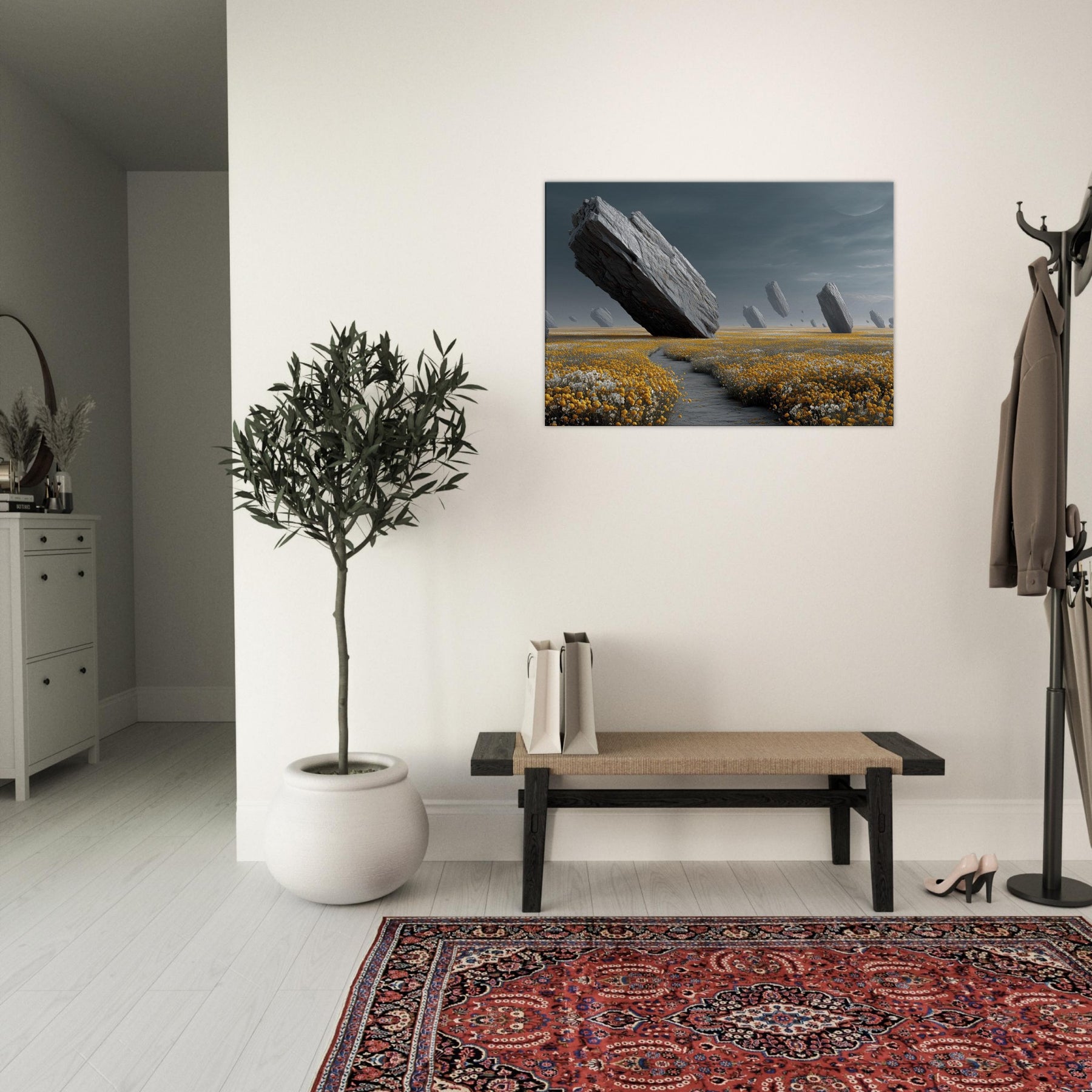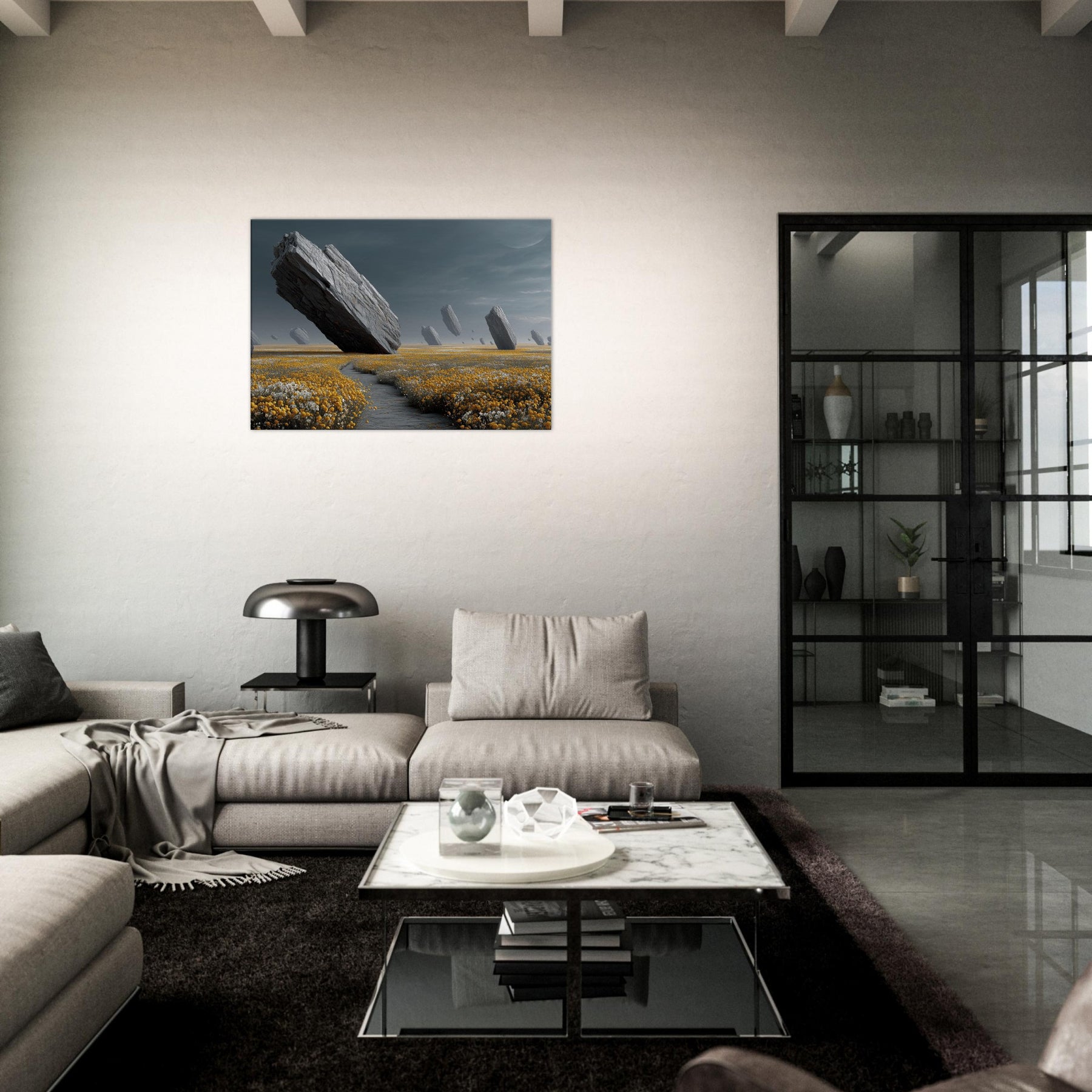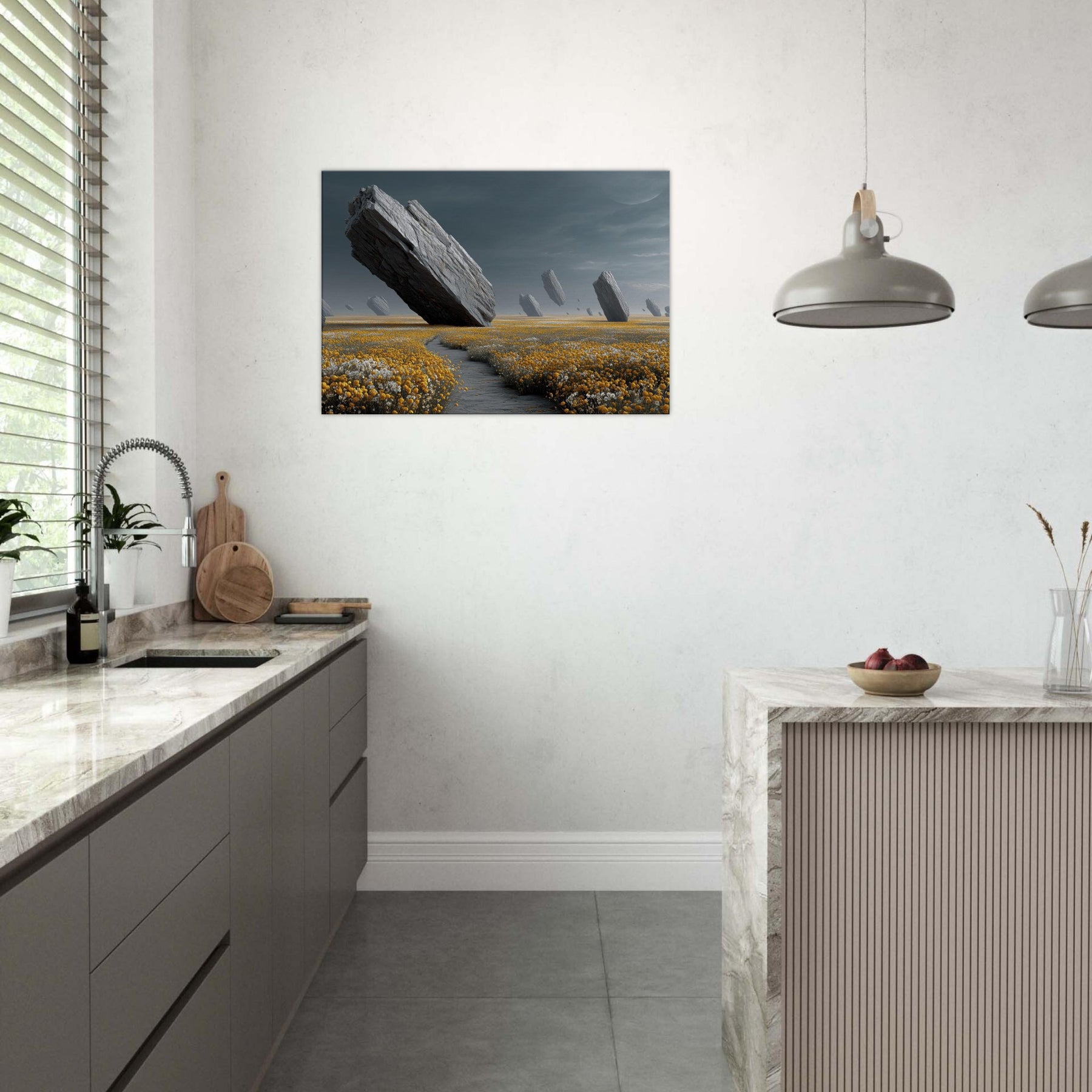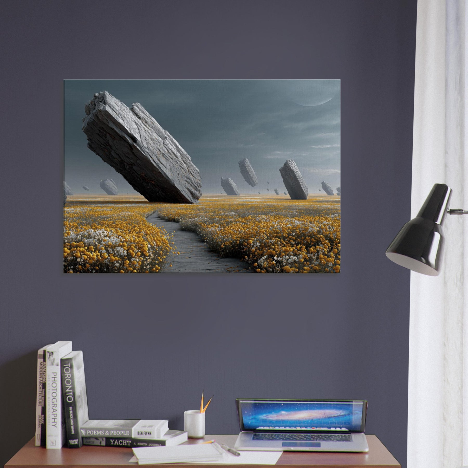 Flower Field drifts into a dream where colossal rocks tilt and hover above a carpet of gold and alabaster blooms. The subdued, pewter tinged light wraps a room in hush and wonder, inviting slow, contemplative breaths. Surreal and serene, this turns a wall into a portal to another field, rich with texture, gravity, and scent. Ideal for living rooms or bedrooms, it anchors modern interiors with natural drama and a quiet sense of possibility.