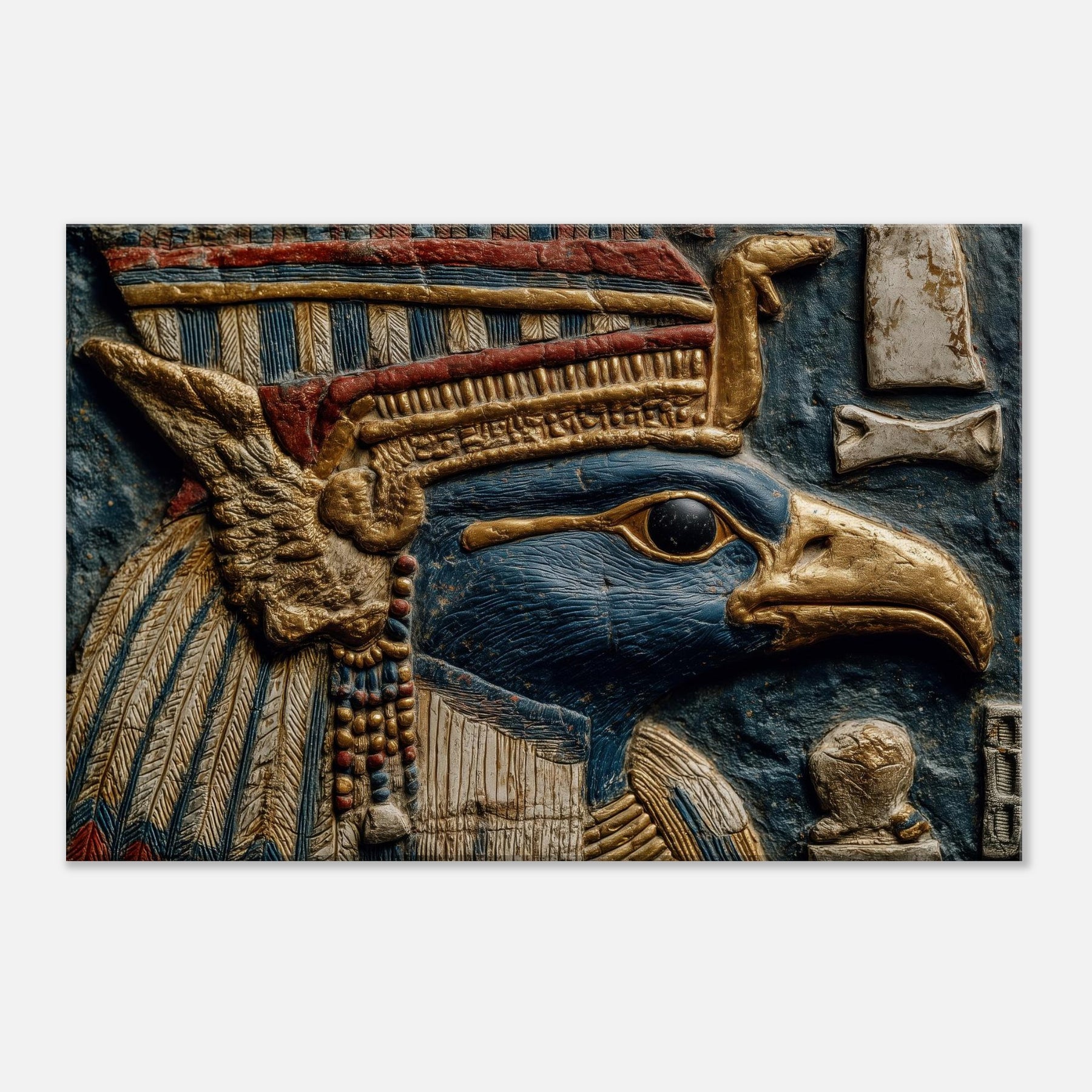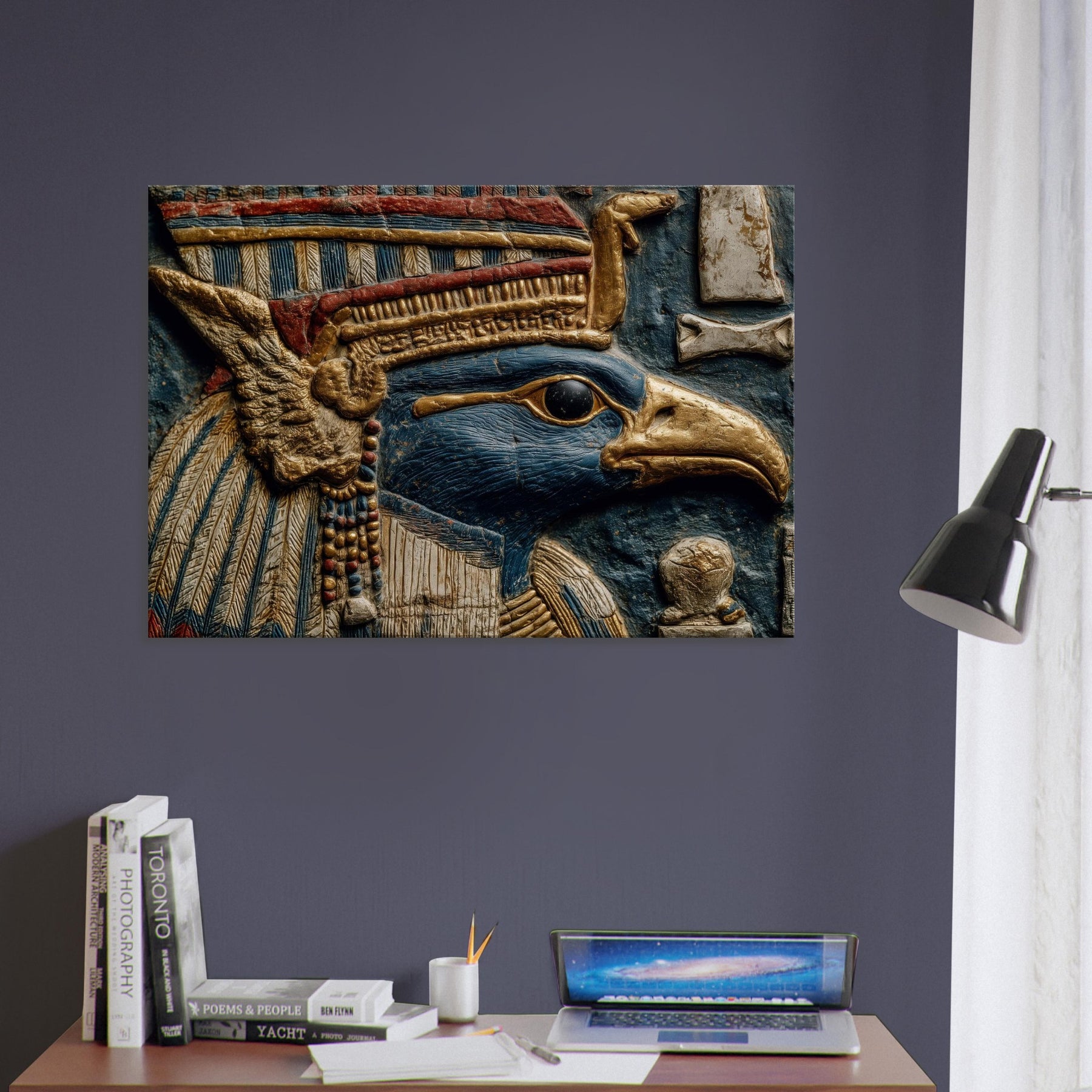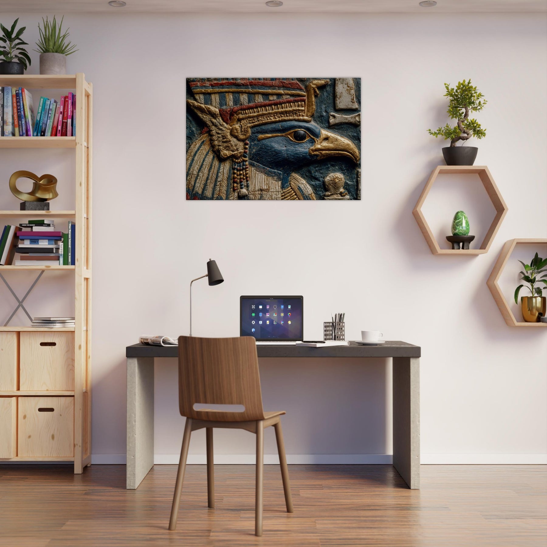 Centered on Ra, the Egyptian Sun God with A Falcon Head and Solar Crown, this painting unfurls like a dream in blue and gold. Surreal forms swirl around his keen gaze, turning ancient power into a living ritual of light. The piece bathes walls in warmth, heightening texture and scent, inviting quiet moments of reflection. Perfect for a living space that craves mythic resonance and a cinematic glow, it transforms any room into an oasis of radiant imagination.