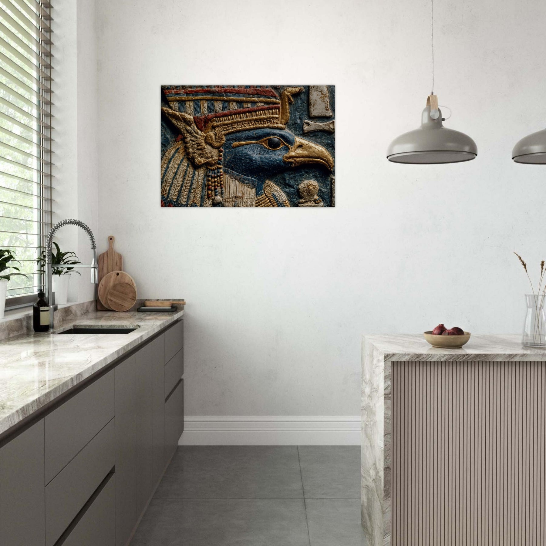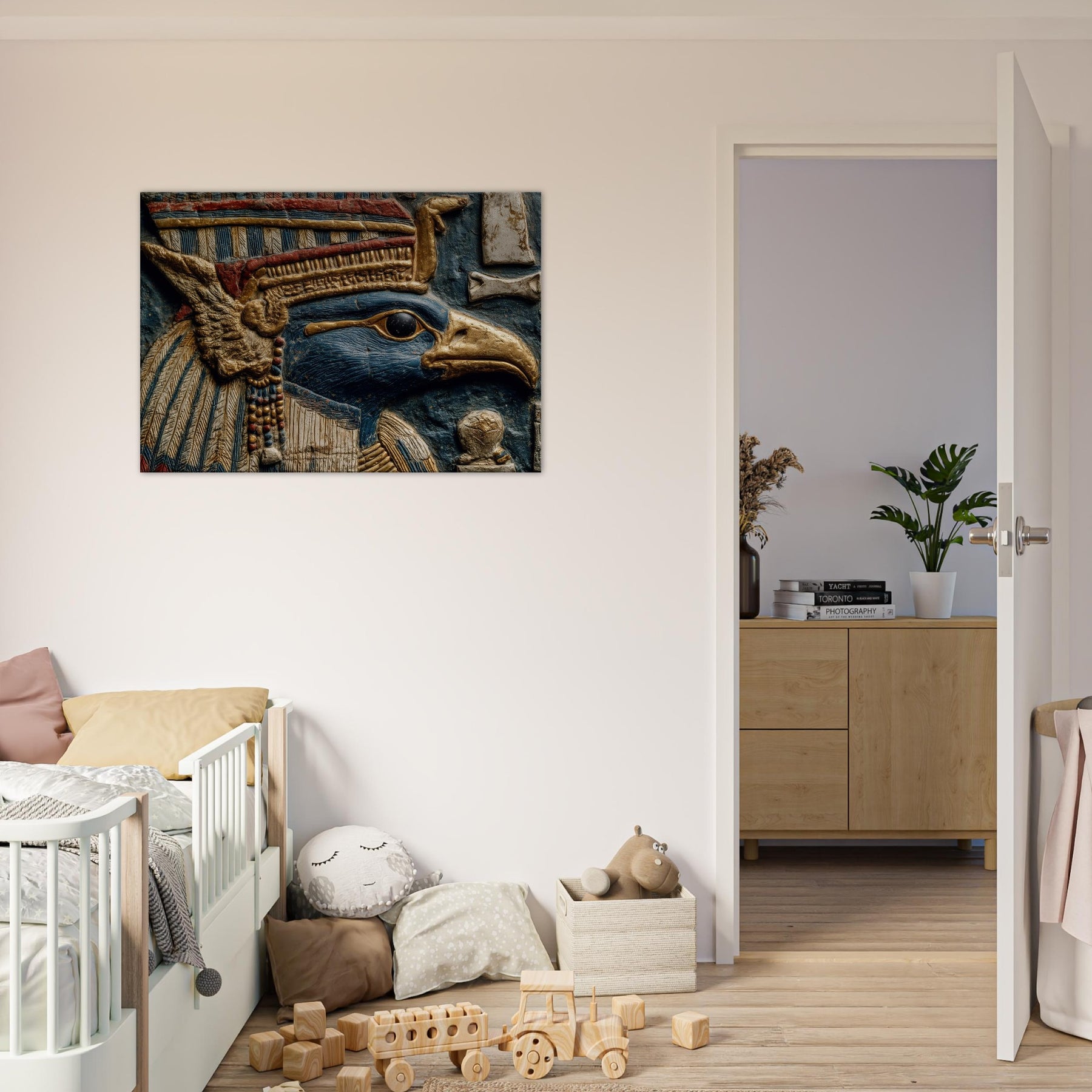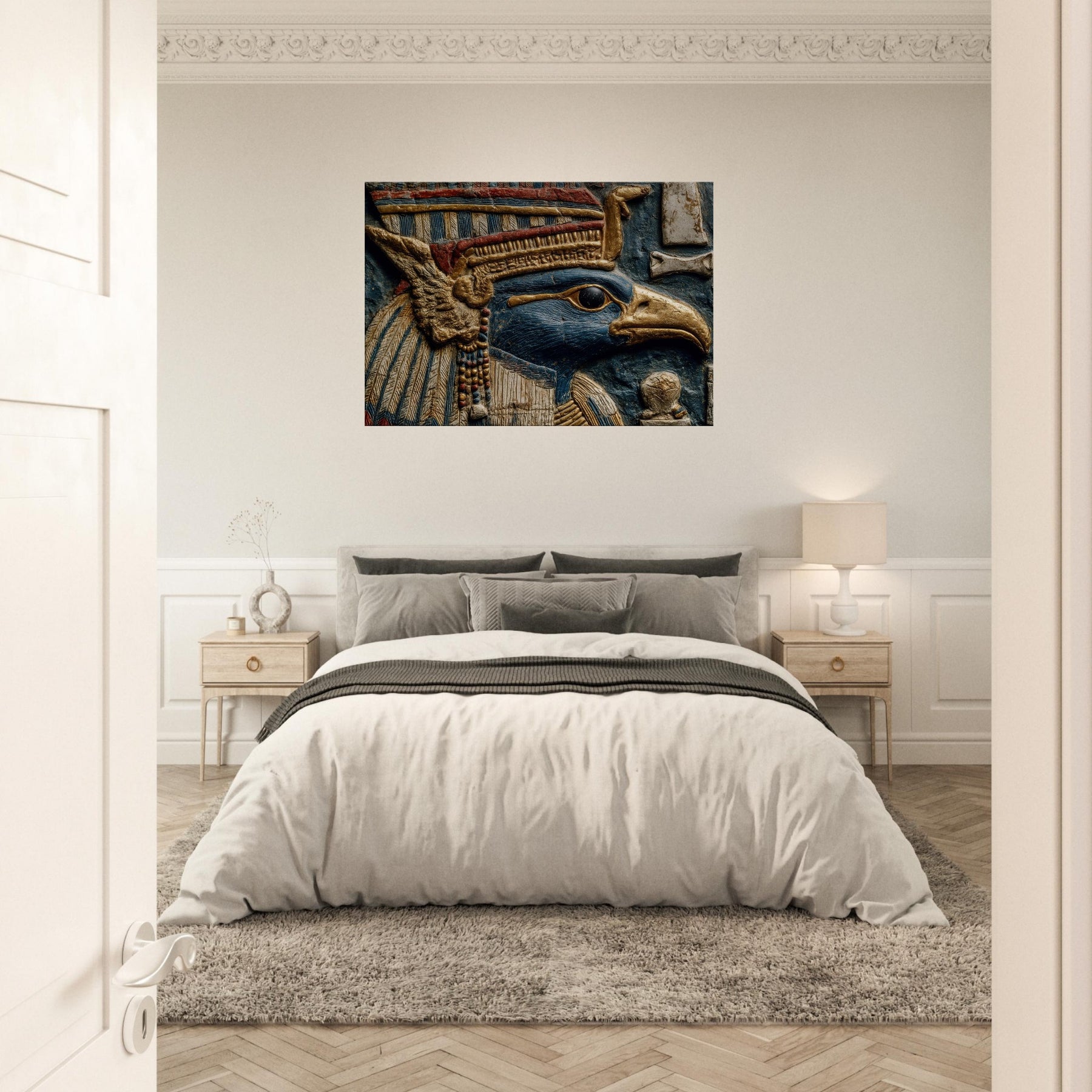 Centered on Ra, the Egyptian Sun God with A Falcon Head and Solar Crown, this painting unfurls like a dream in blue and gold. Surreal forms swirl around his keen gaze, turning ancient power into a living ritual of light. The piece bathes walls in warmth, heightening texture and scent, inviting quiet moments of reflection. Perfect for a living space that craves mythic resonance and a cinematic glow, it transforms any room into an oasis of radiant imagination.