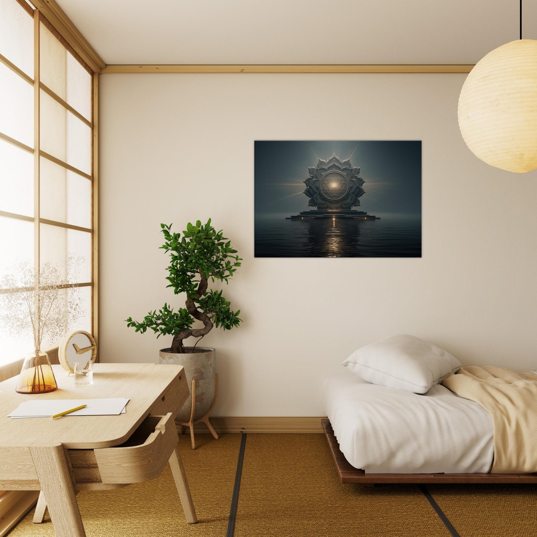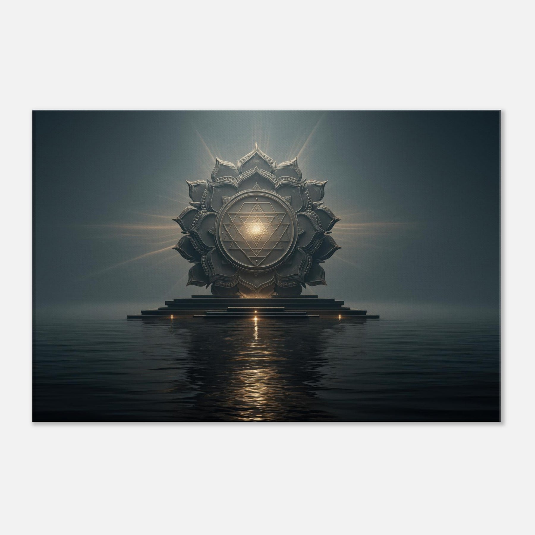 This piece centers on the Sri Yantra, a sacred geometric mandala that rises from still water like a beacon at dawn. In a Surrealist dream, its concentric petals unfold with quiet, molten light, inviting contemplation and serene breaths. The atmosphere feels hushed and ceremonial, turning a living space into a private temple of focus and reflection. With tactile depth and luminous symmetry, it grounds the room while guiding the eye deeper into memory, making the everyday feel expansive and gently miraculous.