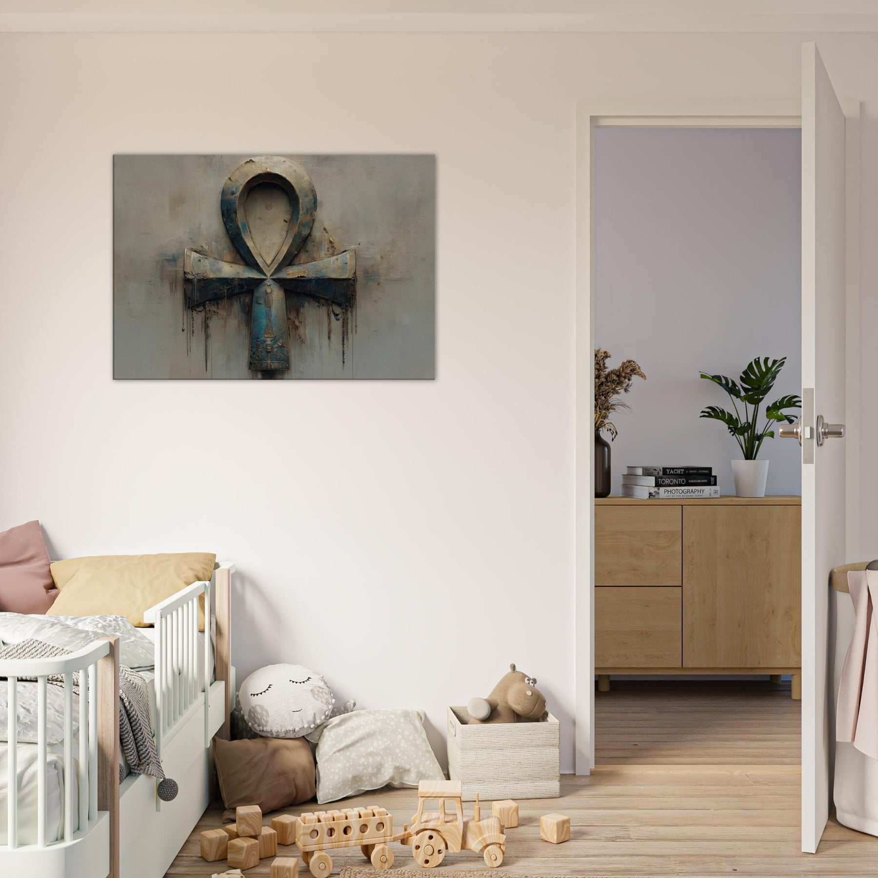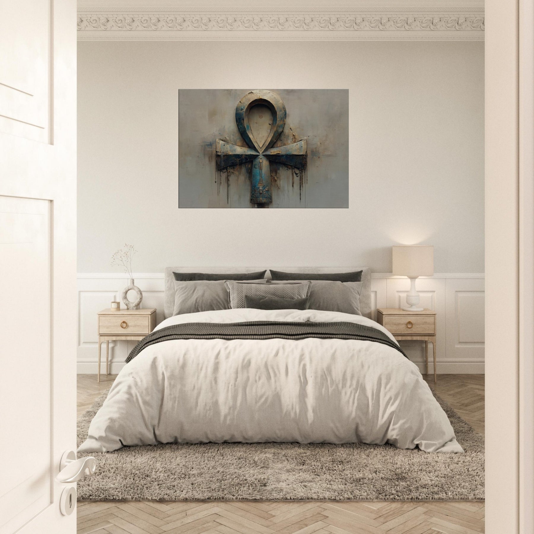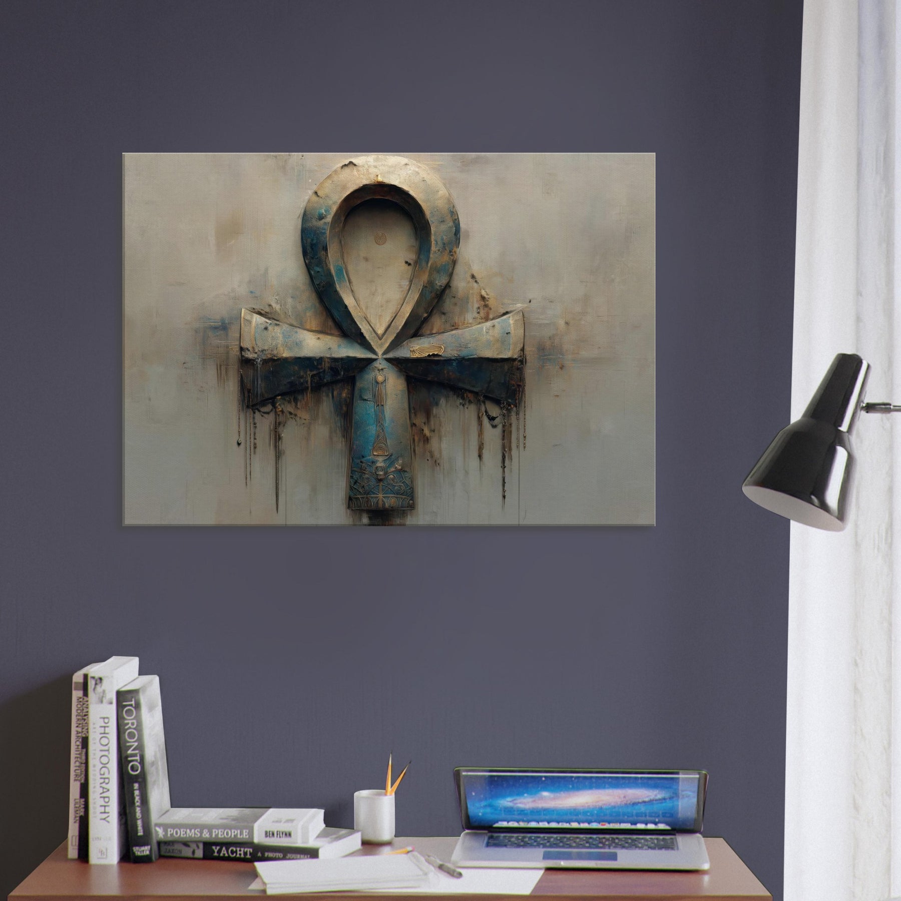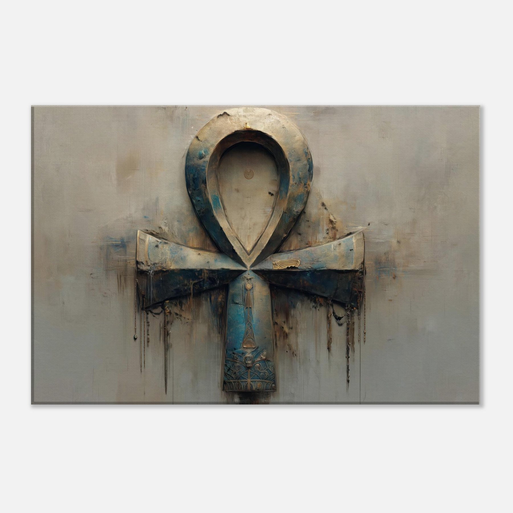 An emblem of life transfigured, this Ankh inspired sculpture drifts between dream and waking in a haze of patinaed blues and weathered metal. The piece's looped form folds into itself, casting soft shadows that whisper of ancient rites. A halo of light gilds the curve, inviting quiet reflection. Position it where dusk lingers living rooms, corridors, or a reading nook and let its atmosphere soften spaces, turning everyday moments into a ritual of wonder and timeless mystery. As the 'Primary Subject', the Ankh anchors the room's mood.