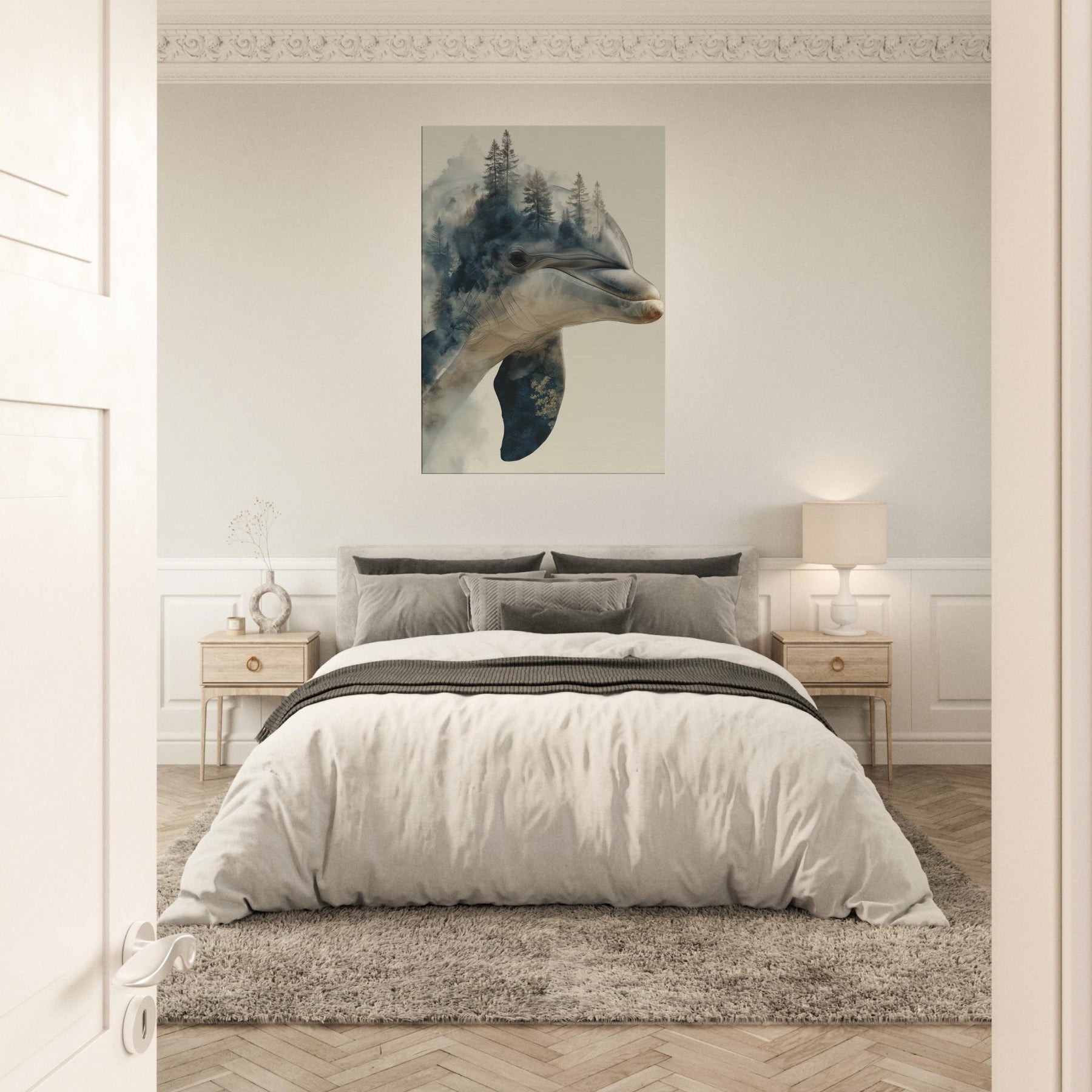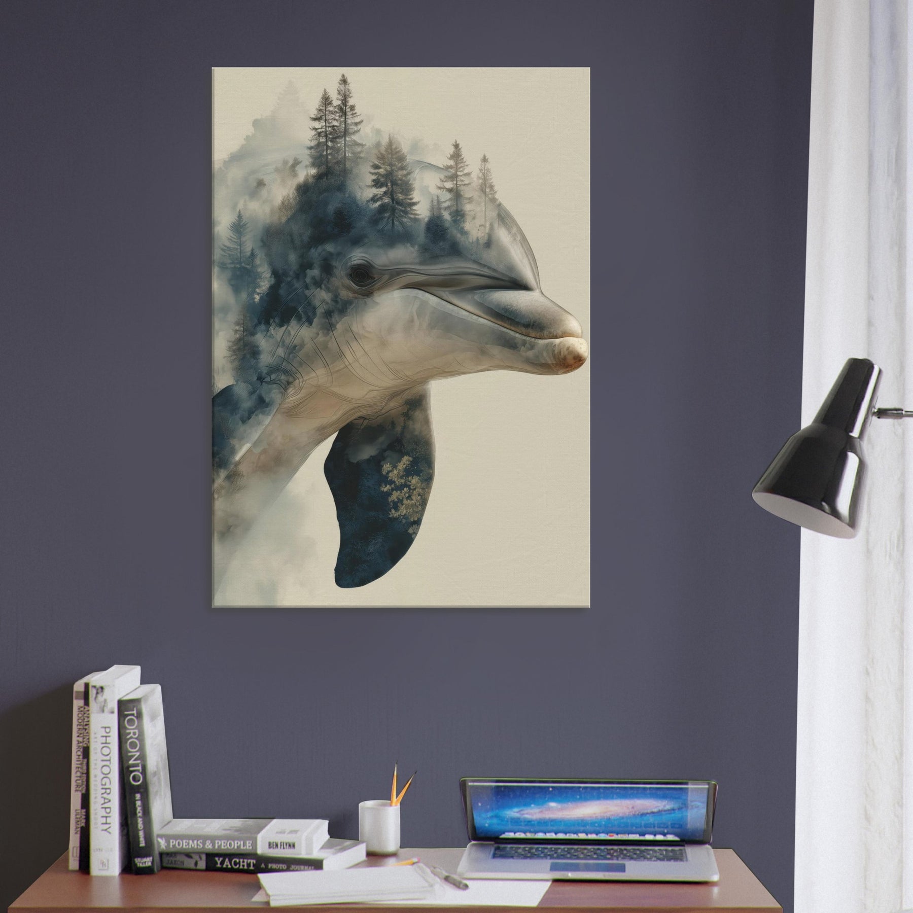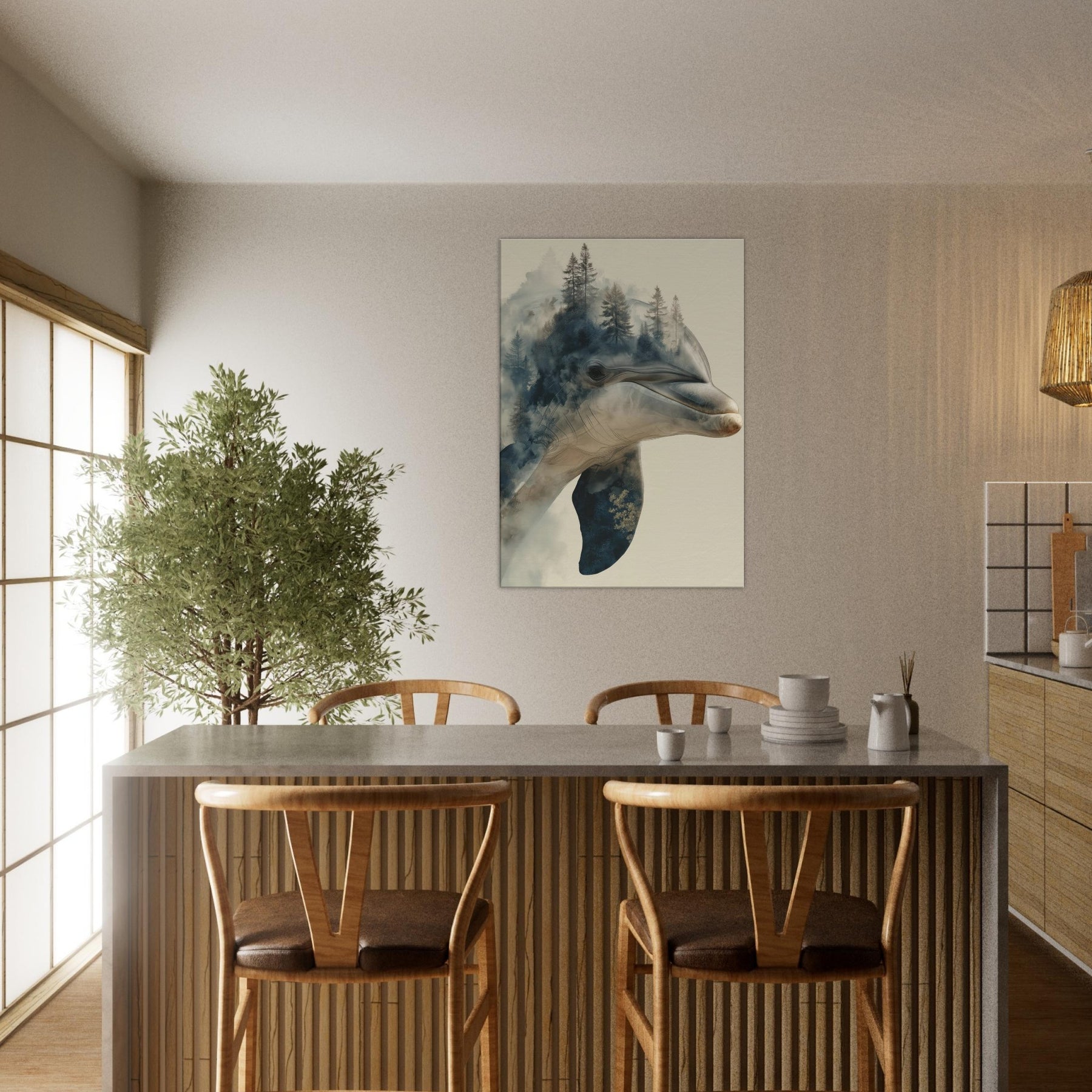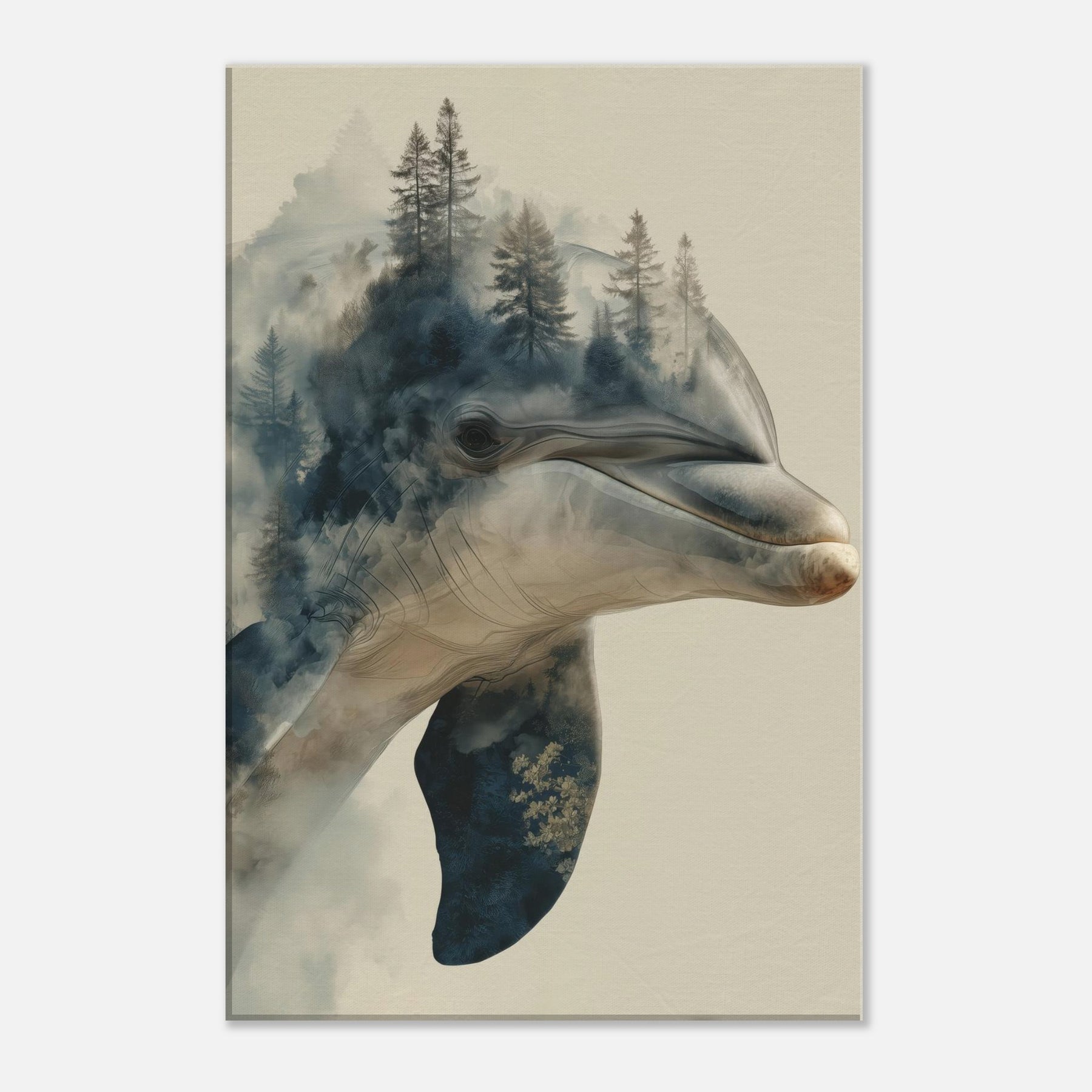 A mesmerizing fusion of sea and forest, this enchanting work centers the Dolphin as a dream bearer, its elegant profile dissolving into a misty canopy of pines. The surreal overlap invites quiet introspection, as if breath and breeze mingle on the wall. Cool blues and warm earth tones drift across the canvas, curling around your living space with a soft, atmospheric glow. It lends the room a spacious, contemplative mood perfect above a seating area or in a sunlit hall where memory and wild curiosity meet in one serene image.