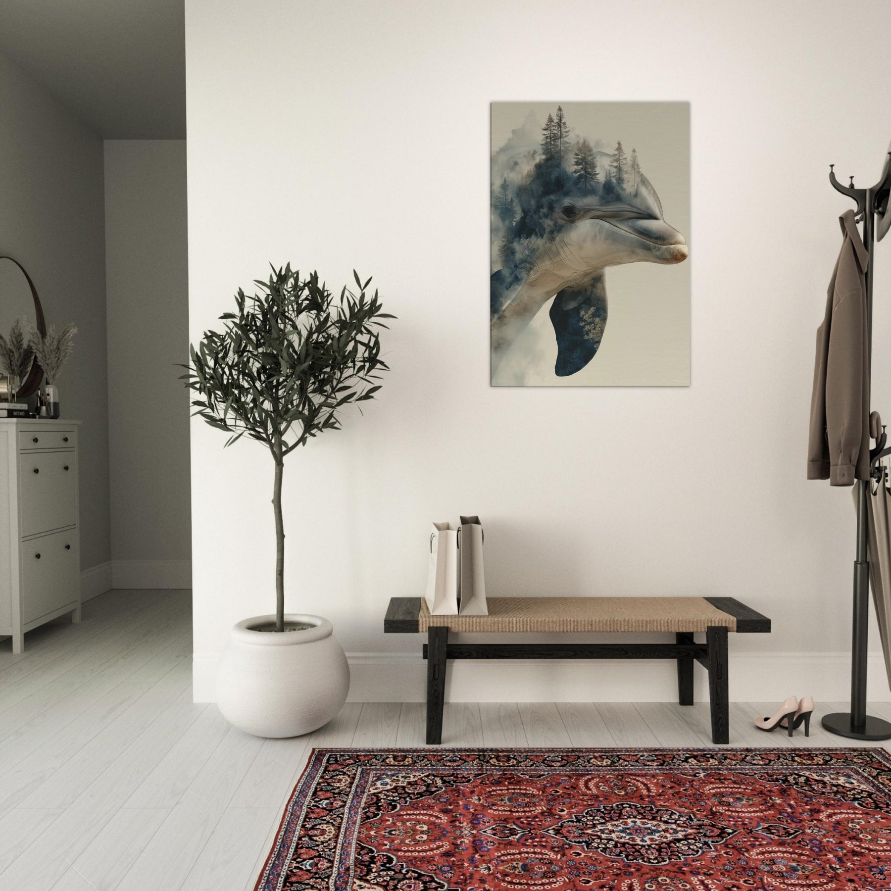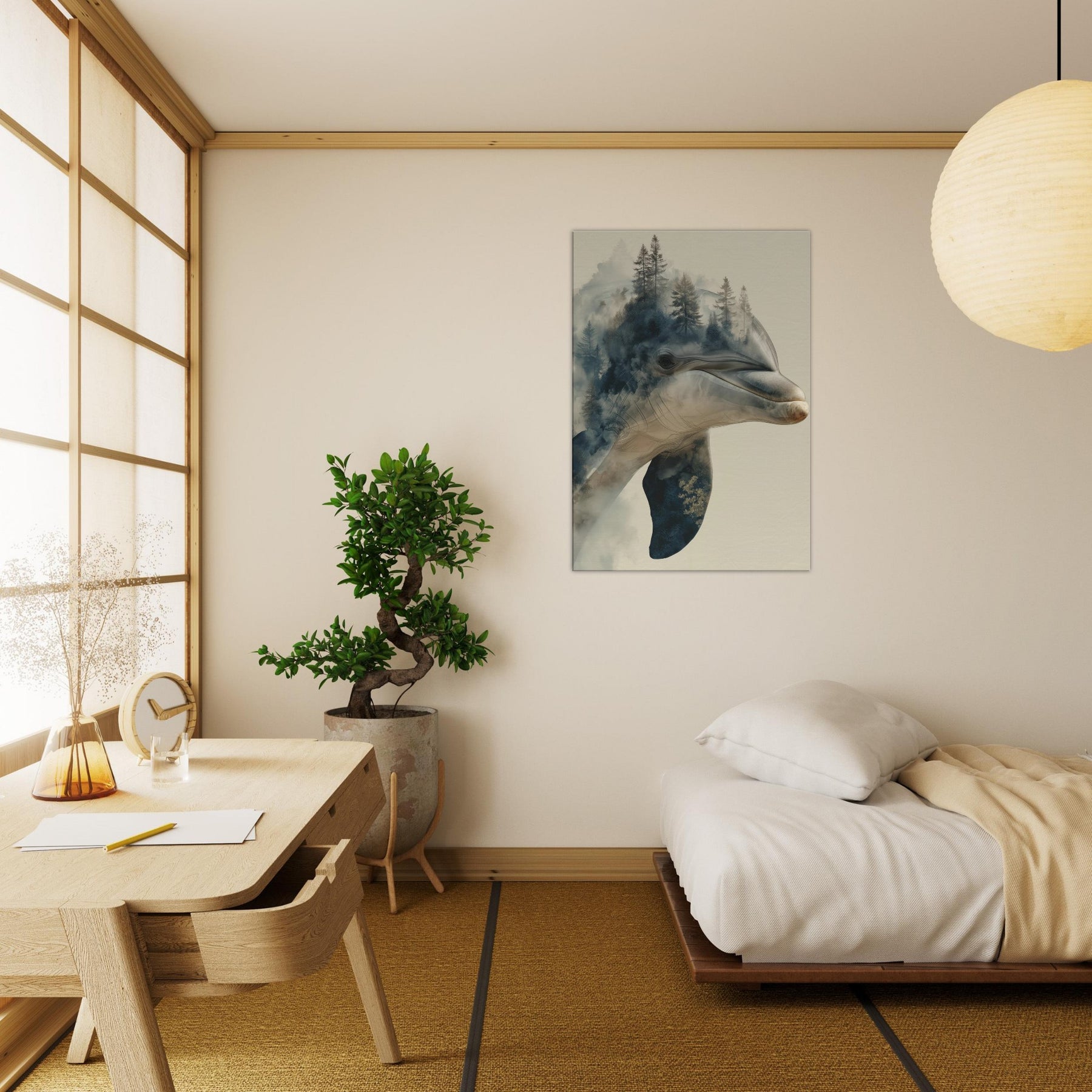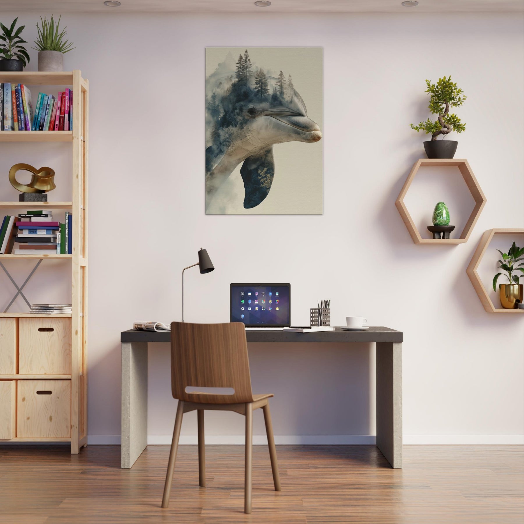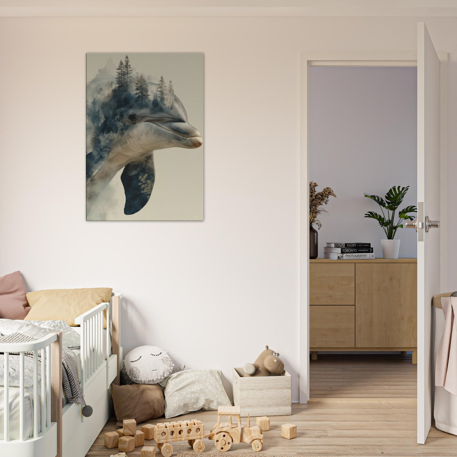 A mesmerizing fusion of sea and forest, this enchanting work centers the Dolphin as a dream bearer, its elegant profile dissolving into a misty canopy of pines. The surreal overlap invites quiet introspection, as if breath and breeze mingle on the wall. Cool blues and warm earth tones drift across the canvas, curling around your living space with a soft, atmospheric glow. It lends the room a spacious, contemplative mood perfect above a seating area or in a sunlit hall where memory and wild curiosity meet in one serene image.