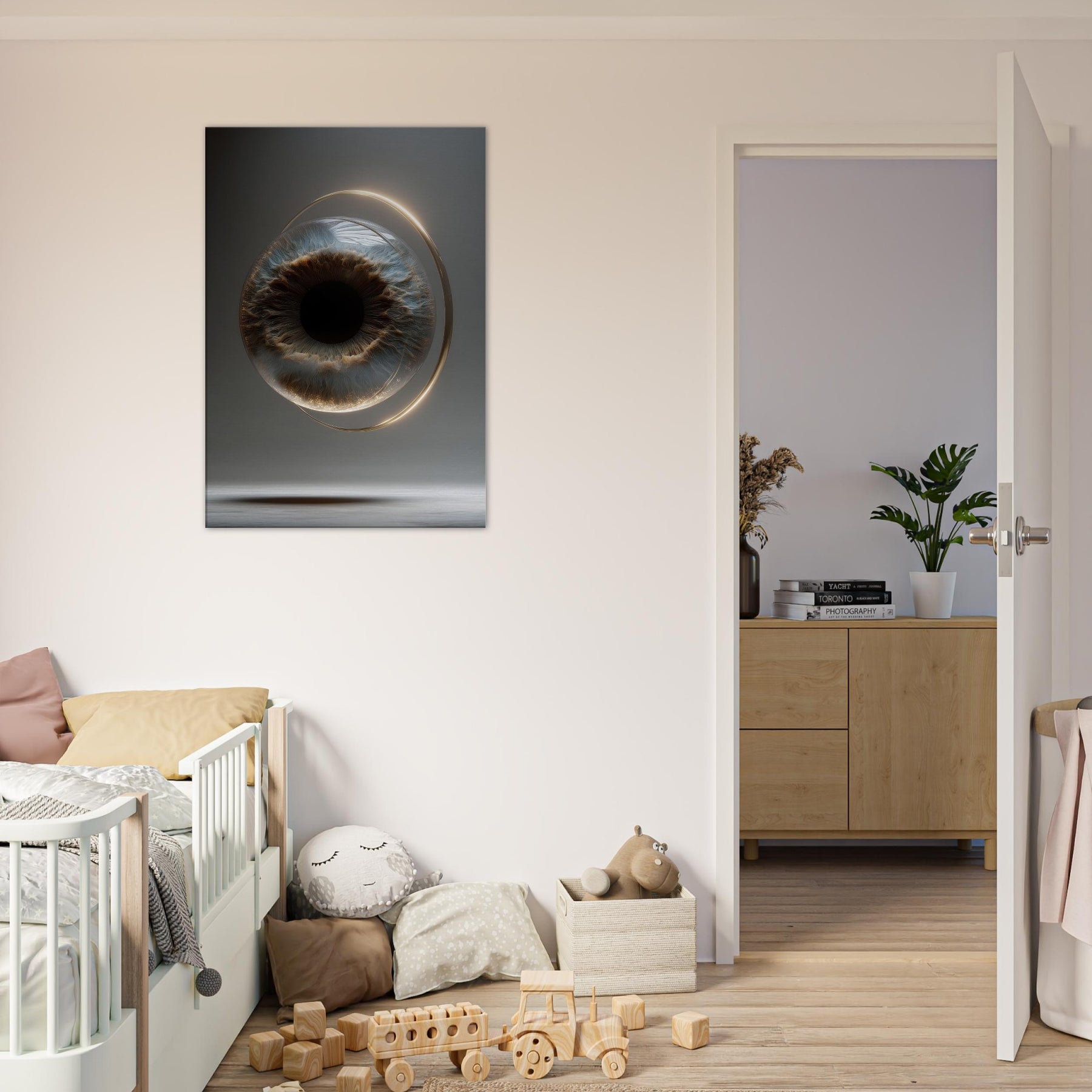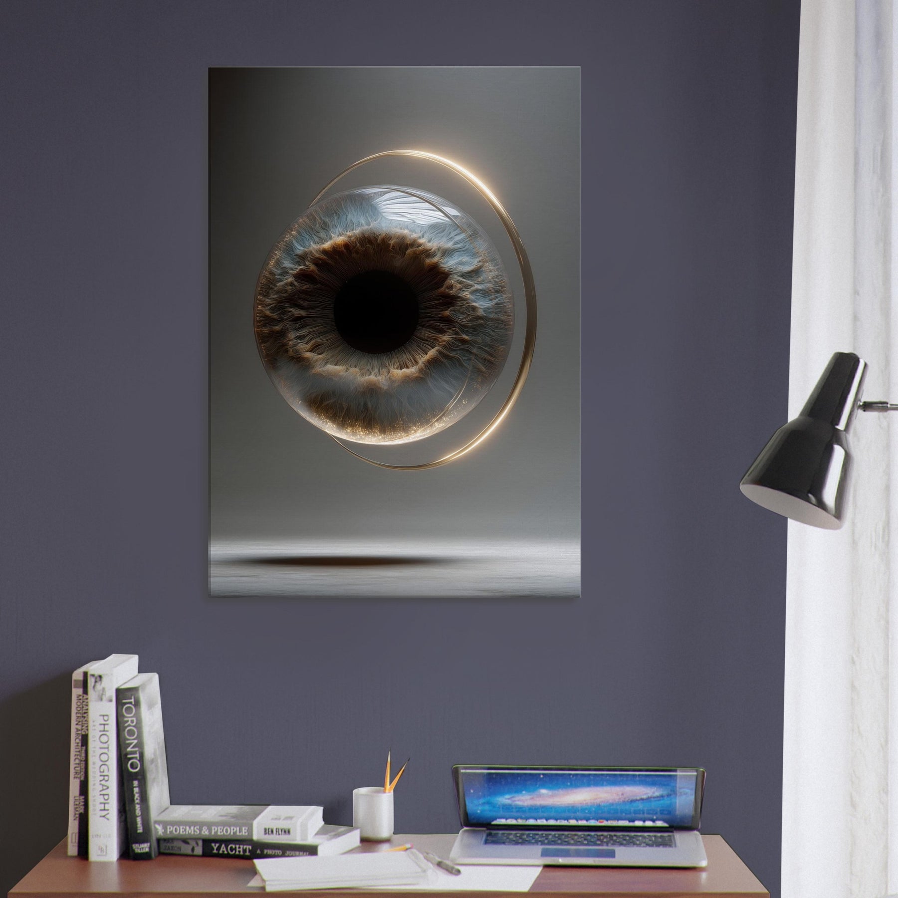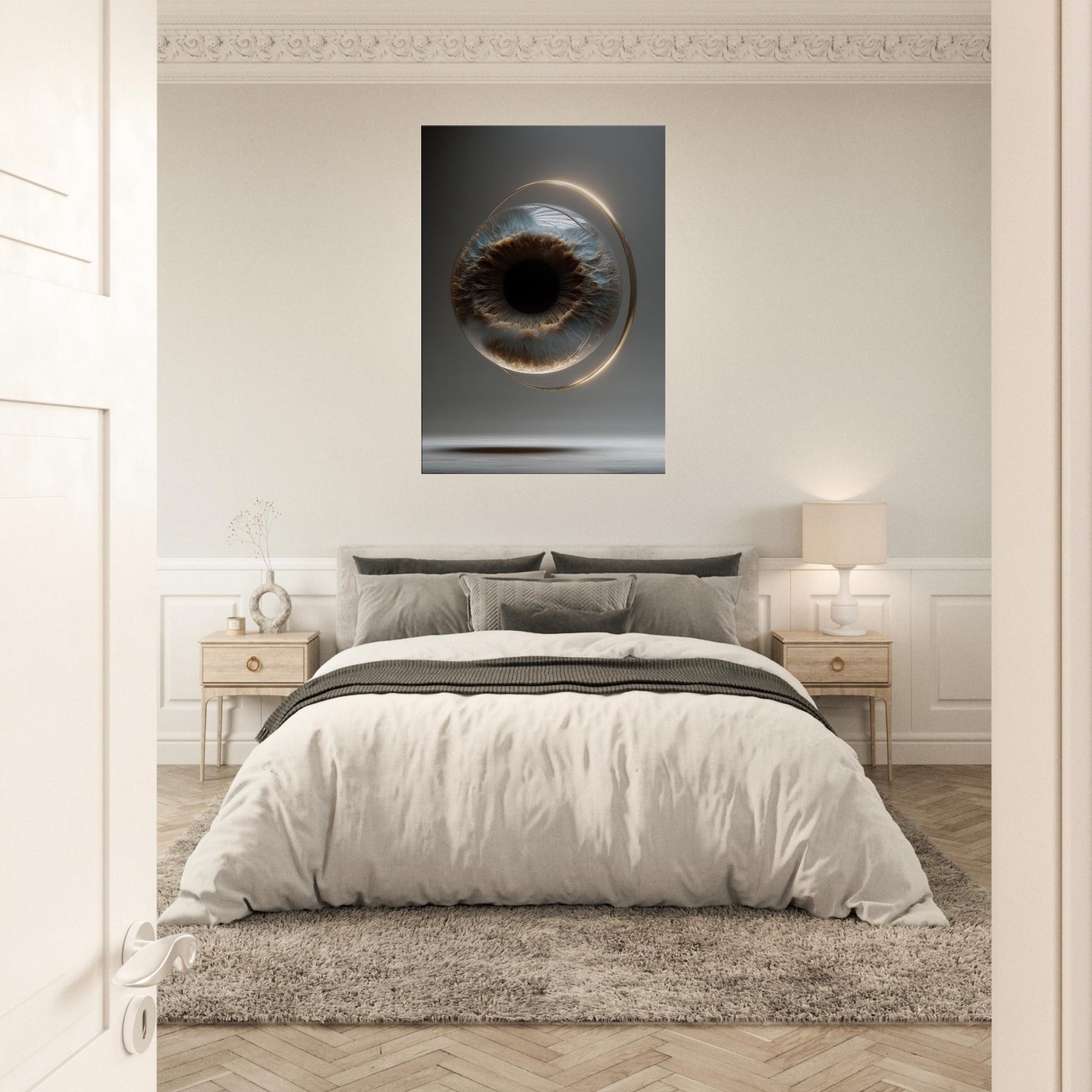 Suspended in a soft, otherworldly glow, this piece conjures a sea of stillness where sight becomes a ritual. The Eye of Providence unfolds within a translucent orbit, its iris a tide of cobalt and bronze that hums with quiet power. Surreal and mystical, the composition invites contemplation and slows the room’s tempo, turning a wall into a window. Perfect above a sofa or in a hallway nook, it lends mystery, focus, and a luminous calm.