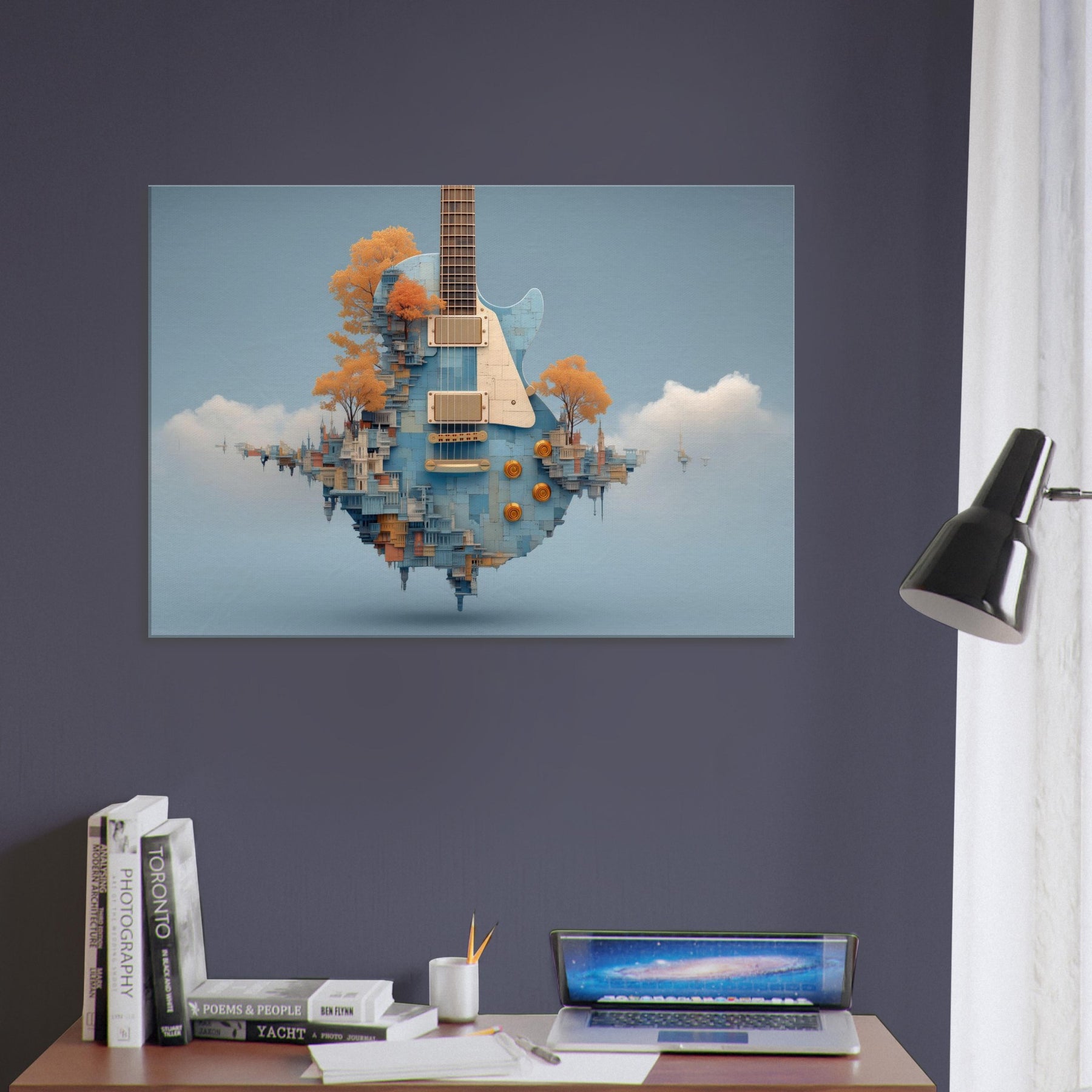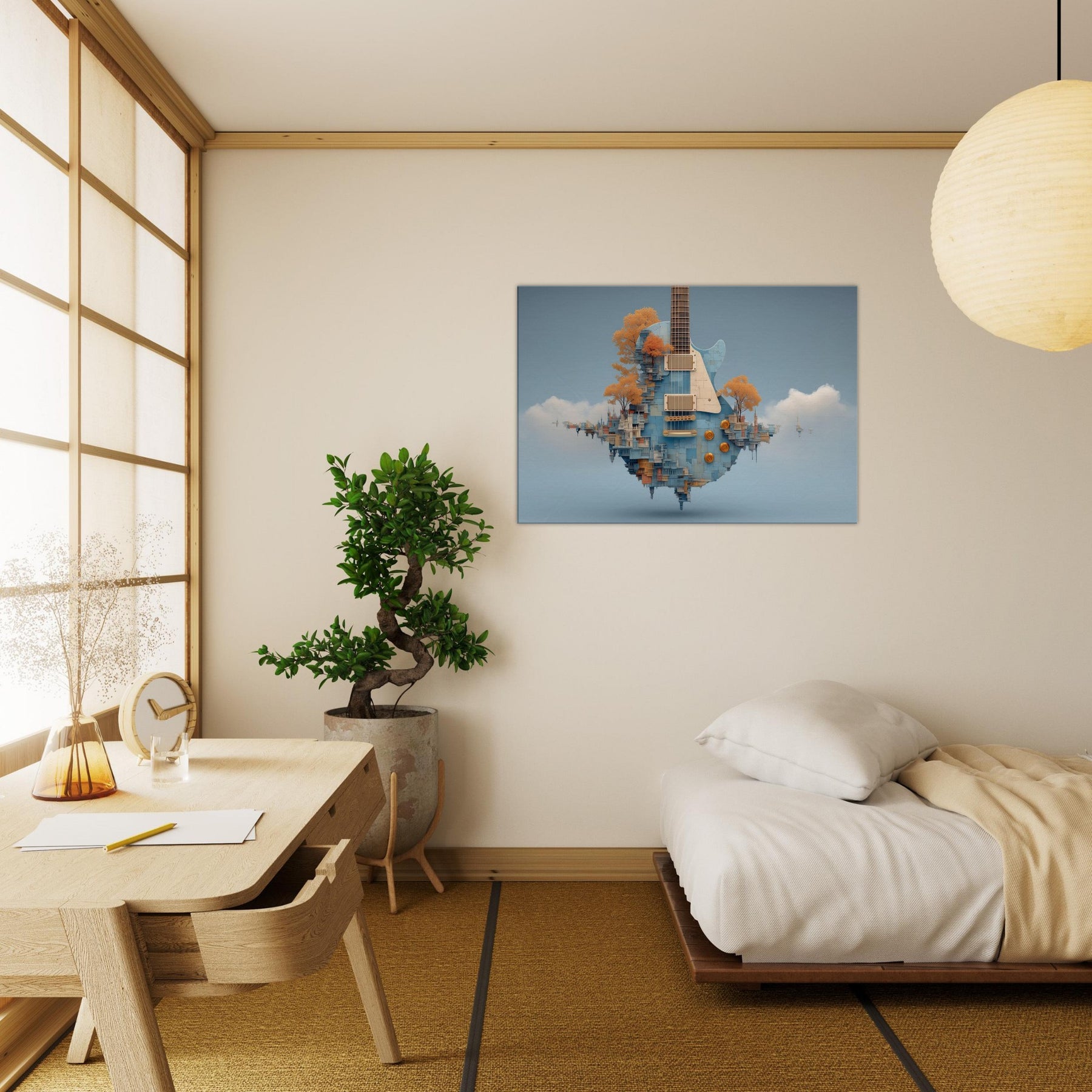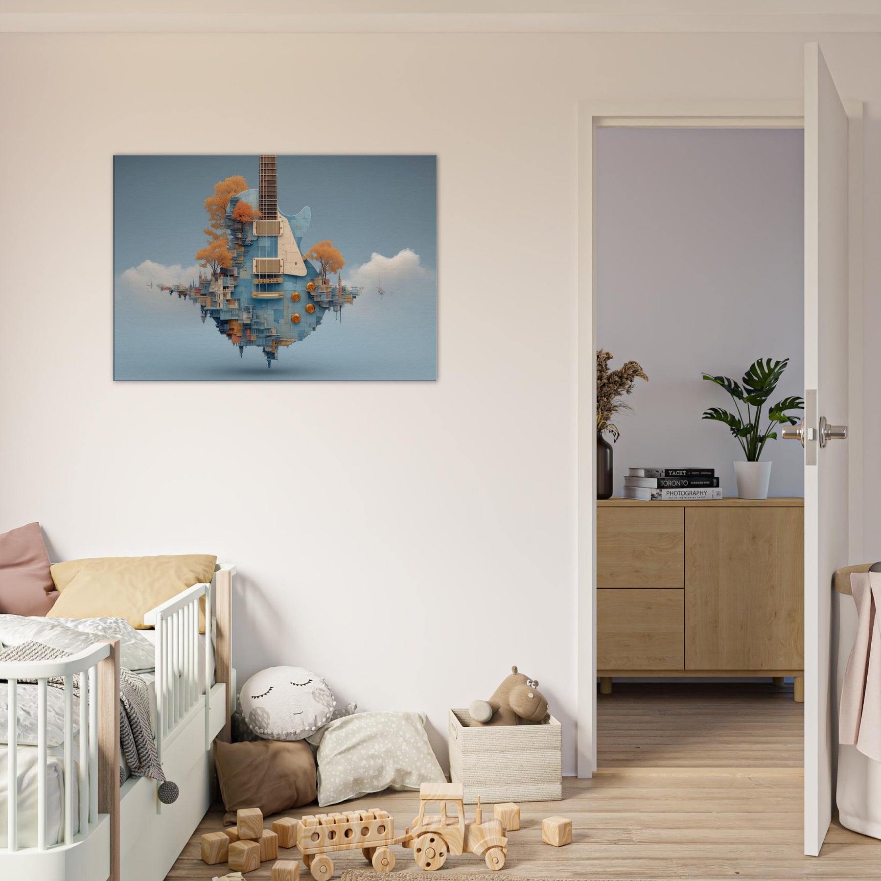 Step into a dream where a Guitar becomes a city of memory, its body stitched from color block facades and staircases that spiral toward the clouds. Orange trees sprout from the instrument’s silhouette, while pale gold hardware glints like quiet notes. The surreal composition bathes a room in a soft, cinematic light, inviting quiet awe and thoughtful conversation. Hang it in a living room or studio to dissolve boundaries between sound and sight the piece turns walls into a living, melodic atmosphere.