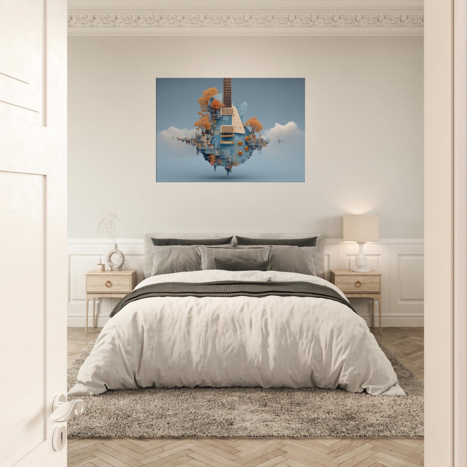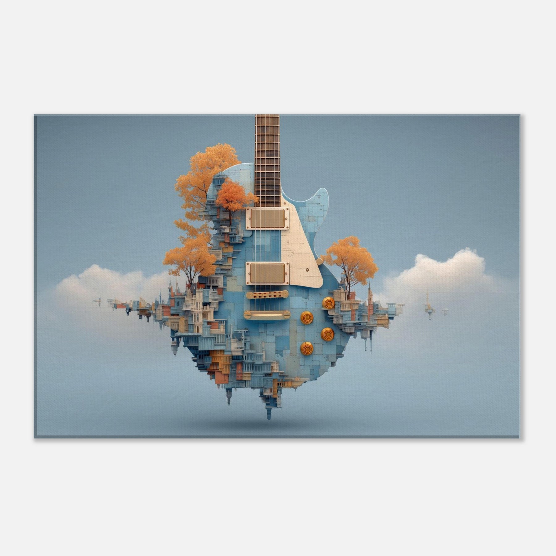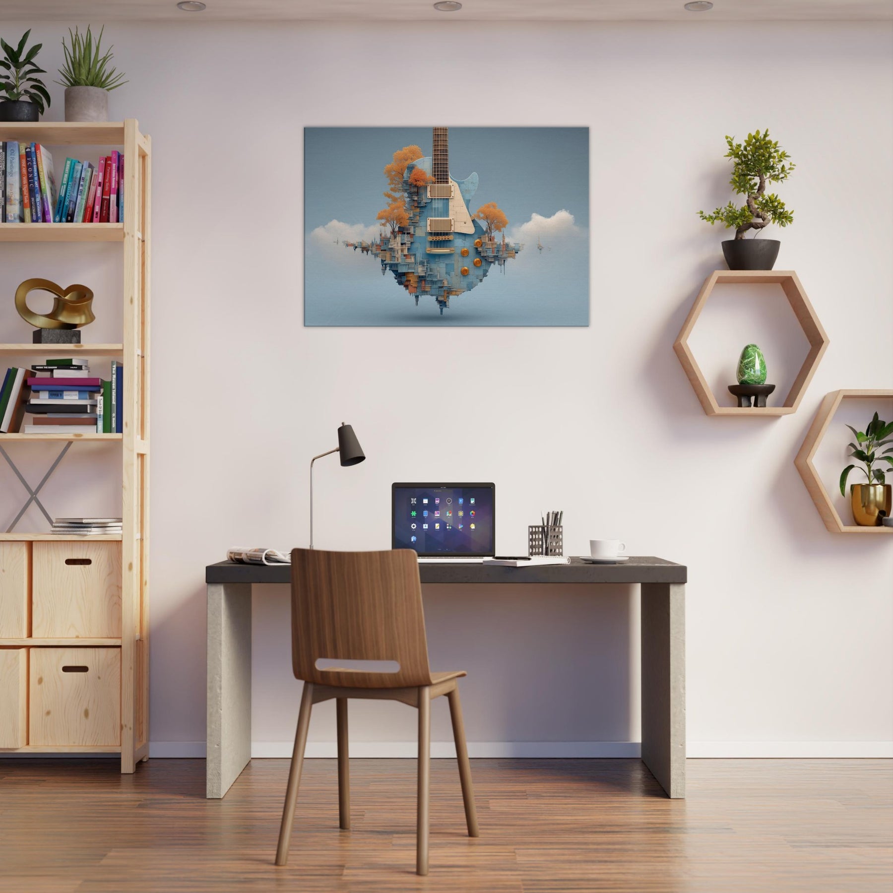 Step into a dream where a Guitar becomes a city of memory, its body stitched from color block facades and staircases that spiral toward the clouds. Orange trees sprout from the instrument’s silhouette, while pale gold hardware glints like quiet notes. The surreal composition bathes a room in a soft, cinematic light, inviting quiet awe and thoughtful conversation. Hang it in a living room or studio to dissolve boundaries between sound and sight the piece turns walls into a living, melodic atmosphere.