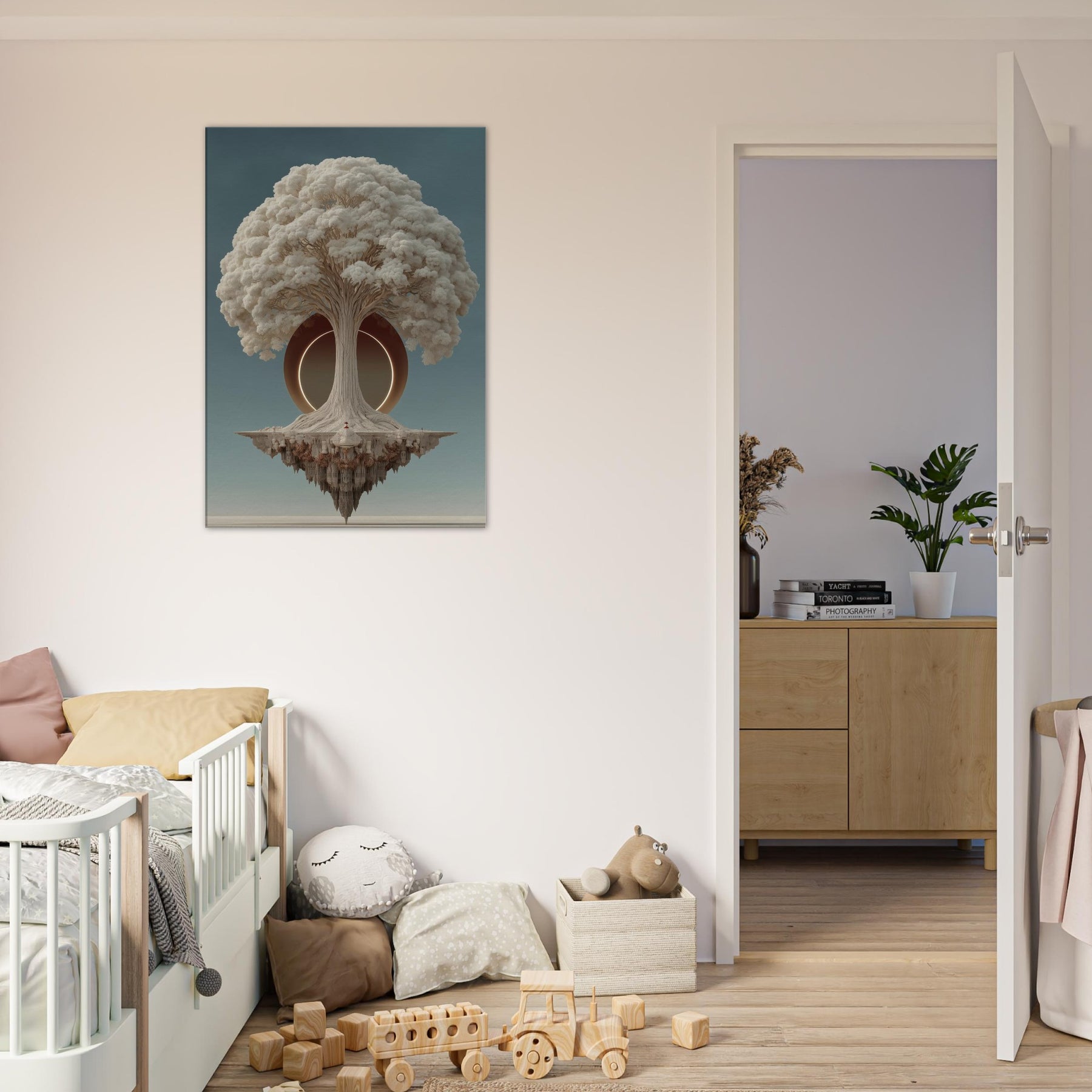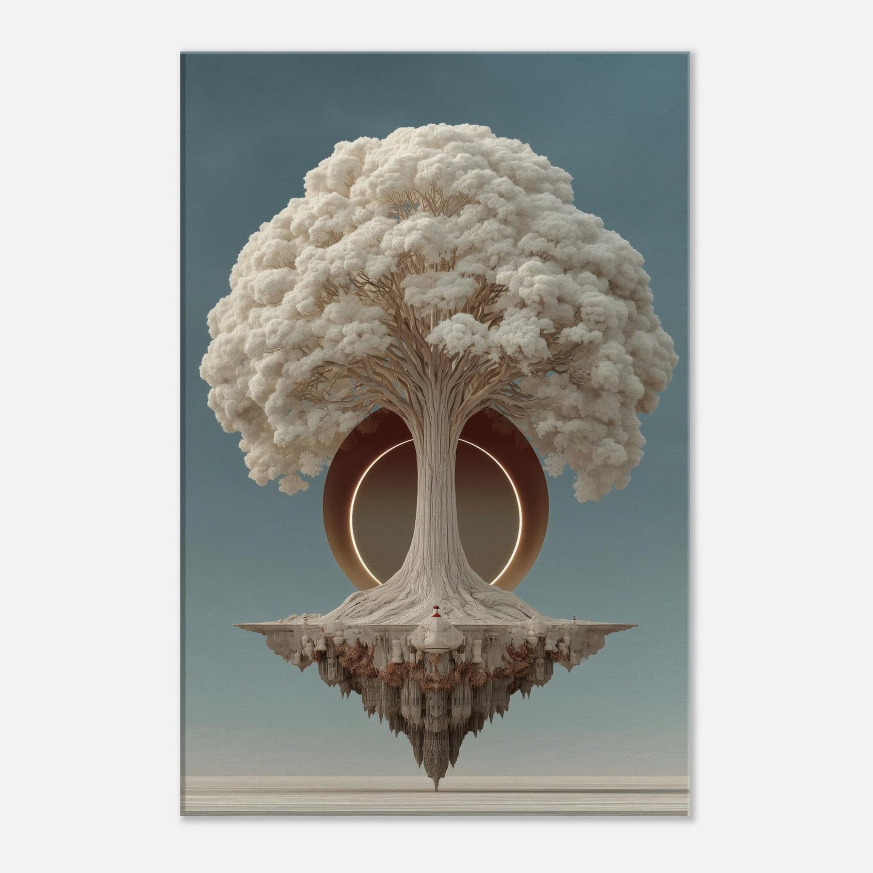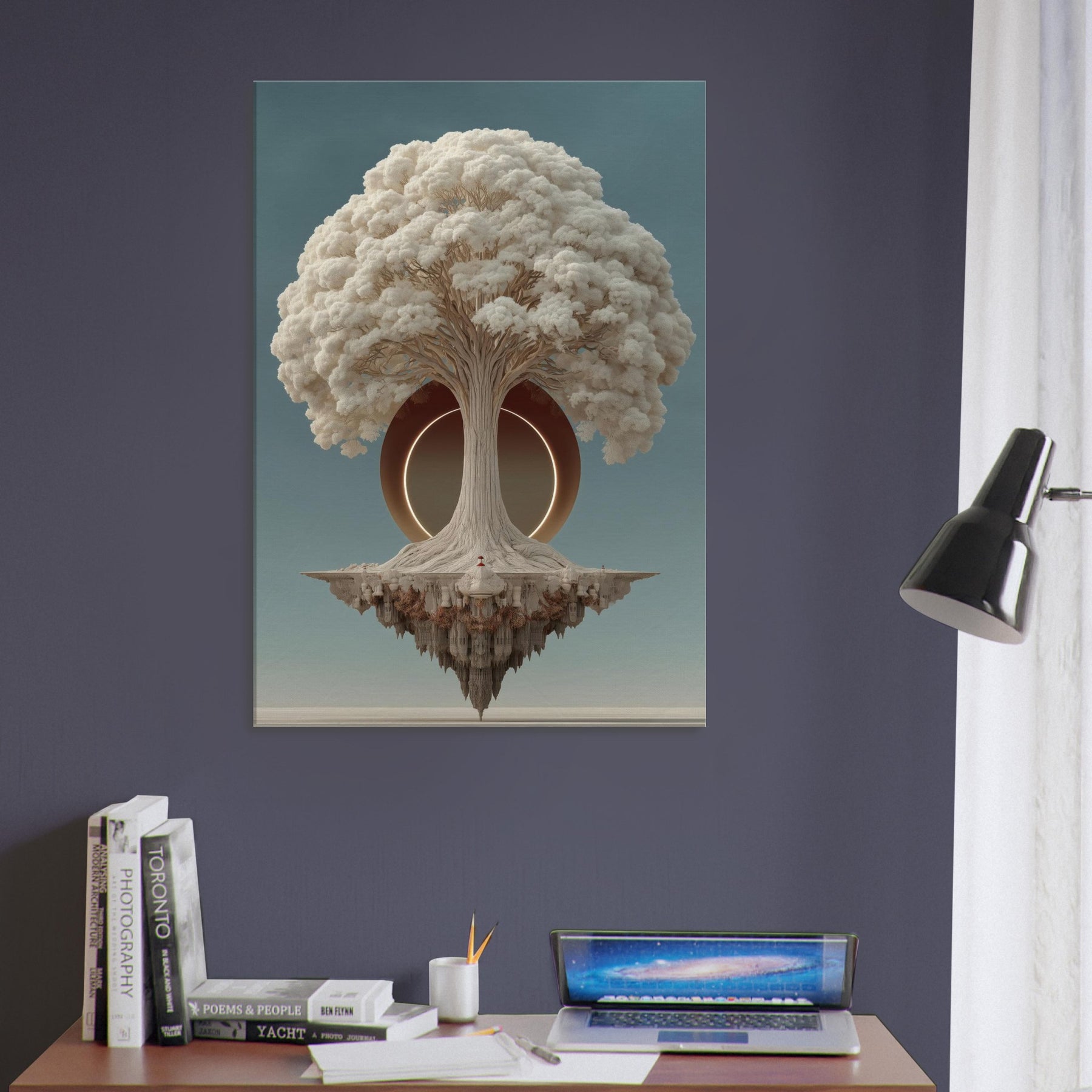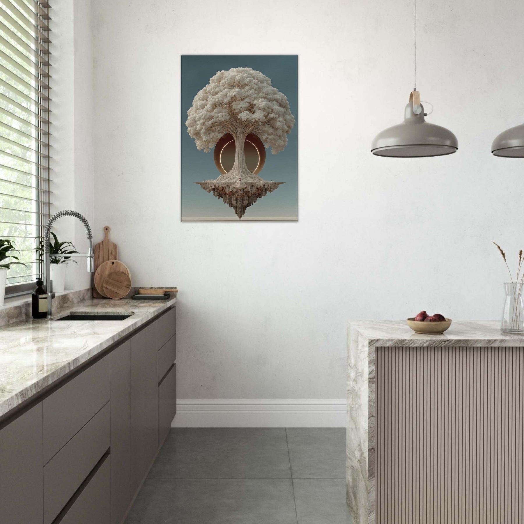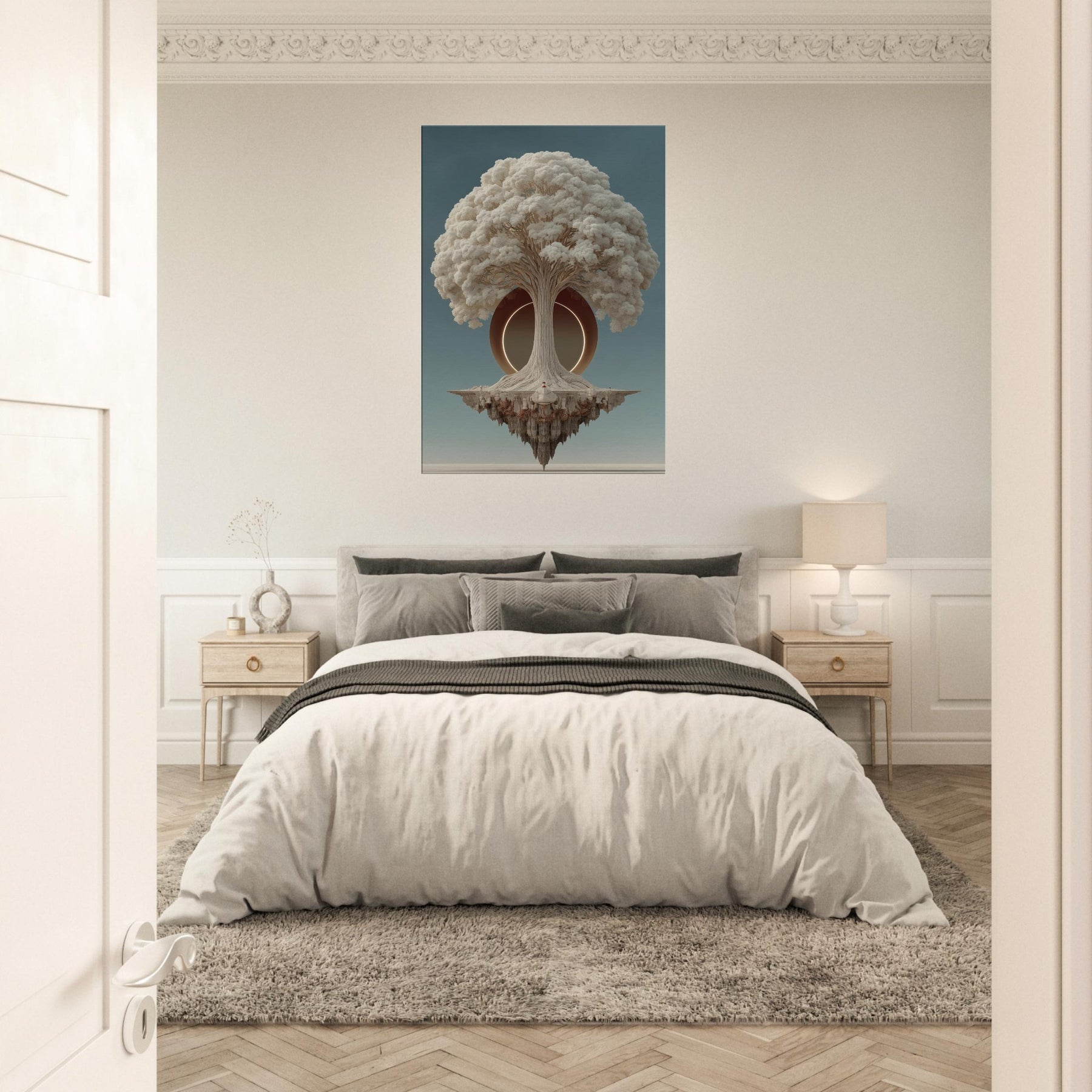 Within this suspended horizon, a colossal tree rises from a mirrored edge, its cloud white canopy breathing softly above a ring of light. The Kabbalah Tree of Life feels dreamt into being, each branch a delicate sculpture, each root a whisper of ancient computation. The luminal circle frames the yearned for calm, inviting stillness to nest in your room. In a living space, this surreal scene becomes a quiet oracle a daily reminder to breathe, balance, and behold the mystery at the center of ordinary moments.