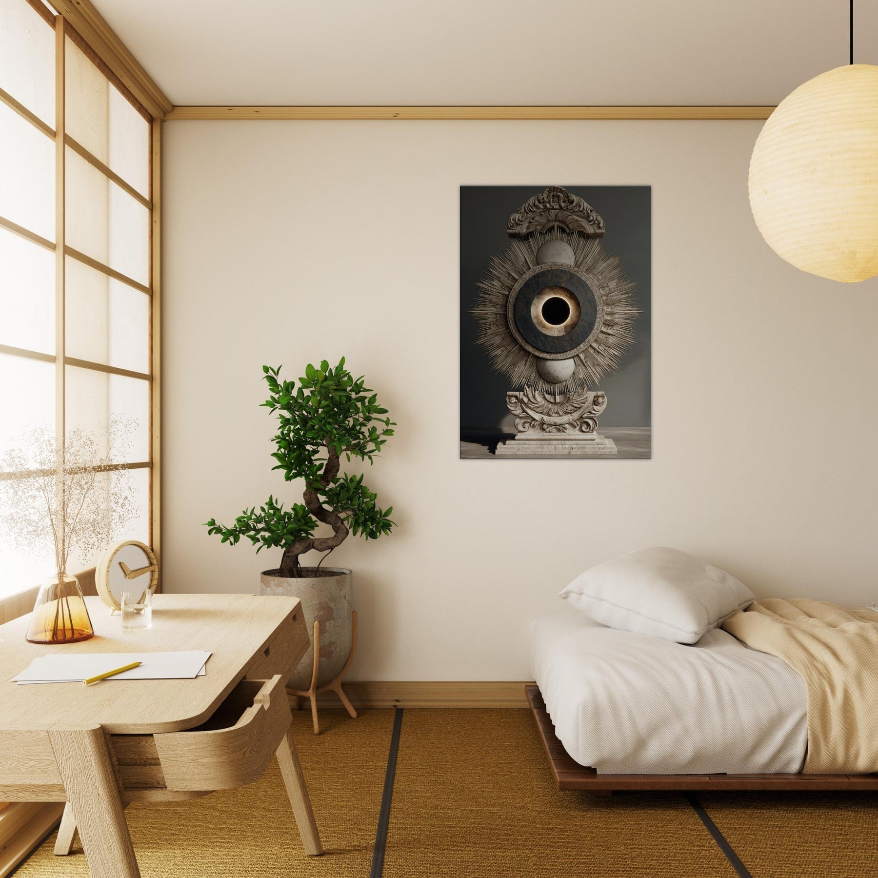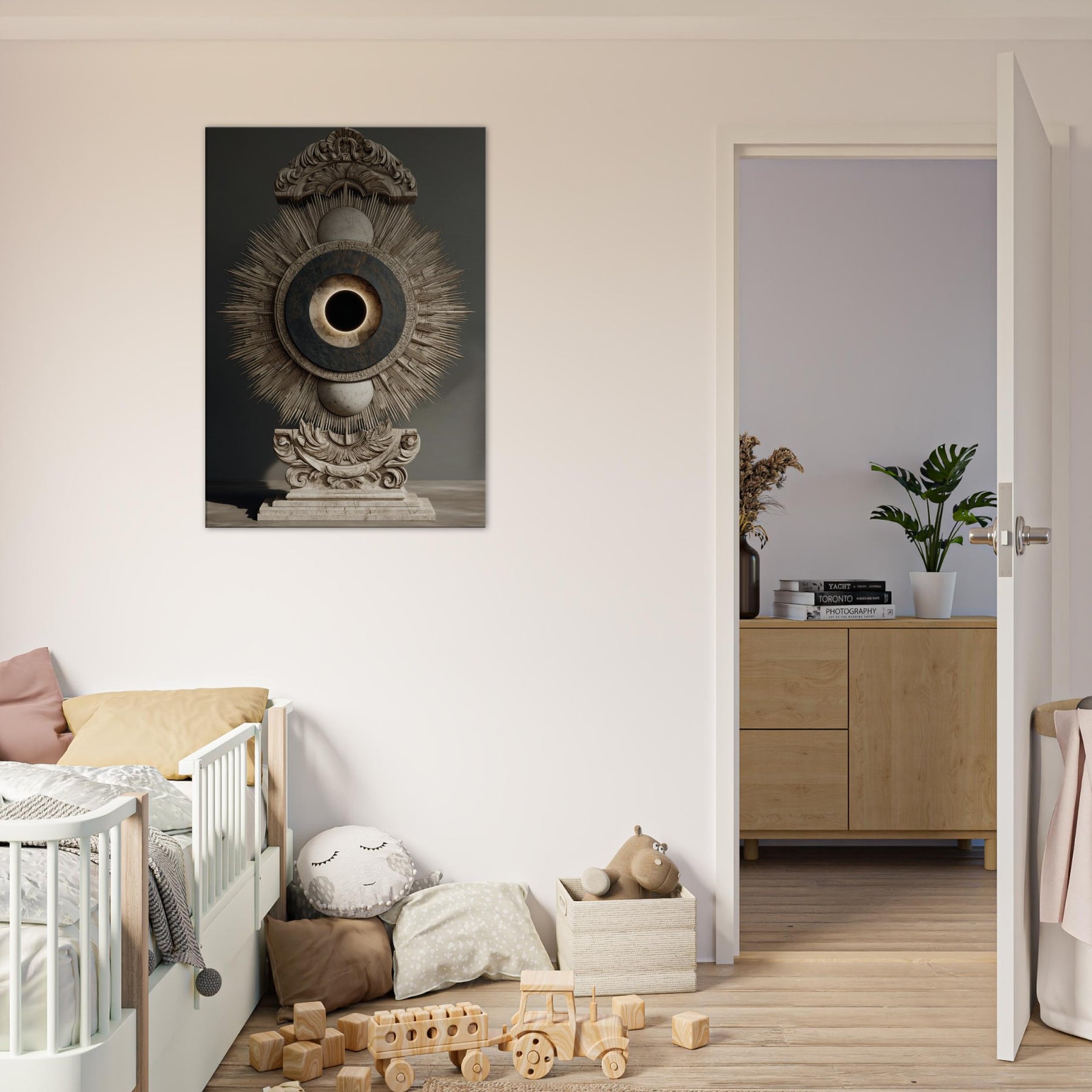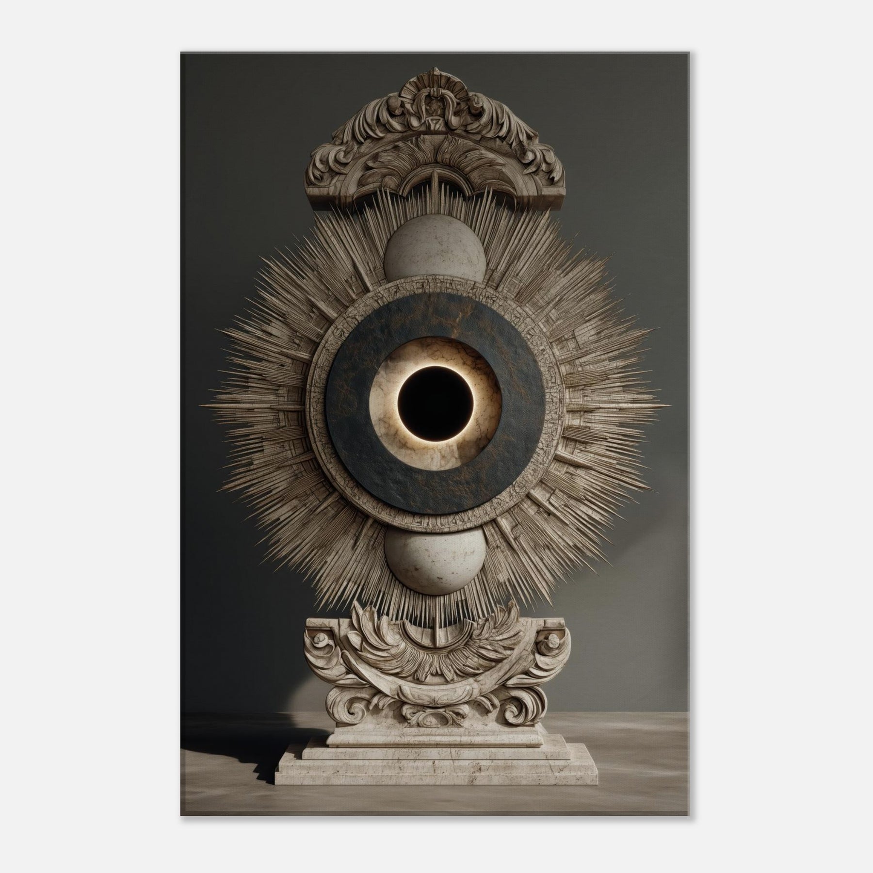 Moon Phases unfolds as a celestial reliquary, where a radiant sunburst encloses a quiet lunar core. Its surreal composition exudes a hushed, meditative glow that softens surfaces and invites contemplative breath. Place it where you seek quiet magic above a sofa, in a hallway, or beside your bed and watch the room breathe with a mystical cadence, as the phases of the moon encourage slow, luminous evenings and a sense of timeless wonder.