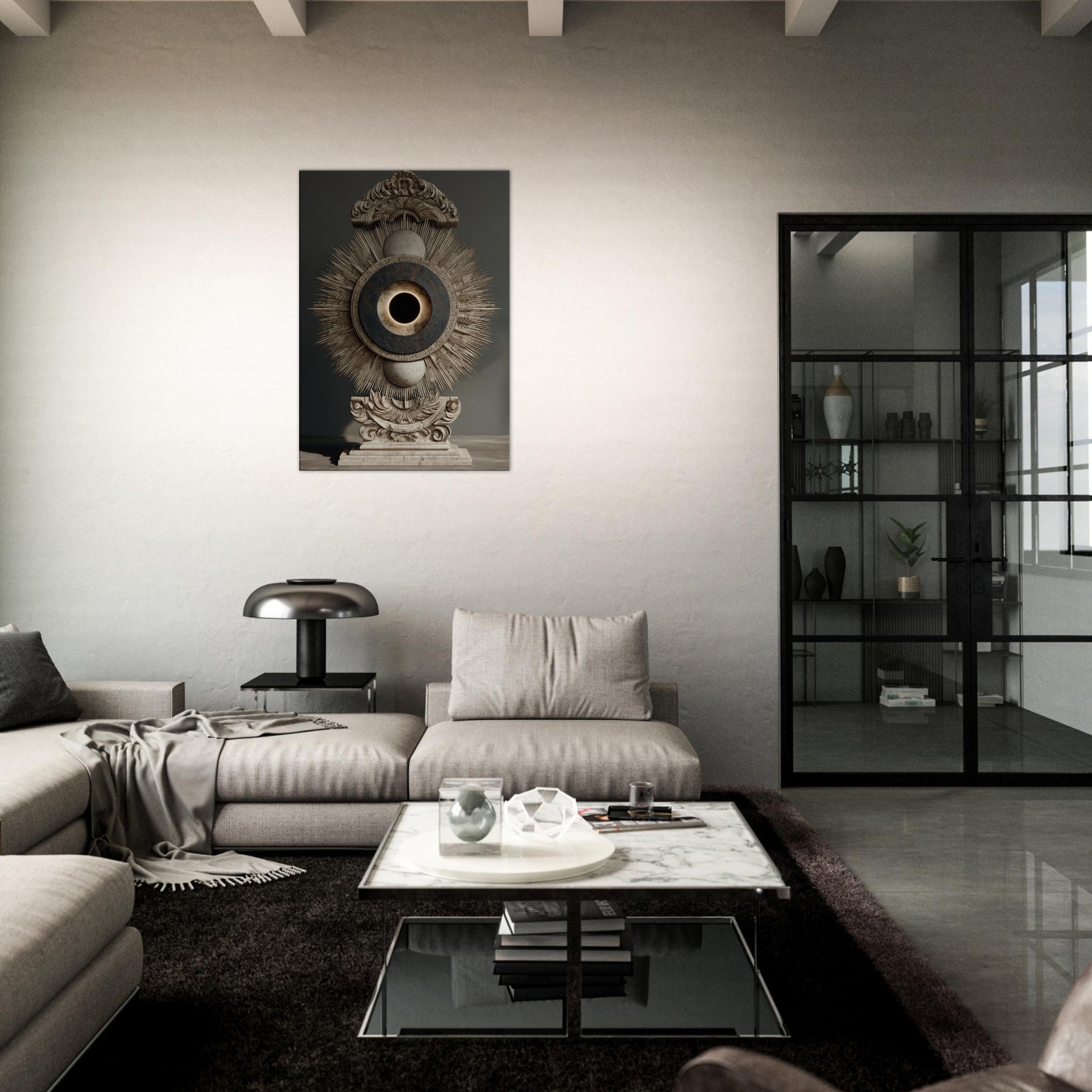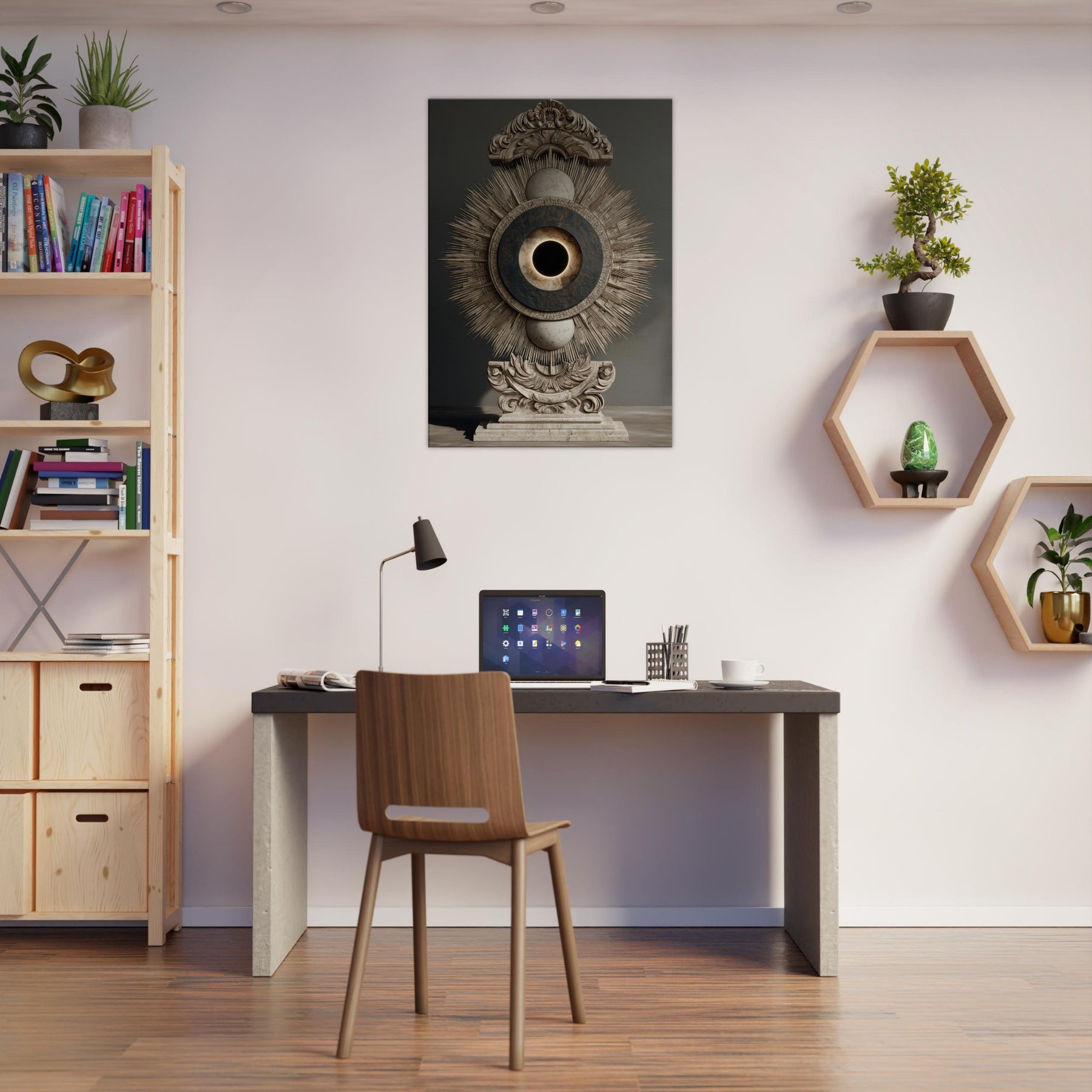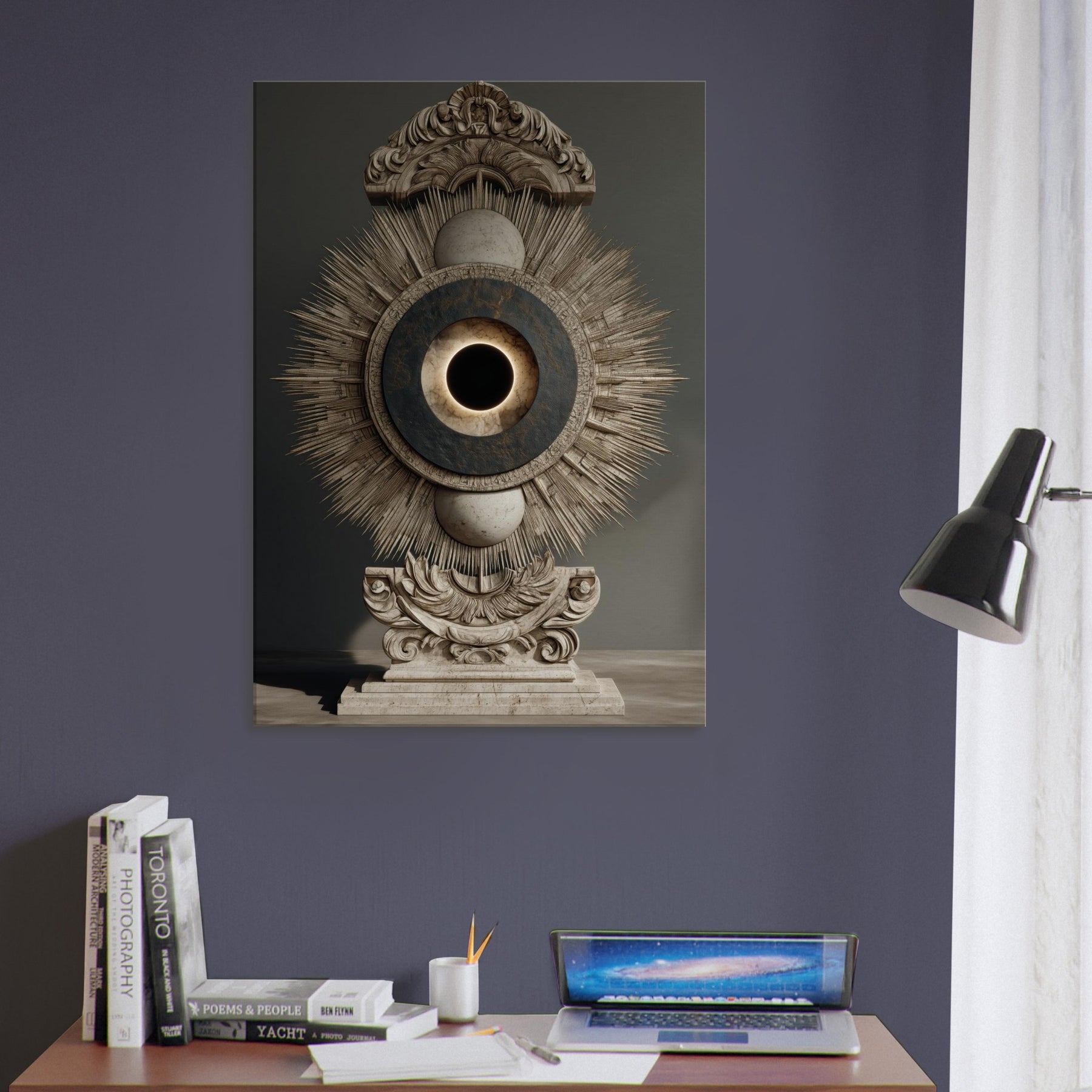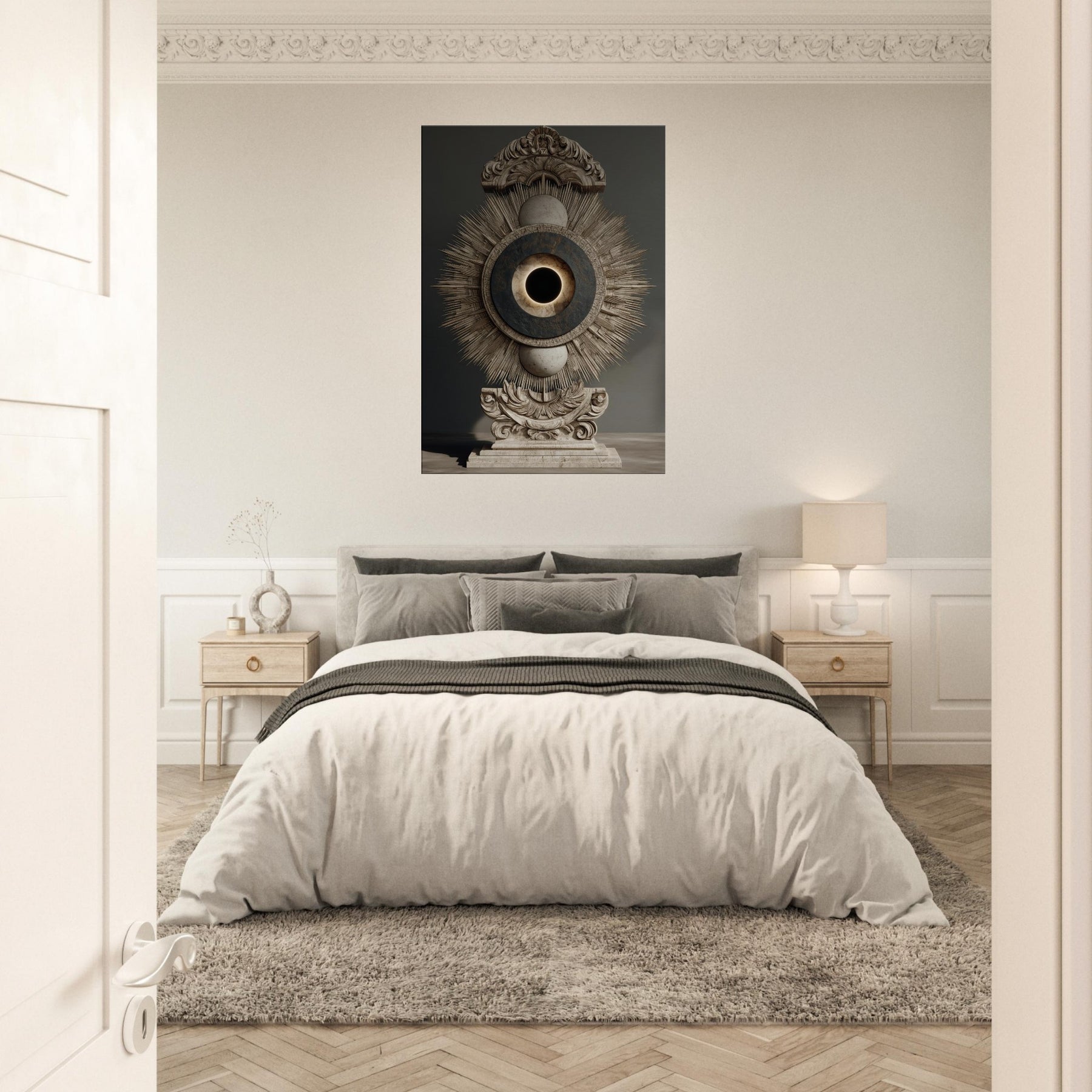 Moon Phases unfolds as a celestial reliquary, where a radiant sunburst encloses a quiet lunar core. Its surreal composition exudes a hushed, meditative glow that softens surfaces and invites contemplative breath. Place it where you seek quiet magic above a sofa, in a hallway, or beside your bed and watch the room breathe with a mystical cadence, as the phases of the moon encourage slow, luminous evenings and a sense of timeless wonder.