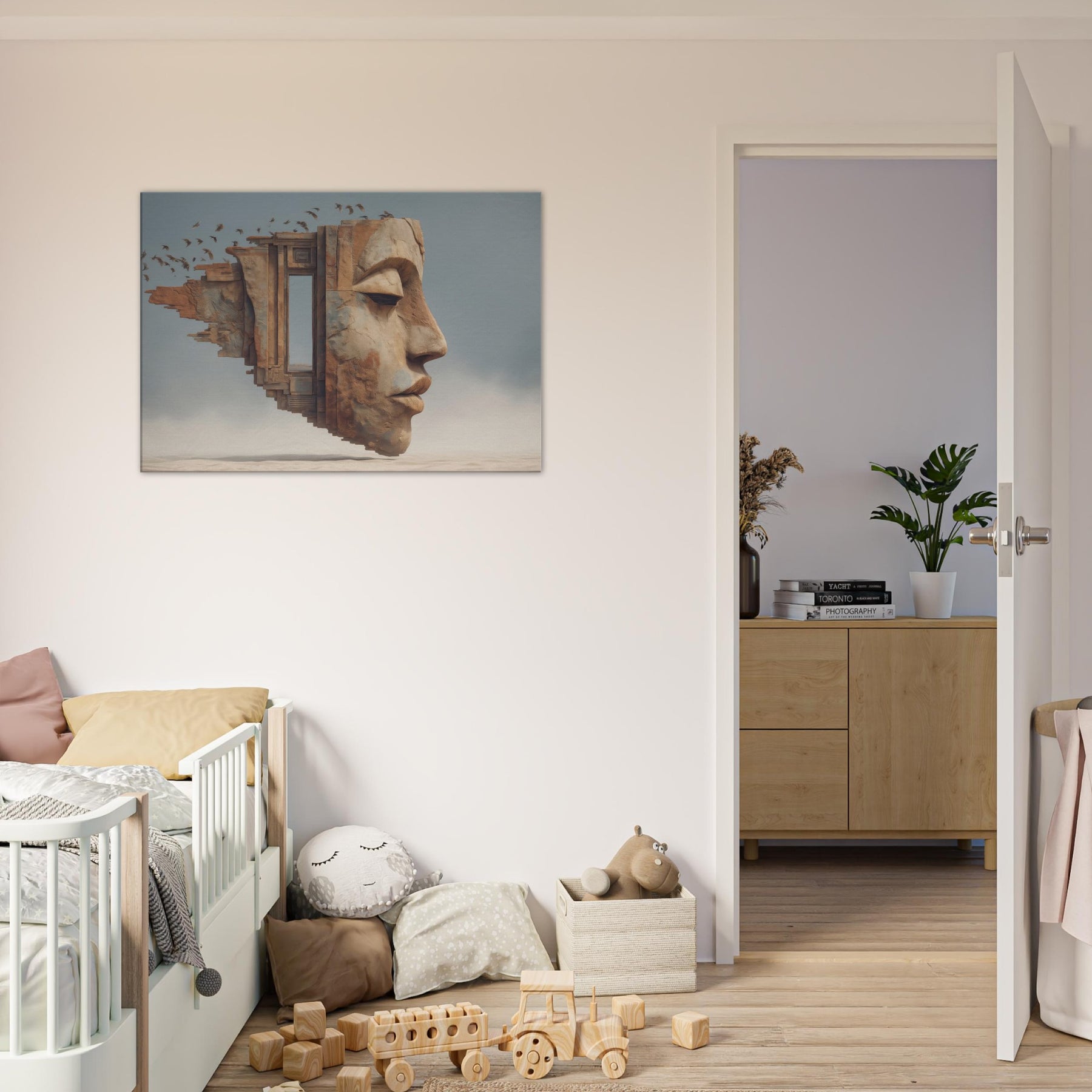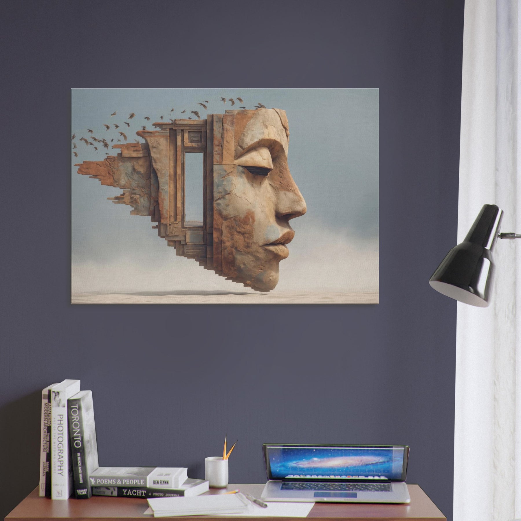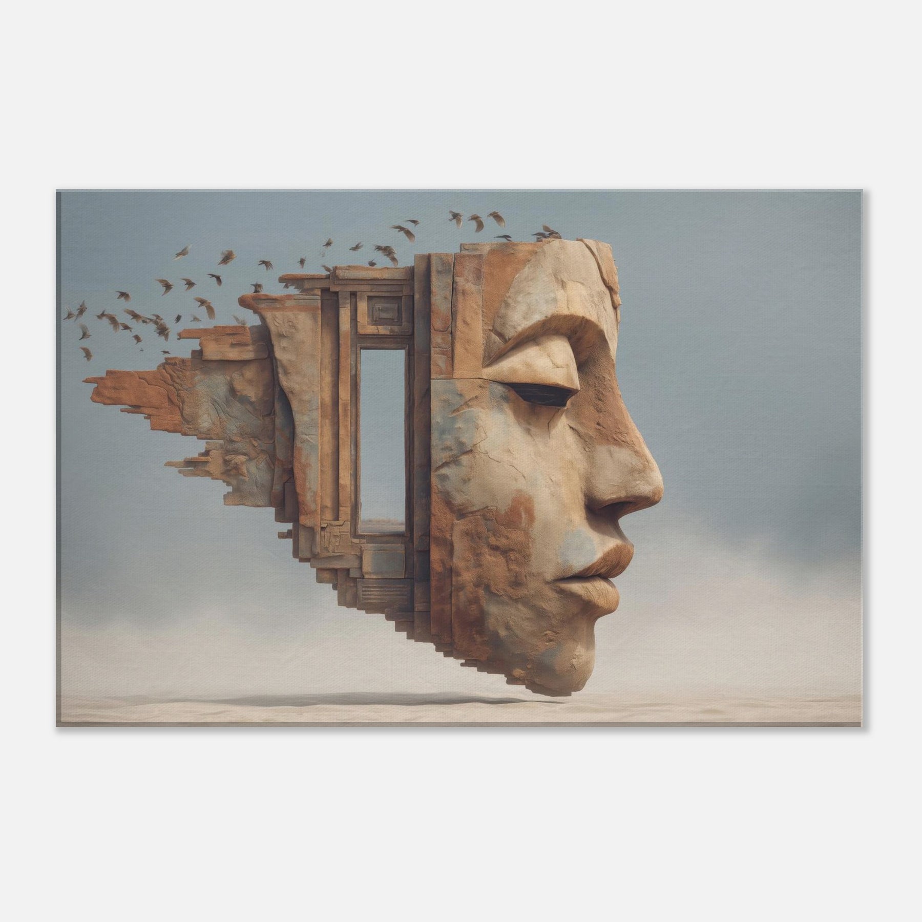 Tribal Mask rises from a dream stitched architecture, its carved profile softened by wind and time. The surreal composition folds architecture, face, and memory into one breathing surface, where a doorway becomes a gaze and the horizon becomes skin. The piece radiates warm ochres and cool blues, casting a intimate glow that makes a living space feel like a sanctuary. Place it above a sofa or in a hallway to invite contemplation, conversation, and a slow, artful drift between dream and daily life.