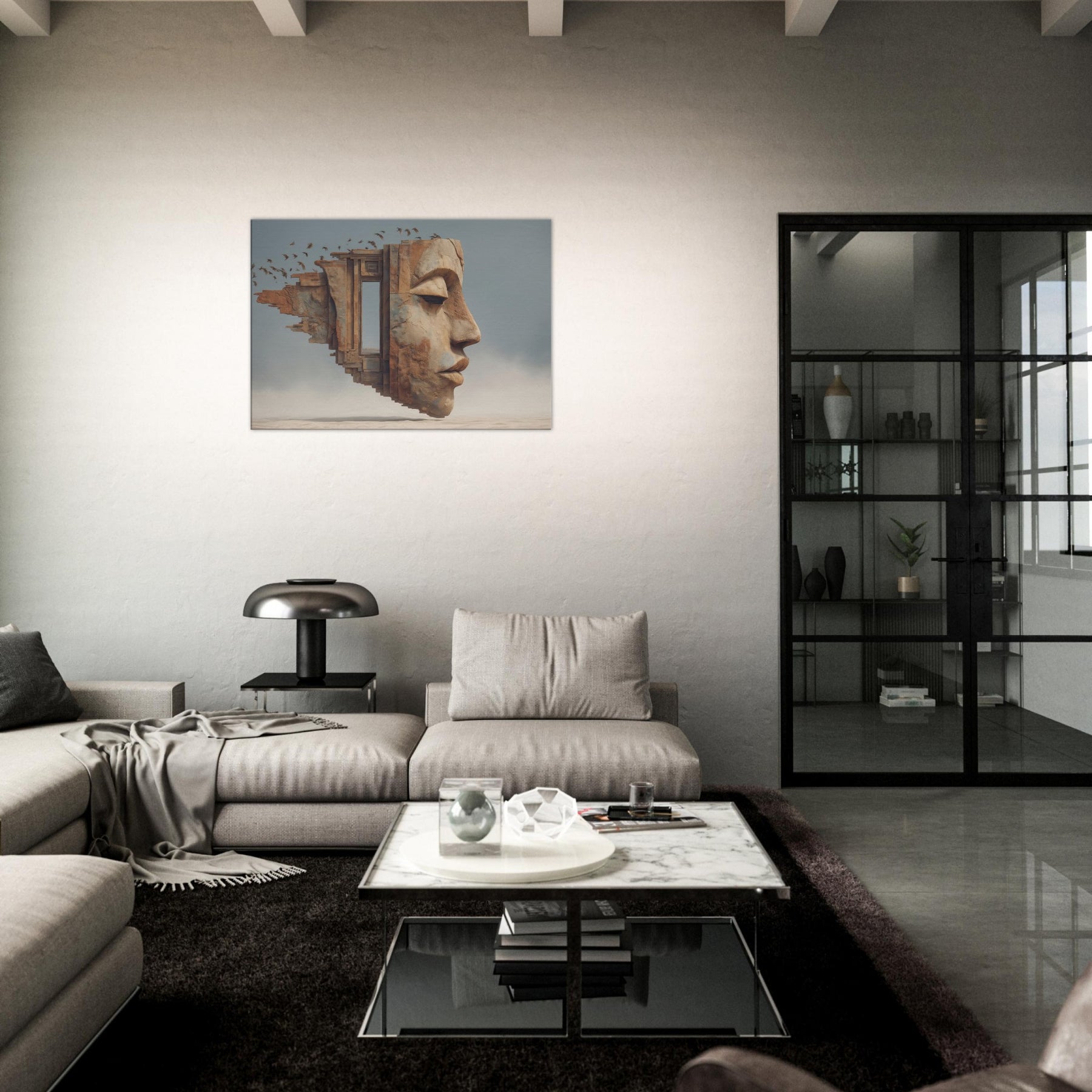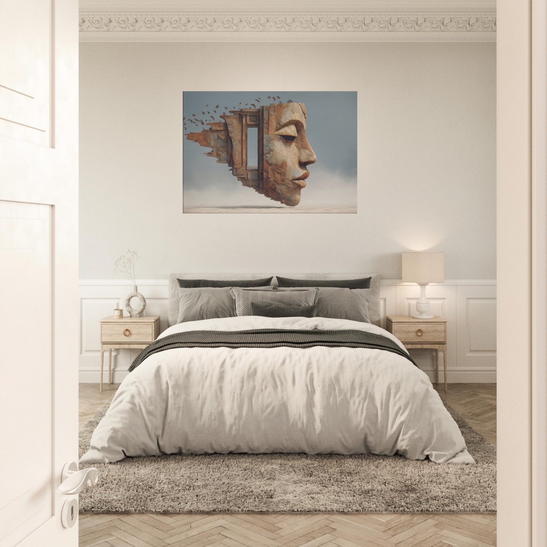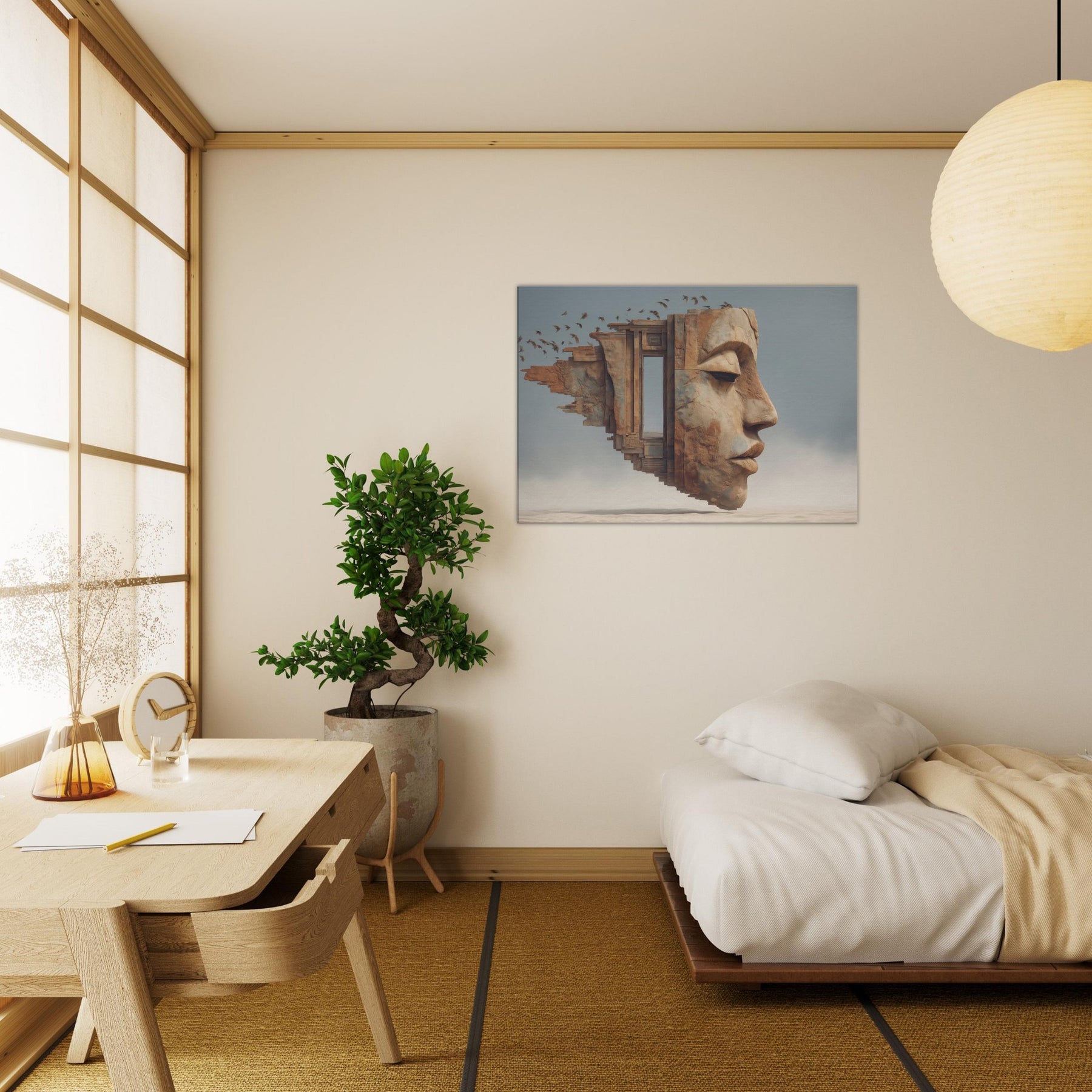 Tribal Mask rises from a dream stitched architecture, its carved profile softened by wind and time. The surreal composition folds architecture, face, and memory into one breathing surface, where a doorway becomes a gaze and the horizon becomes skin. The piece radiates warm ochres and cool blues, casting a intimate glow that makes a living space feel like a sanctuary. Place it above a sofa or in a hallway to invite contemplation, conversation, and a slow, artful drift between dream and daily life.