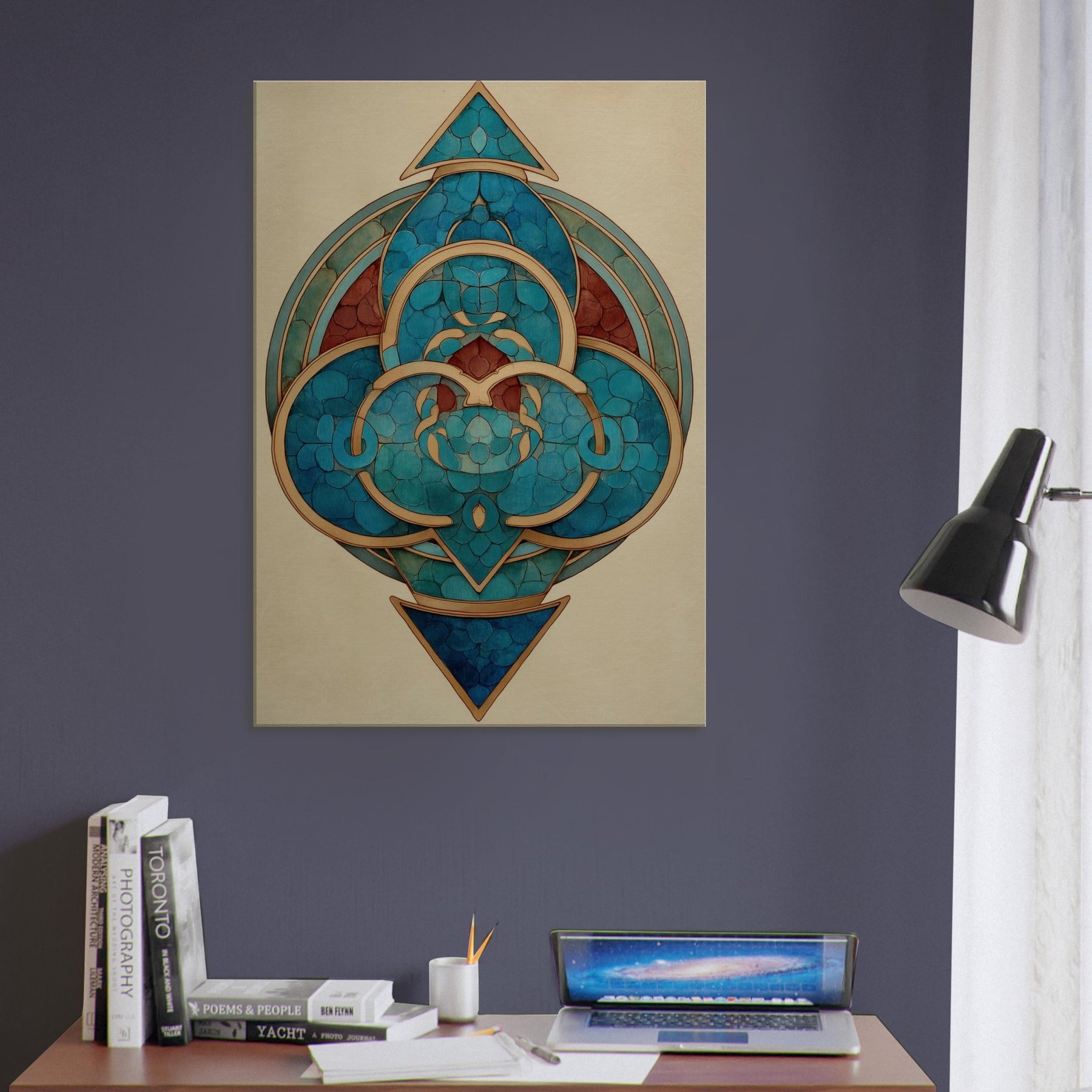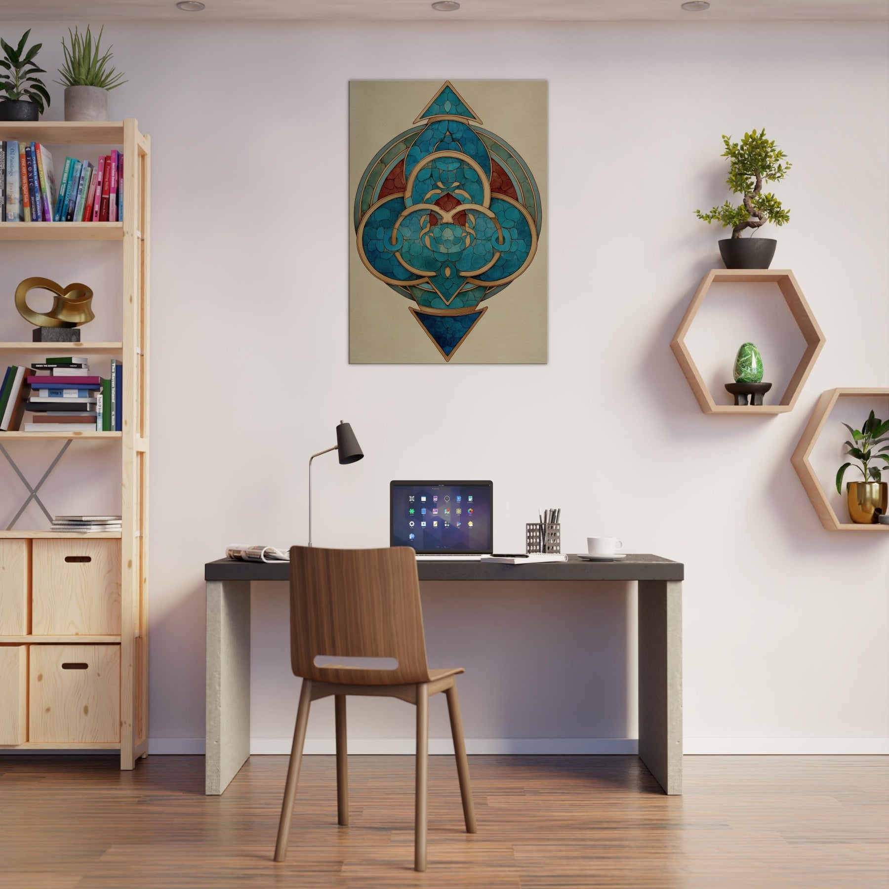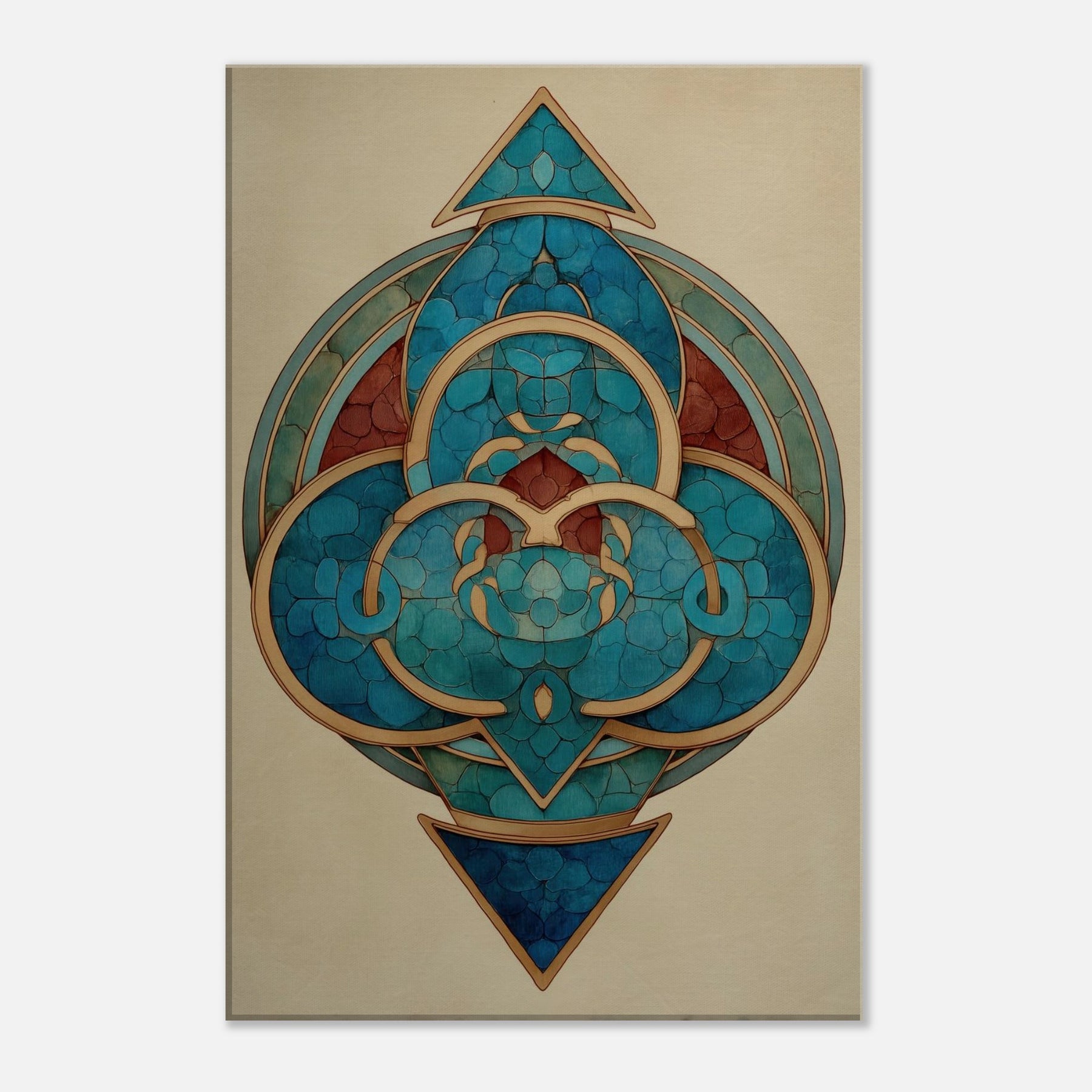 Step into a dreamlike circle of modern mysticism. This Triskelion centerpiece spirals with teal and cobalt arcs, kissed by warm gold lines that trace a ritual rhythm around a hidden core. The Surrealist geometry hums with quiet energy, inviting the eye to travel the layered rings and polyhedral facets. In a living room, it transforms walls into a night sky temple calm, mysterious, and endlessly evolving where light catches the metallic edges and echoes of distant tides shimmer in quiet breaths of color.