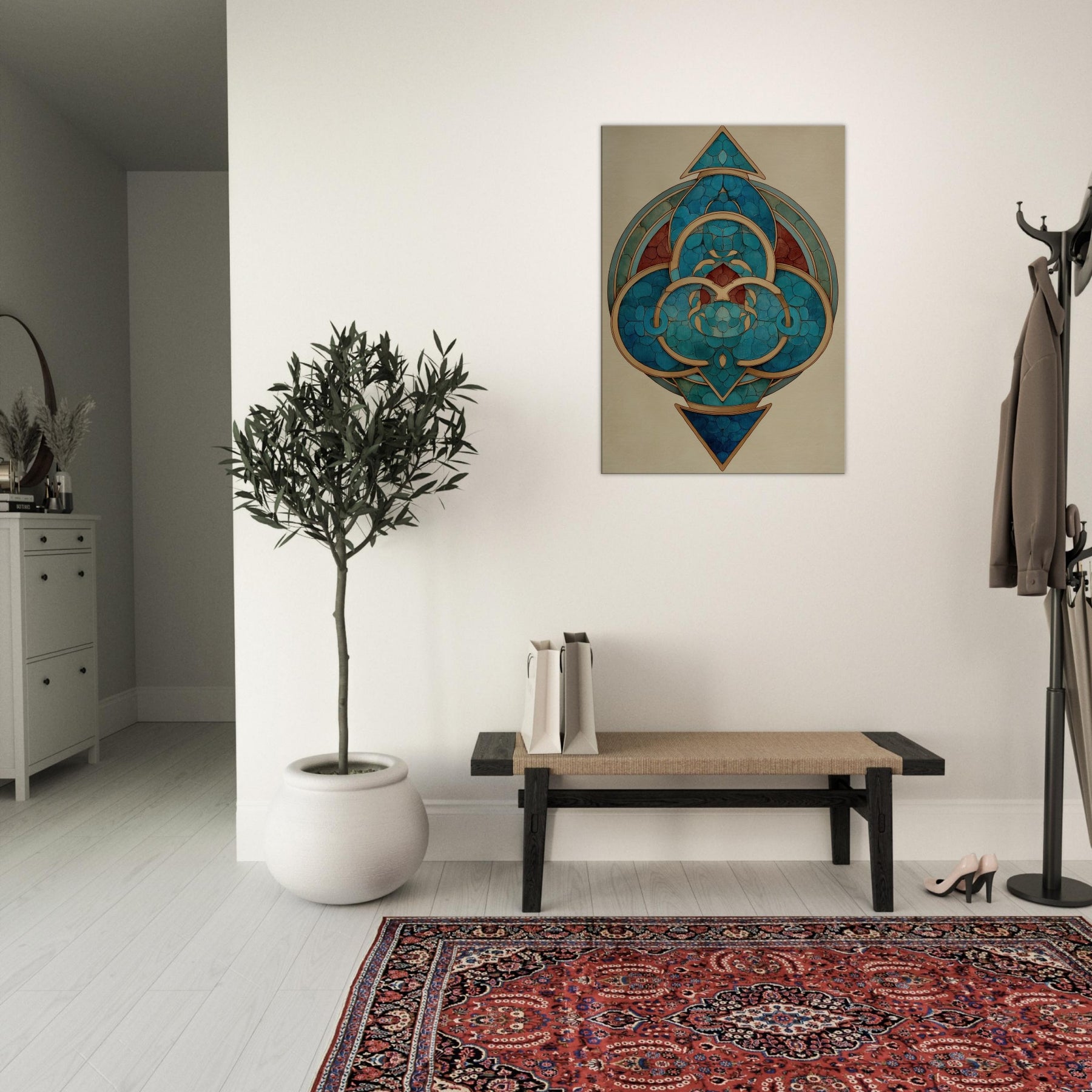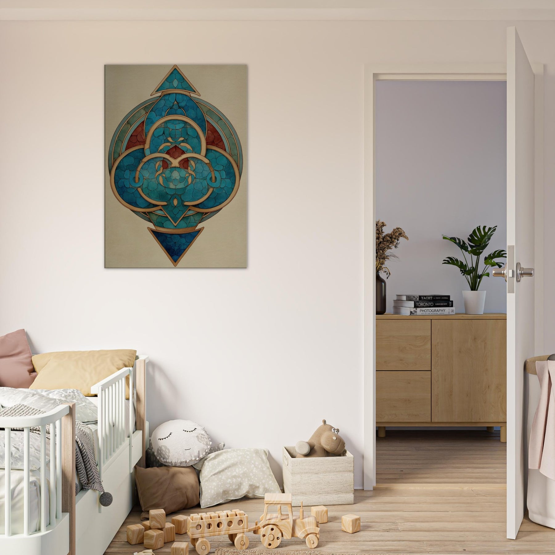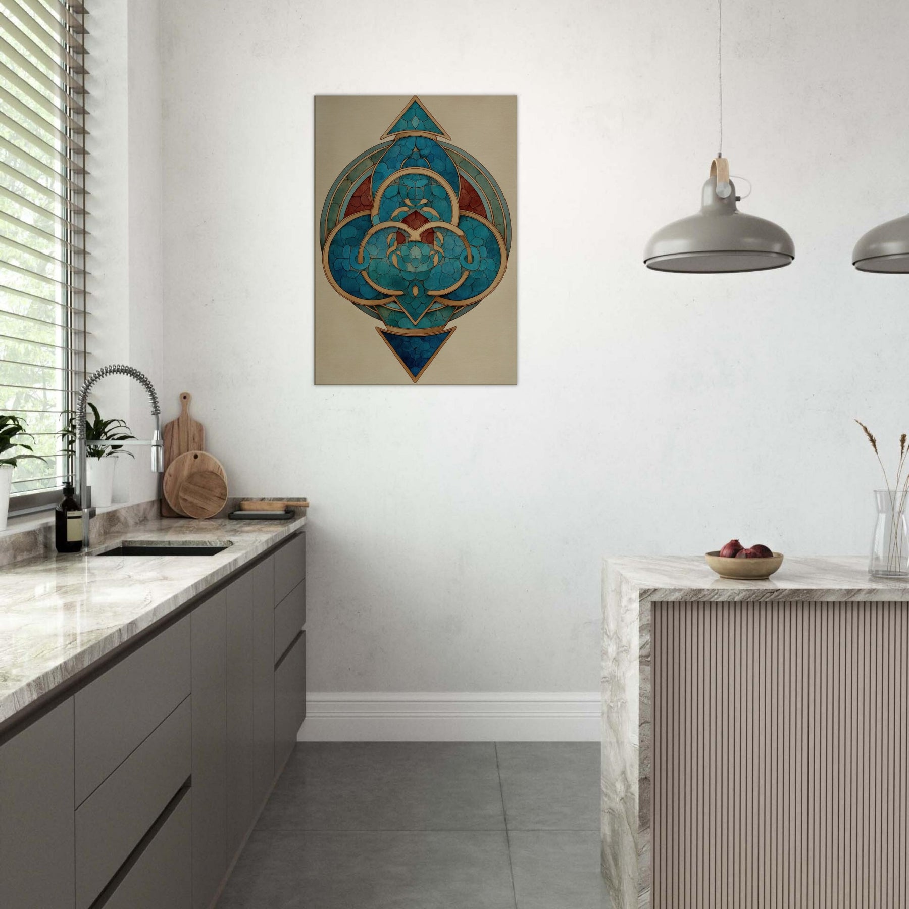 Step into a dreamlike circle of modern mysticism. This Triskelion centerpiece spirals with teal and cobalt arcs, kissed by warm gold lines that trace a ritual rhythm around a hidden core. The Surrealist geometry hums with quiet energy, inviting the eye to travel the layered rings and polyhedral facets. In a living room, it transforms walls into a night sky temple calm, mysterious, and endlessly evolving where light catches the metallic edges and echoes of distant tides shimmer in quiet breaths of color.