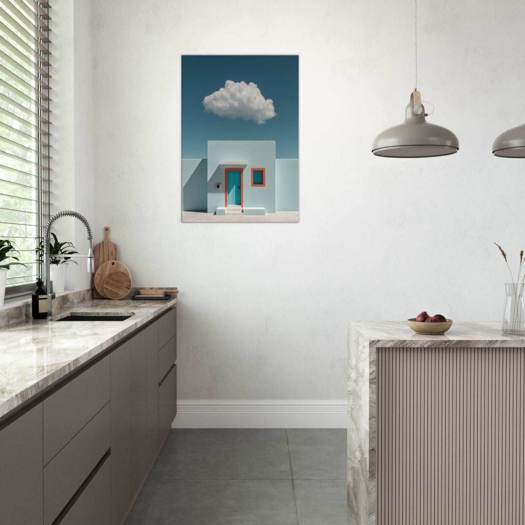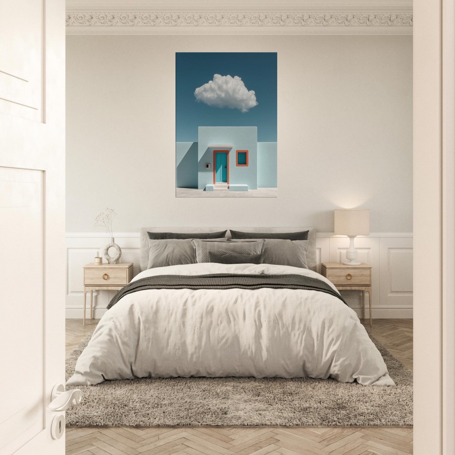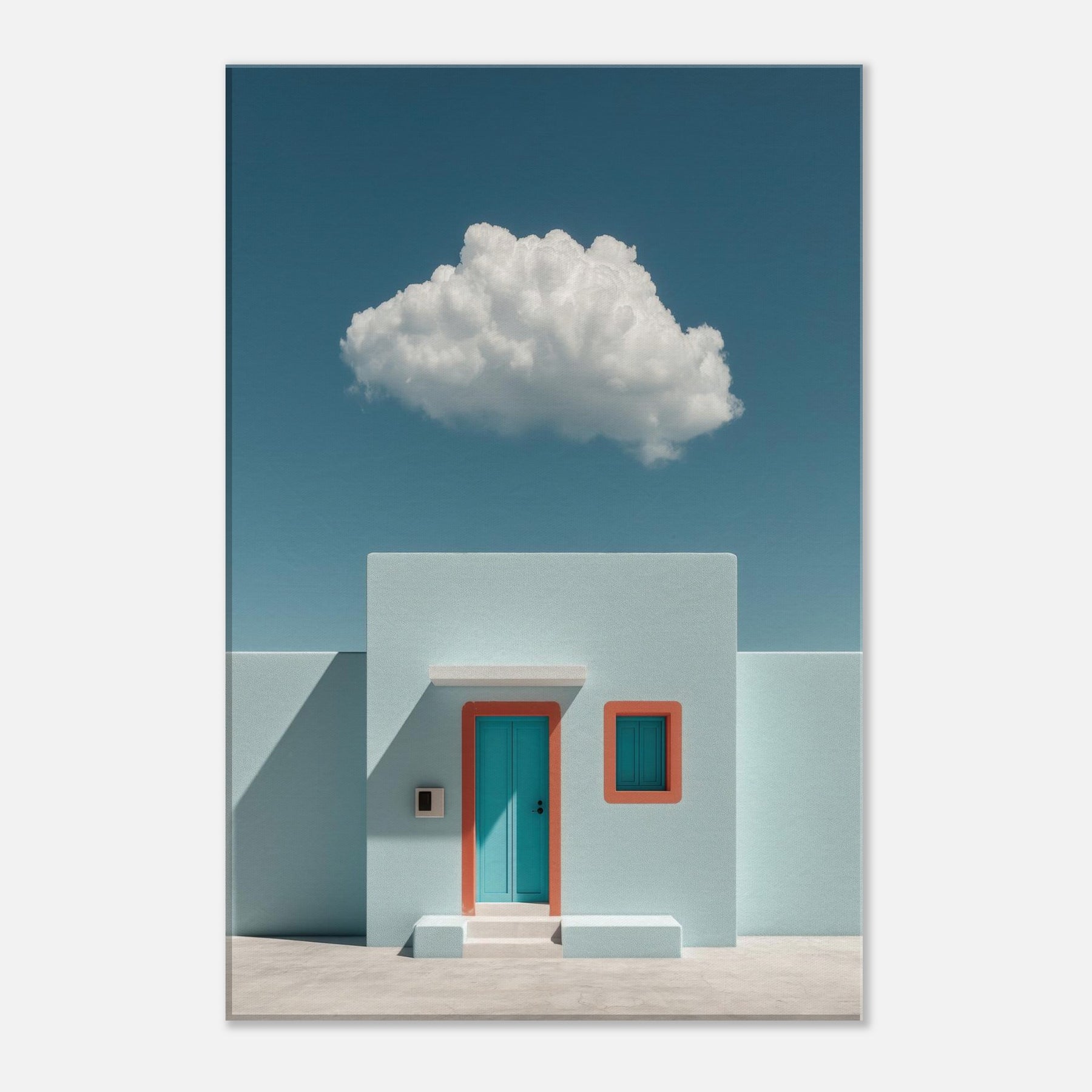 Santorini rises in a dream of pale turquoise and precise geometry. This surreal composition pairs a sun washed facade with a single teal door and coral trim, suspended beneath a soft, floating cloud. The result is a tranquil, otherworldly mood that invites slower breaths and longer glances. Perfect for a living room or foyer, it turns walls into a horizon where architecture and imagination meet, making spaces feel brighter, cooler, and unmistakably refined.
