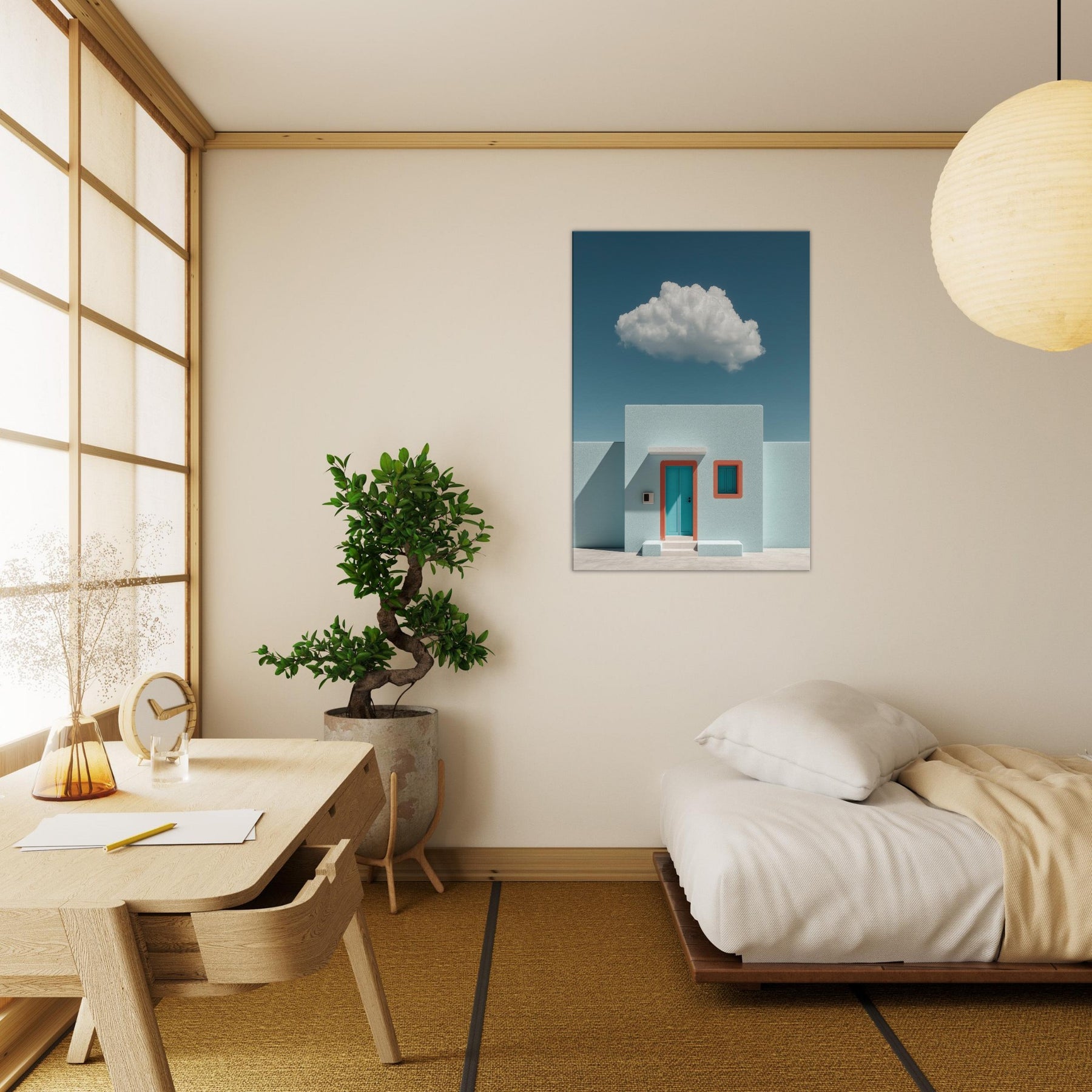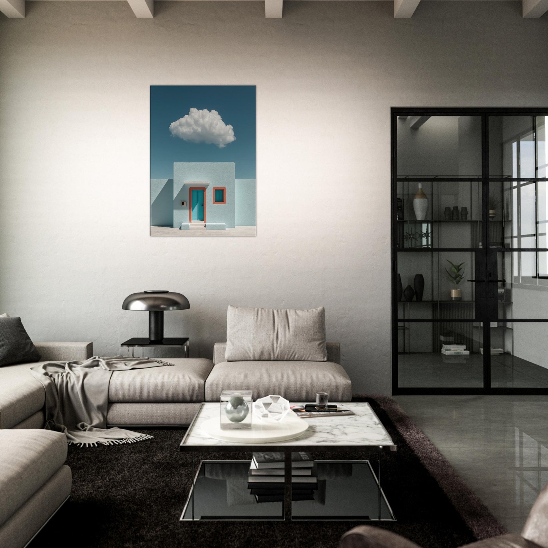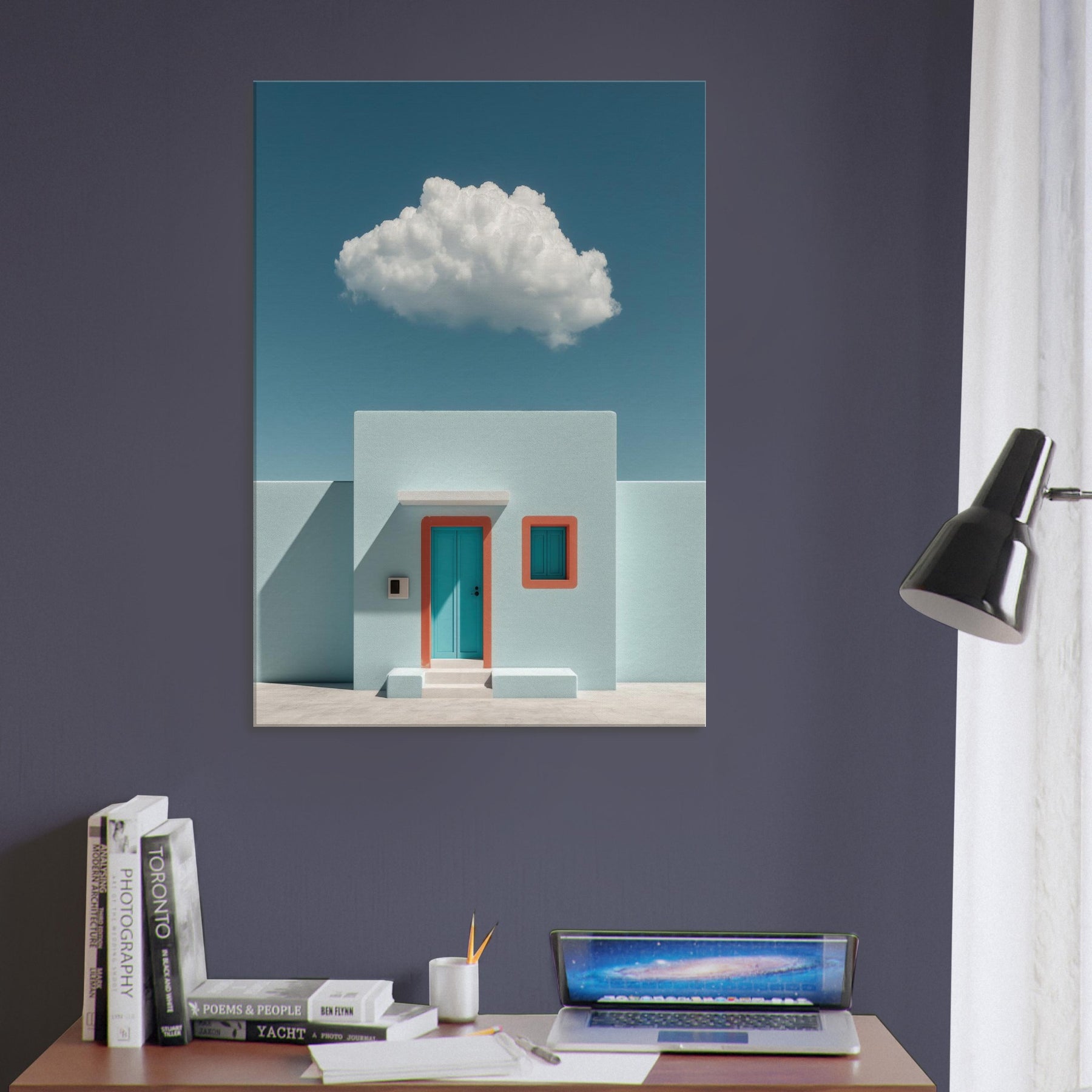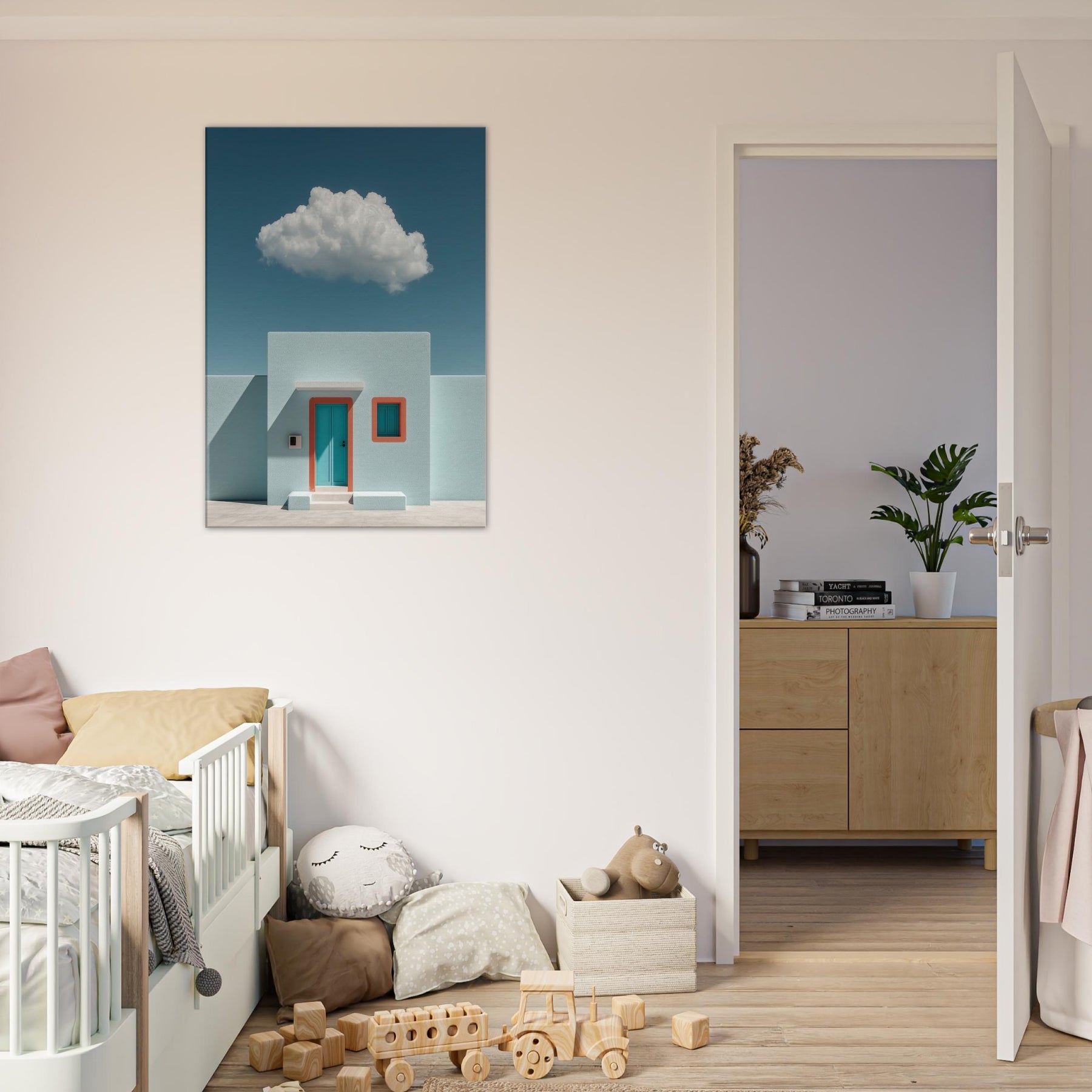 Santorini rises in a dream of pale turquoise and precise geometry. This surreal composition pairs a sun washed facade with a single teal door and coral trim, suspended beneath a soft, floating cloud. The result is a tranquil, otherworldly mood that invites slower breaths and longer glances. Perfect for a living room or foyer, it turns walls into a horizon where architecture and imagination meet, making spaces feel brighter, cooler, and unmistakably refined.