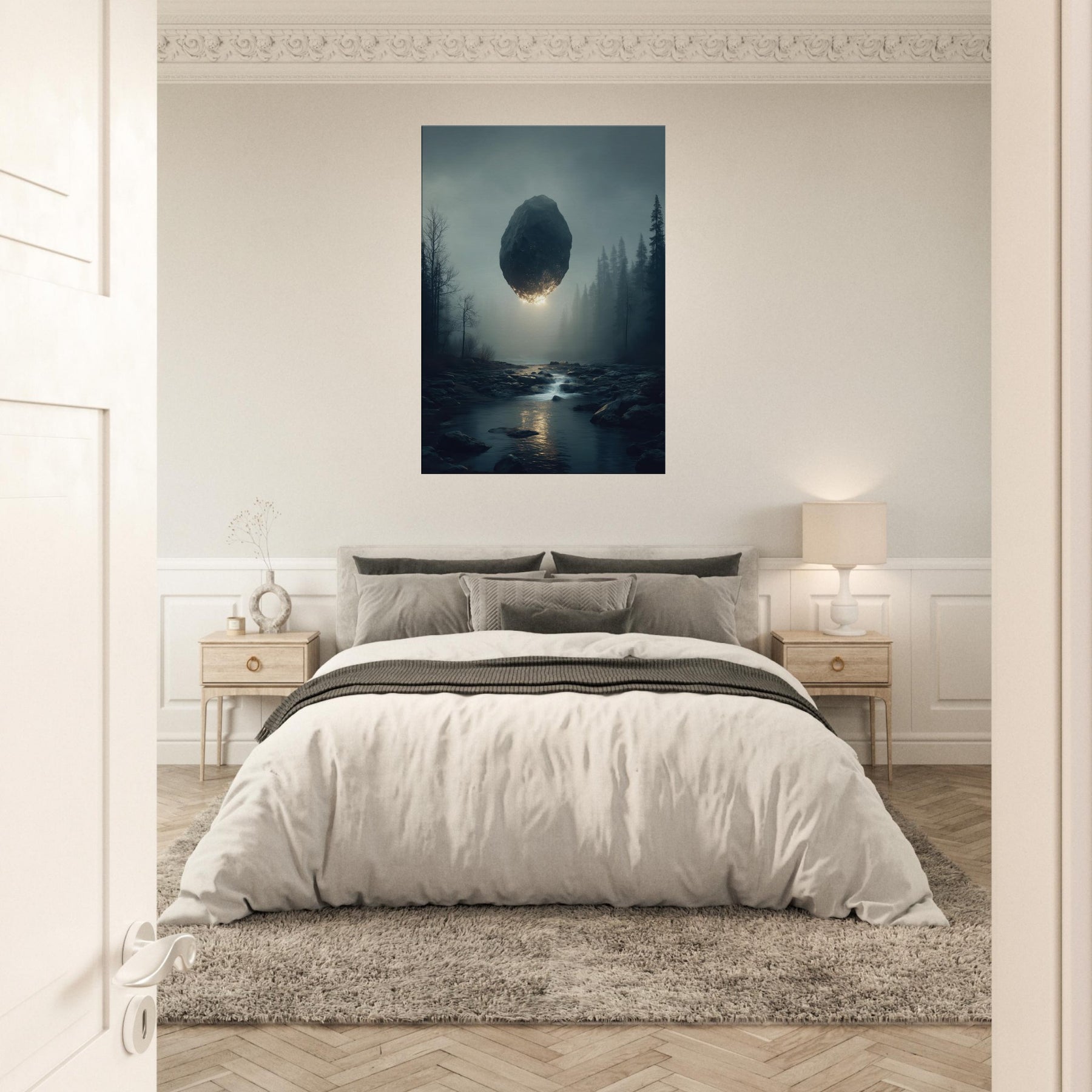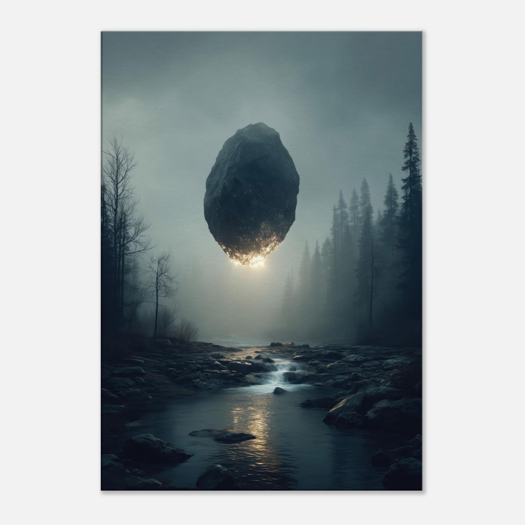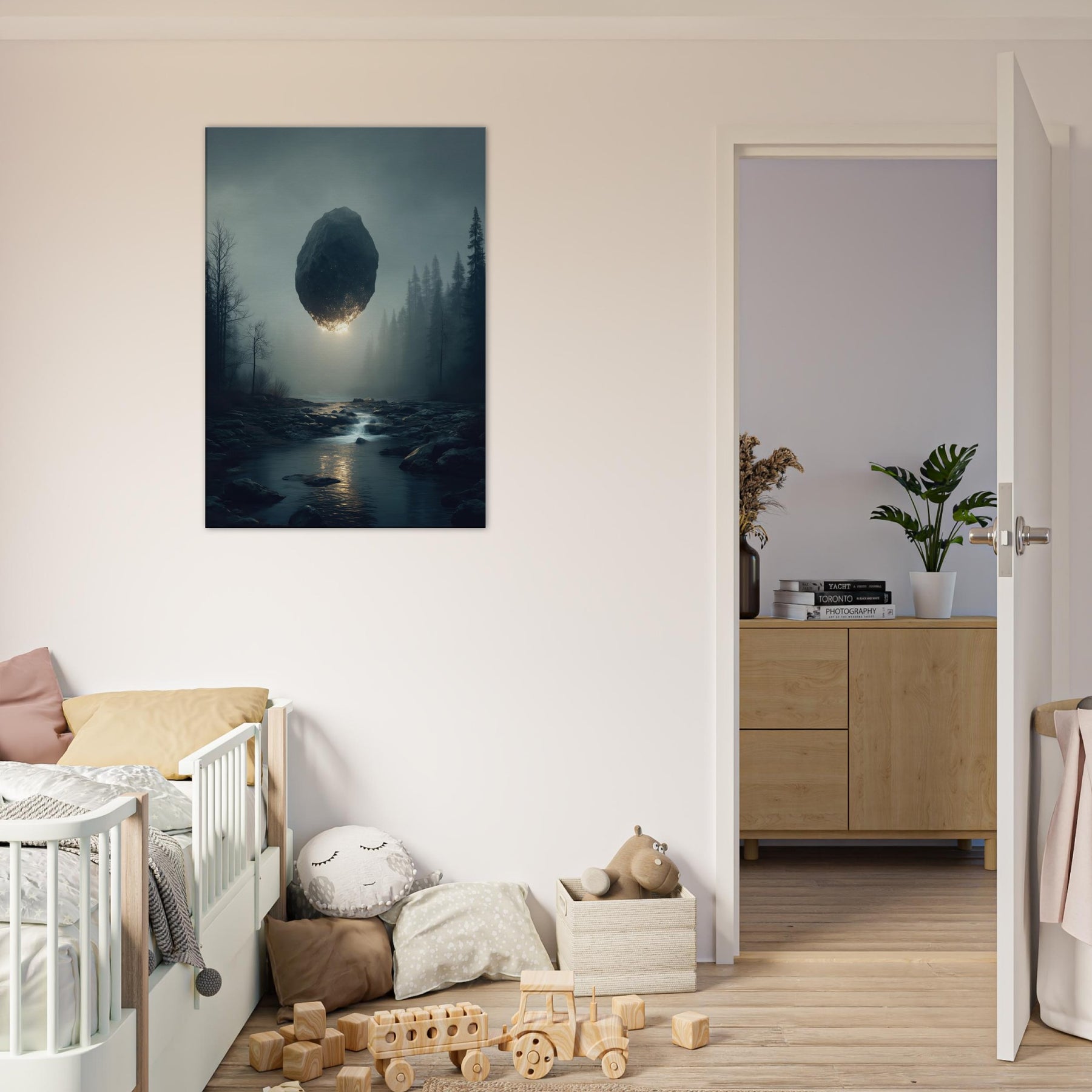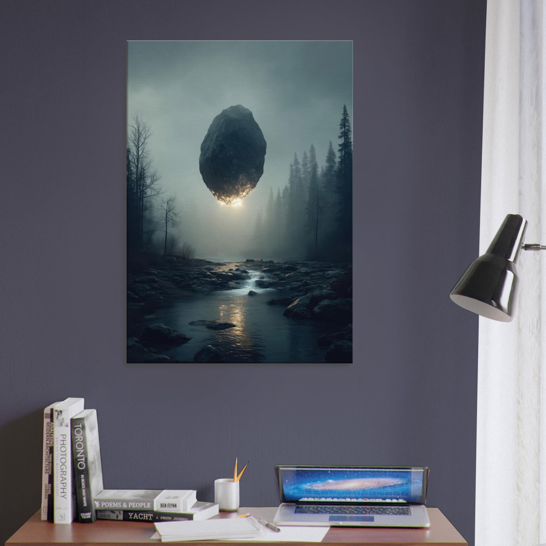 Mystical and quiet, this work conjures a Foggy Forest suspended between dream and dawn. A colossal rock glows from its underside, casting a soft, molten light across rippling water and fog draped pines. The scene invites stillness, whispering of mystery and reverie a focal point that folds nature into a contemplative corner of your room. Hang it where you seek calm accents, a conversation starter, or a portal to imagine journeys beyond the ordinary.
