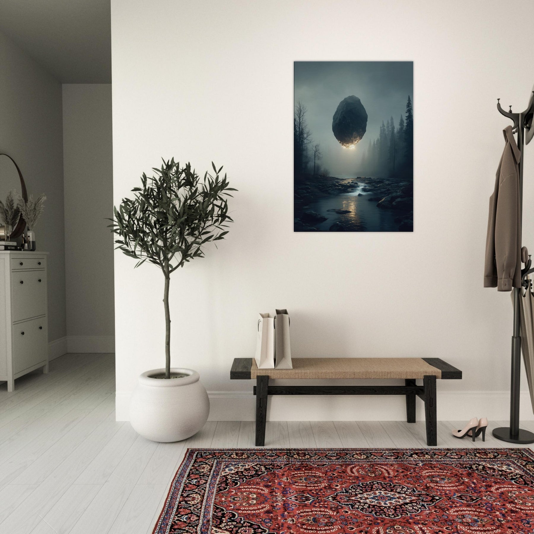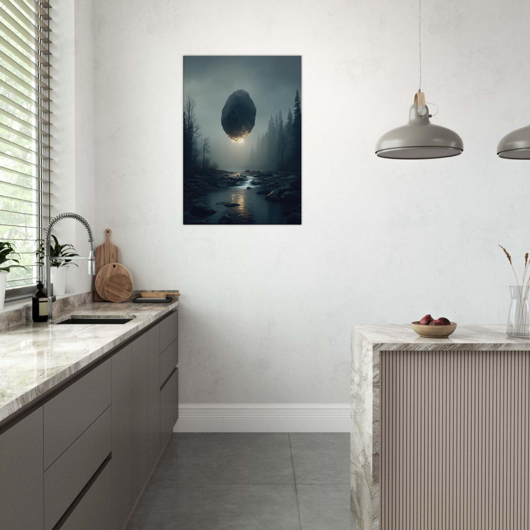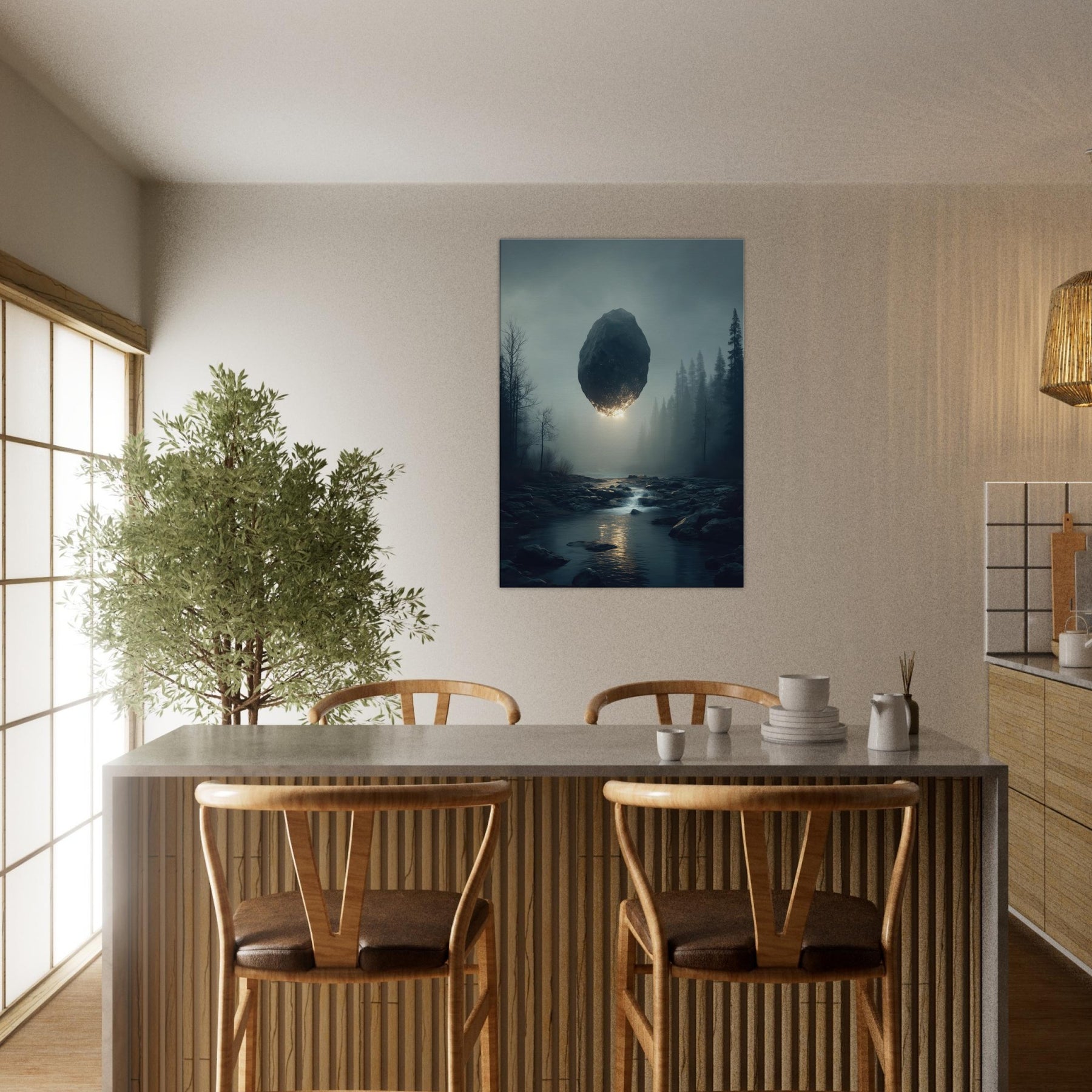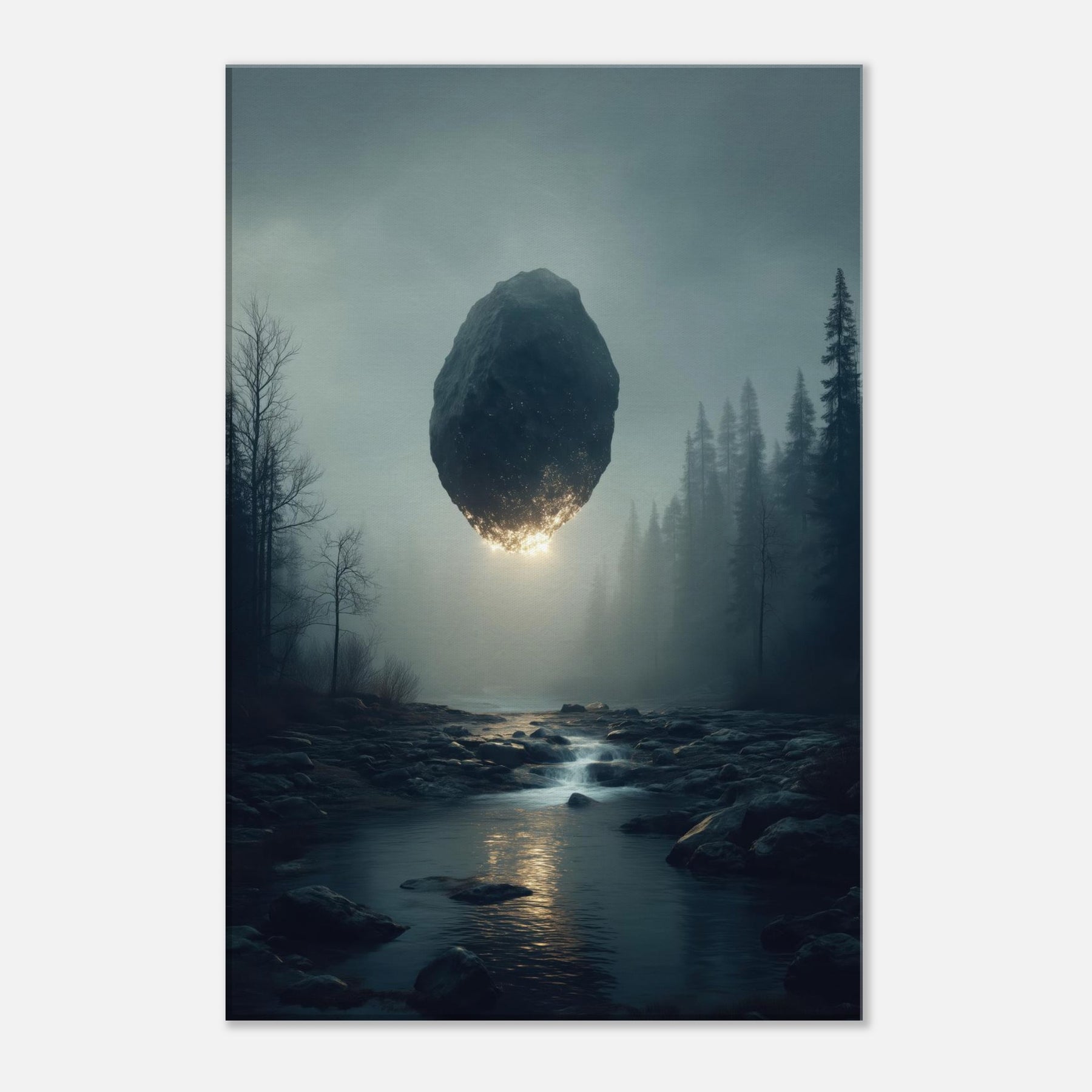 Mystical and quiet, this work conjures a Foggy Forest suspended between dream and dawn. A colossal rock glows from its underside, casting a soft, molten light across rippling water and fog draped pines. The scene invites stillness, whispering of mystery and reverie a focal point that folds nature into a contemplative corner of your room. Hang it where you seek calm accents, a conversation starter, or a portal to imagine journeys beyond the ordinary.