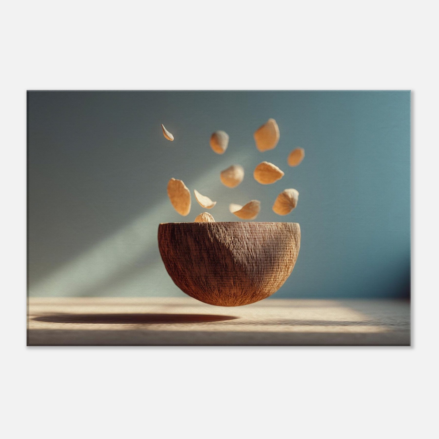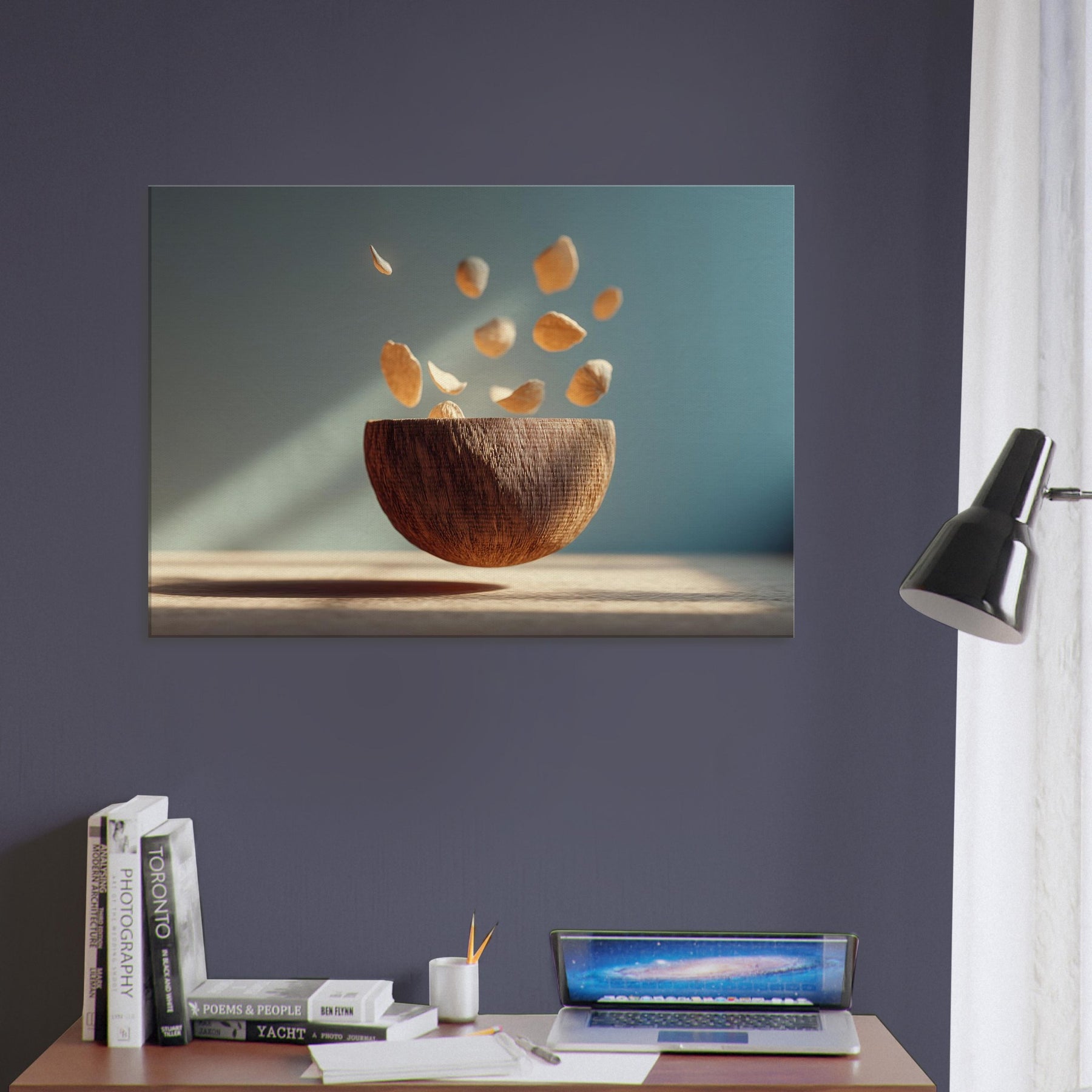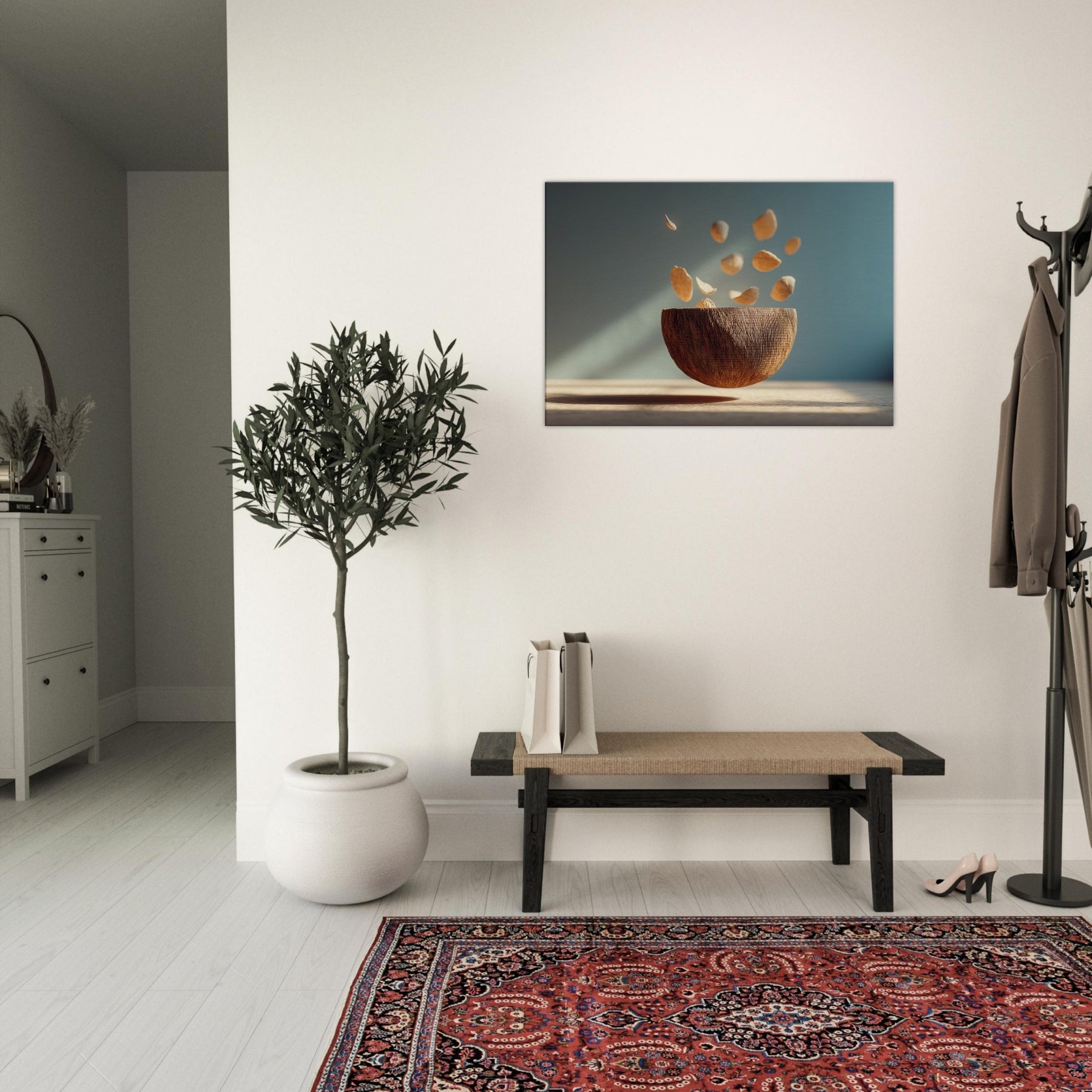 An image tilts the ordinary into dream: a Bamboo Basket hovers weightless, its grain catching light and shadow. Surreal petals drift upward, tracing a soft arc as if released from a forgotten harvest. The atmosphere is intimate and meditative, a gentle reminder that form can float between memory and whim. In a living room, this piece becomes a calm companion warm wood tones, quiet motion, and a doorway to contemplation at dusk or dawn.