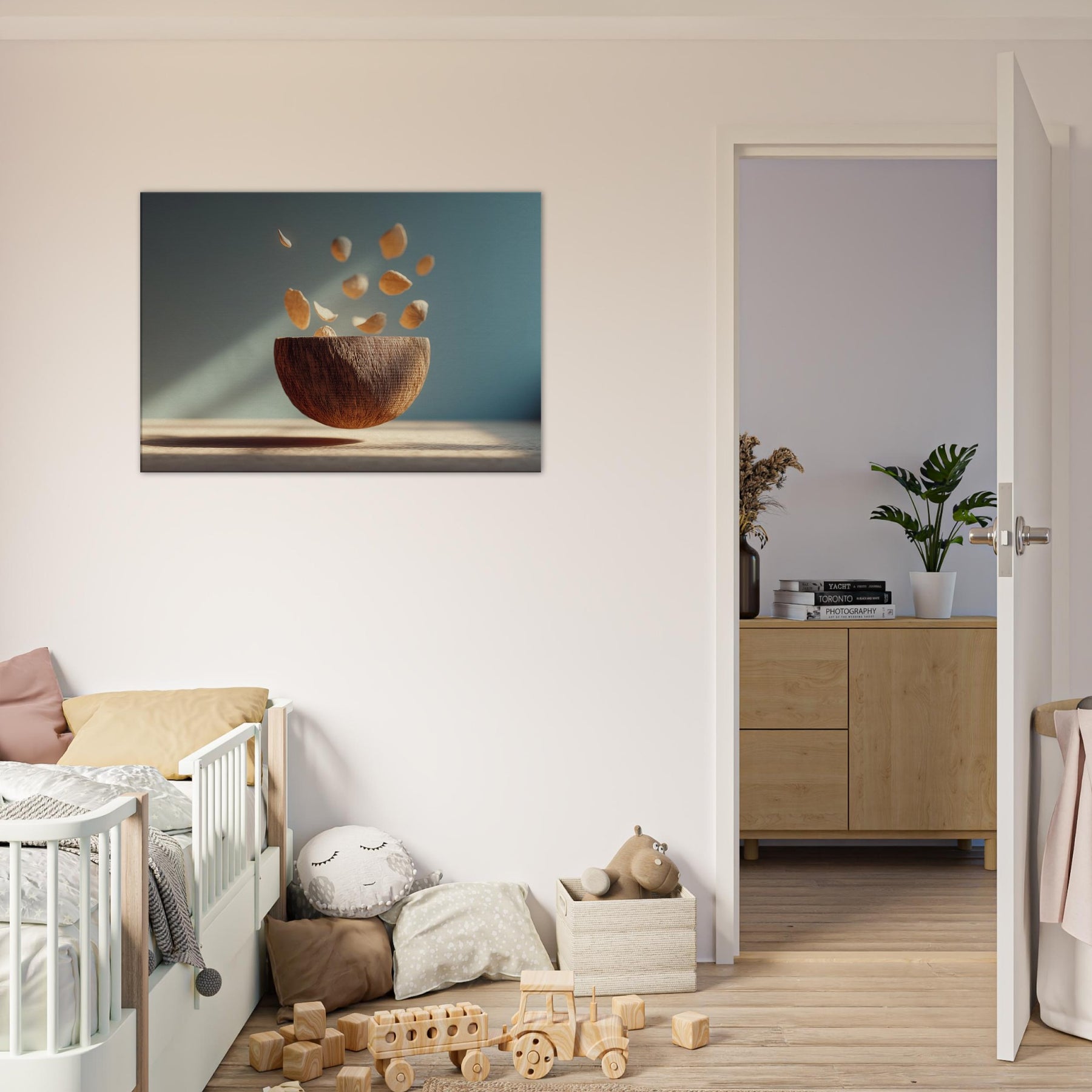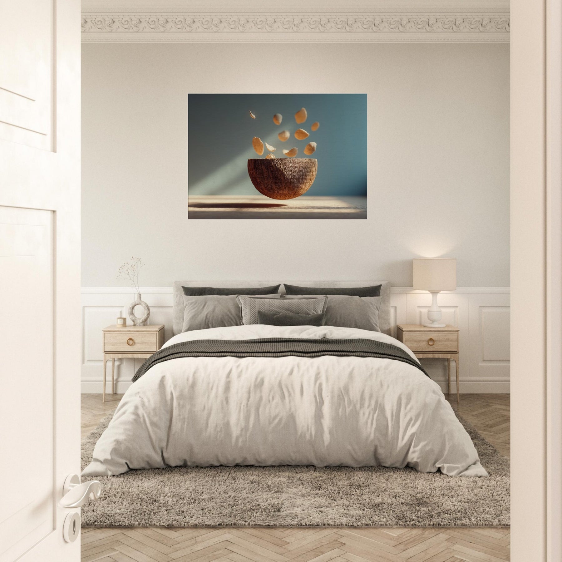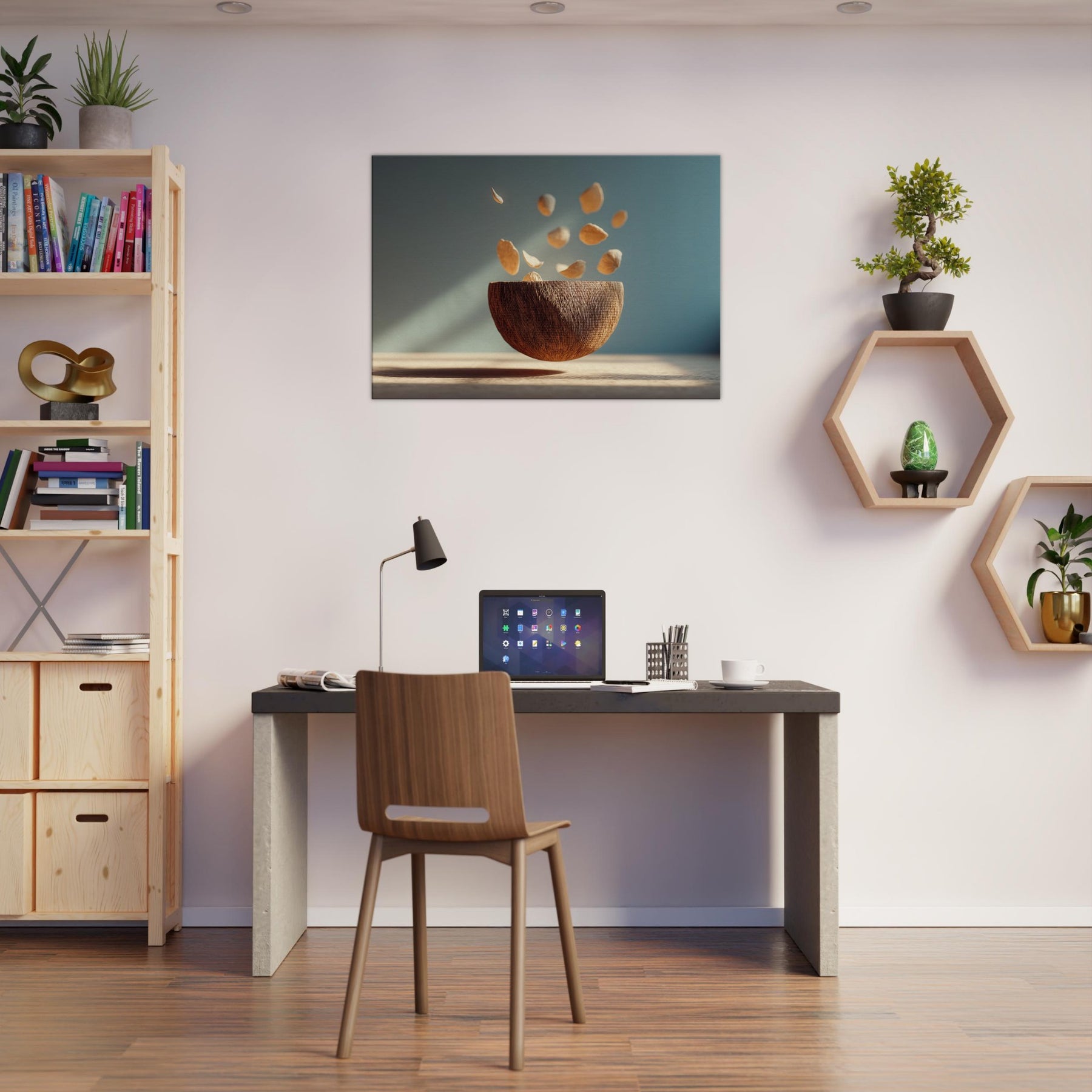 An image tilts the ordinary into dream: a Bamboo Basket hovers weightless, its grain catching light and shadow. Surreal petals drift upward, tracing a soft arc as if released from a forgotten harvest. The atmosphere is intimate and meditative, a gentle reminder that form can float between memory and whim. In a living room, this piece becomes a calm companion warm wood tones, quiet motion, and a doorway to contemplation at dusk or dawn.