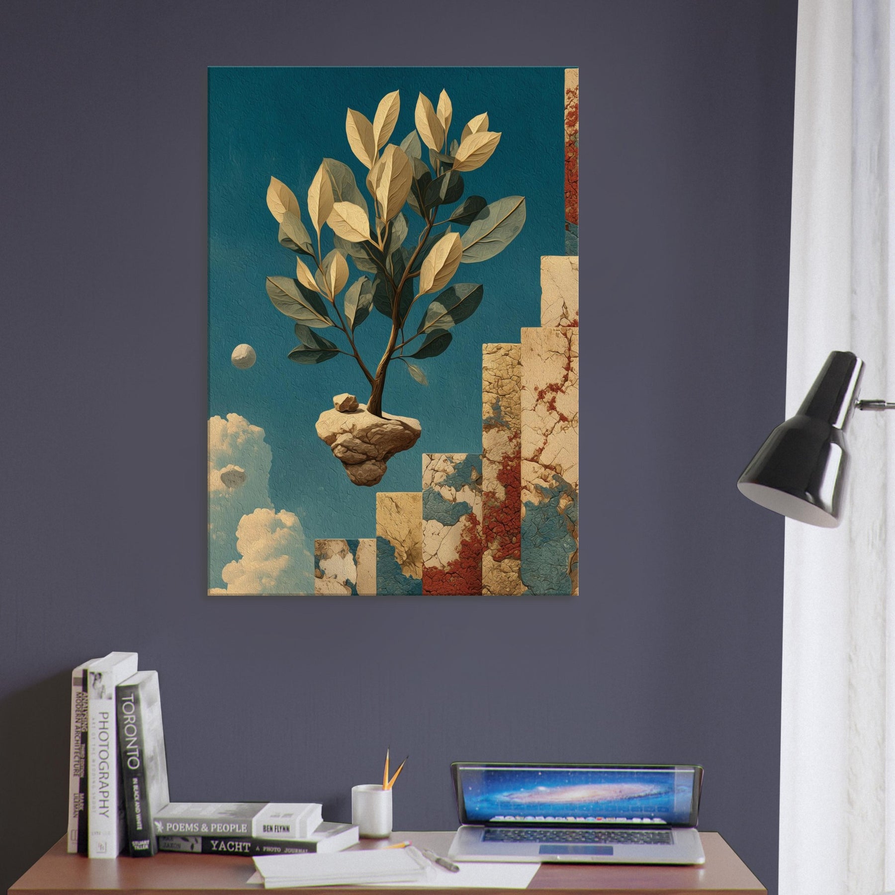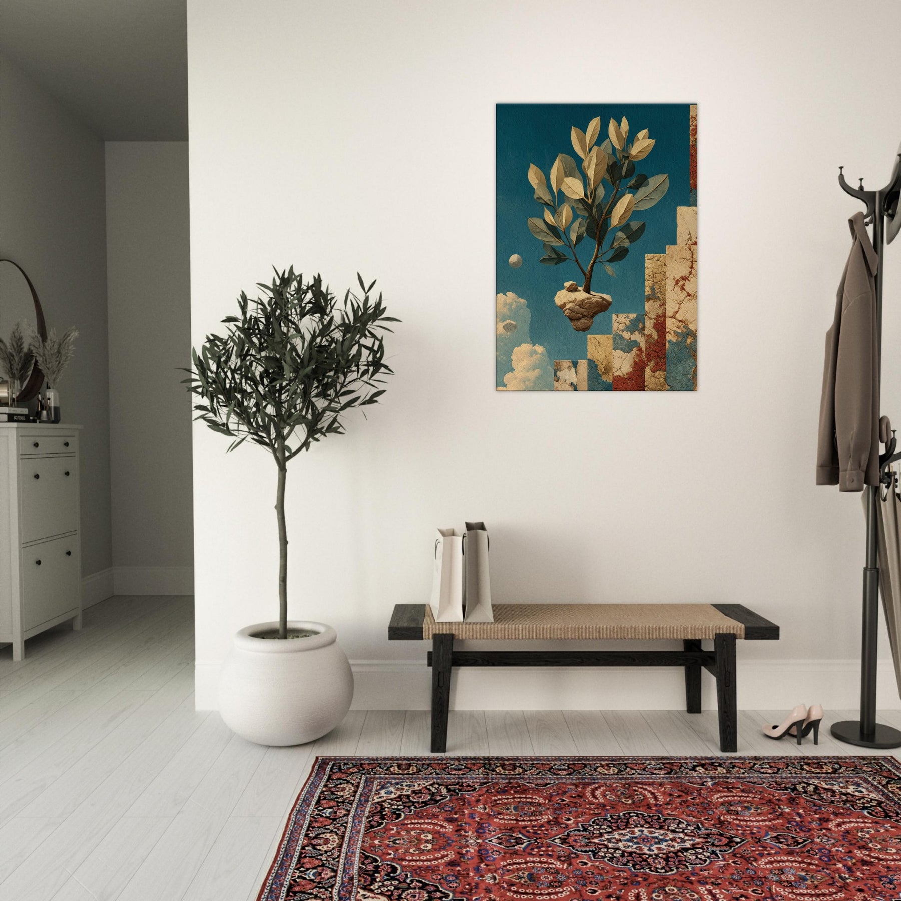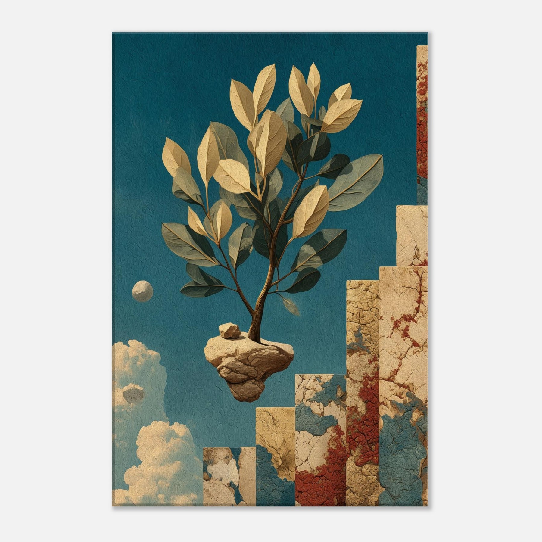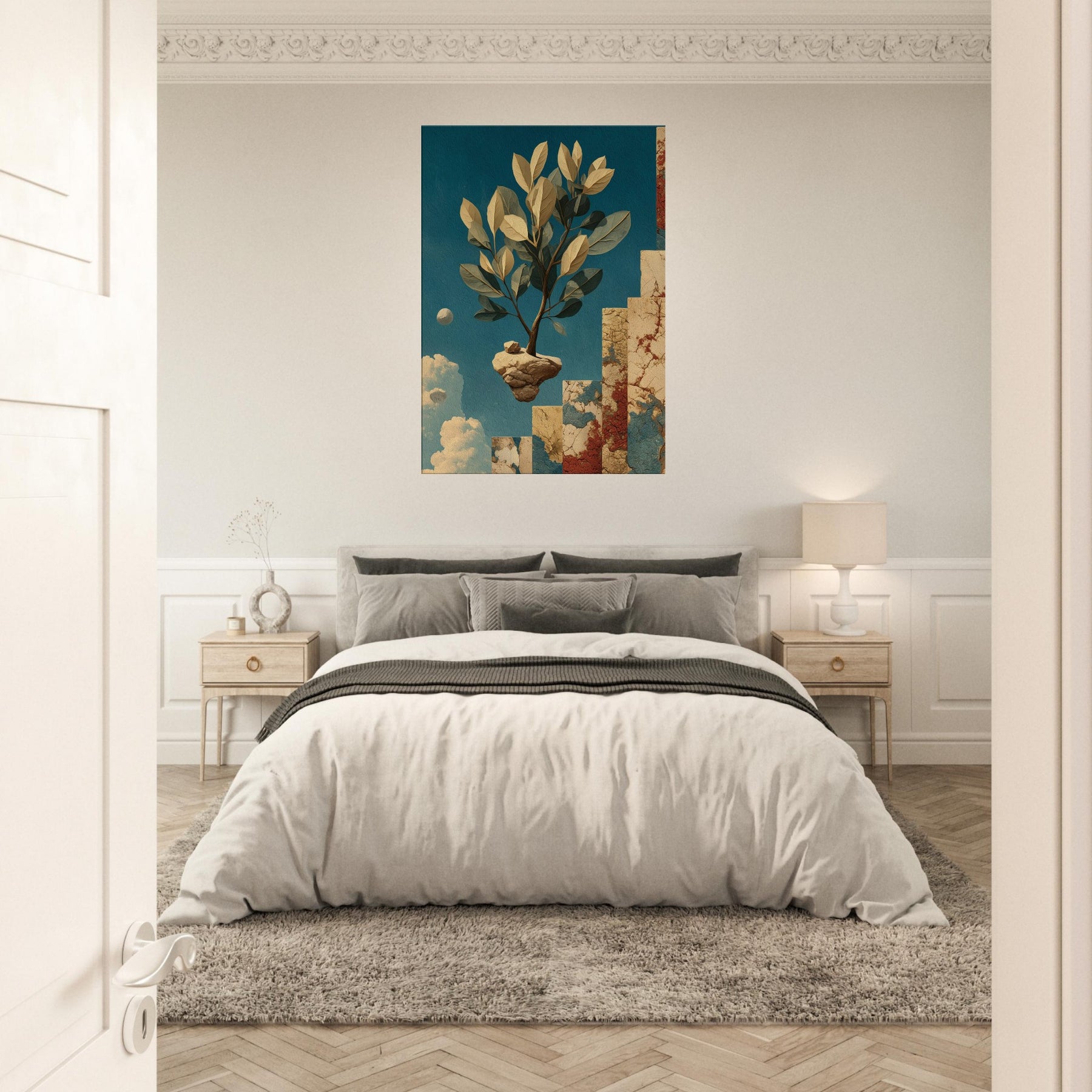 An arresting blend of dream and nature, this piece places an Olive Branch on a drifting island, suspended above pale marble stairs that descend into a tranquil sky. The surreal composition invites a moment of breath and reflection, as leaves catch the light in warm golds and cool greens. Perfect for living rooms or bedrooms, it adds an otherworldly calm, pairing earthy texture with a whisper of ascent like a gentle ode to growth, resilience, and the quiet harmony between land and air.