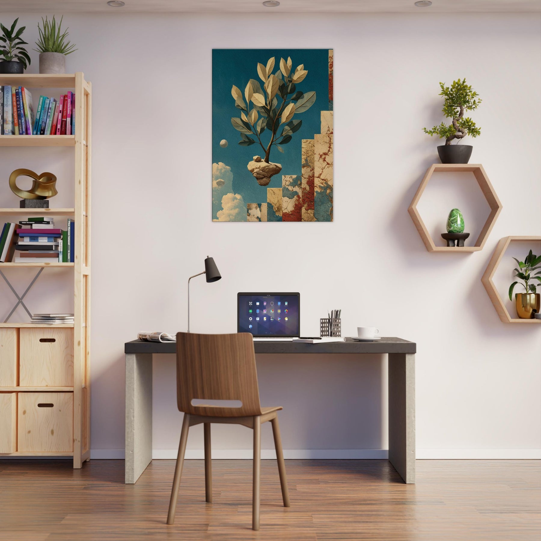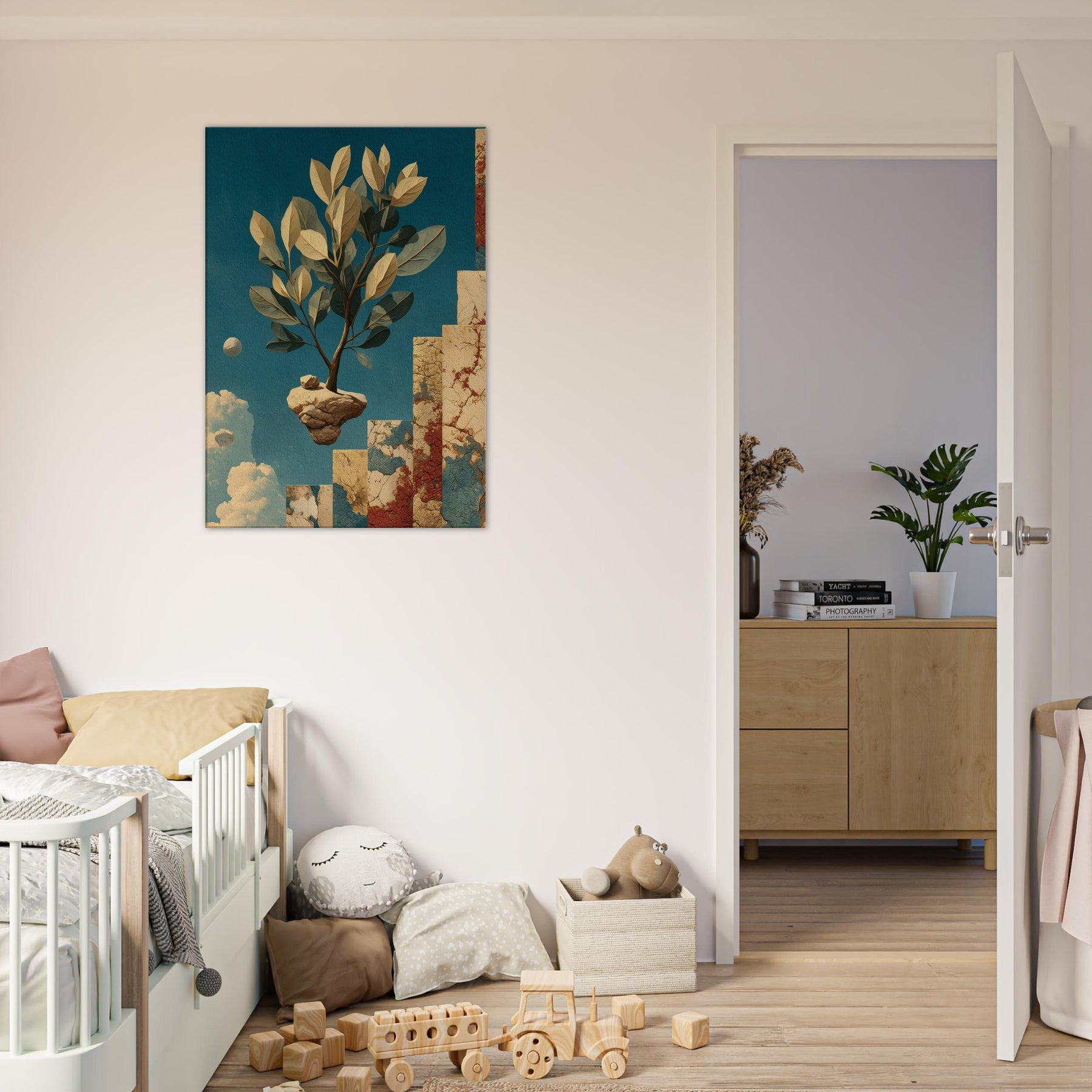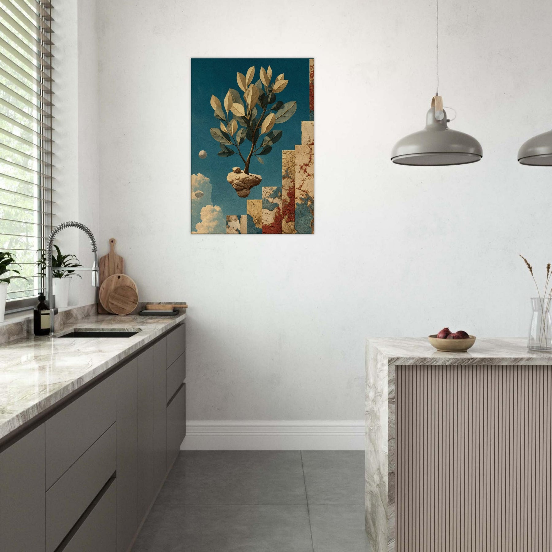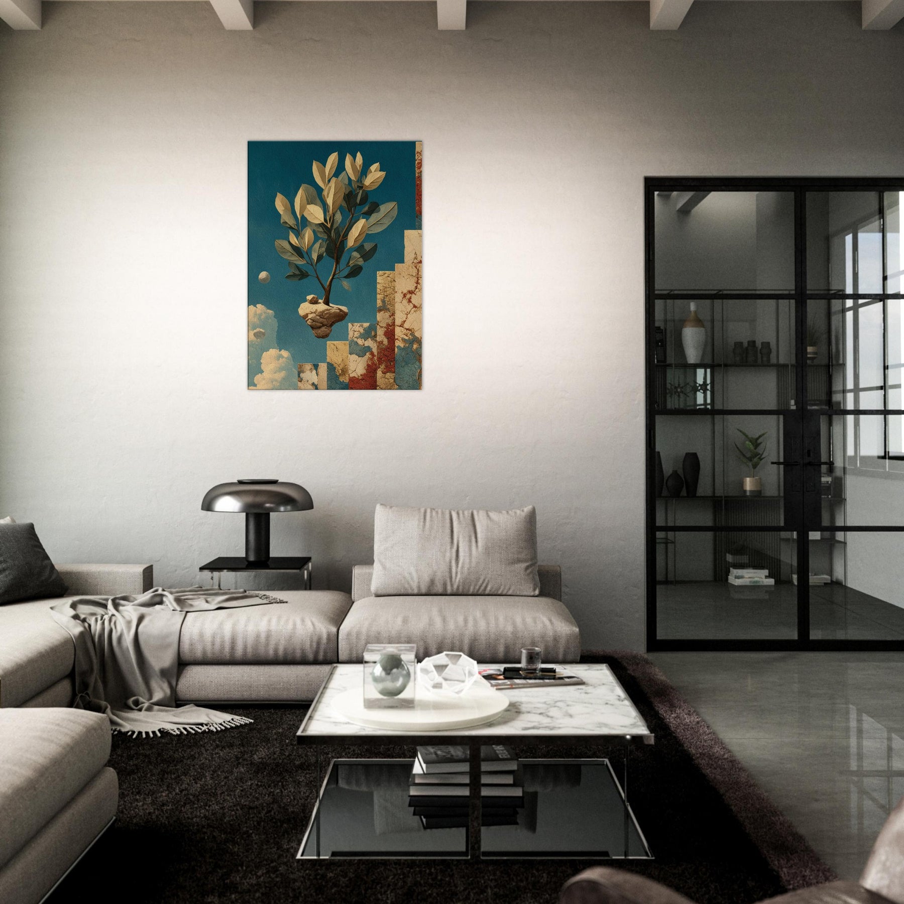 An arresting blend of dream and nature, this piece places an Olive Branch on a drifting island, suspended above pale marble stairs that descend into a tranquil sky. The surreal composition invites a moment of breath and reflection, as leaves catch the light in warm golds and cool greens. Perfect for living rooms or bedrooms, it adds an otherworldly calm, pairing earthy texture with a whisper of ascent like a gentle ode to growth, resilience, and the quiet harmony between land and air.