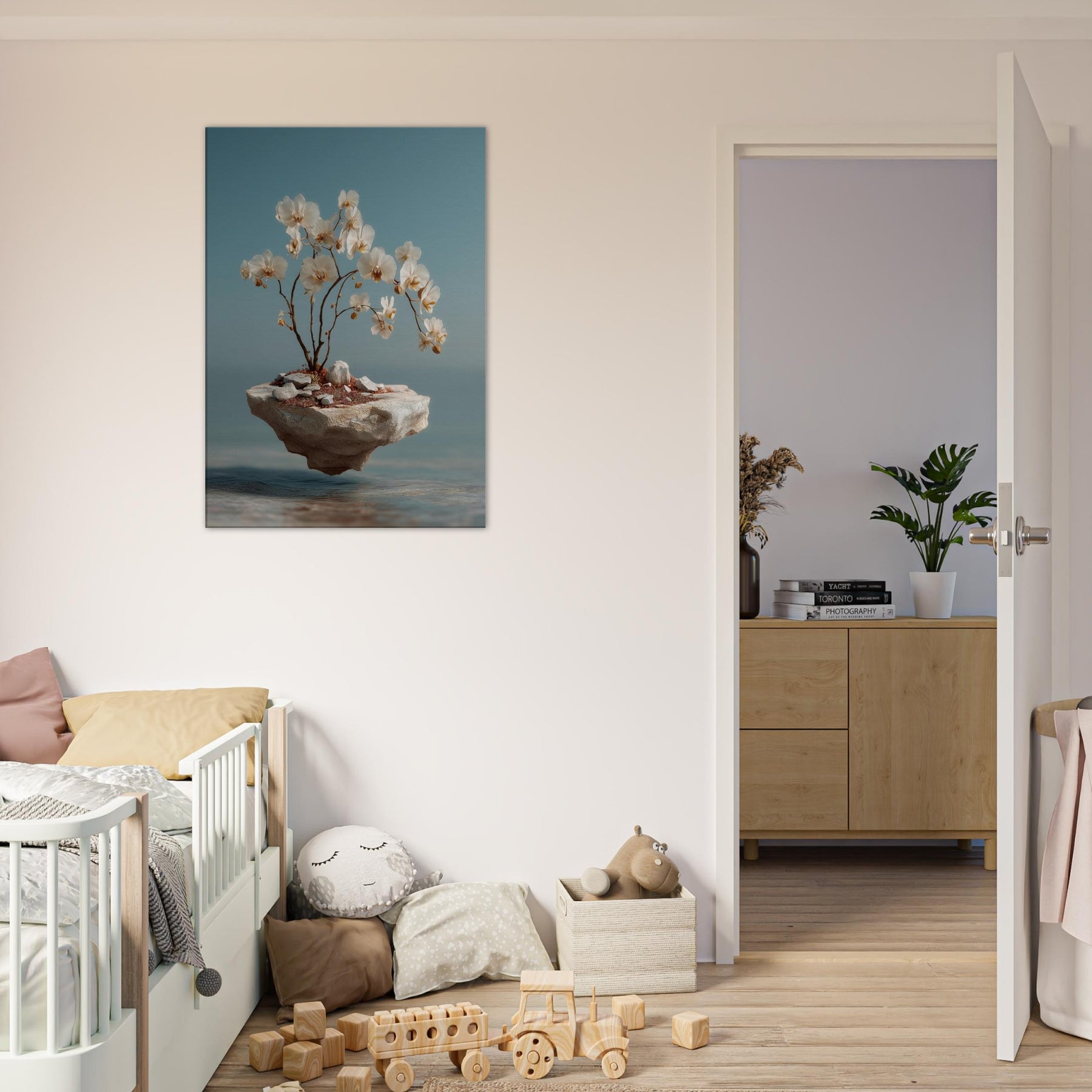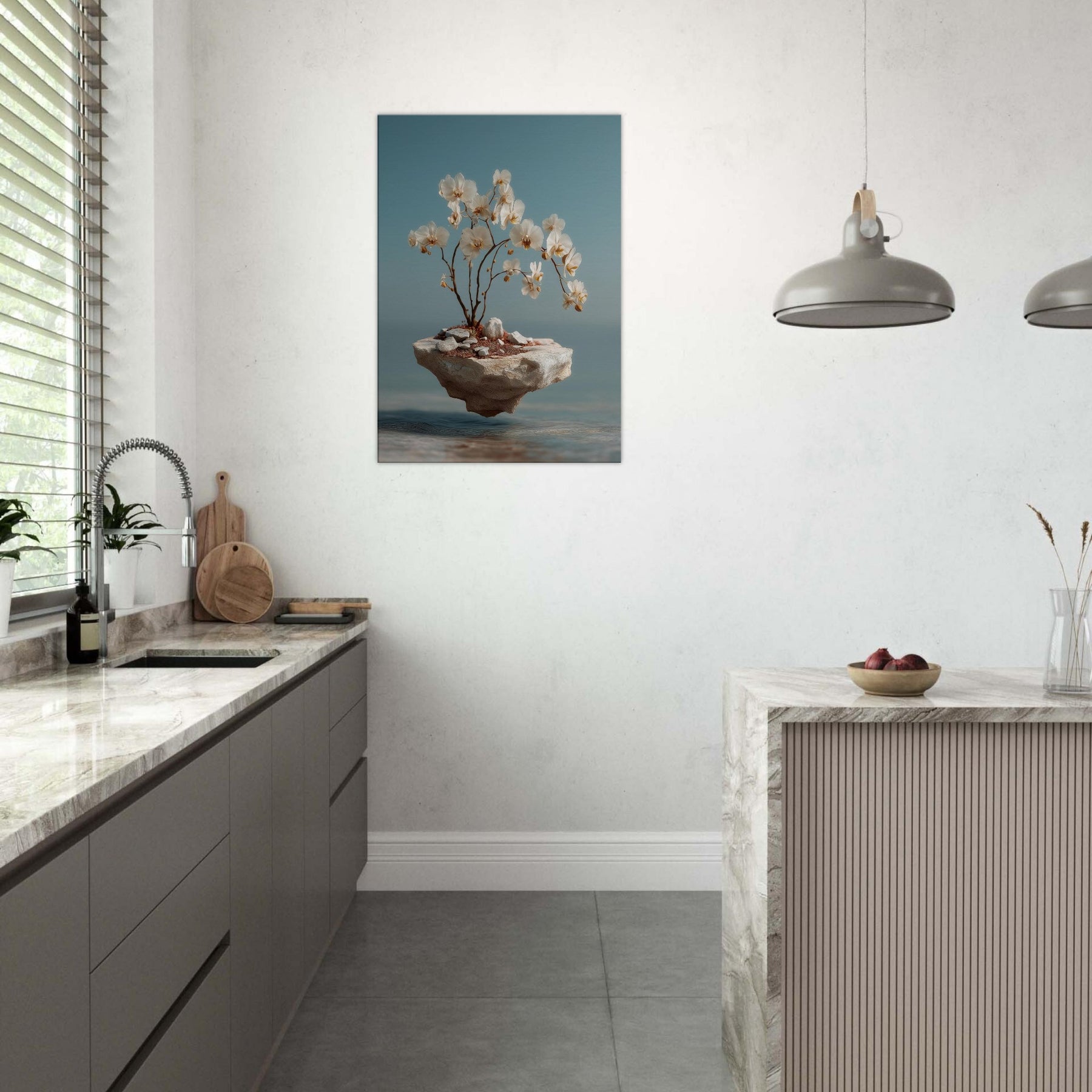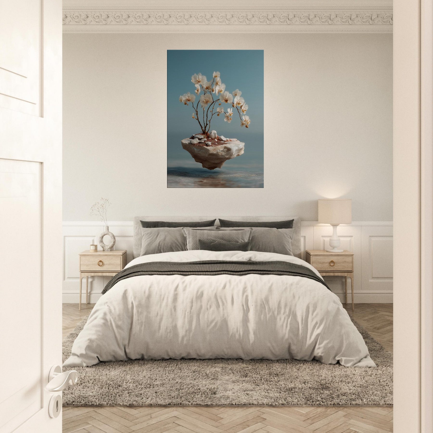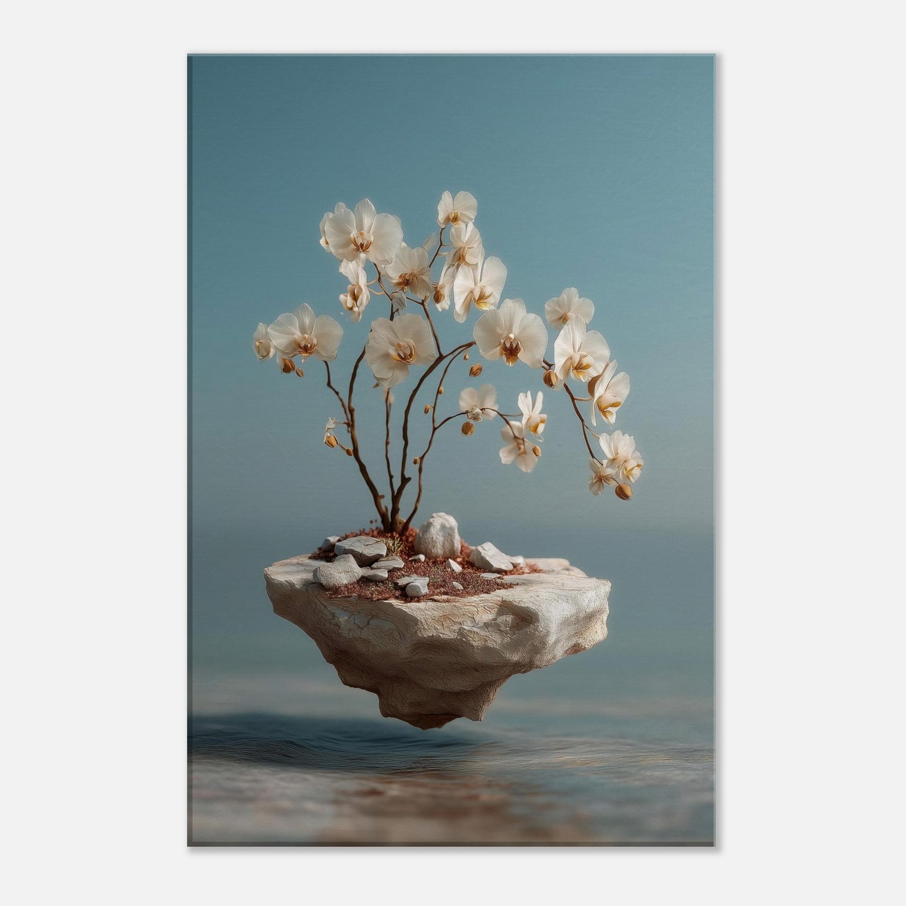 An Orchid defies gravity, its porcelain blooms bending the horizon in a dreamscape where stone drifts over tranquil seas. Surreal yet intimate, this work invites quiet contemplation: a soft white procession of petals, each cupped by a slender limb, balances a planet of pebbles and dust. The atmosphere is serene, with a whisper of salt air and memory, making any living space feel like a private sanctuary where nature and imagination meet.